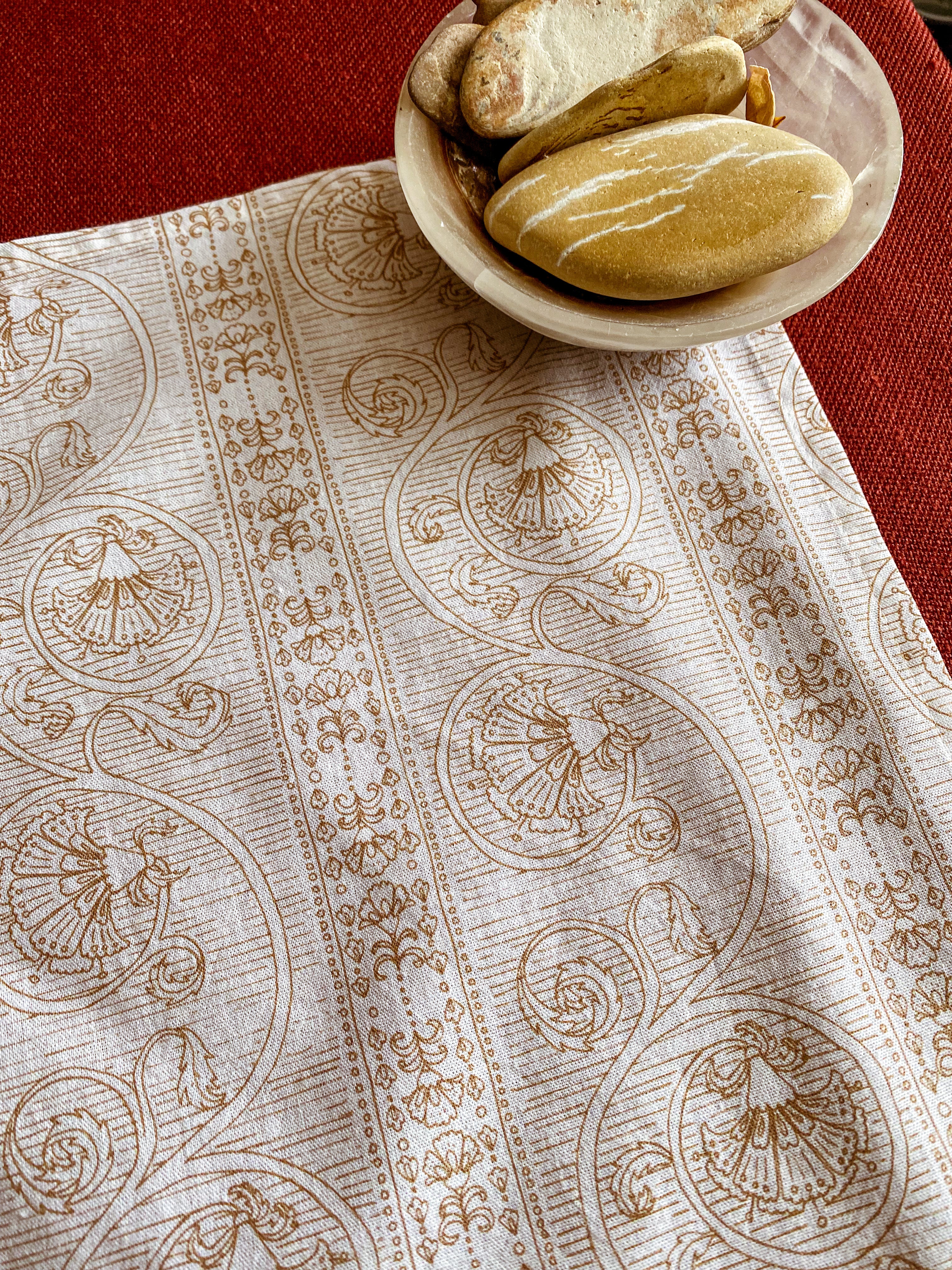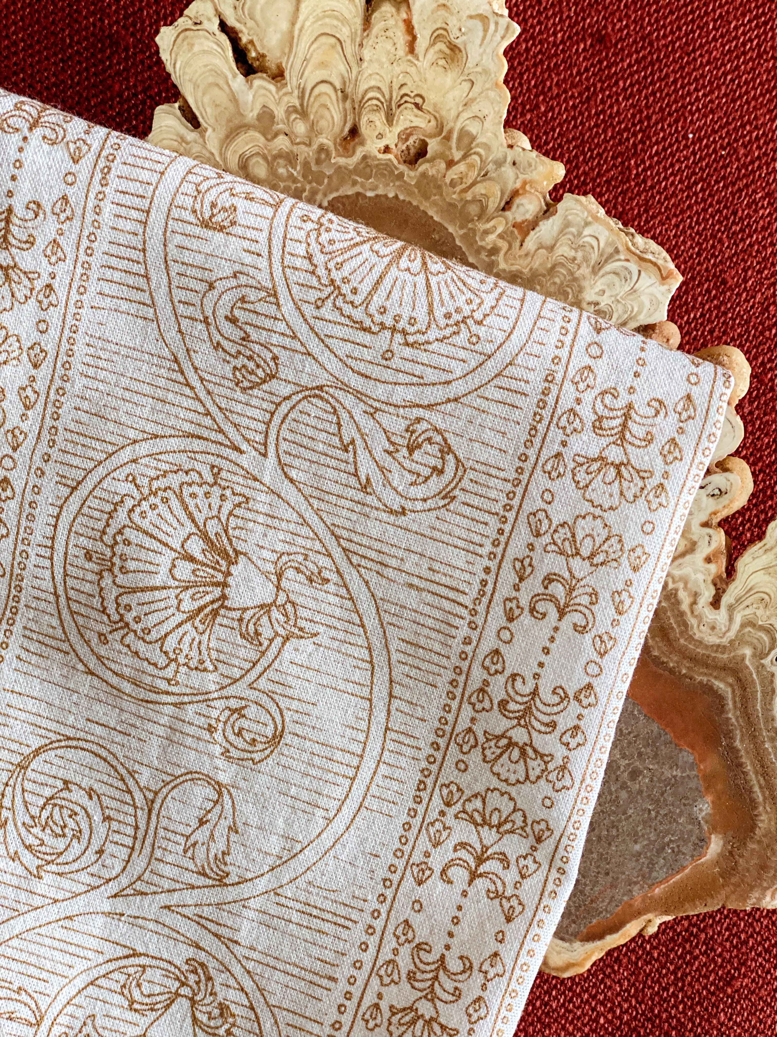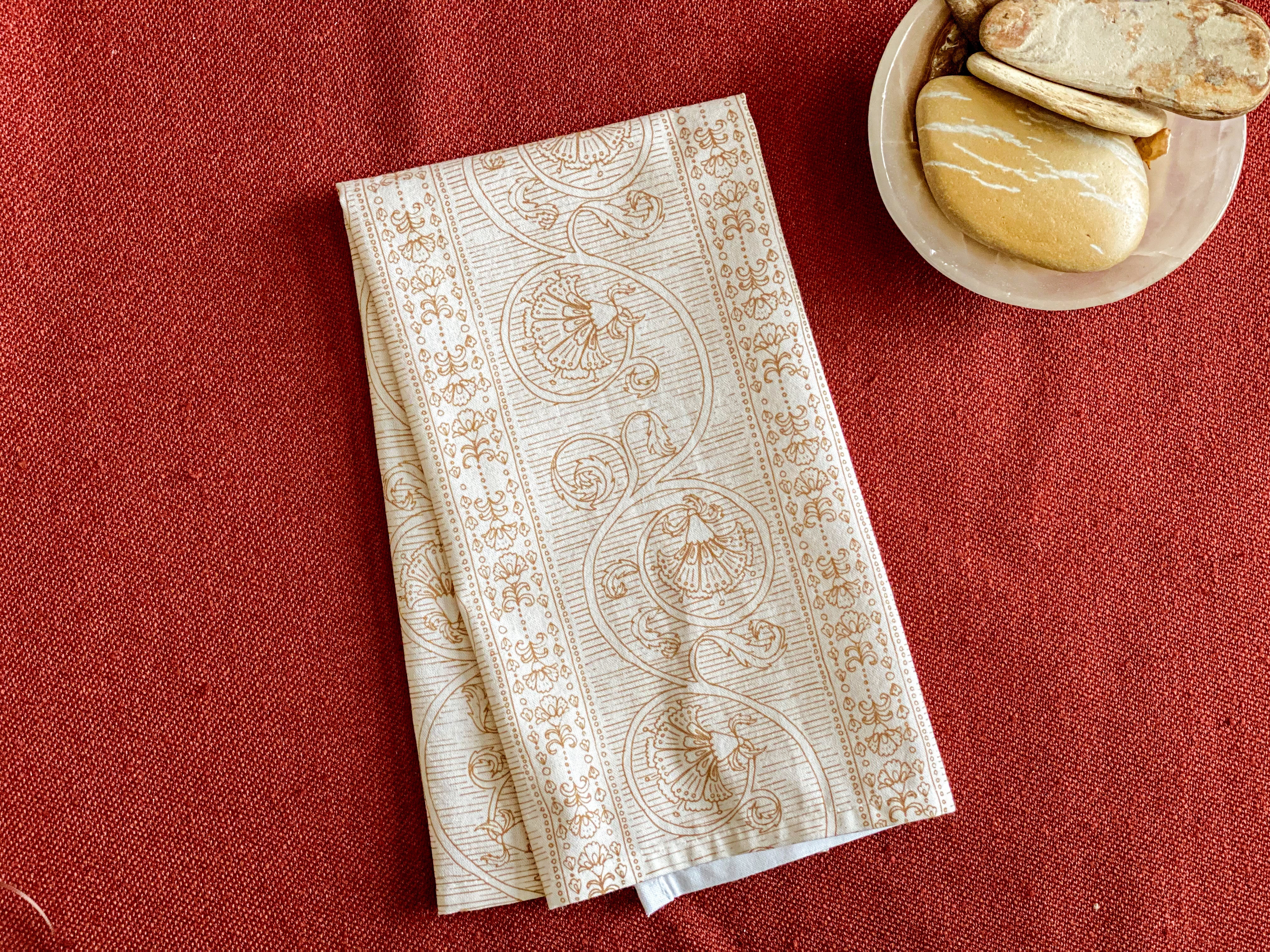 Warm up your kitchen or dining table with this etching style floral pattern. Great for use as a tea towel or as napkins for your dinner party or brunch place settings. Wrap them up for a lovely hostess or housewarming gift.