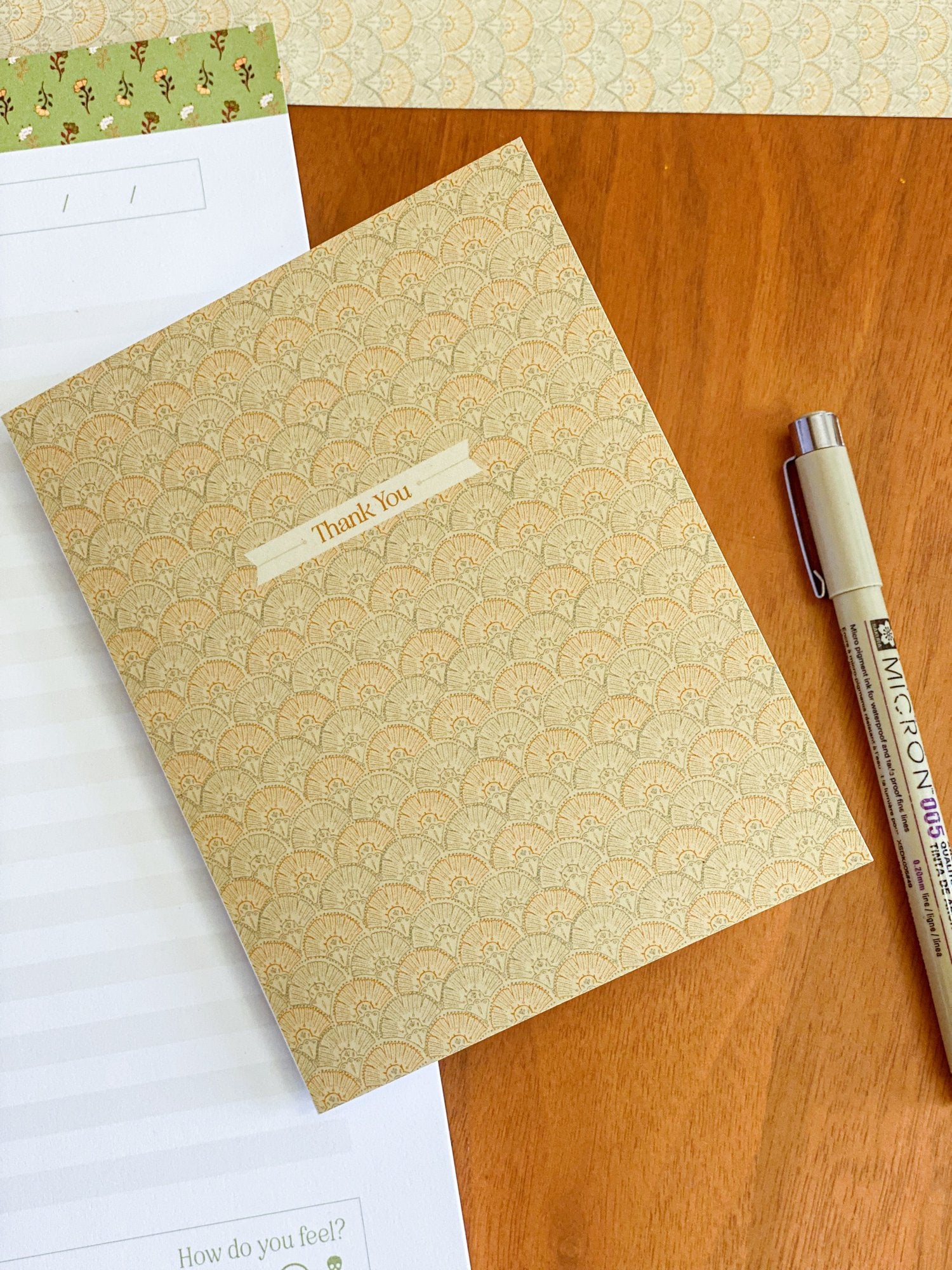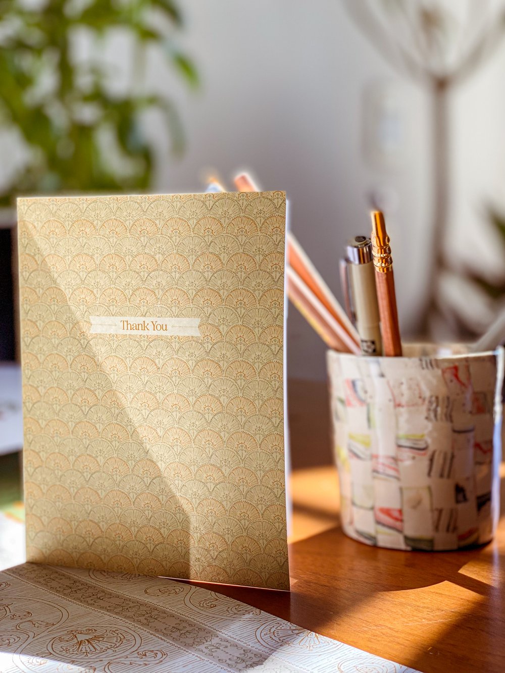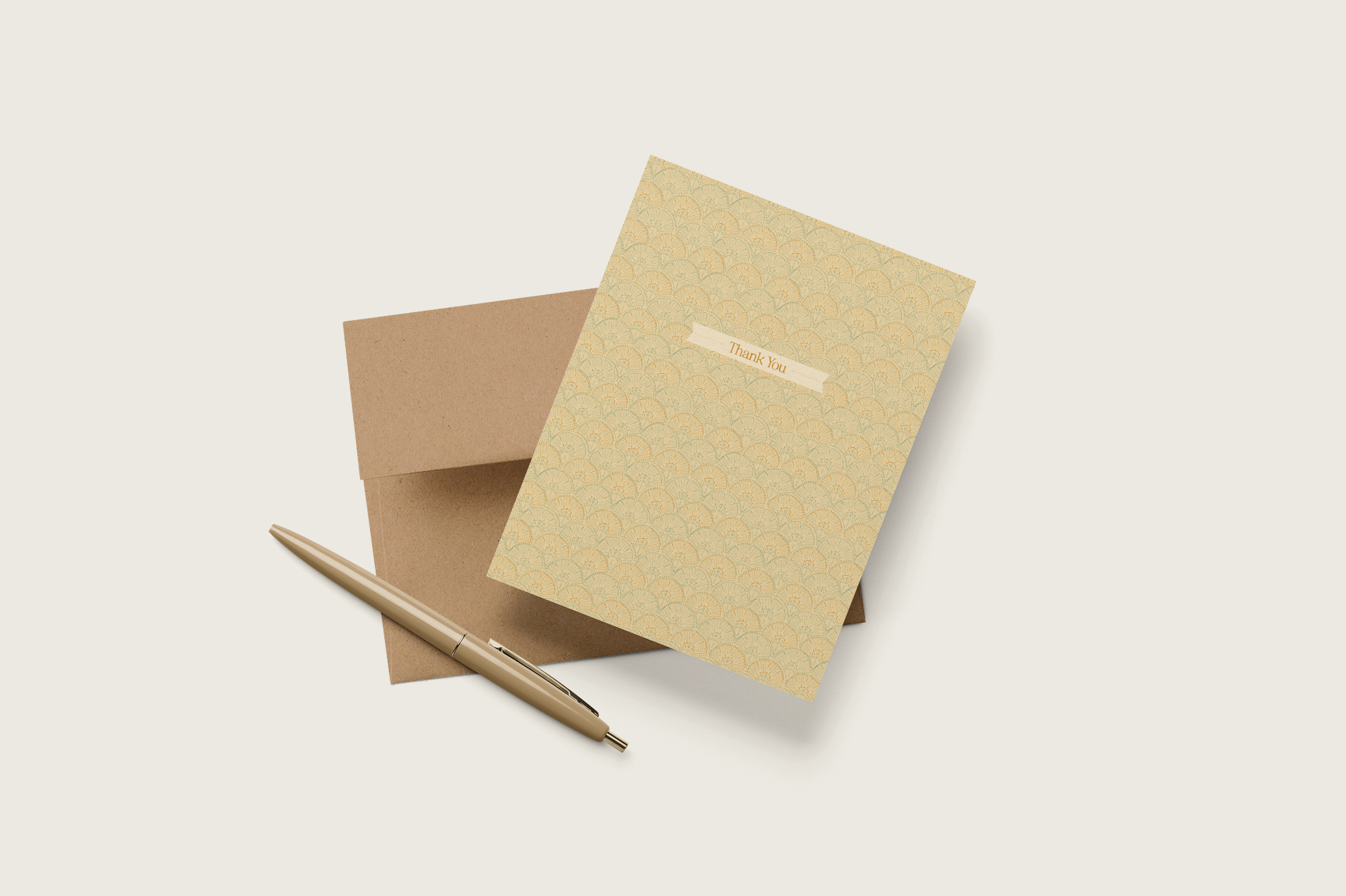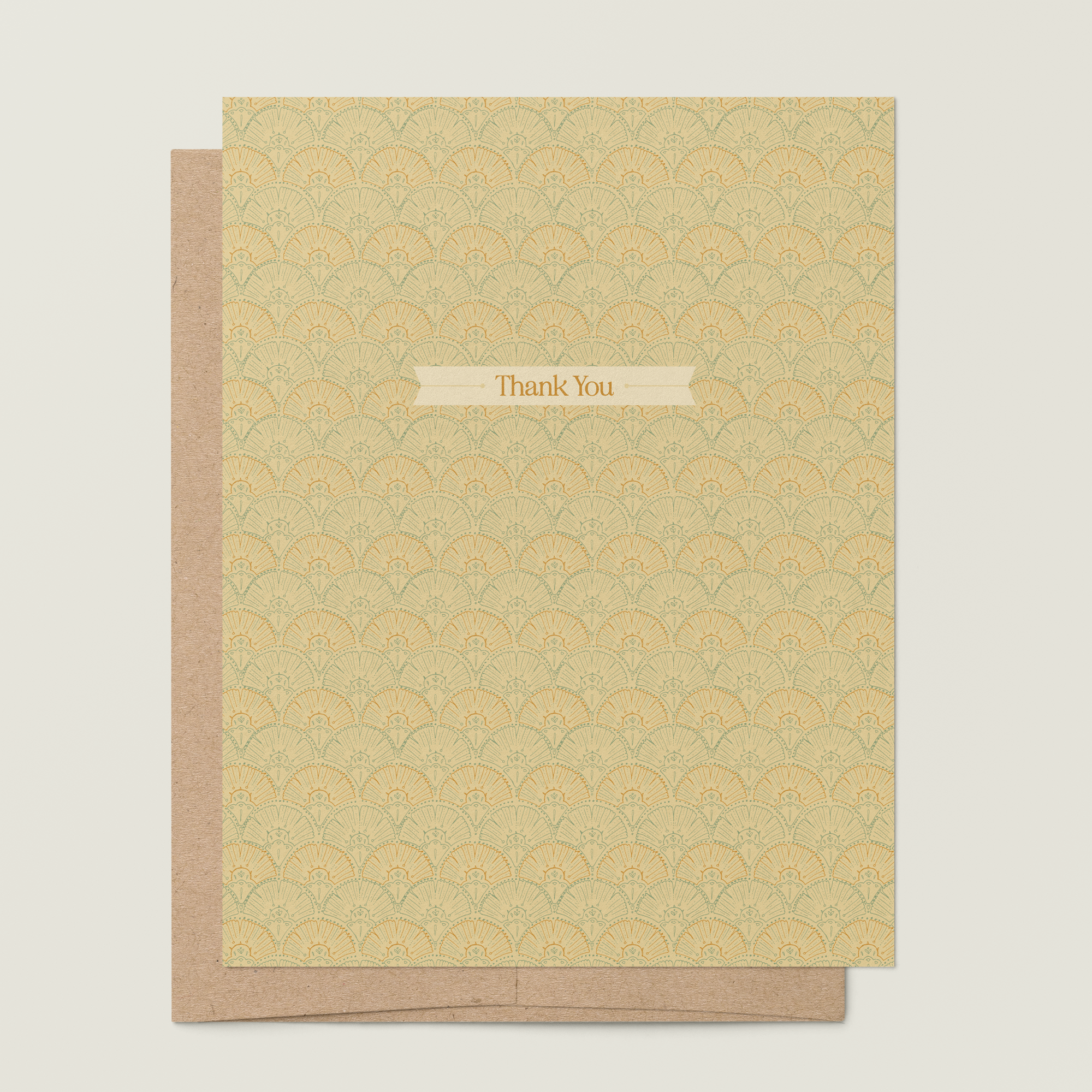 A2 folded notecard with a "Thank You" message on the front of a geometric scalloped ginko leaf pattern in a warm neutral palette and a blank interior to personalize your own note.