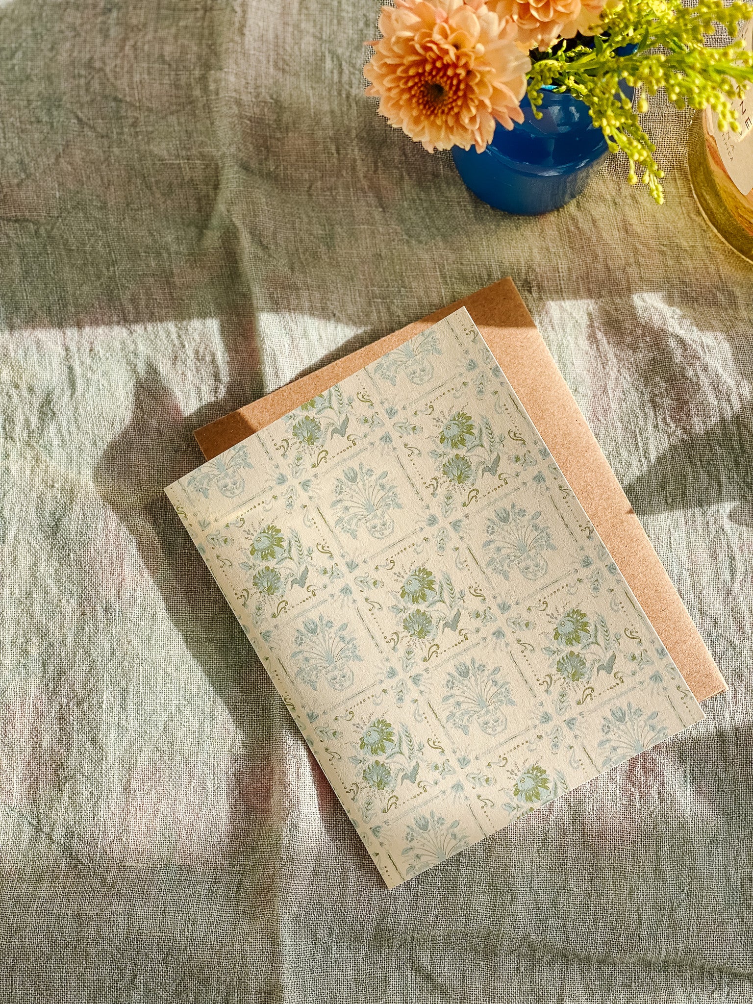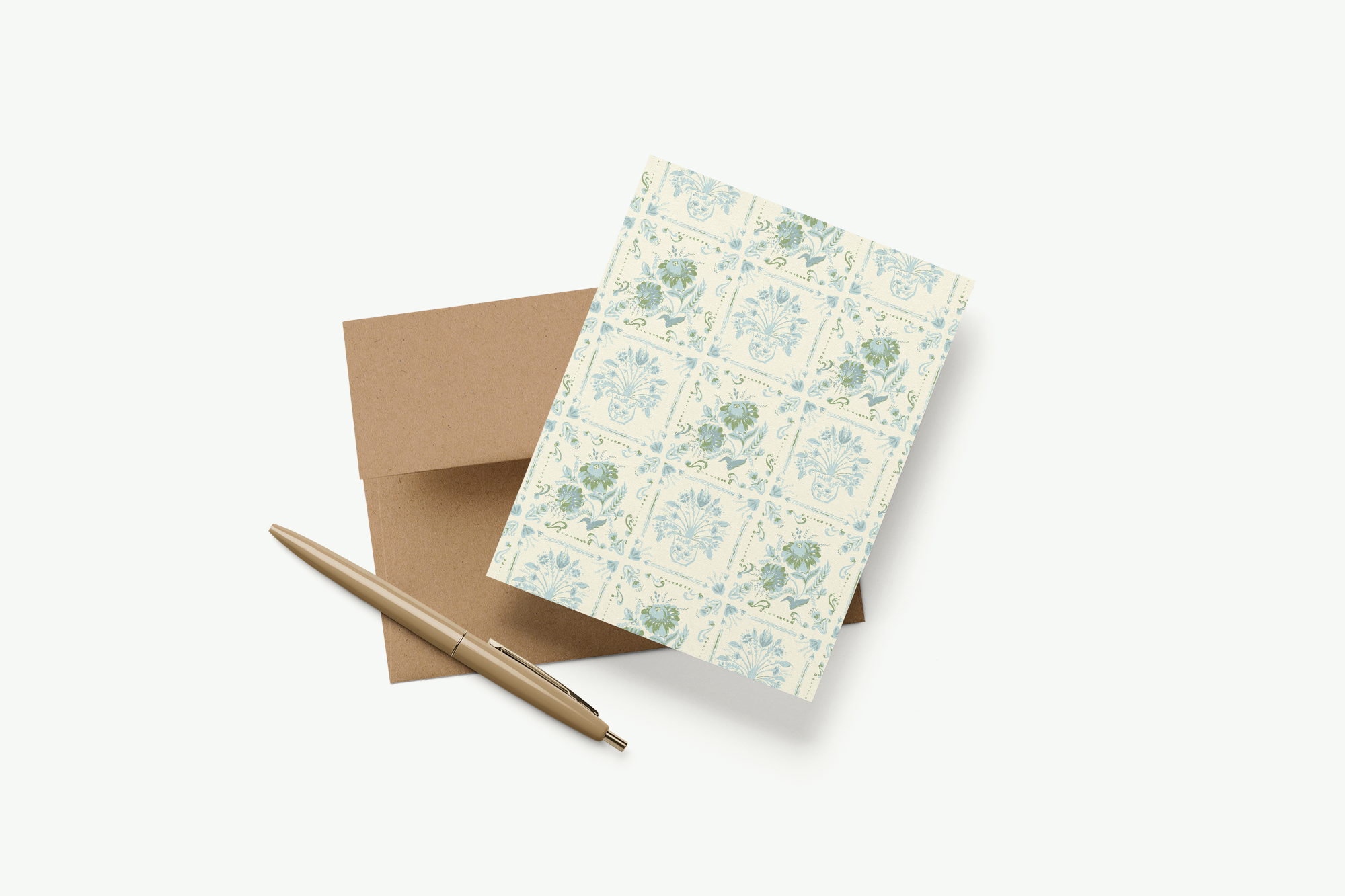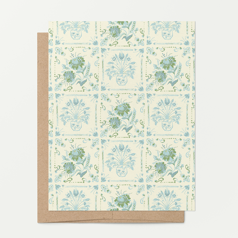 This patterned card is inspired by vintage Italian coast tiles with a hand-painted pair of floral motifs in seaside blues and green on a light cream background. A timeless and elegant option with versatility for spring and summer months.