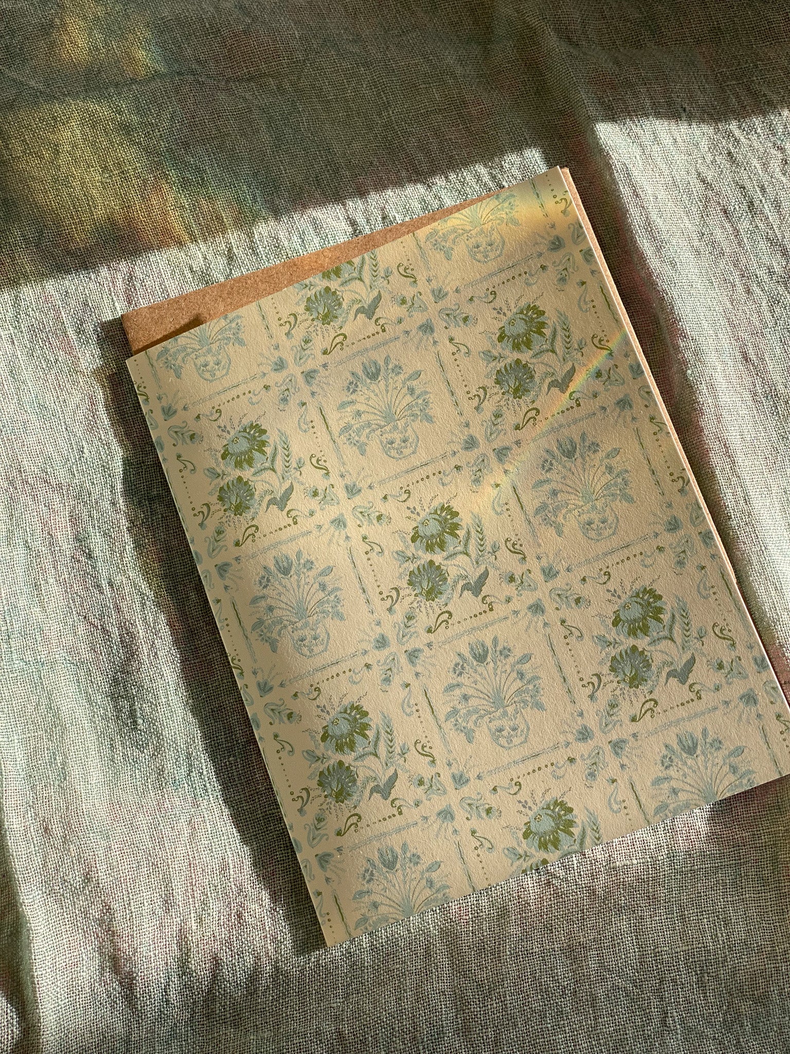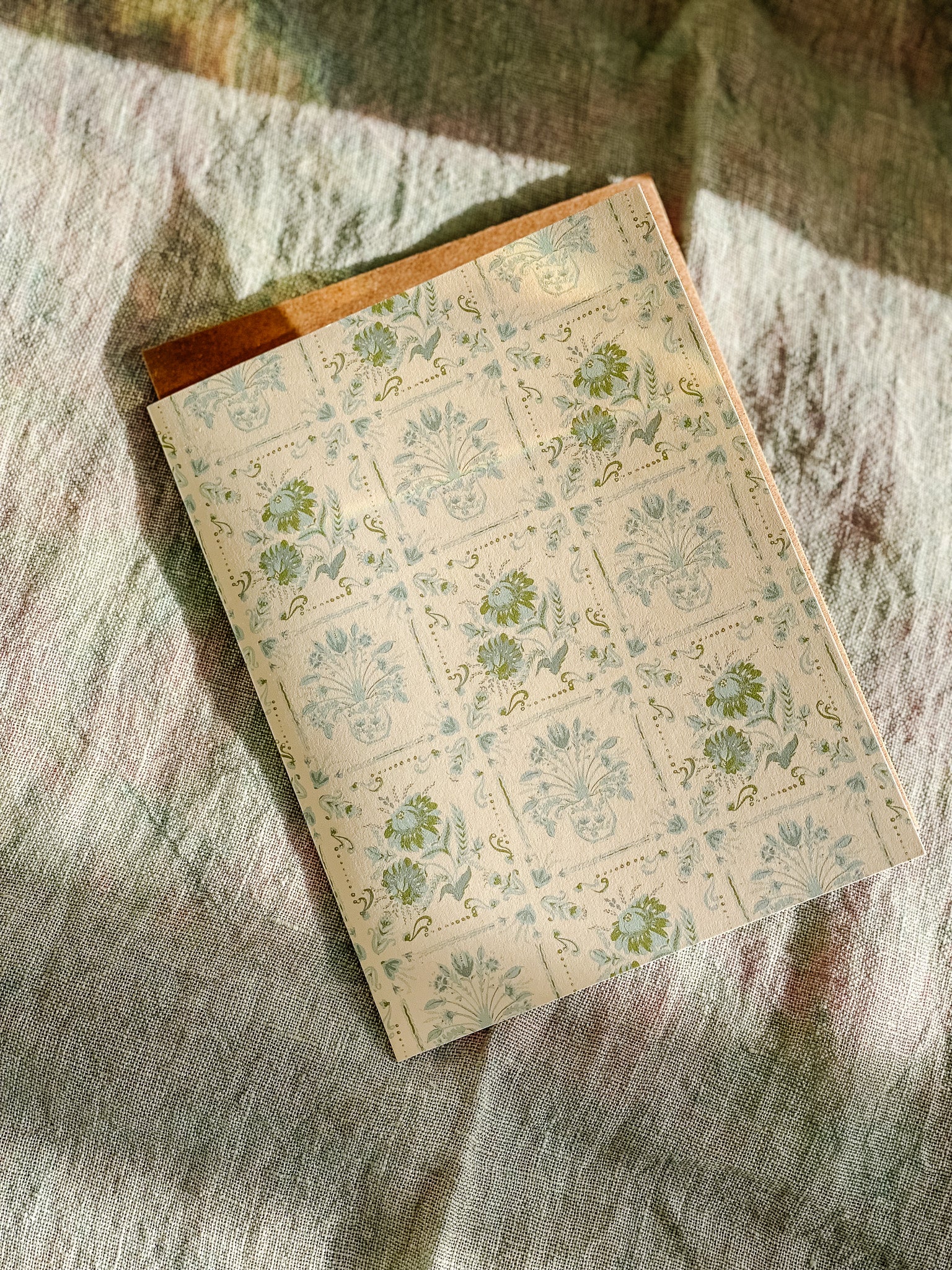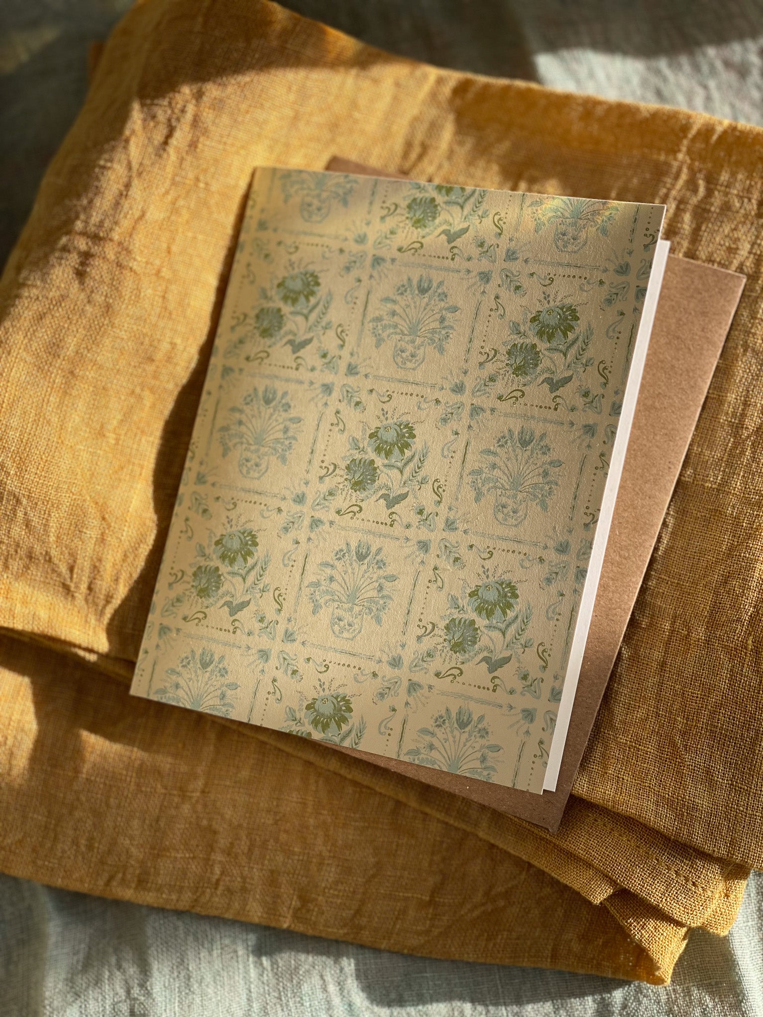 This patterned card is inspired by vintage Italian coast tiles with a hand-painted pair of floral motifs in seaside blues and green on a light cream background. A timeless and elegant option with versatility for spring and summer months.