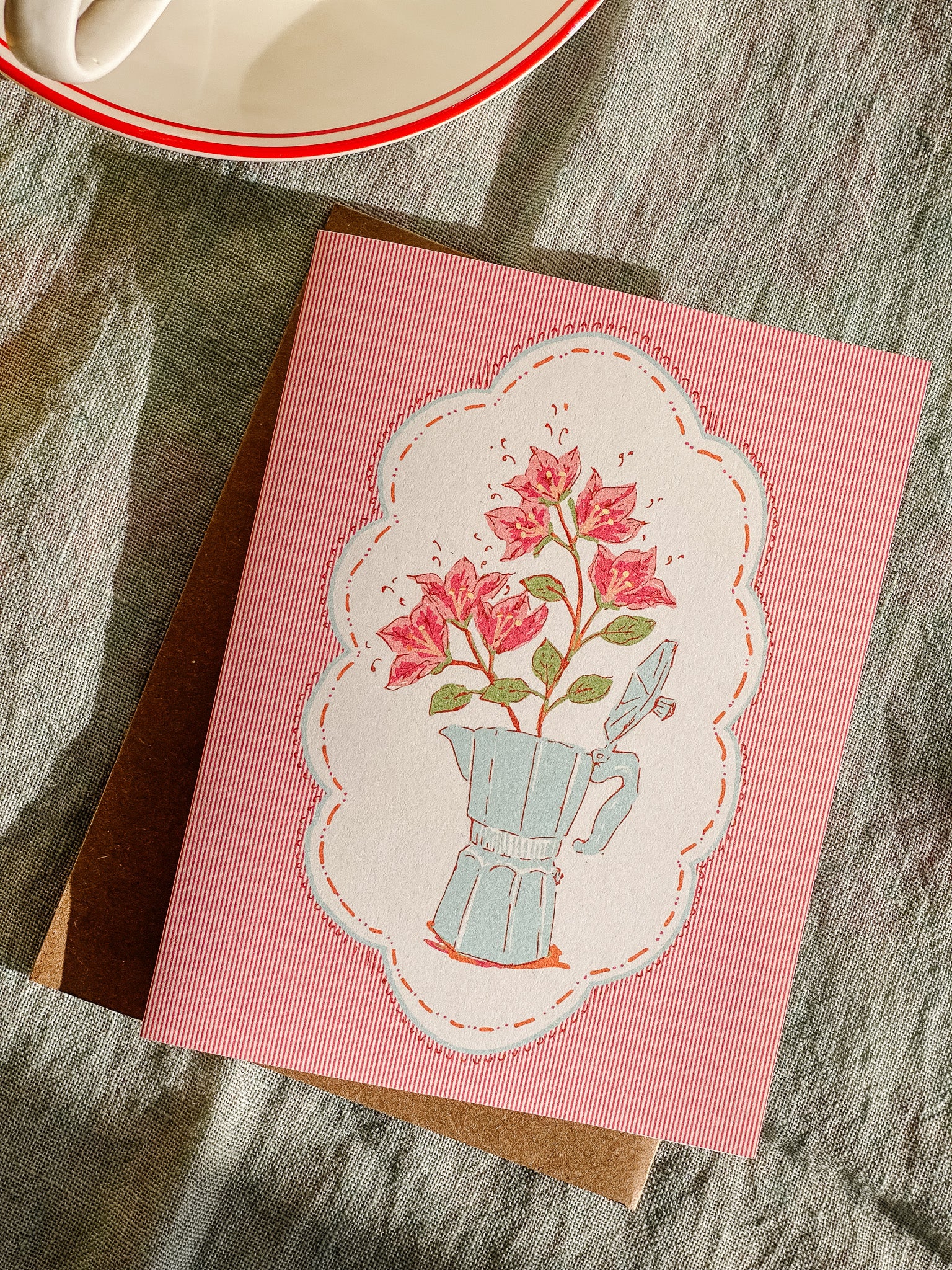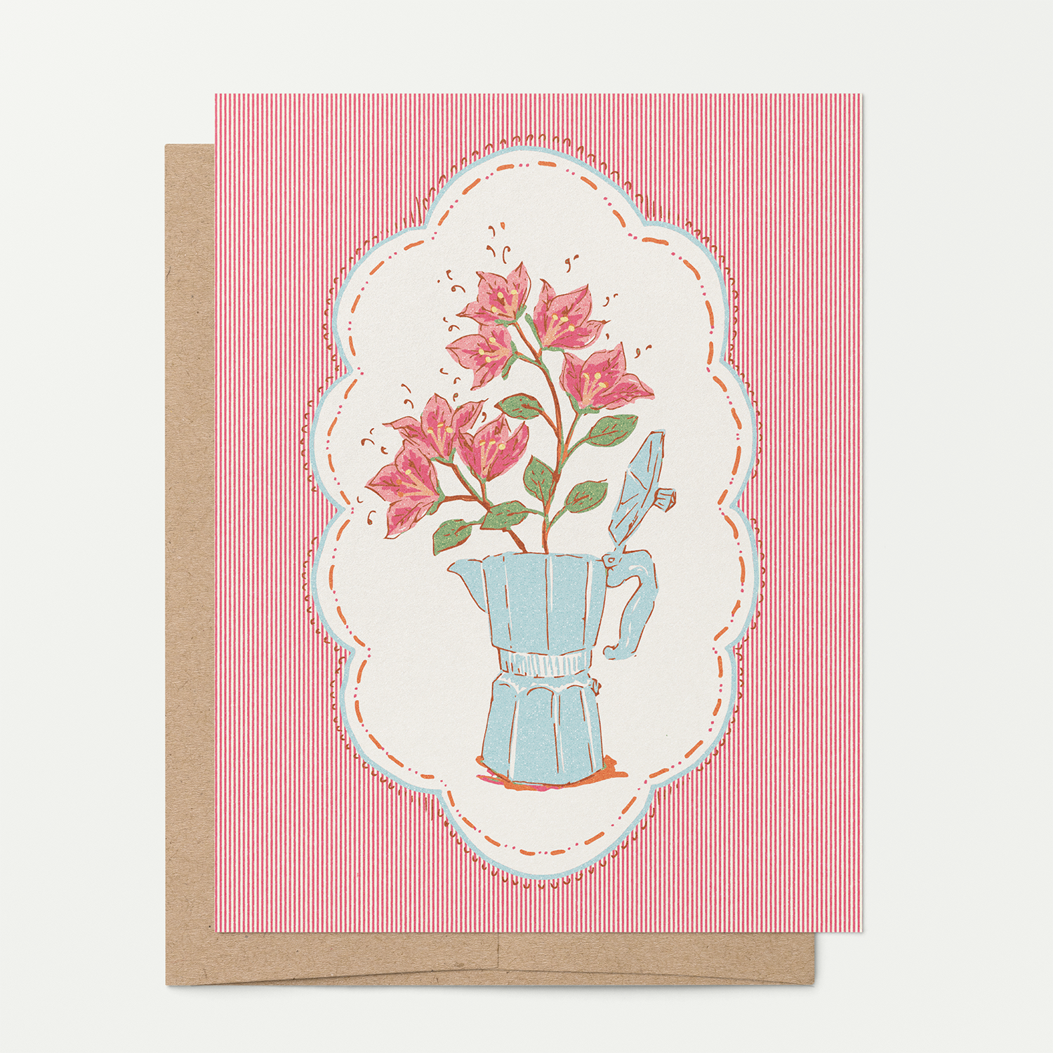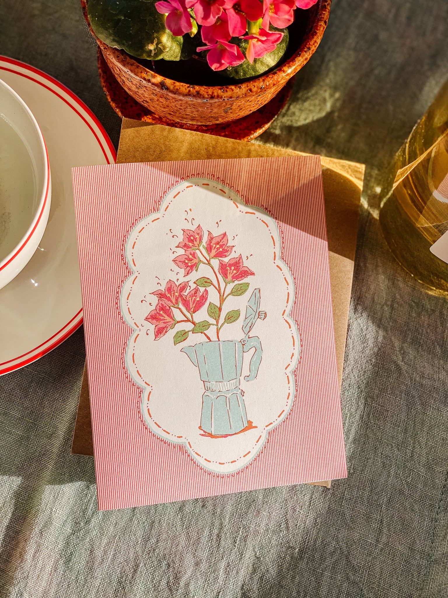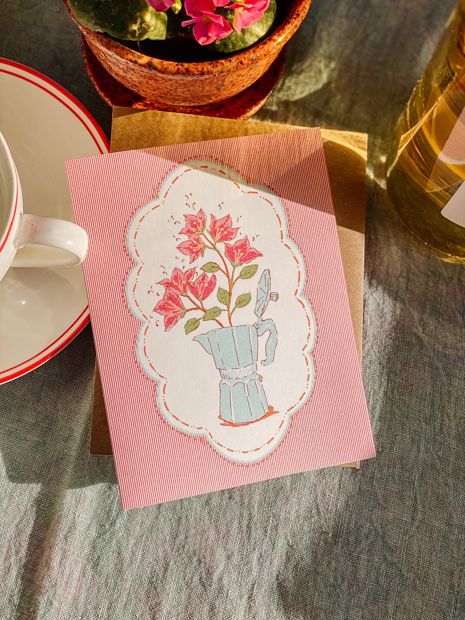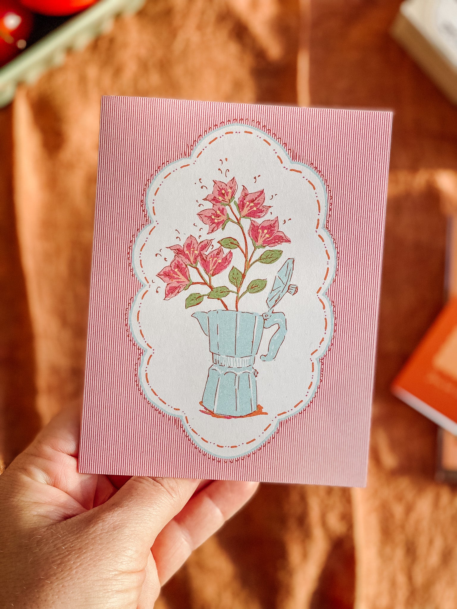 This whimsical hand-illustrated card showcases a light blue classic Italian espresso maker bursting with pink bougainvillea flowers in a scalloped frame and a pinstripe backdrop. A subtle printed texture effect gives it a timeless feel with vintage Italian vibes.