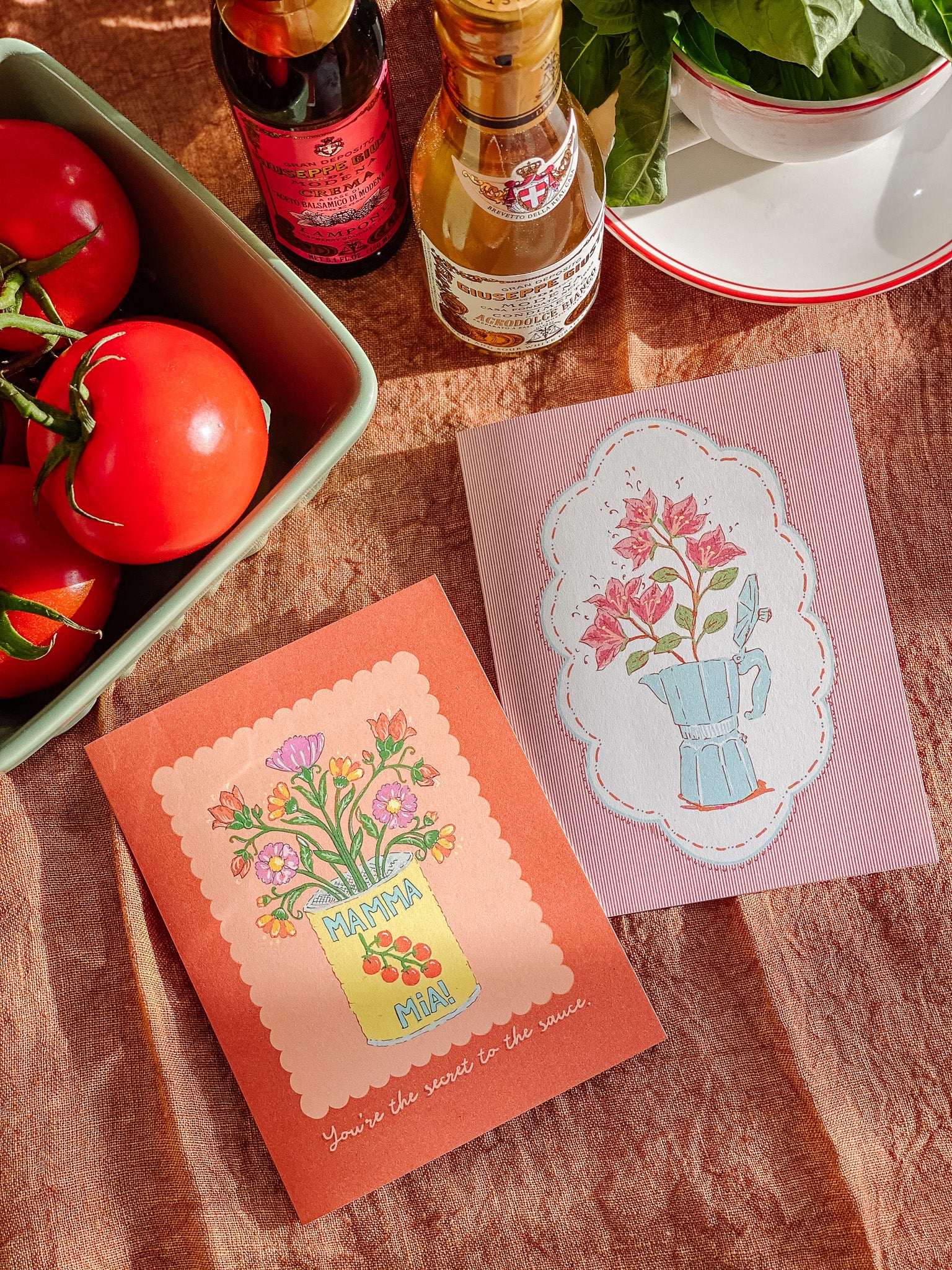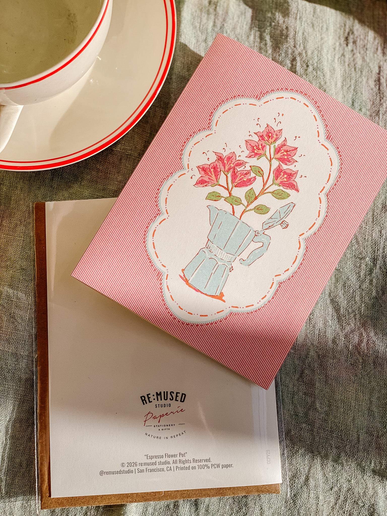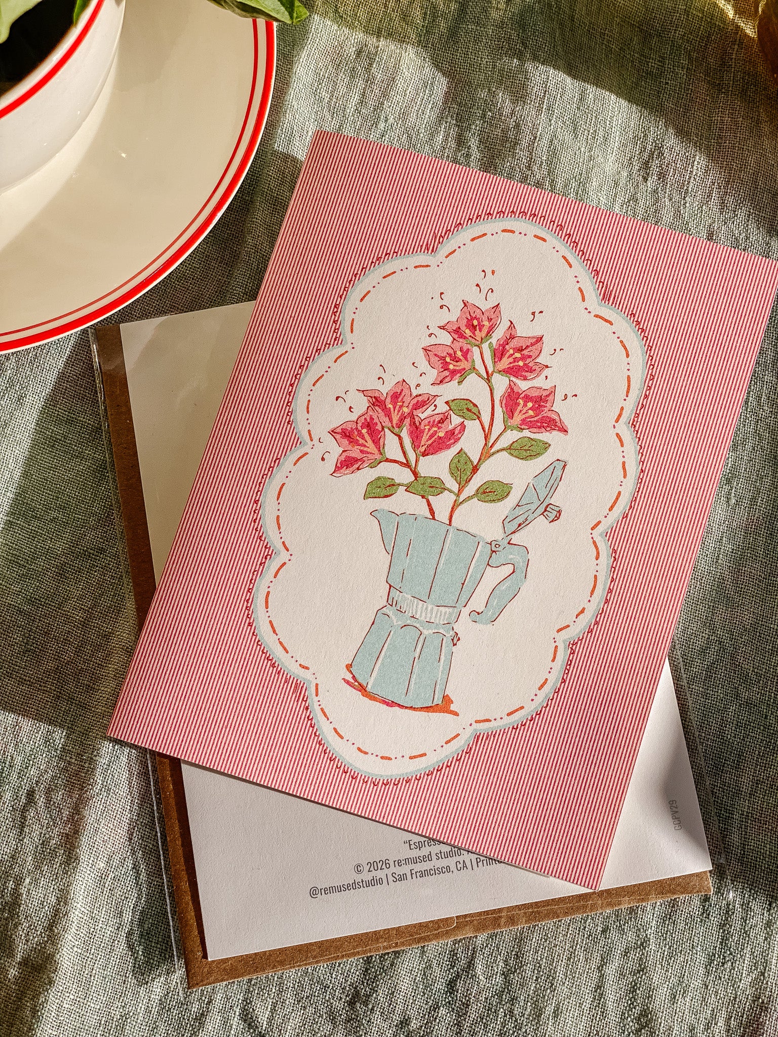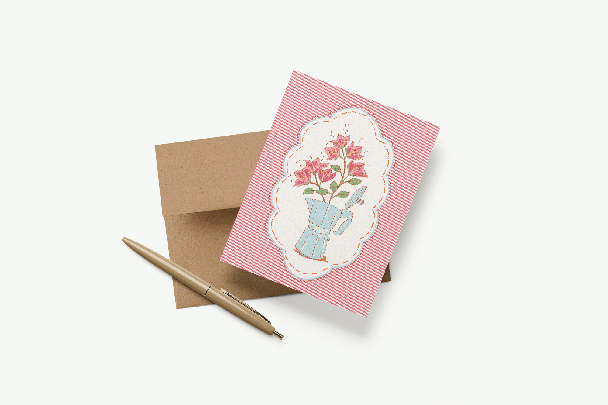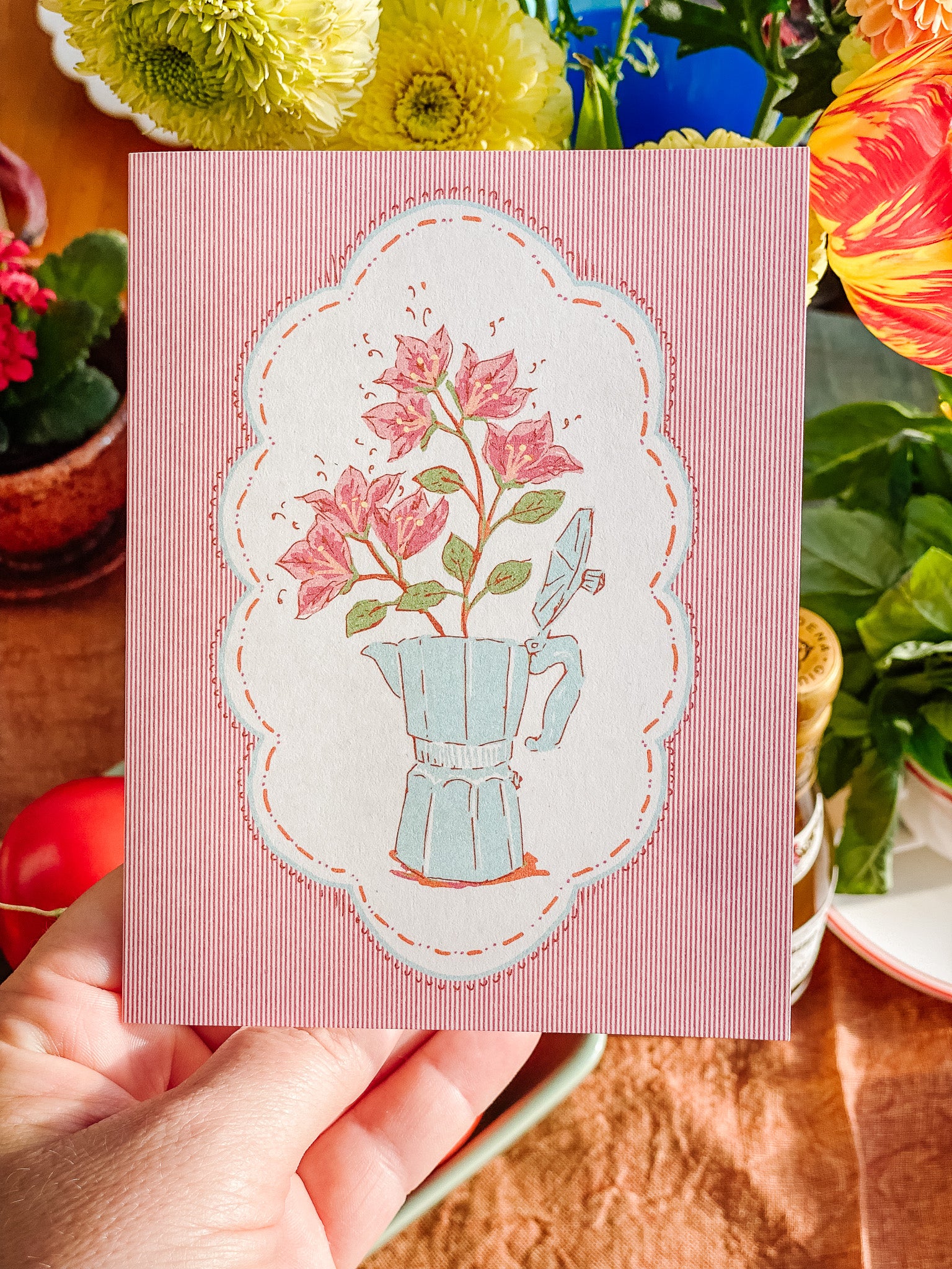 This whimsical hand-illustrated card showcases a light blue classic Italian espresso maker bursting with pink bougainvillea flowers in a scalloped frame and a pinstripe backdrop. A subtle printed texture effect gives it a timeless feel with vintage Italian vibes.