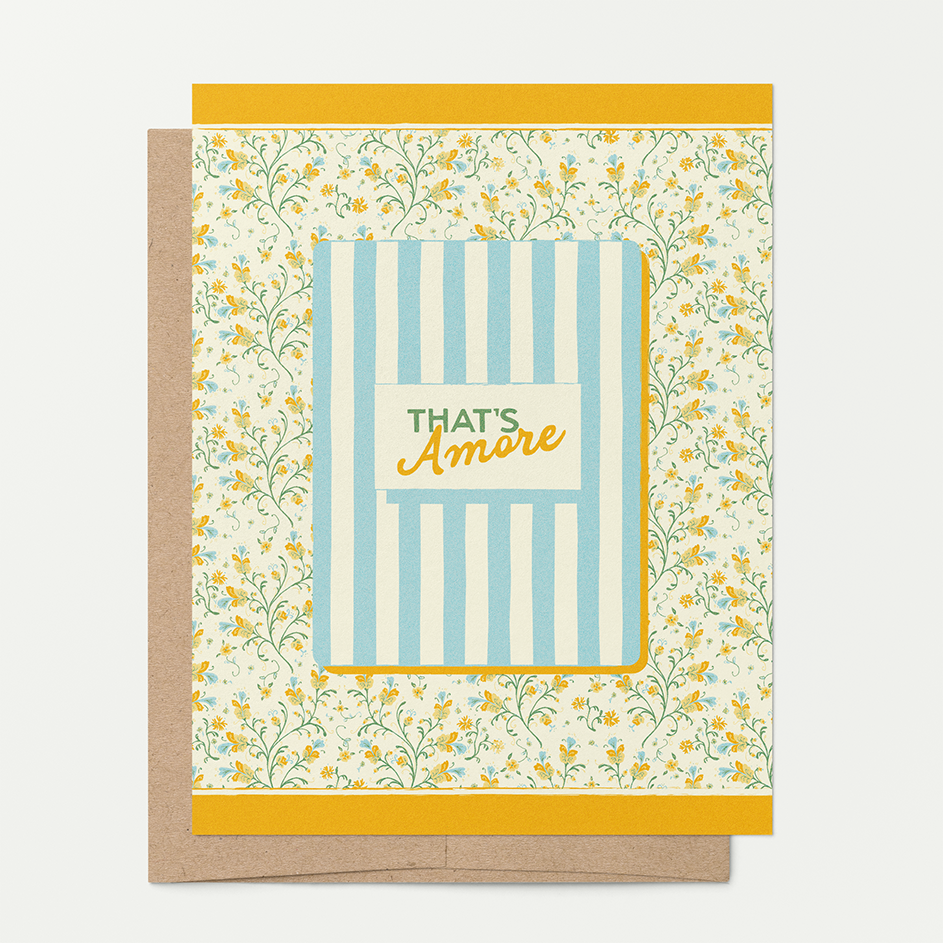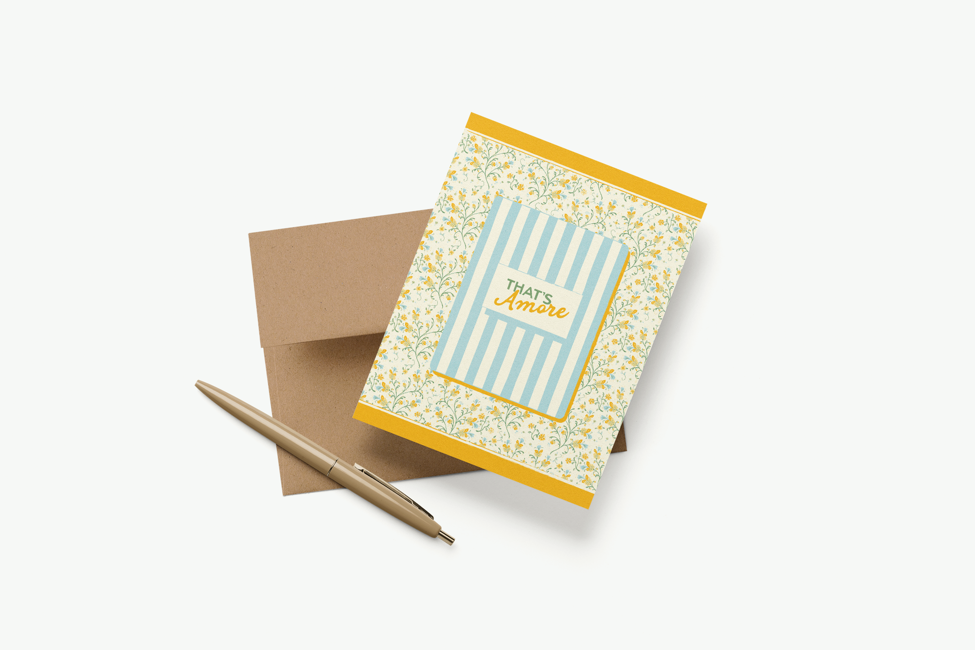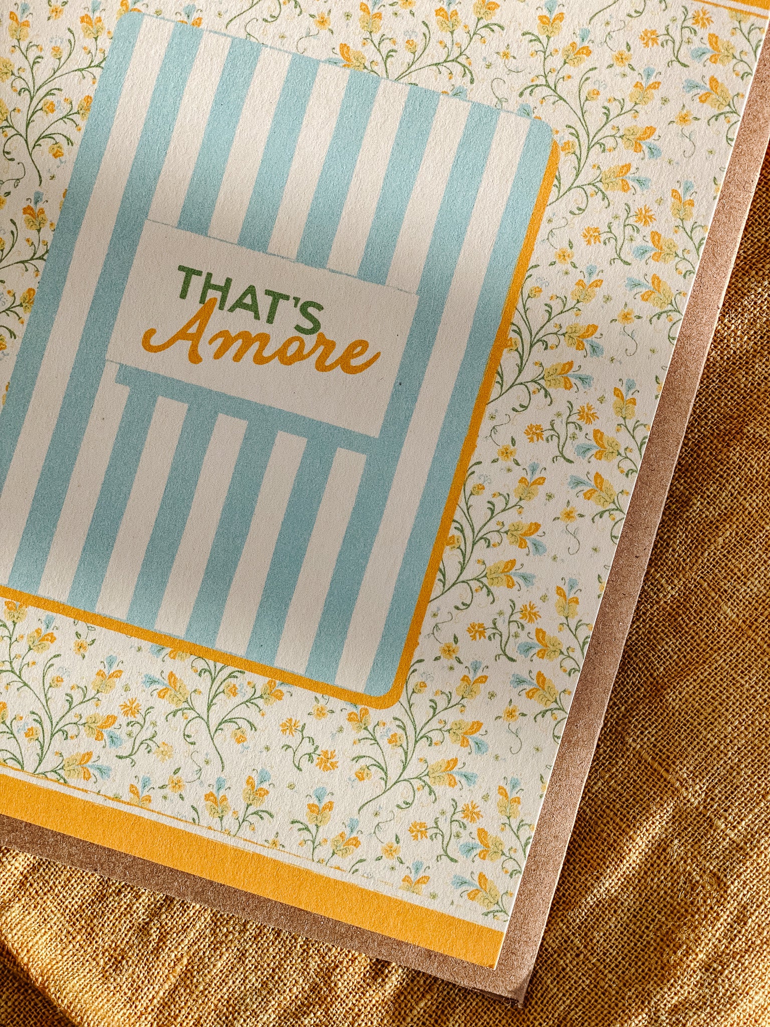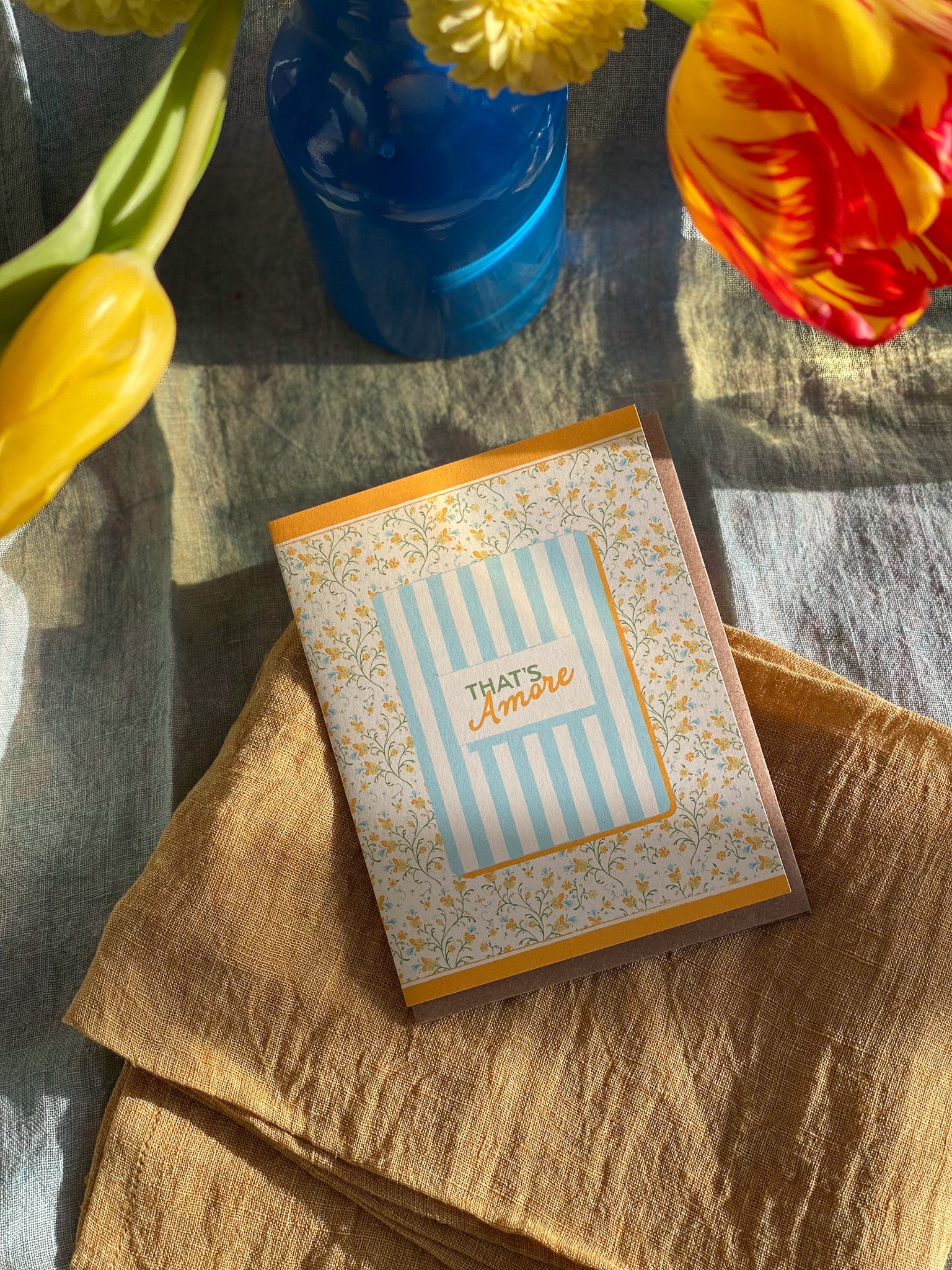 This vibrant card showcases a pairing of a hand-drawn twining floral sprig pattern with bold cabana stripe and "That's Amore" framed message in sun-soaked vintage Italian inspired hues of yellows, blues and greens. A subtle printed texture effect gives it a timeless feel with Amalfi coast vibes.