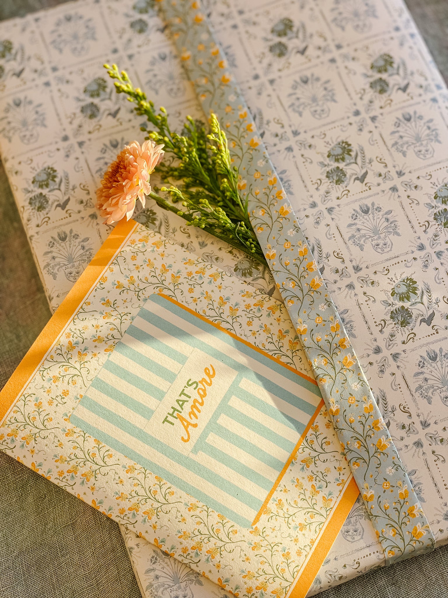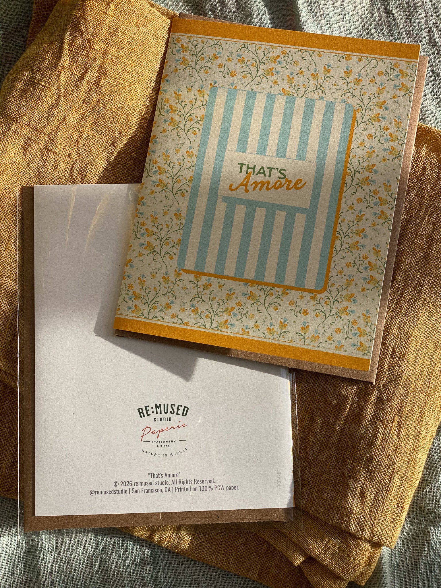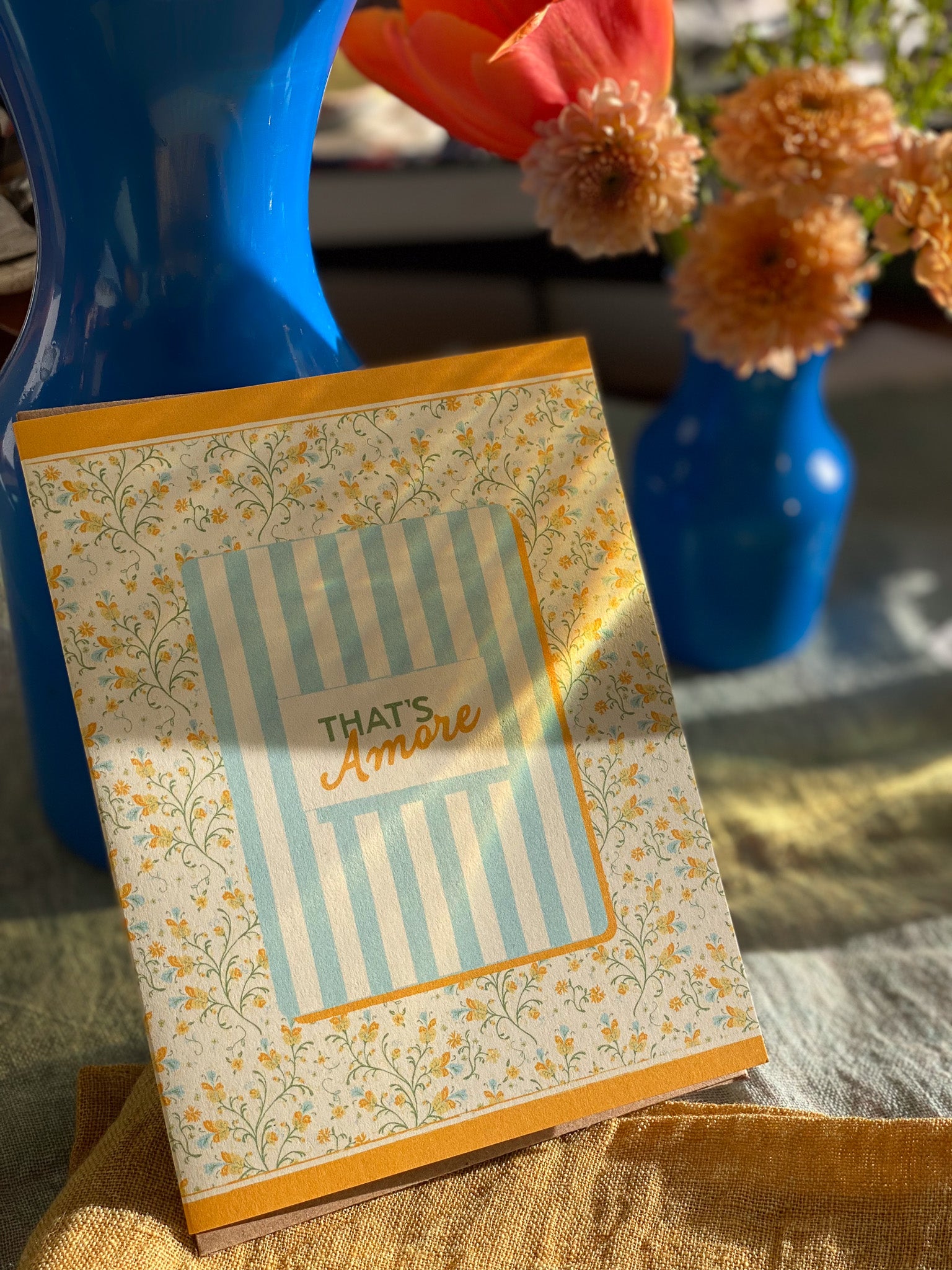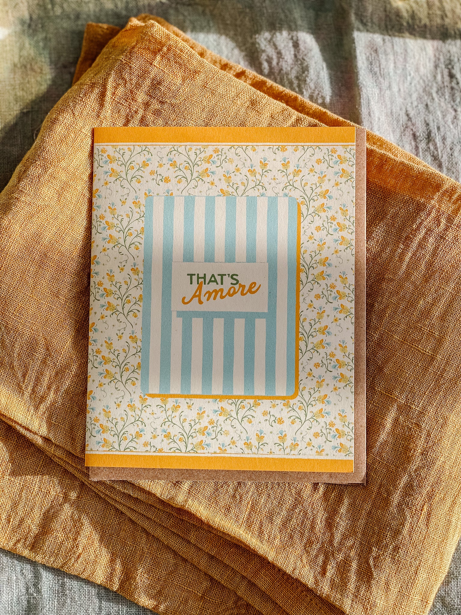 This vibrant card showcases a pairing of a hand-drawn twining floral sprig pattern with bold cabana stripe and "That's Amore" framed message in sun-soaked vintage Italian inspired hues of yellows, blues and greens. A subtle printed texture effect gives it a timeless feel with Amalfi coast vibes.