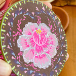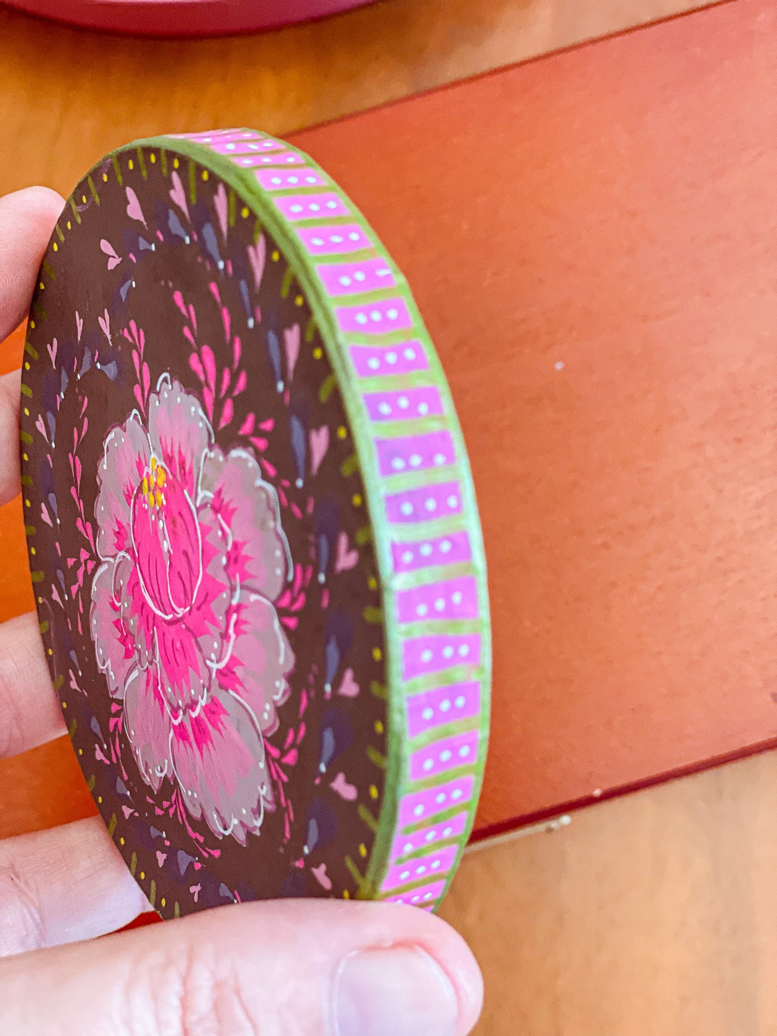 A rose motif with delicate heart shaped flourishes framing it, inspired by folk art traditions bring hand-painted charm and shimmering metallic touches to this sweet Valentine's Day gift.
