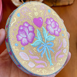 A heart shaped rose motif inspired by Victorian Valentines and folk art traditions bring hand-painted charm and shimmering metallic touches to this sweet gift.