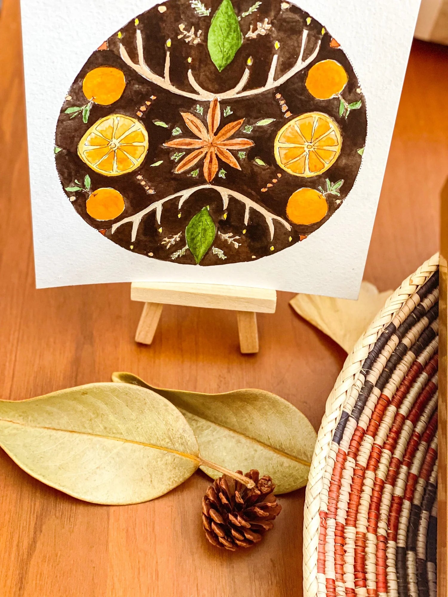 Part of the “citrus solstice” series of the 2021 yule collection, this original nods to The Holly King and traditions surrounding winter solstice.