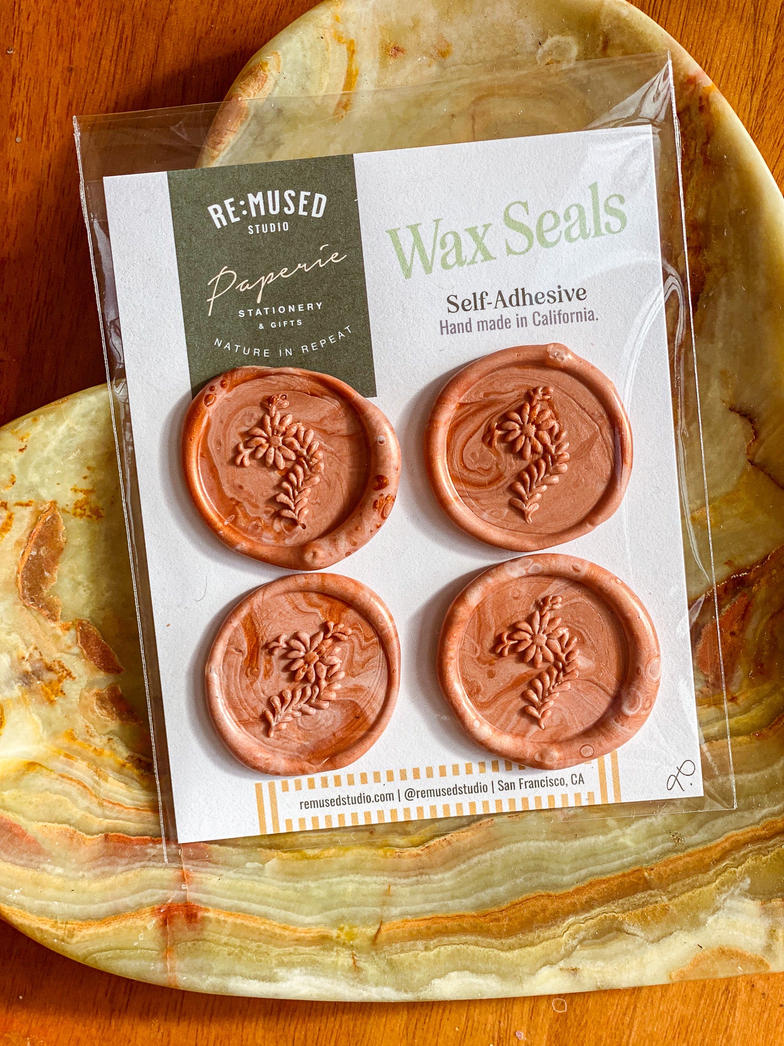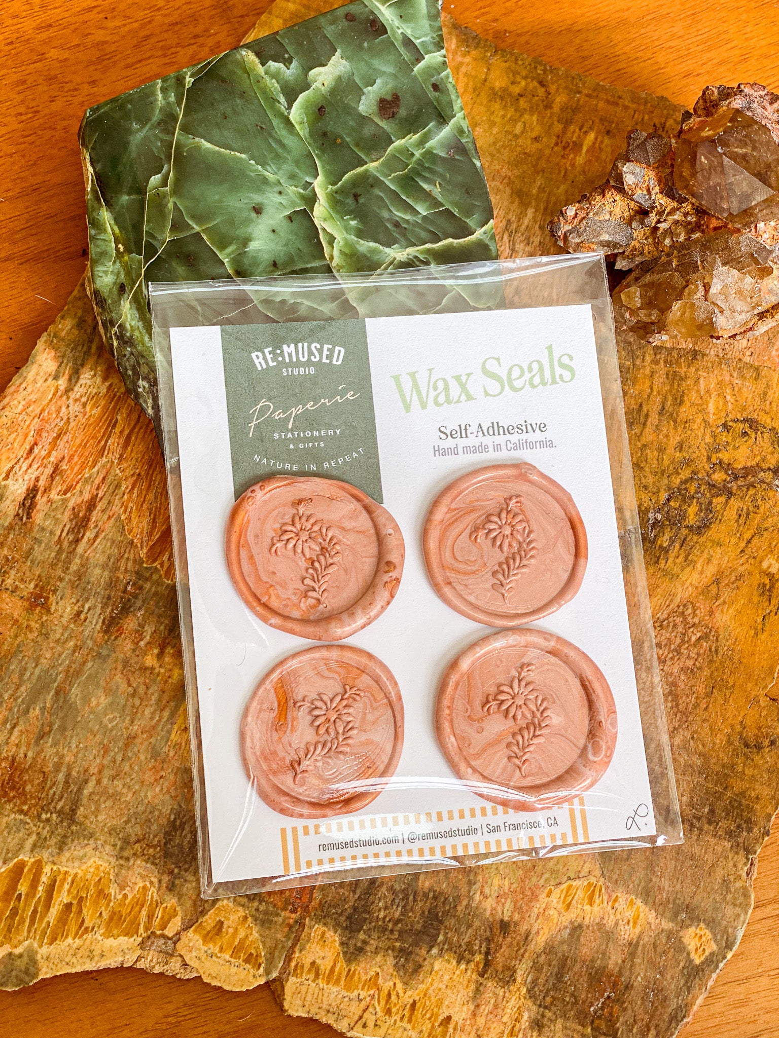 Designed for stationery lovers and gifting enthusiasts, our Wax Seal Sets of 4 bring artisanal charm to correspondence and packaging with a wildflower sprig motif from our Where the Wildflowers Roam collection in a shimmering swirl of pink and pumpkin orange metallic. Each seal is hand-poured and pressed, giving it unique character and depth. The self-adhesive backing allows for quick, mess-free application, making them perfect for greeting cards, invitations, and gift wrap. Sized at approximately 1 inch, these wax seals are sure to be a favorite for those who value thoughtful details and handmade craftsmanship.