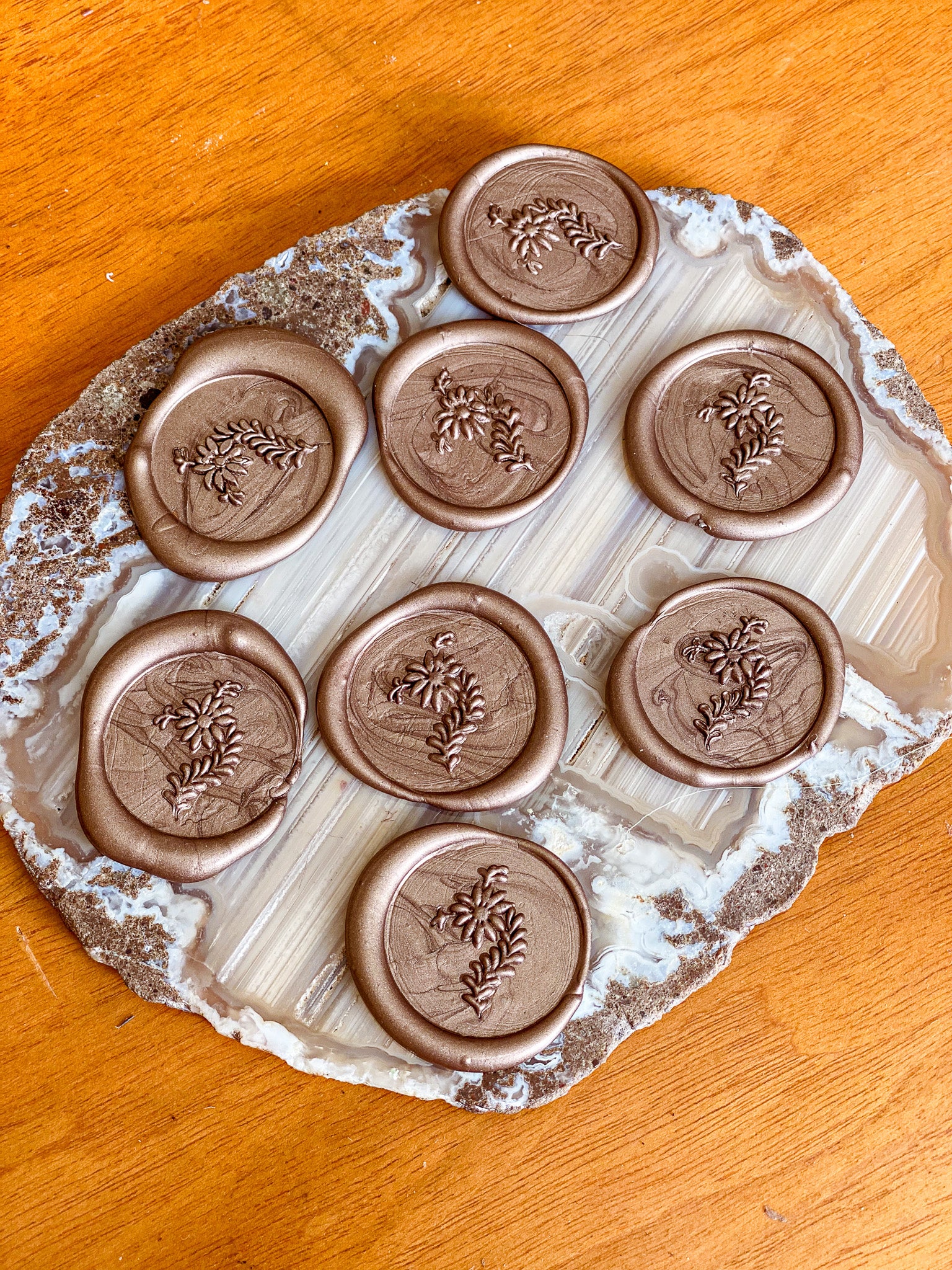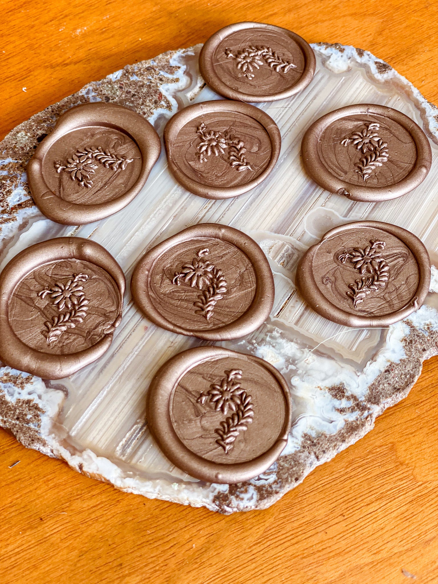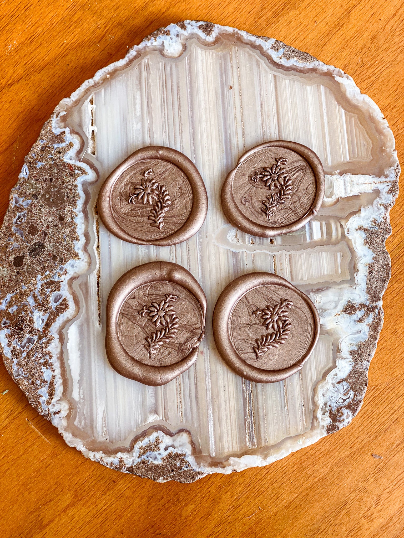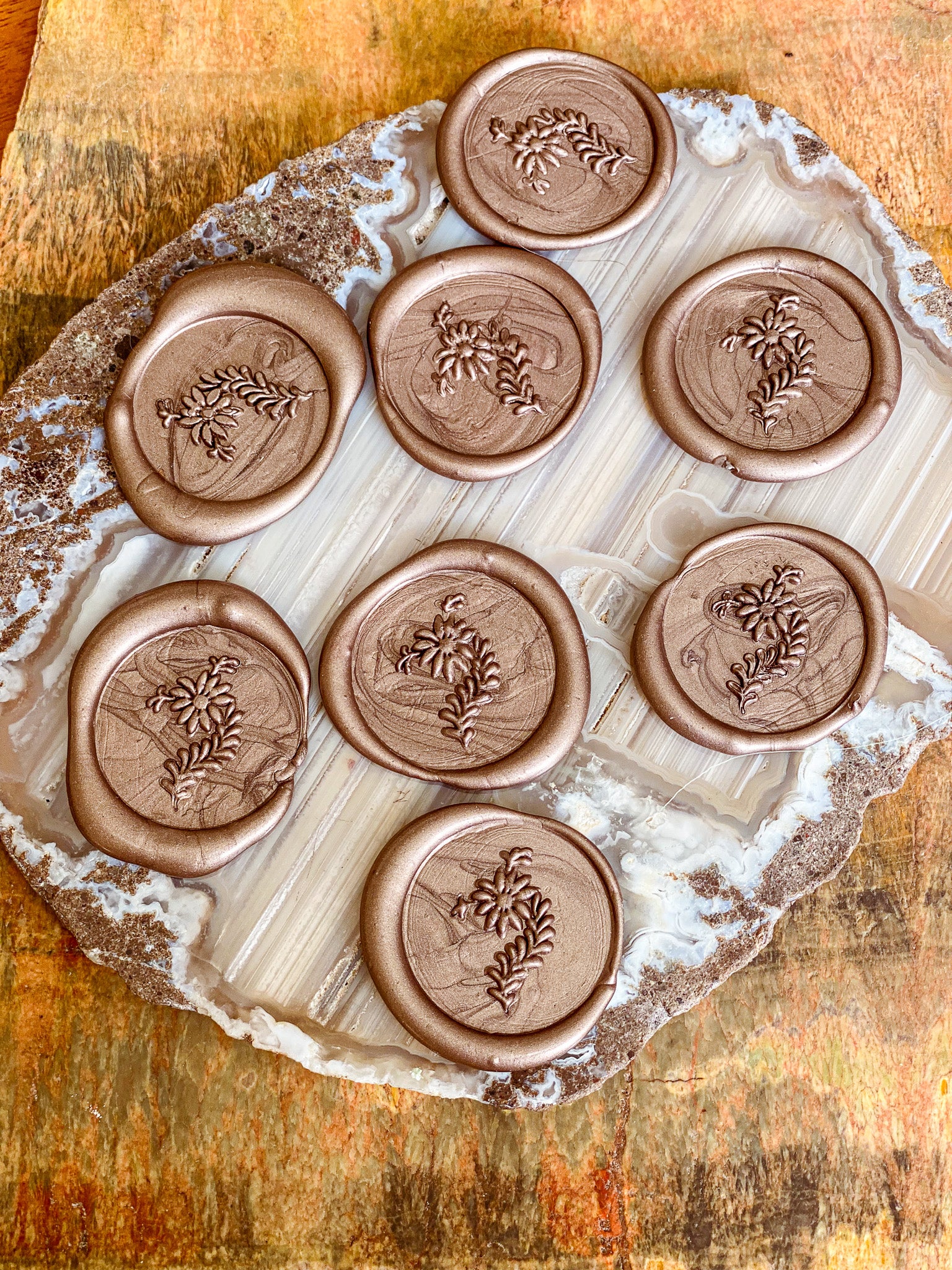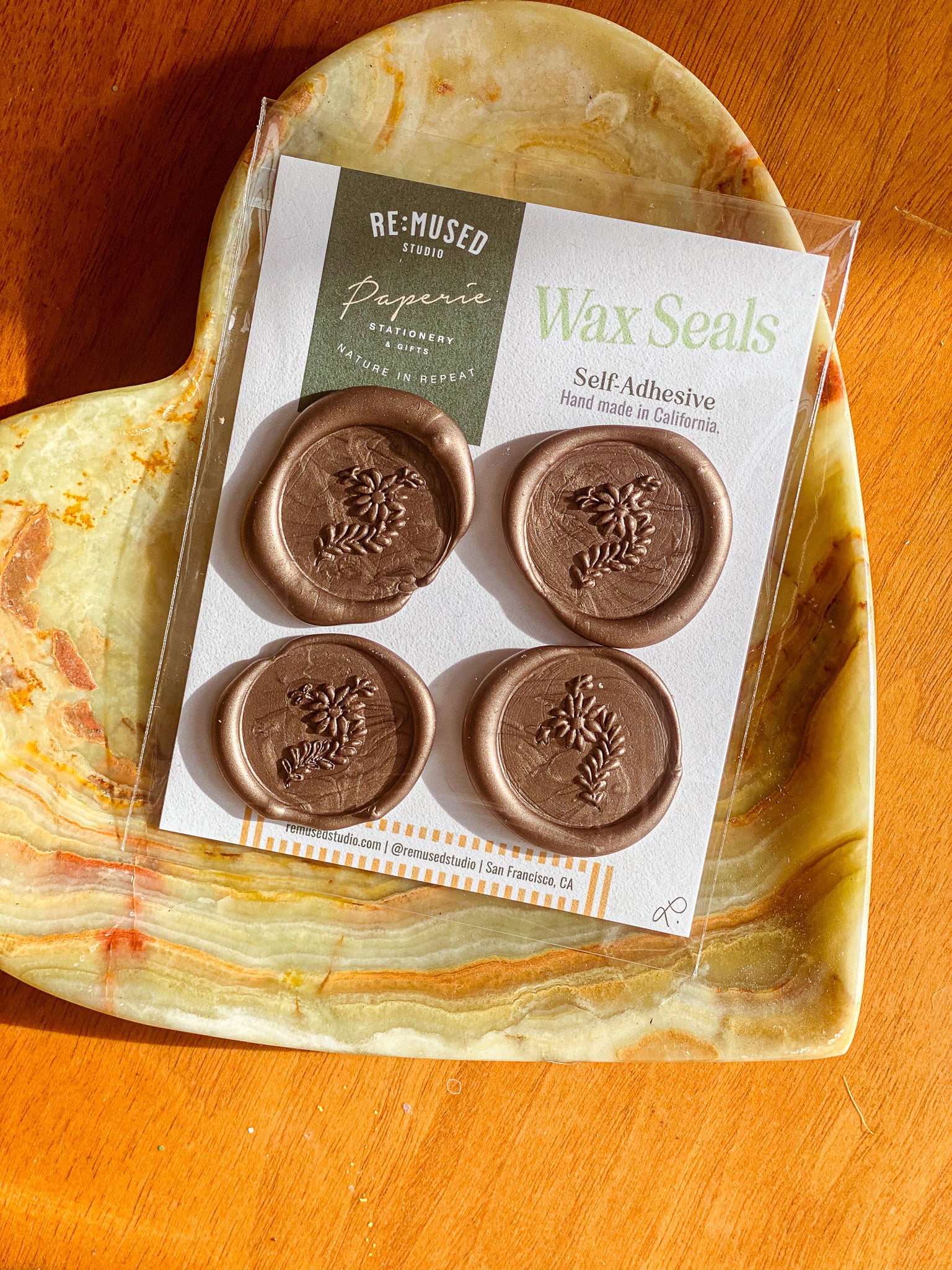 Designed for stationery lovers and gifting enthusiasts, our Wax Seal Sets of 4 bring artisanal charm to correspondence and packaging with a wildflower sprig motif from our Where the Wildflowers Roam collection in a shimmering platinum. Each seal is hand-poured and pressed, giving it unique character and depth. The self-adhesive backing allows for quick, mess-free application, making them perfect for greeting cards, invitations, and gift wrap. Sized at approximately 1 inch, these wax seals are sure to be a favorite for those who value thoughtful details and handmade craftsmanship.