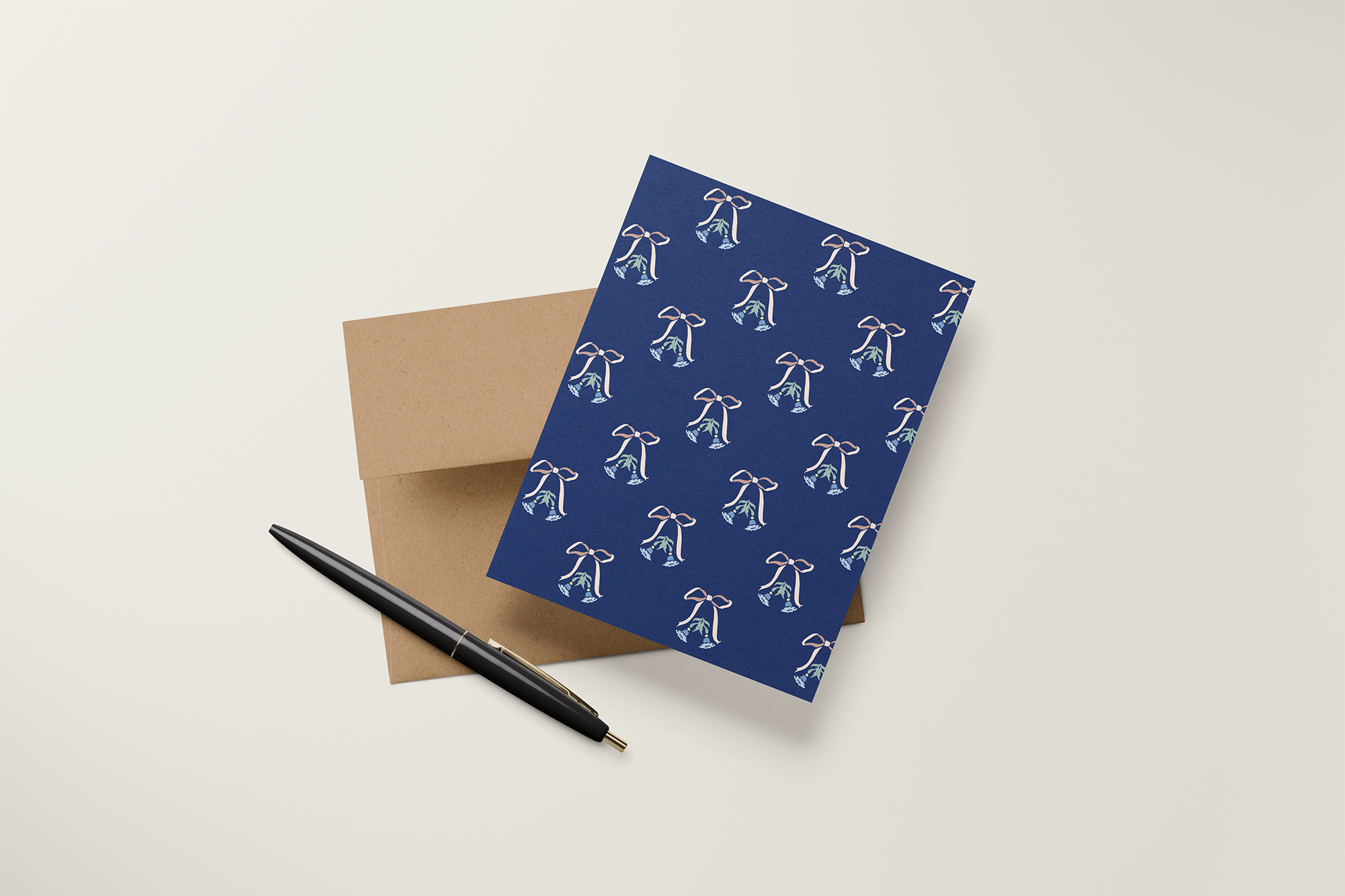A2 folded notecard with a ribboned bluebell motif on navy background and a blank interior to personalize your own note. Ideal for wedding bells, a baby shower or baby announcement.