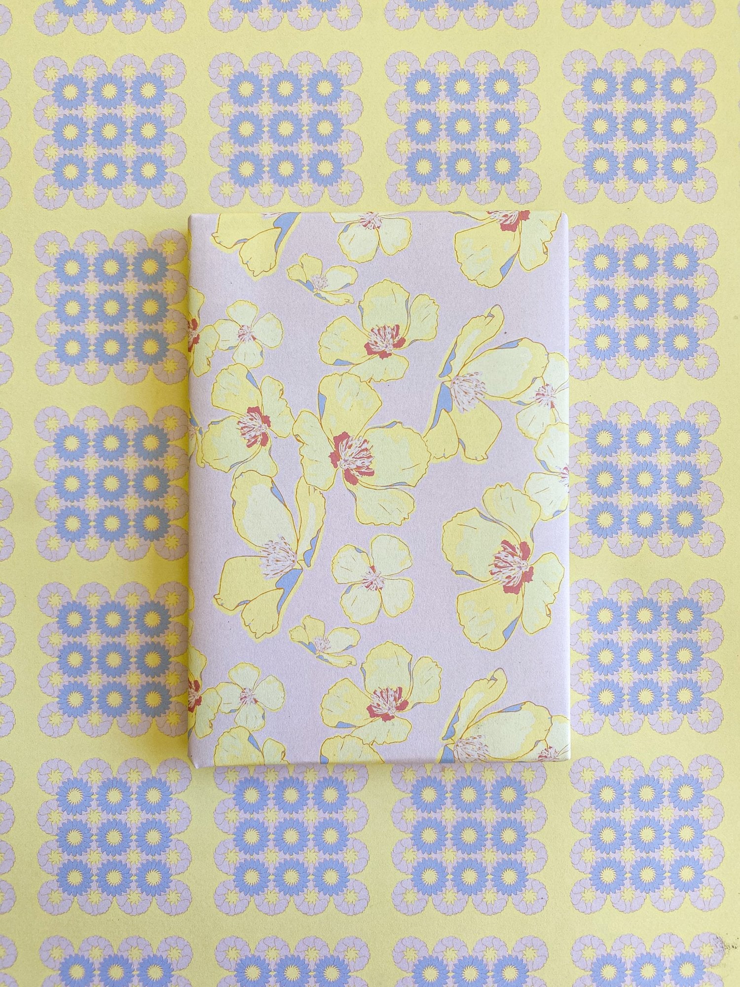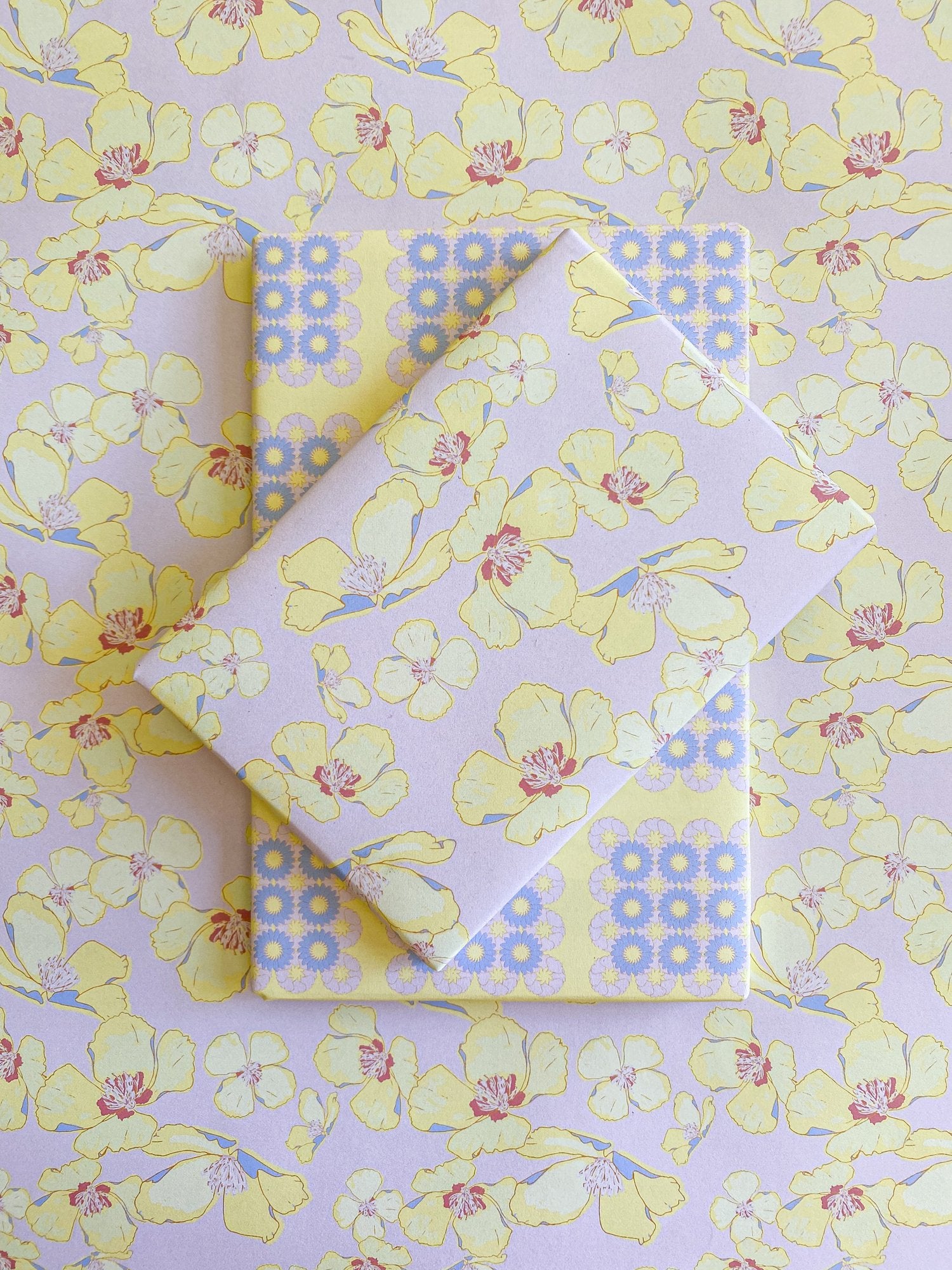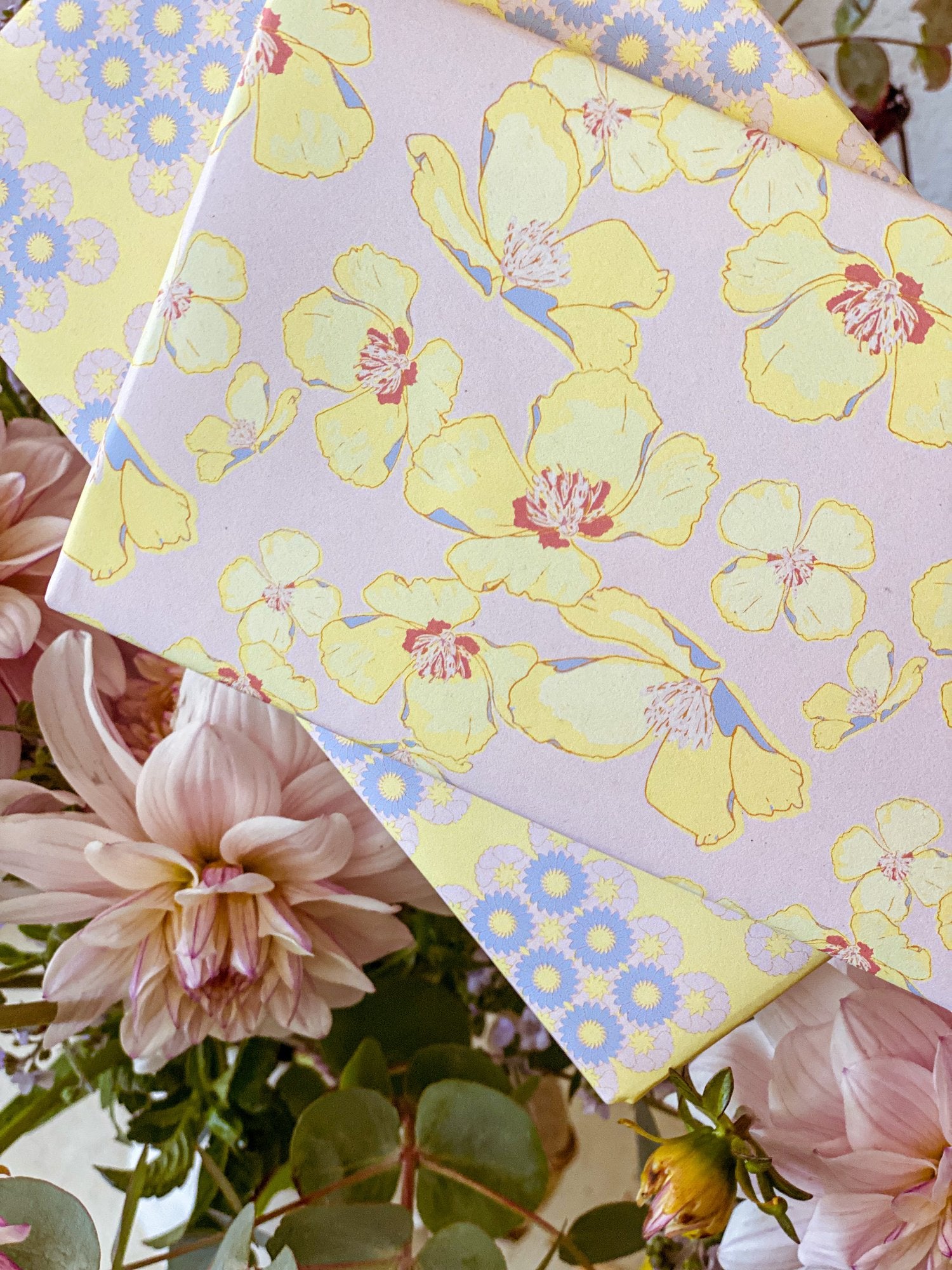 Double your possibilities with double-sided wrapping paper featuring a soft pink and yellow flutter of poppy petals on one side and graphic floral grid inspired motif on the other. The palette can take you from bridal to baby shower in one flip.