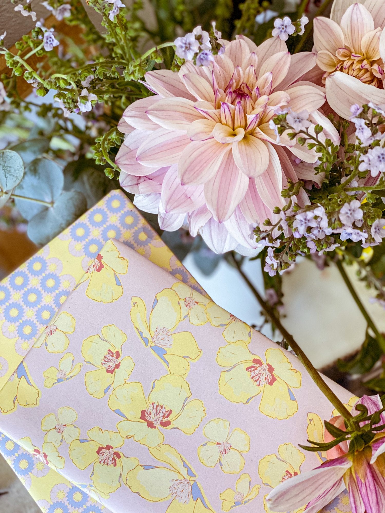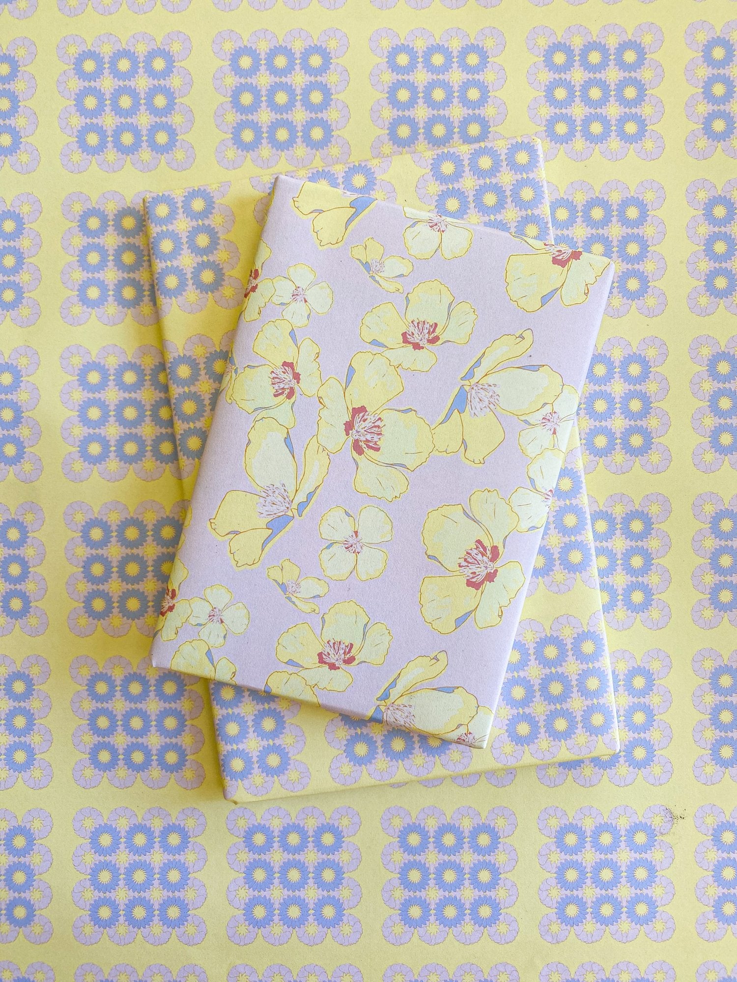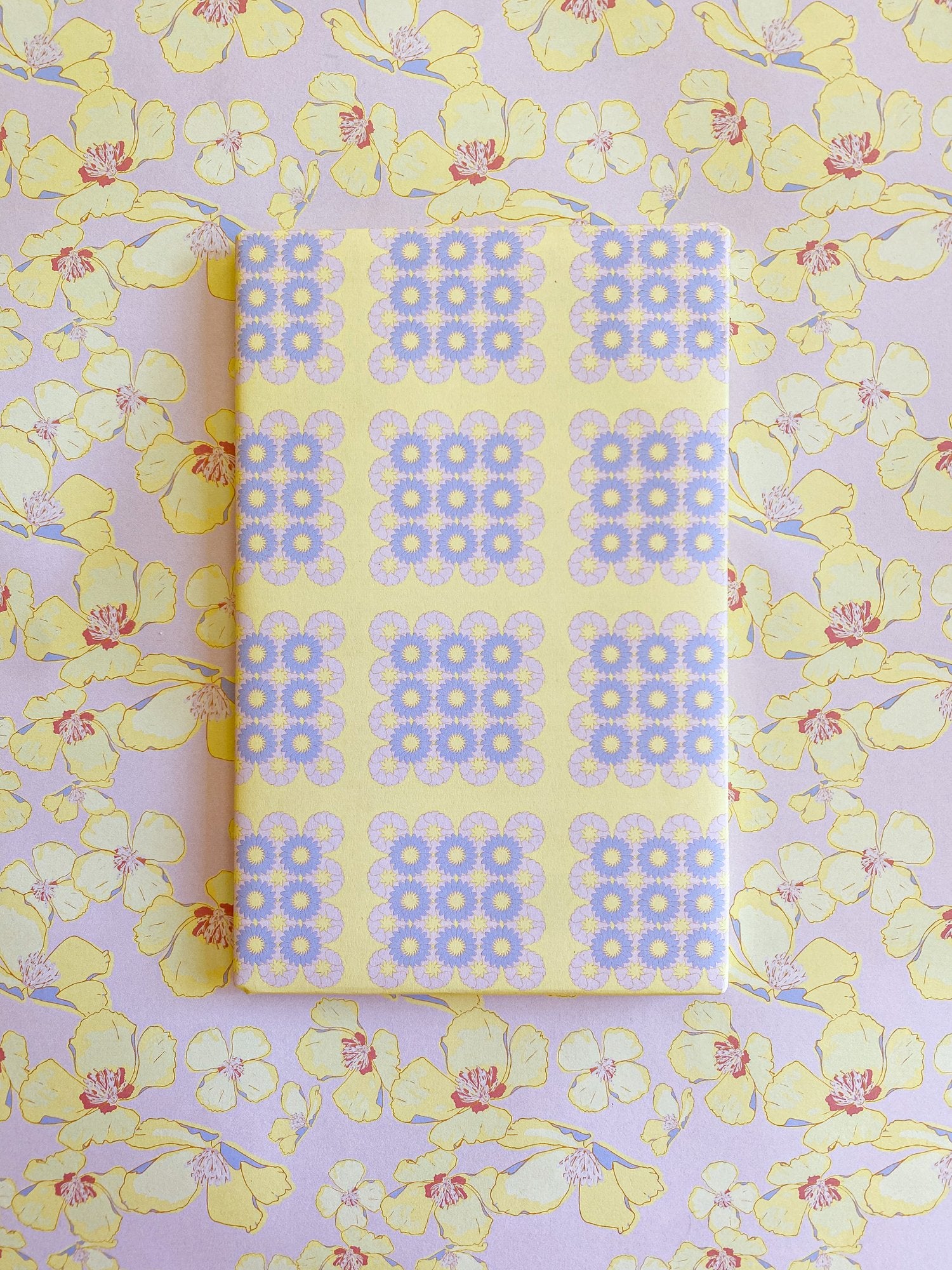 Double your possibilities with double-sided wrapping paper featuring a soft pink and yellow flutter of poppy petals on one side and graphic floral grid inspired motif on the other. The palette can take you from bridal to baby shower in one flip.
