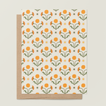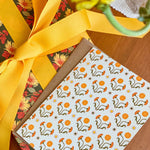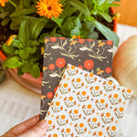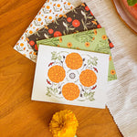 A2 notecards with a blank interior to personalize your own note. Features a calendula floral pattern from the “Harvest Garden Collection” to accompany the double-sided gift wrap or gift on it’s own. The calendula flower is known for its healing properties. Send well wishes and healing vibes to a dear one with this card.
