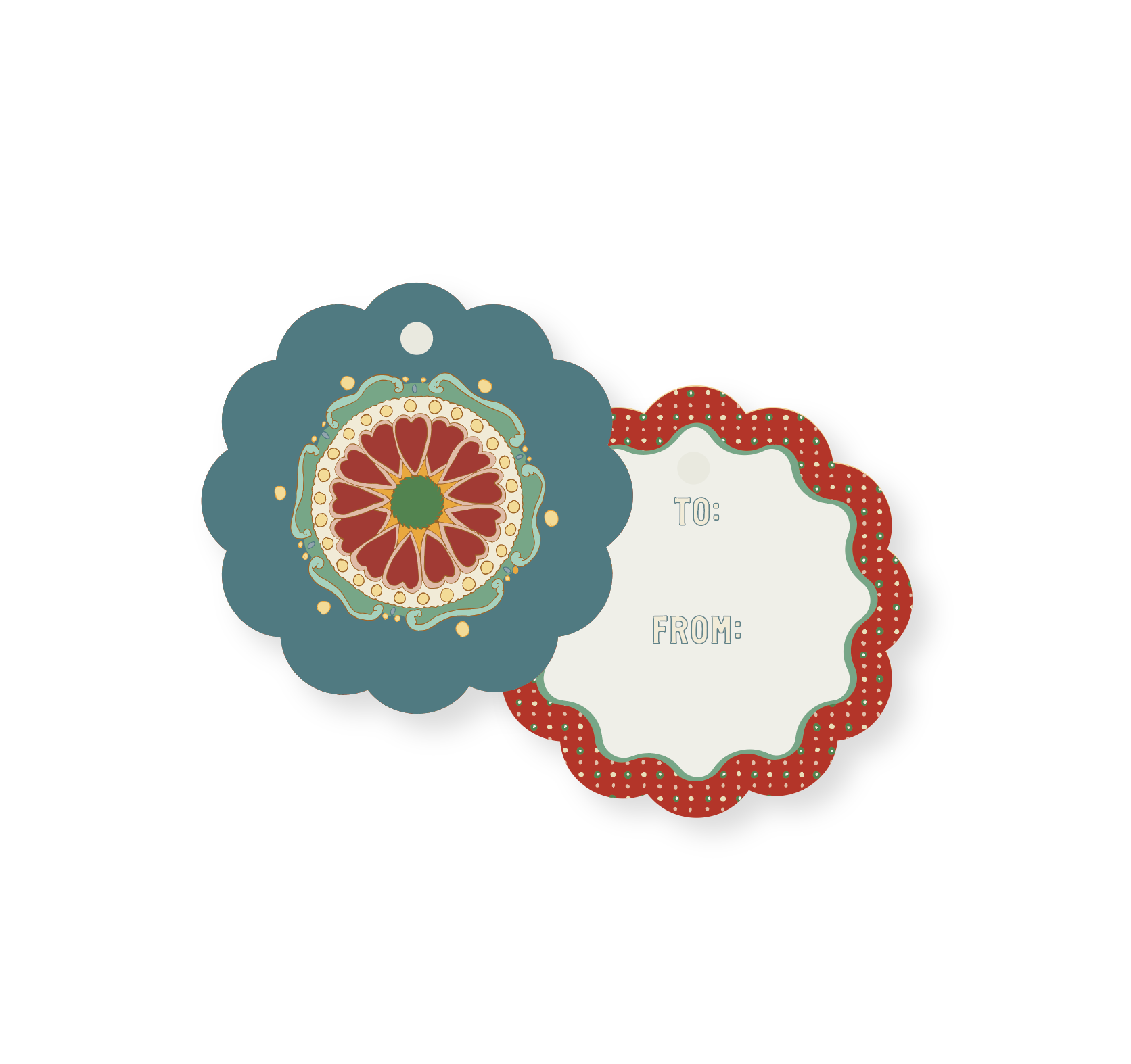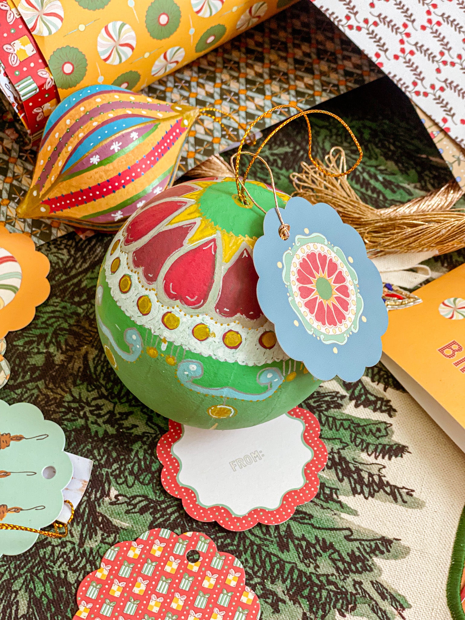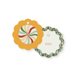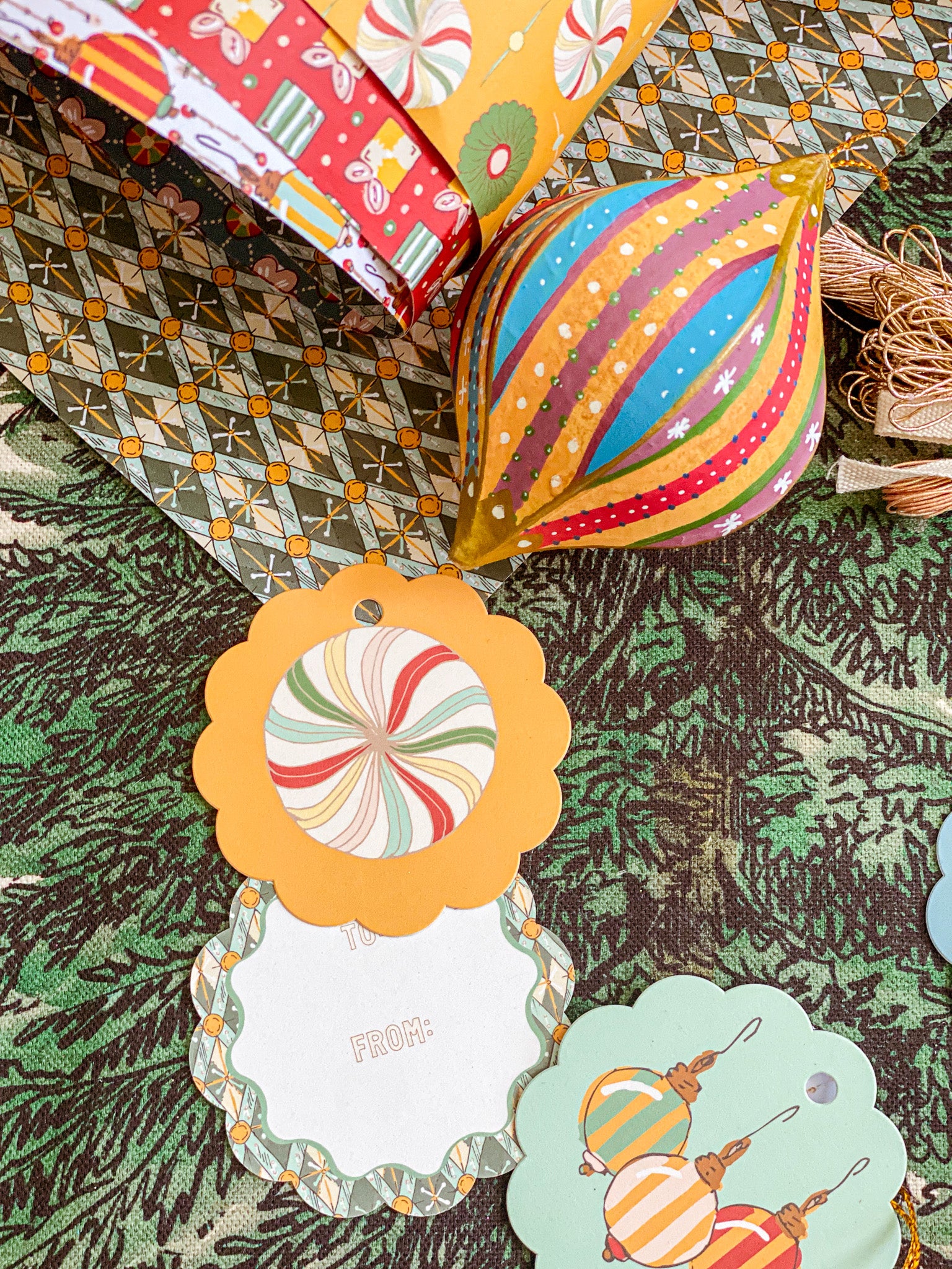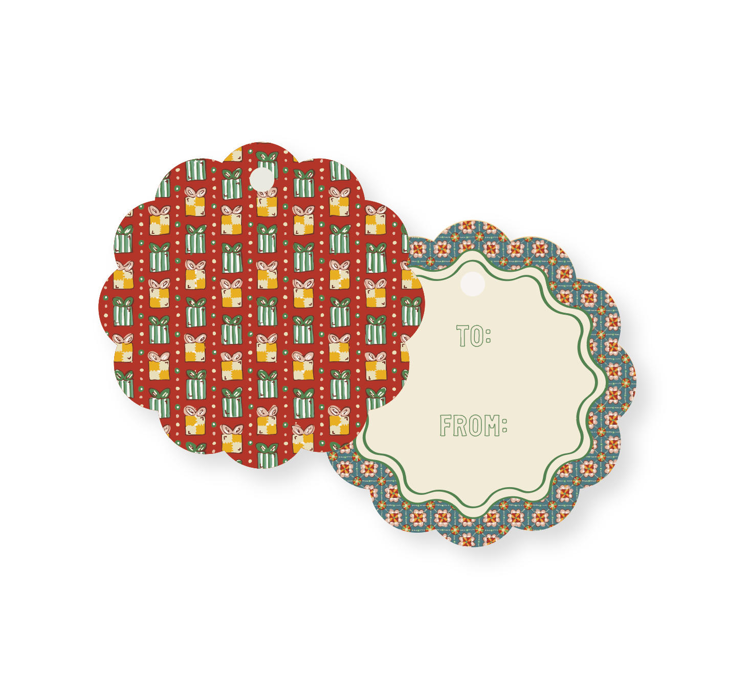 Bring a European vintage style to your gifting with the Carnivaliday gift tag set, a festive array of double-sided holiday tags featuring a vibrant vintage-inspired holiday motifs and patterns. Hand-drawn candies, gift boxes, carousel and ornament illustrations are featured on one side and the reverse has To/From graphics framed in diamond and dot patterns reminiscent of French and Italian block printed papers. Combining nostalgic circus-inspired motifs and retro holiday décor, these gift tags pair perfectly with our coordinating double-sided gift wrap and our premium gift bags for an extra special holiday presentation with a touch of vintage whimsy.
