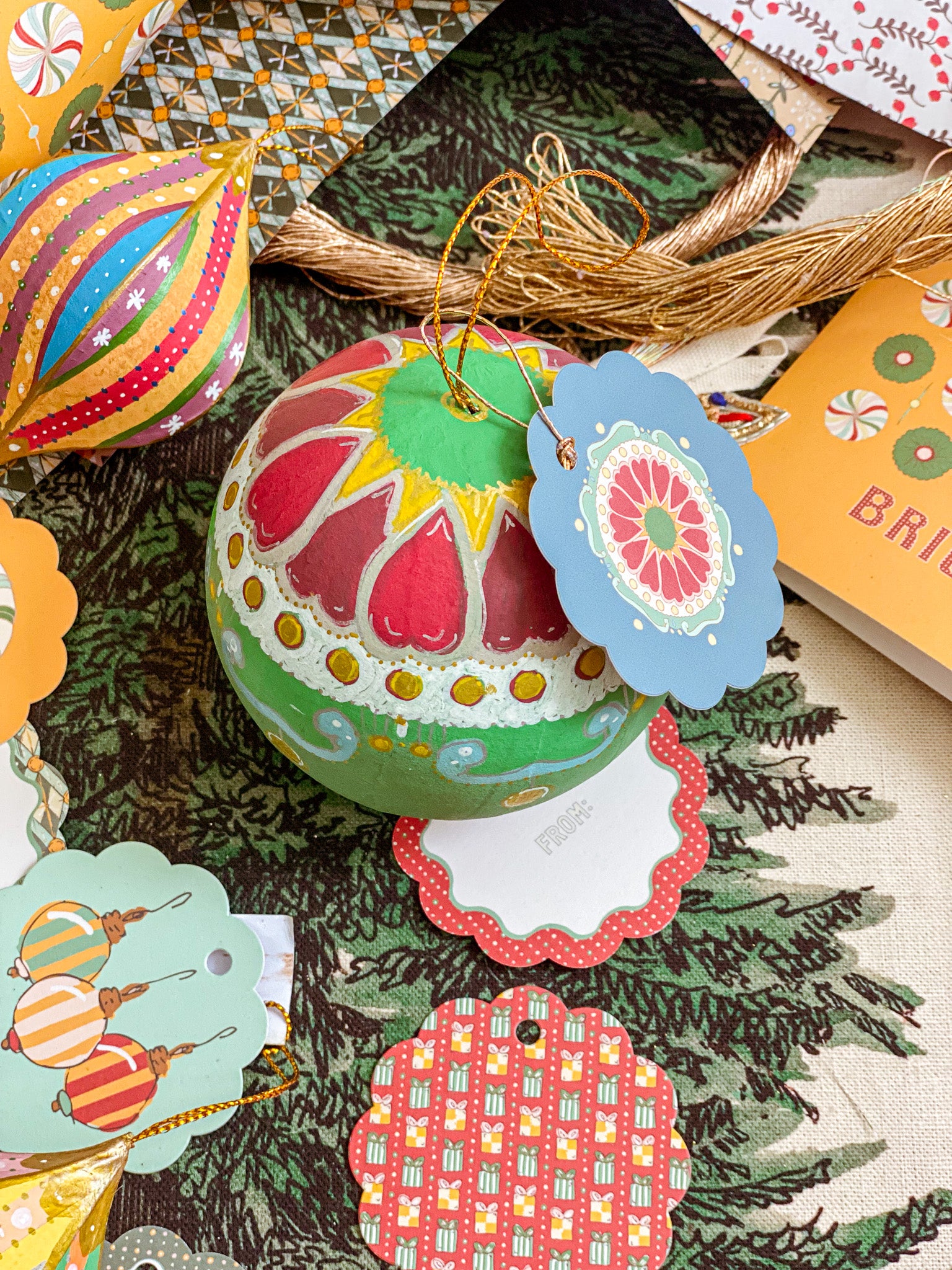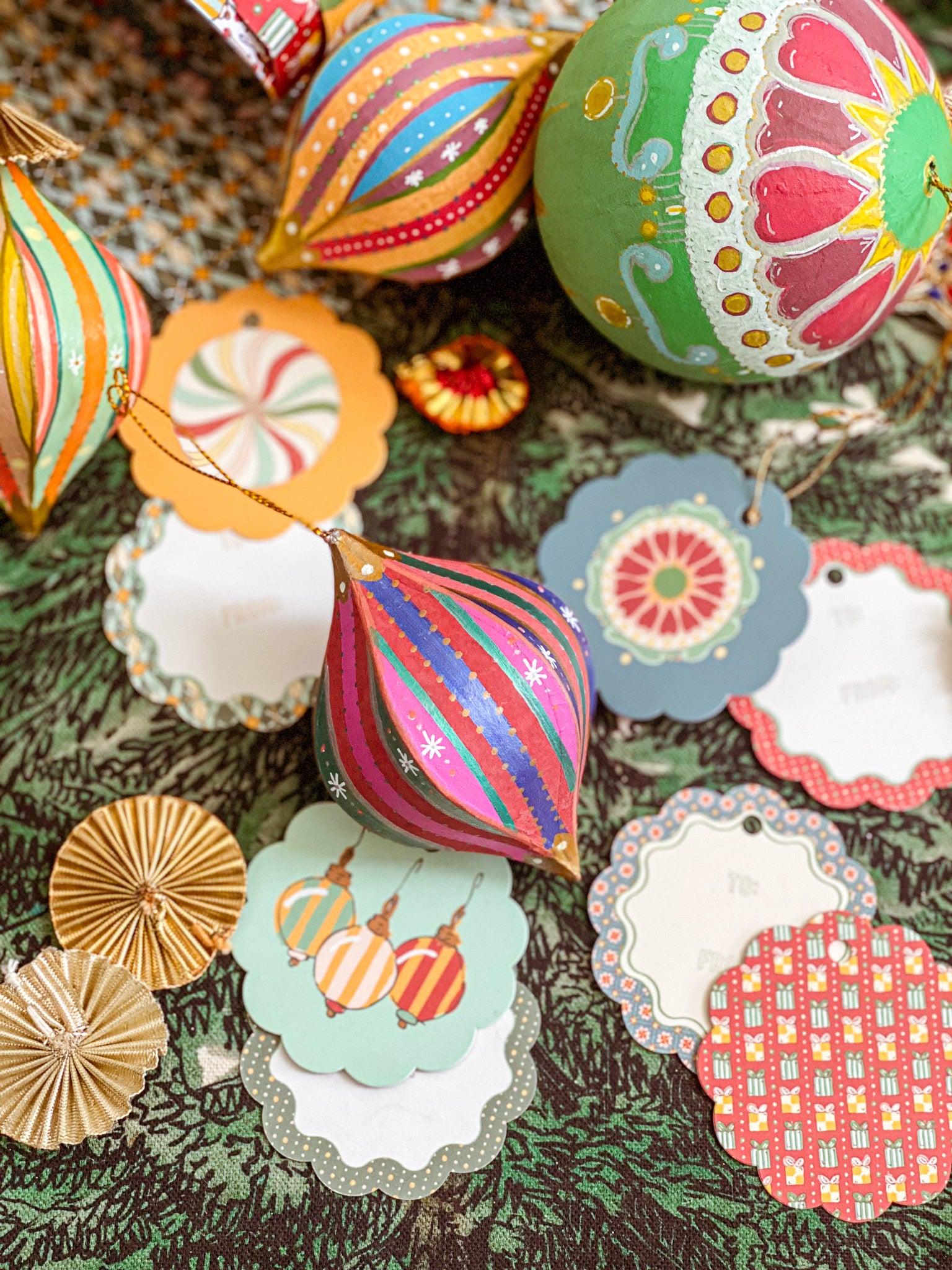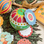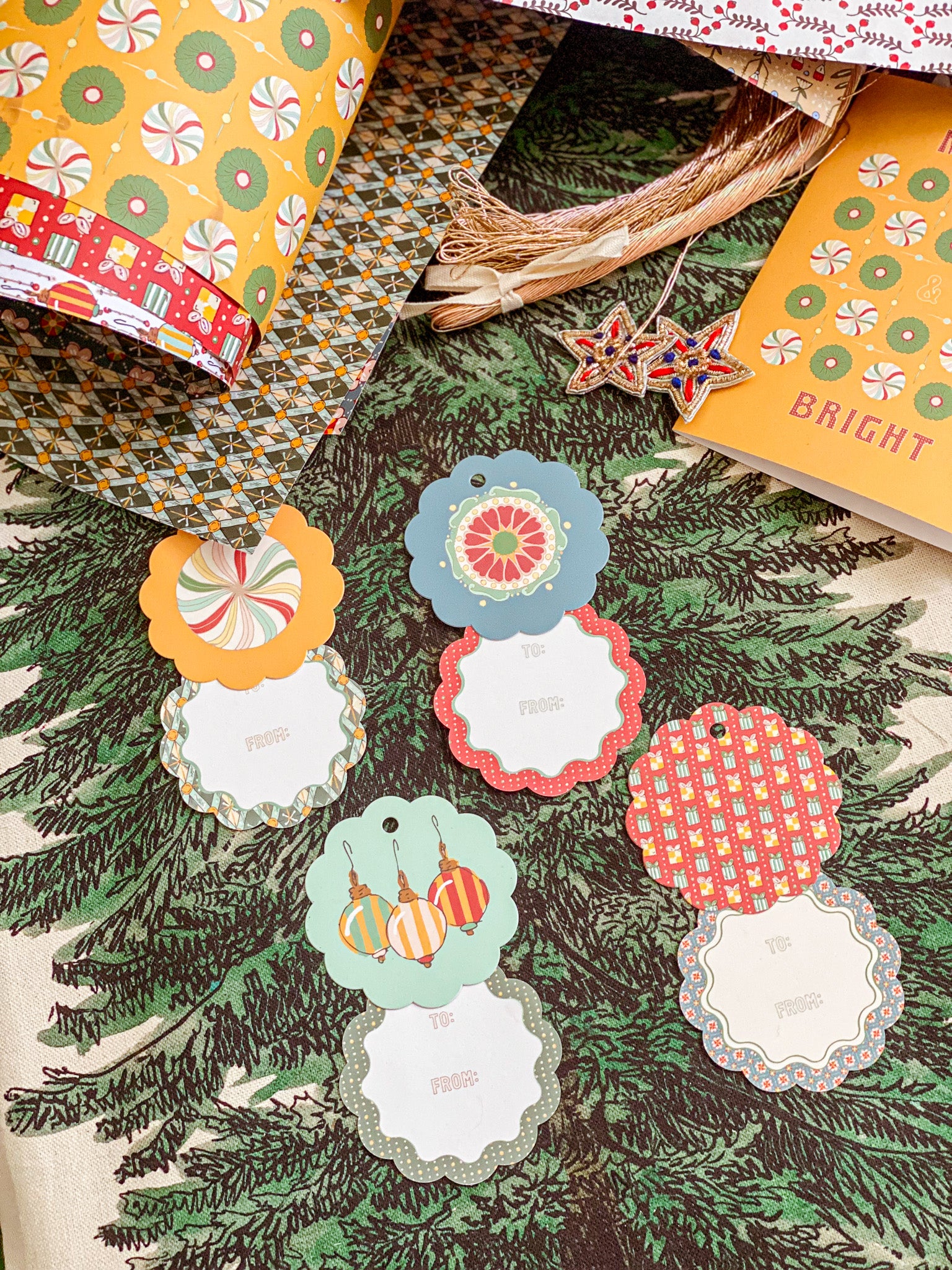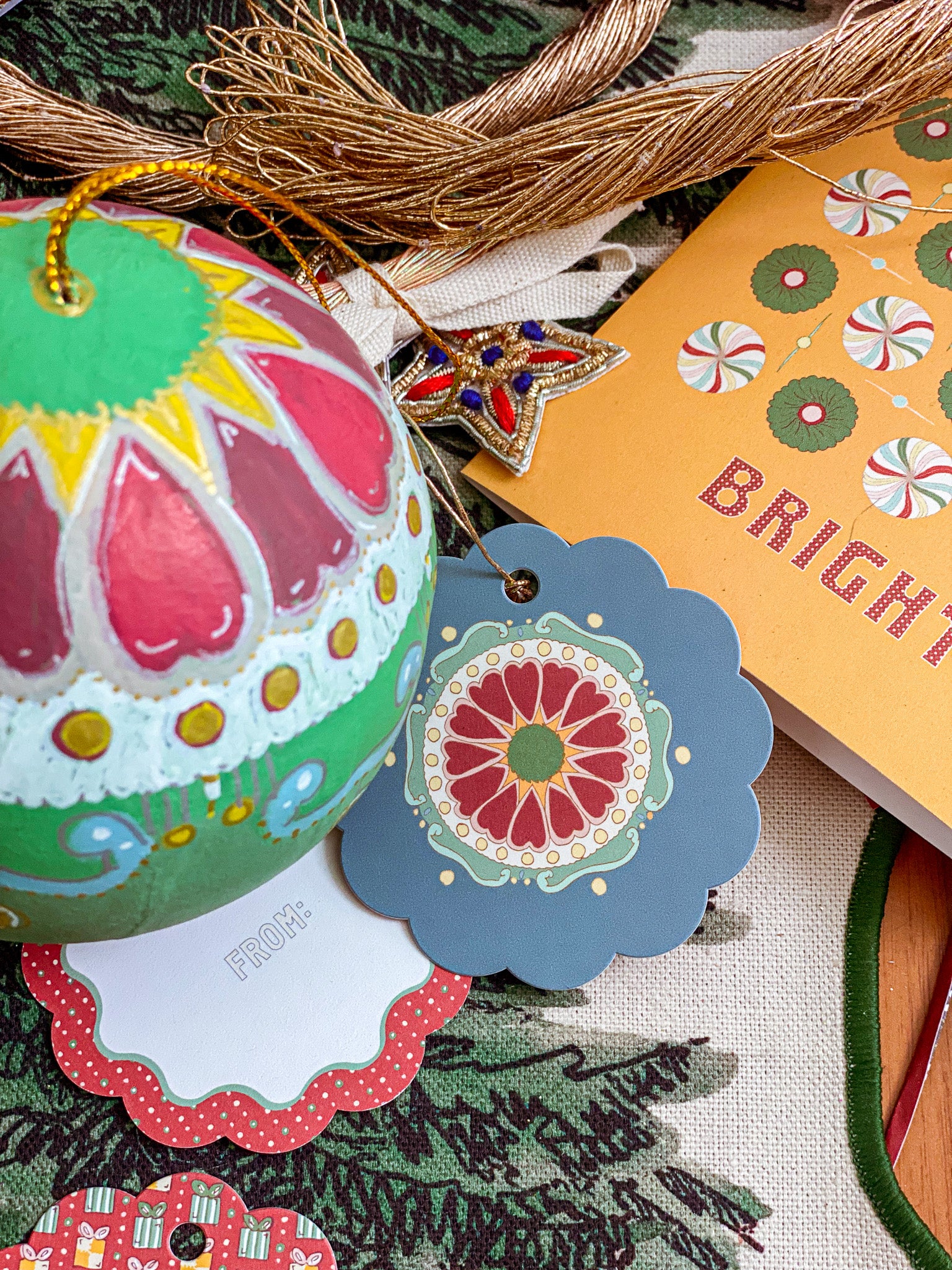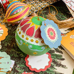 Bring a European vintage style to your gifting with the Carnivaliday gift tag set, a festive array of double-sided holiday tags featuring a vibrant vintage-inspired holiday motifs and patterns. Hand-drawn candies, gift boxes, carousel and ornament illustrations are featured on one side and the reverse has To/From graphics framed in diamond and dot patterns reminiscent of French and Italian block printed papers. Combining nostalgic circus-inspired motifs and retro holiday décor, these gift tags pair perfectly with our coordinating double-sided gift wrap and our premium gift bags for an extra special holiday presentation with a touch of vintage whimsy.