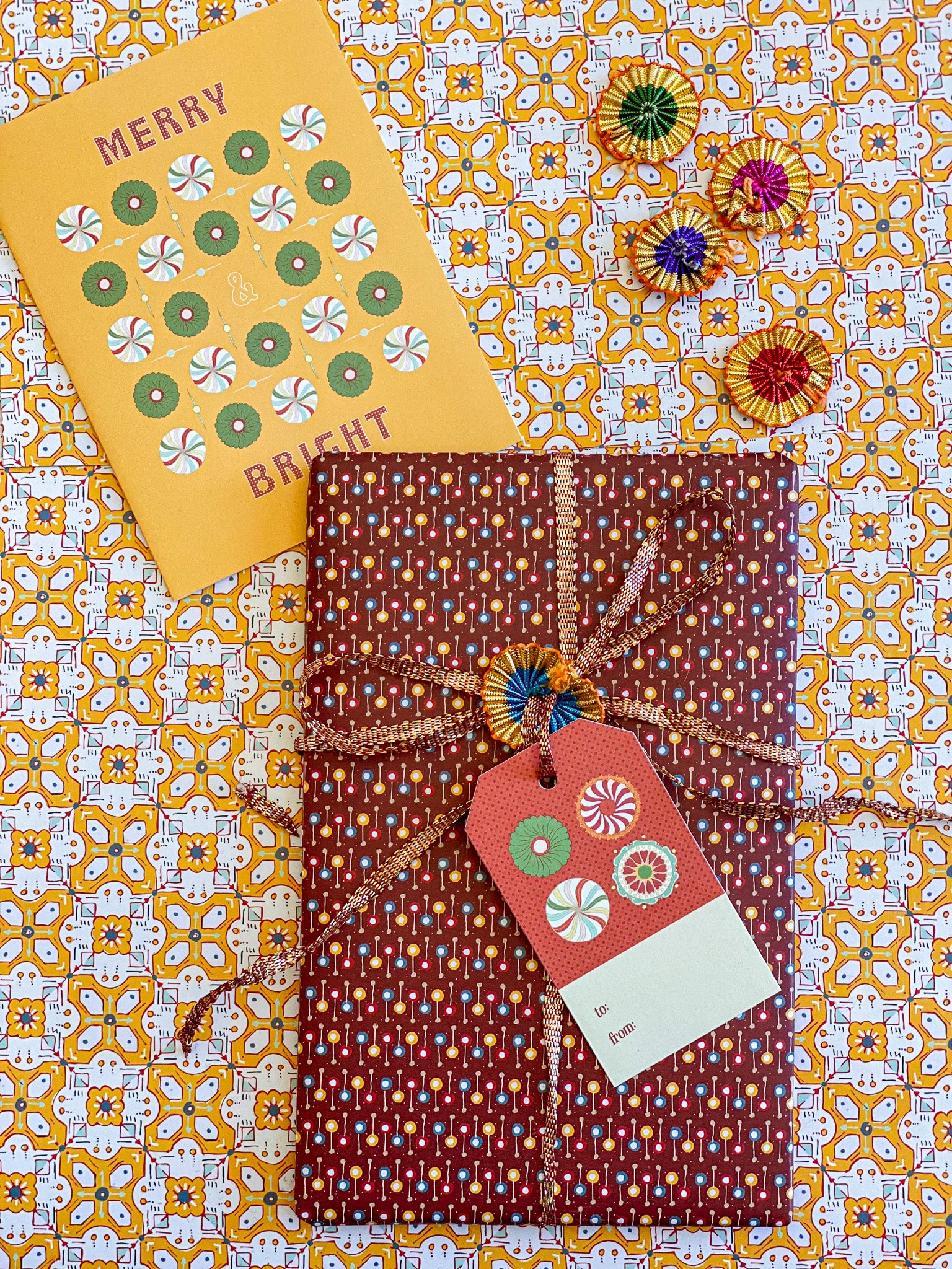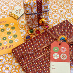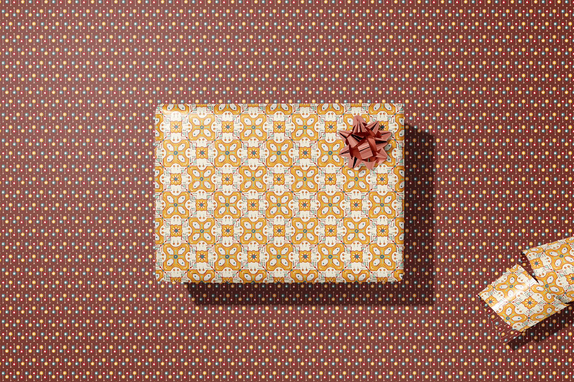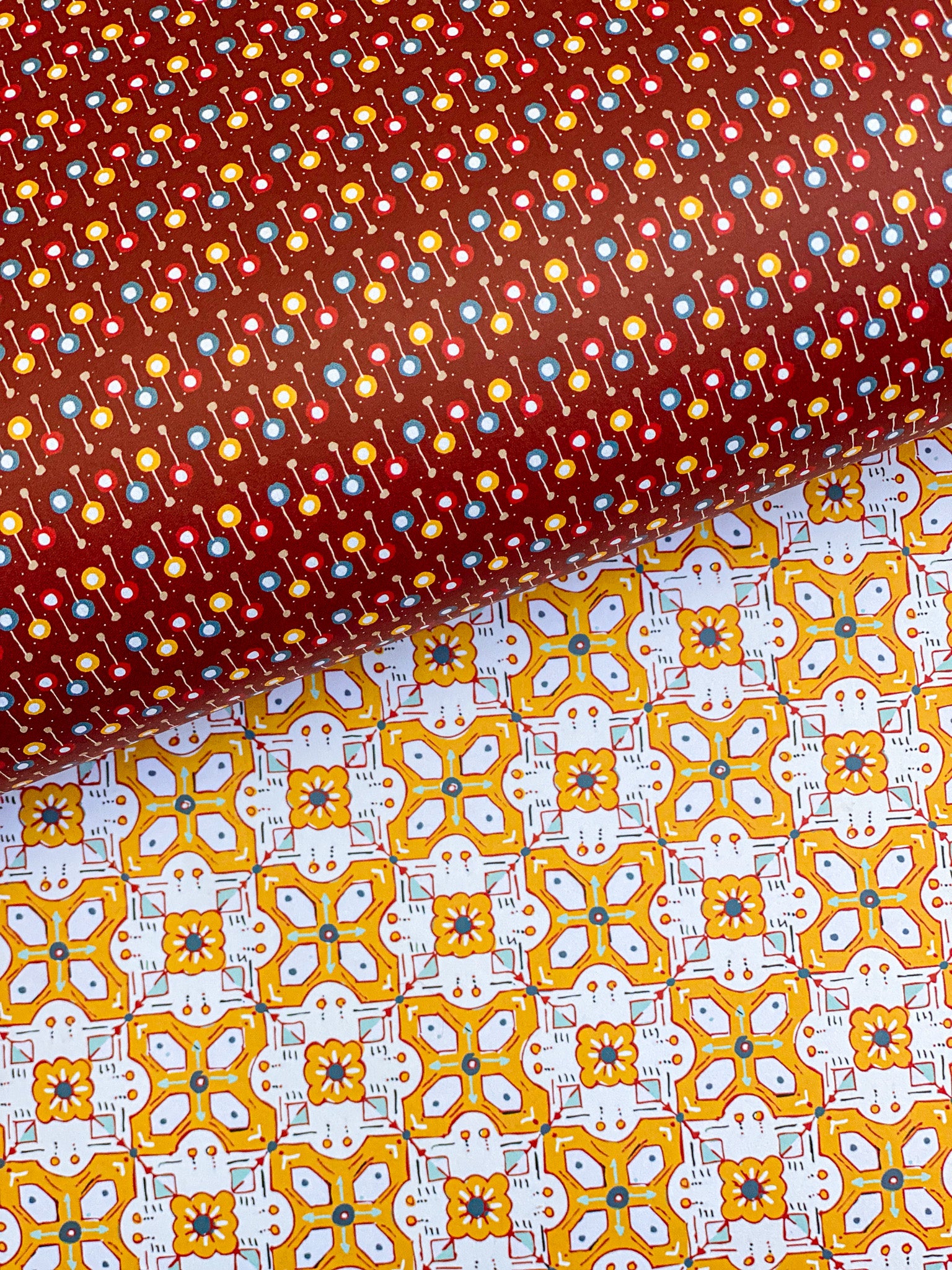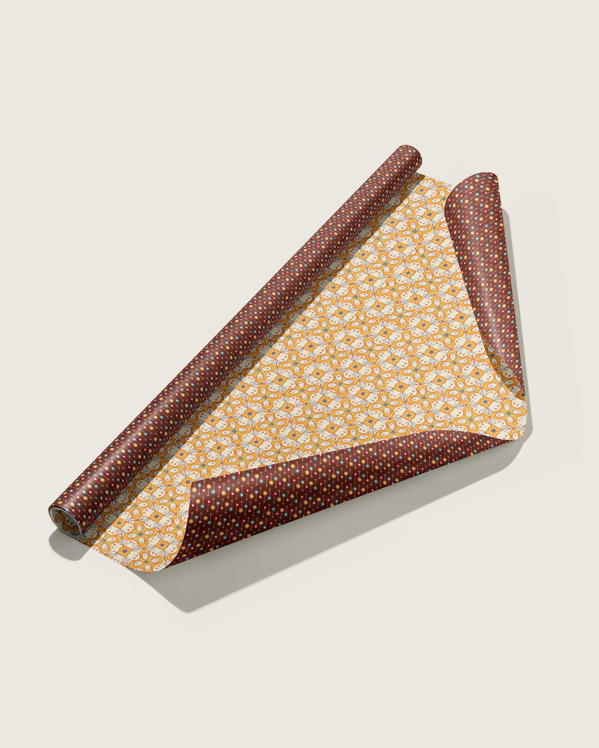 Bring a timeless festive fashion to your gifting with Festile, a double-sided holiday wrapping paper from our Carnivaliday capsule collection. One side features a cheerful Italian inspired tile pattern of warm yellows and creams with soft accents of blue, green and red. The reverse showcases a little bit of vintage whimsy with a vibrant dot pattern in rich holiday colors on a deep red backdrop. With its structured designs and nostalgic charm, Festile offers two coordinated looks in one versatile wrap — perfect for Christmas presents, party favors, holiday displays or decorations with a touch of festive flair that will stand out from anything cliché this season.
