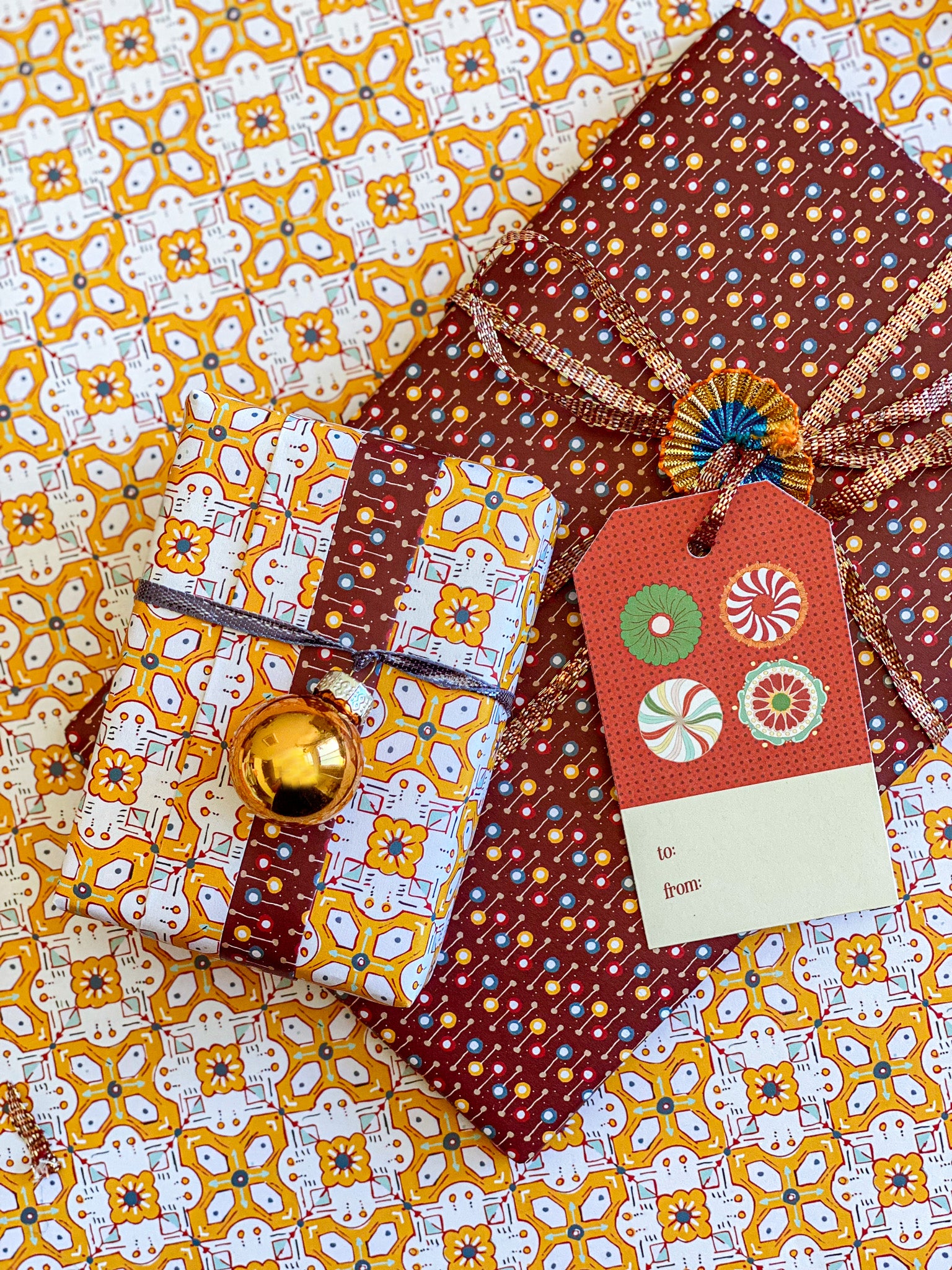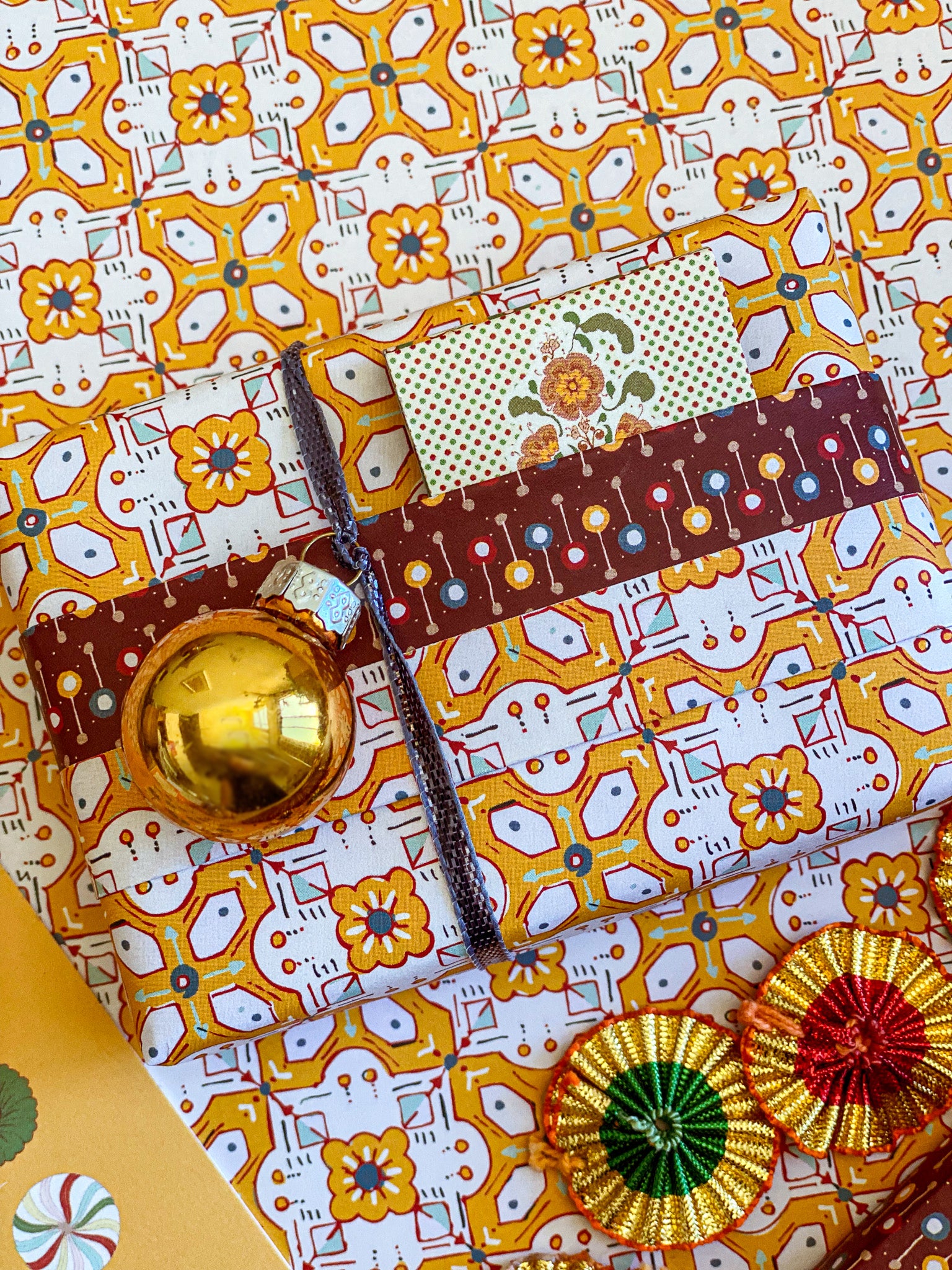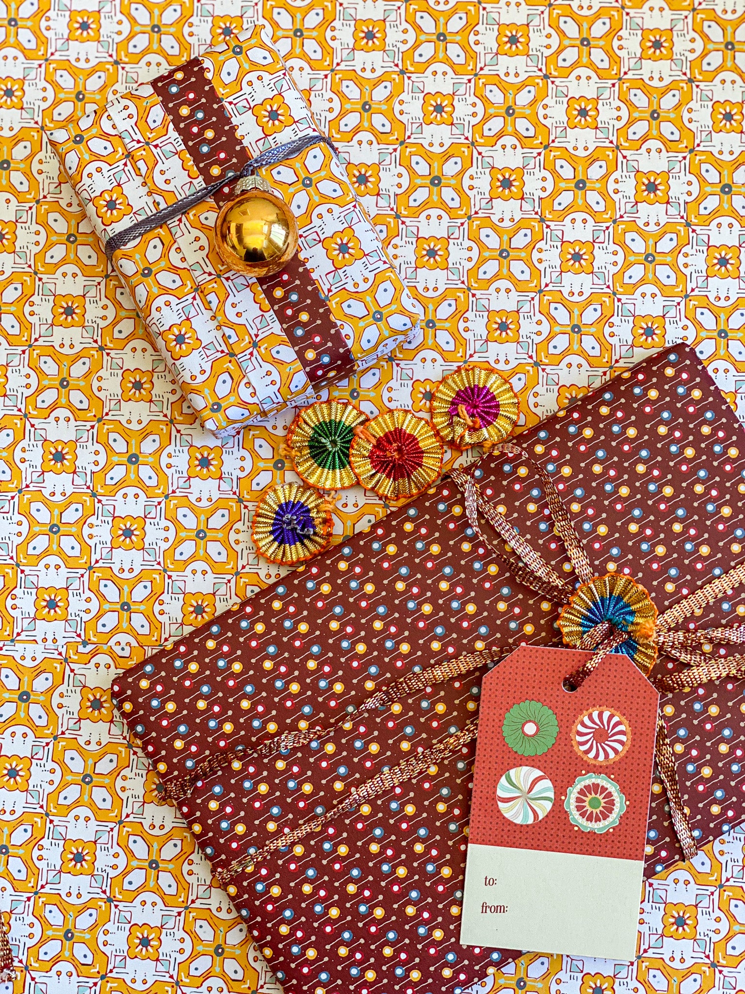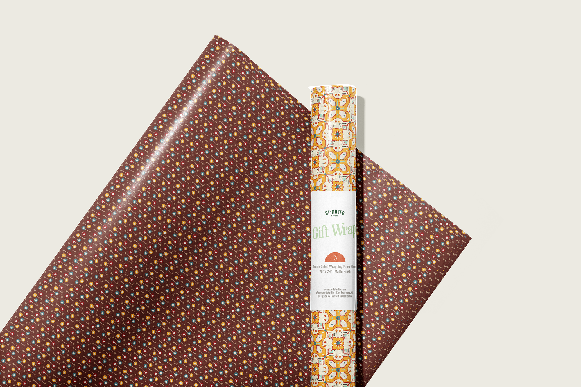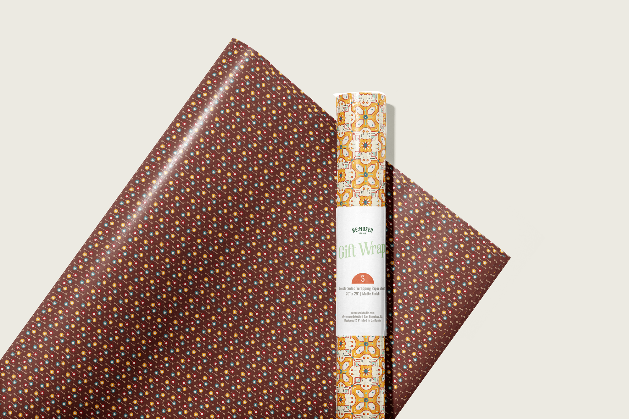 Bring a timeless festive fashion to your gifting with Festile, a double-sided holiday wrapping paper from our Carnivaliday capsule collection. One side features a cheerful Italian inspired tile pattern of warm yellows and creams with soft accents of blue, green and red. The reverse showcases a little bit of vintage whimsy with a vibrant dot pattern in rich holiday colors on a deep red backdrop. With its structured designs and nostalgic charm, Festile offers two coordinated looks in one versatile wrap — perfect for Christmas presents, party favors, holiday displays or decorations with a touch of festive flair that will stand out from anything cliché this season.