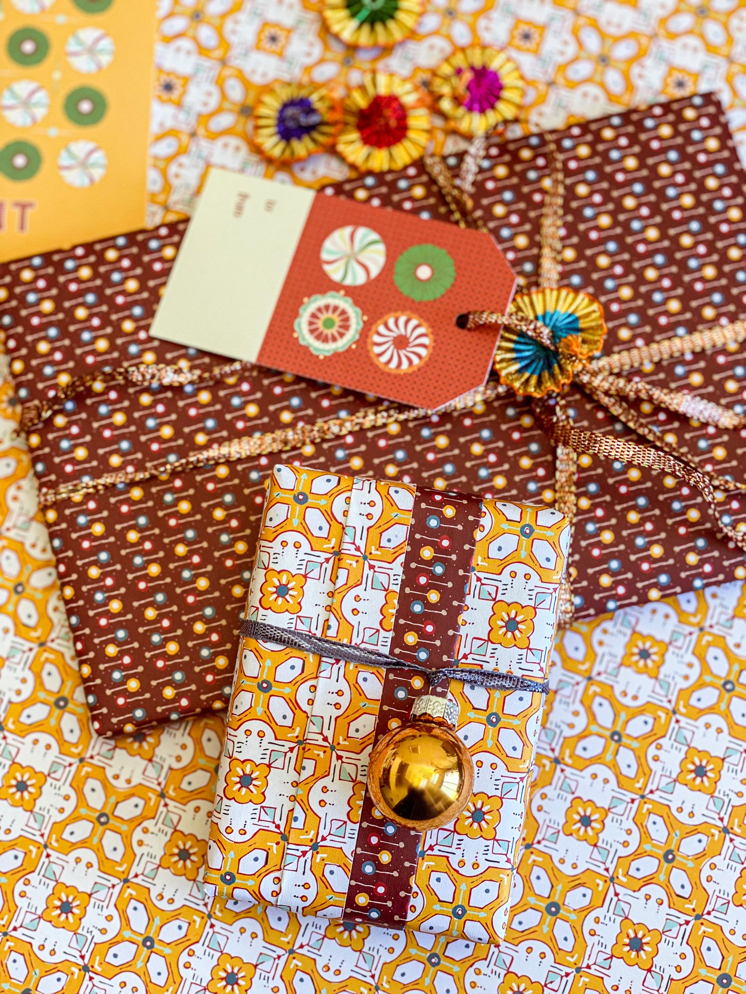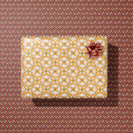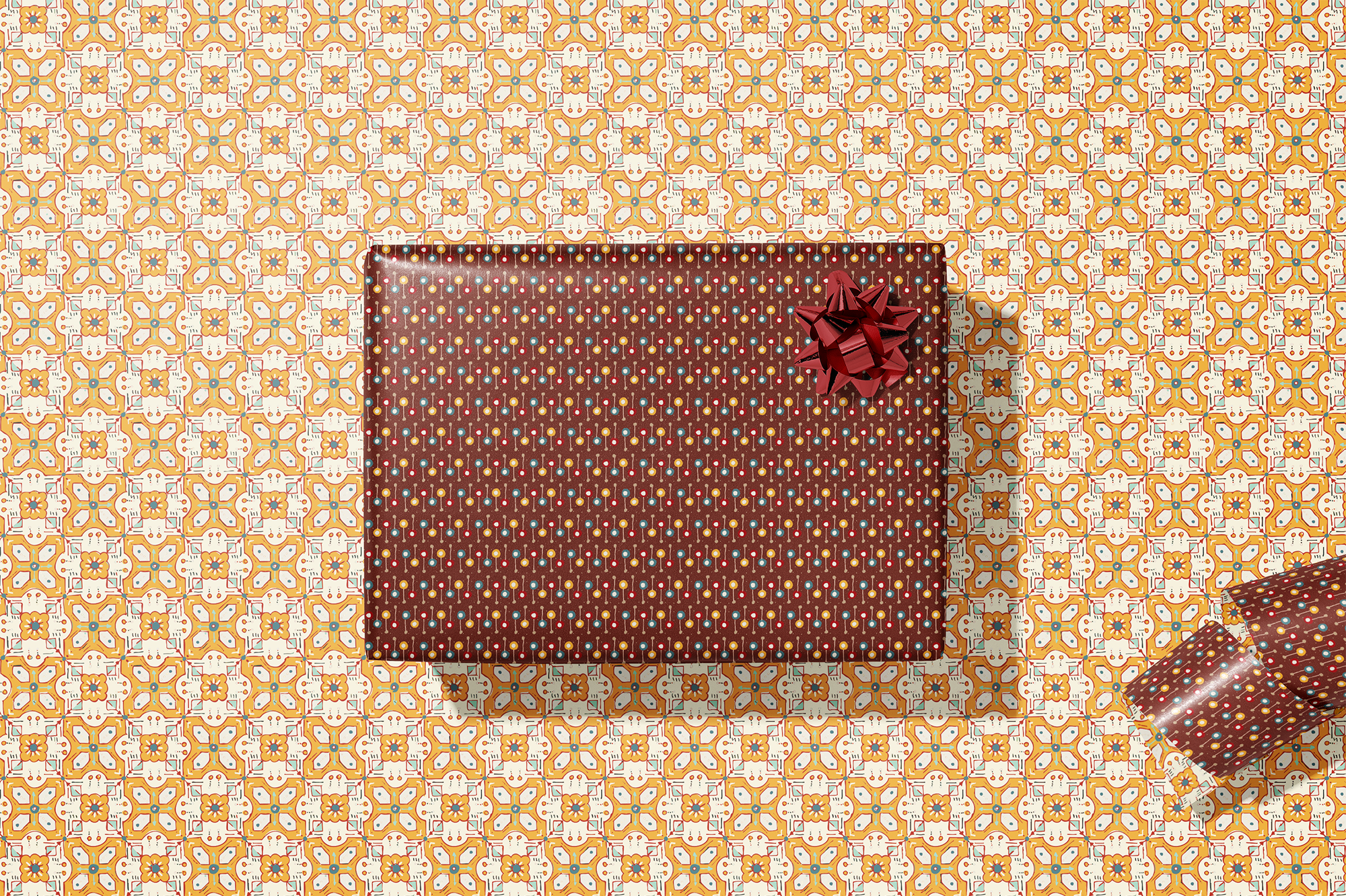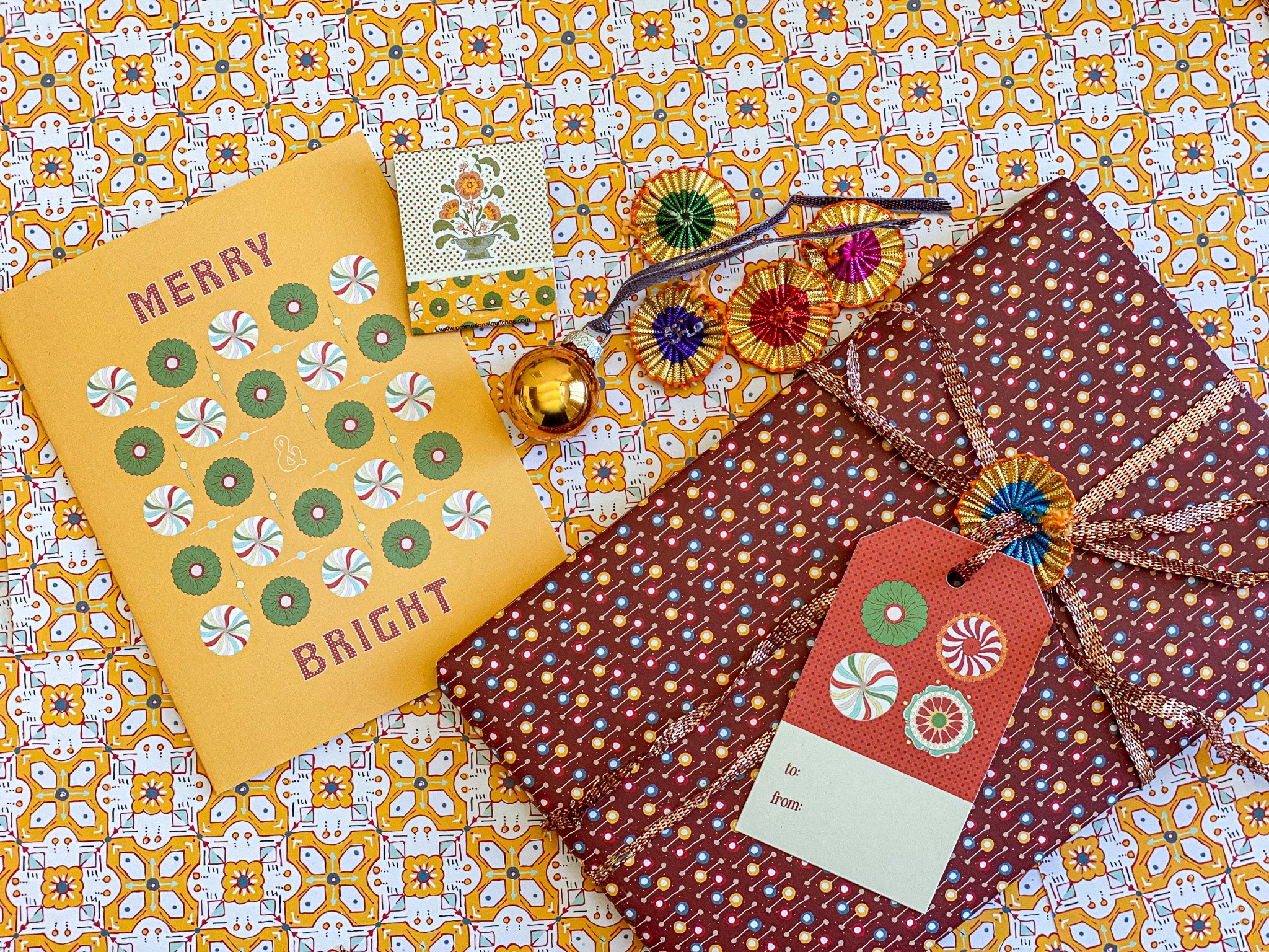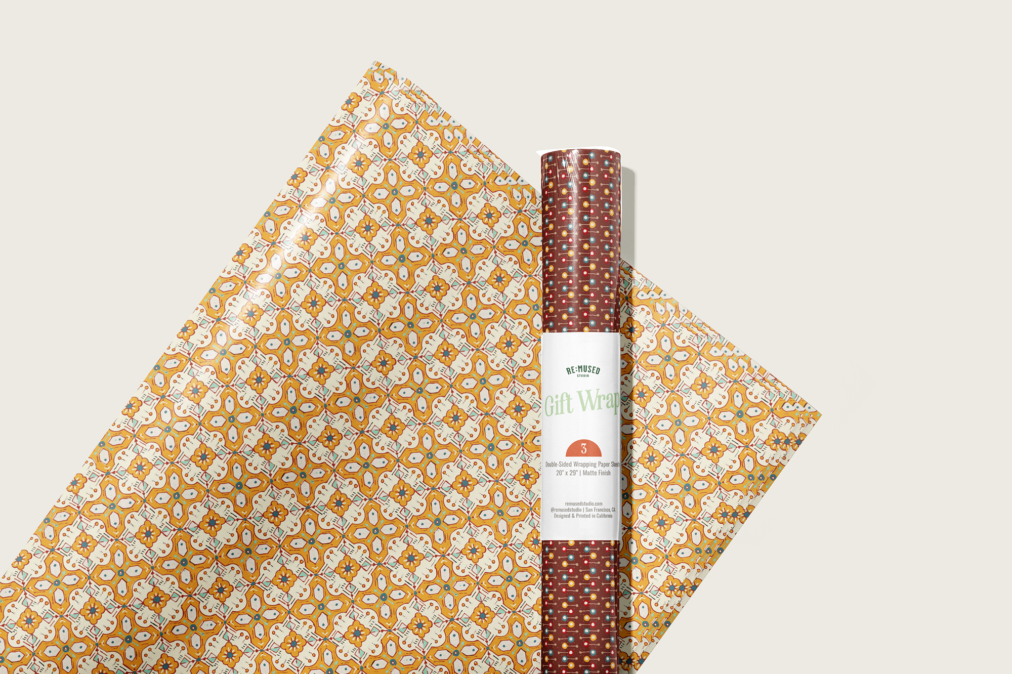 Bring a timeless festive fashion to your gifting with Festile, a double-sided holiday wrapping paper from our Carnivaliday capsule collection. One side features a cheerful Italian inspired tile pattern of warm yellows and creams with soft accents of blue, green and red. The reverse showcases a little bit of vintage whimsy with a vibrant dot pattern in rich holiday colors on a deep red backdrop. With its structured designs and nostalgic charm, Festile offers two coordinated looks in one versatile wrap — perfect for Christmas presents, party favors, holiday displays or decorations with a touch of festive flair that will stand out from anything cliché this season.