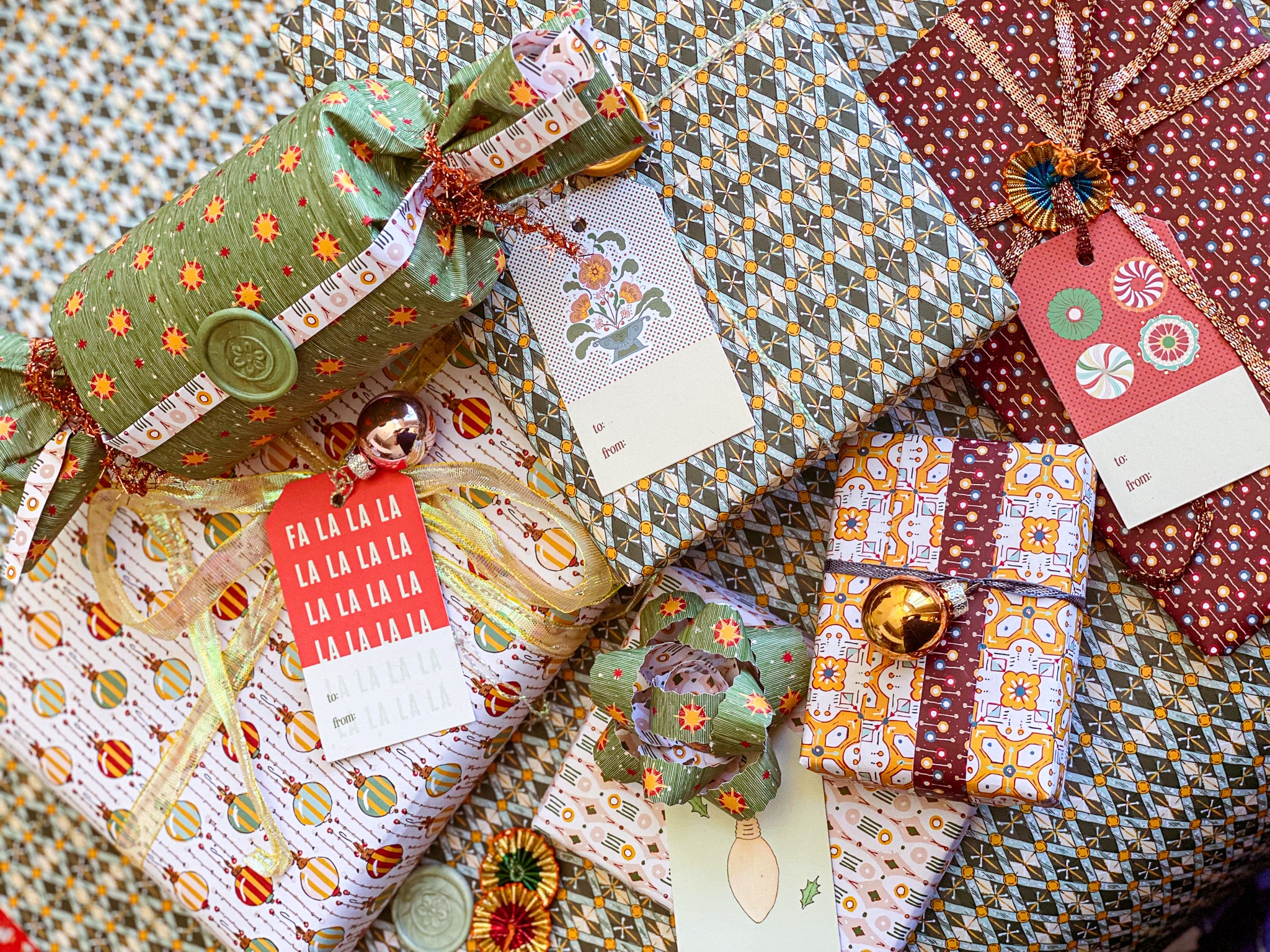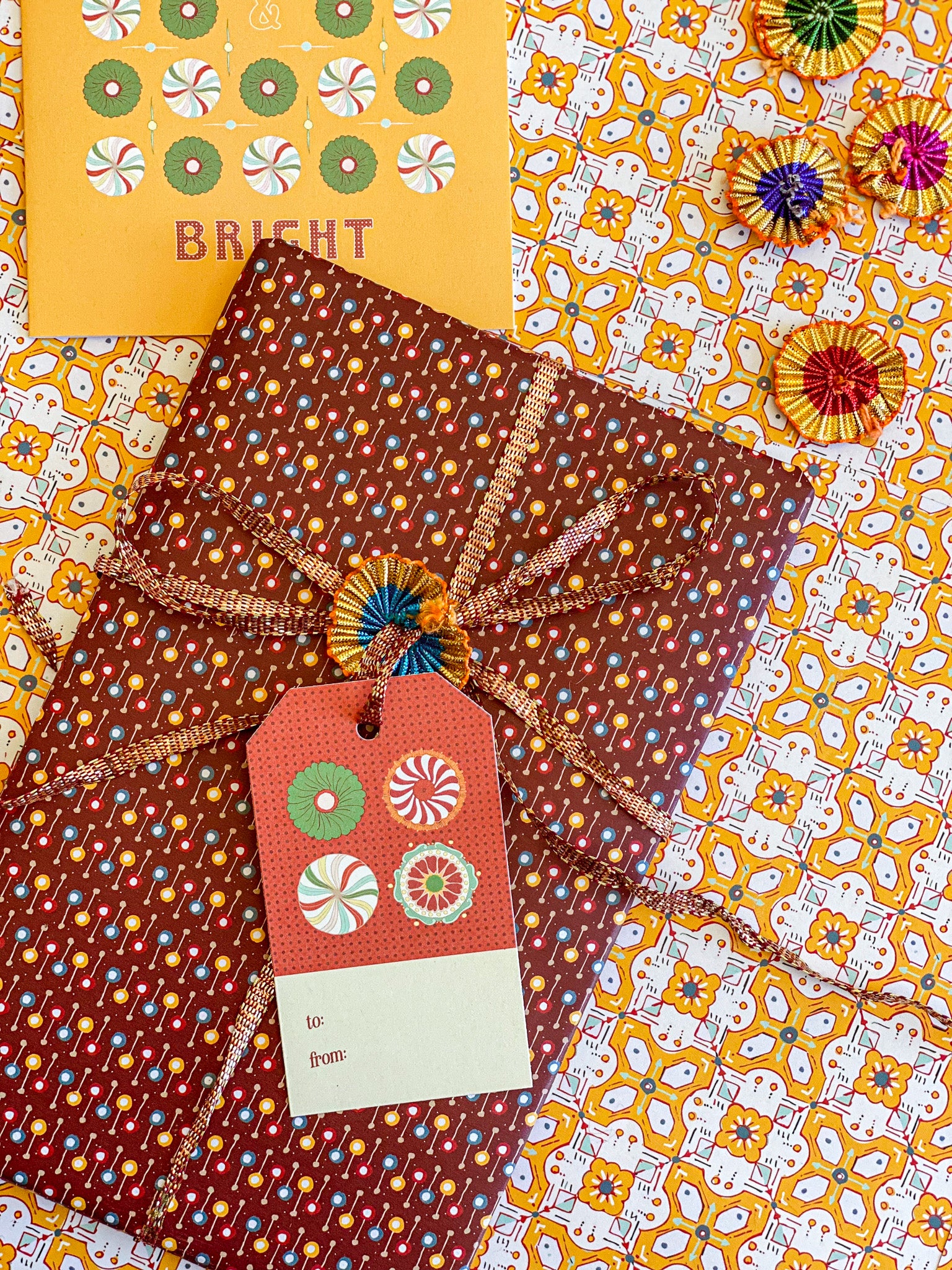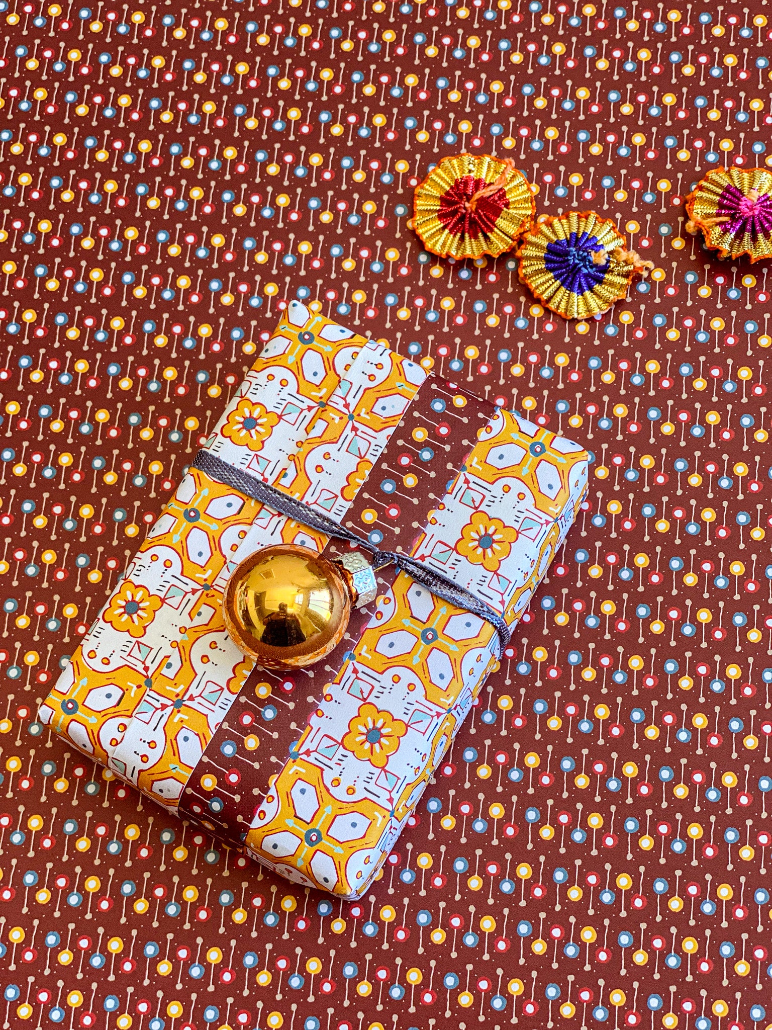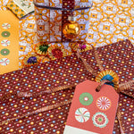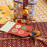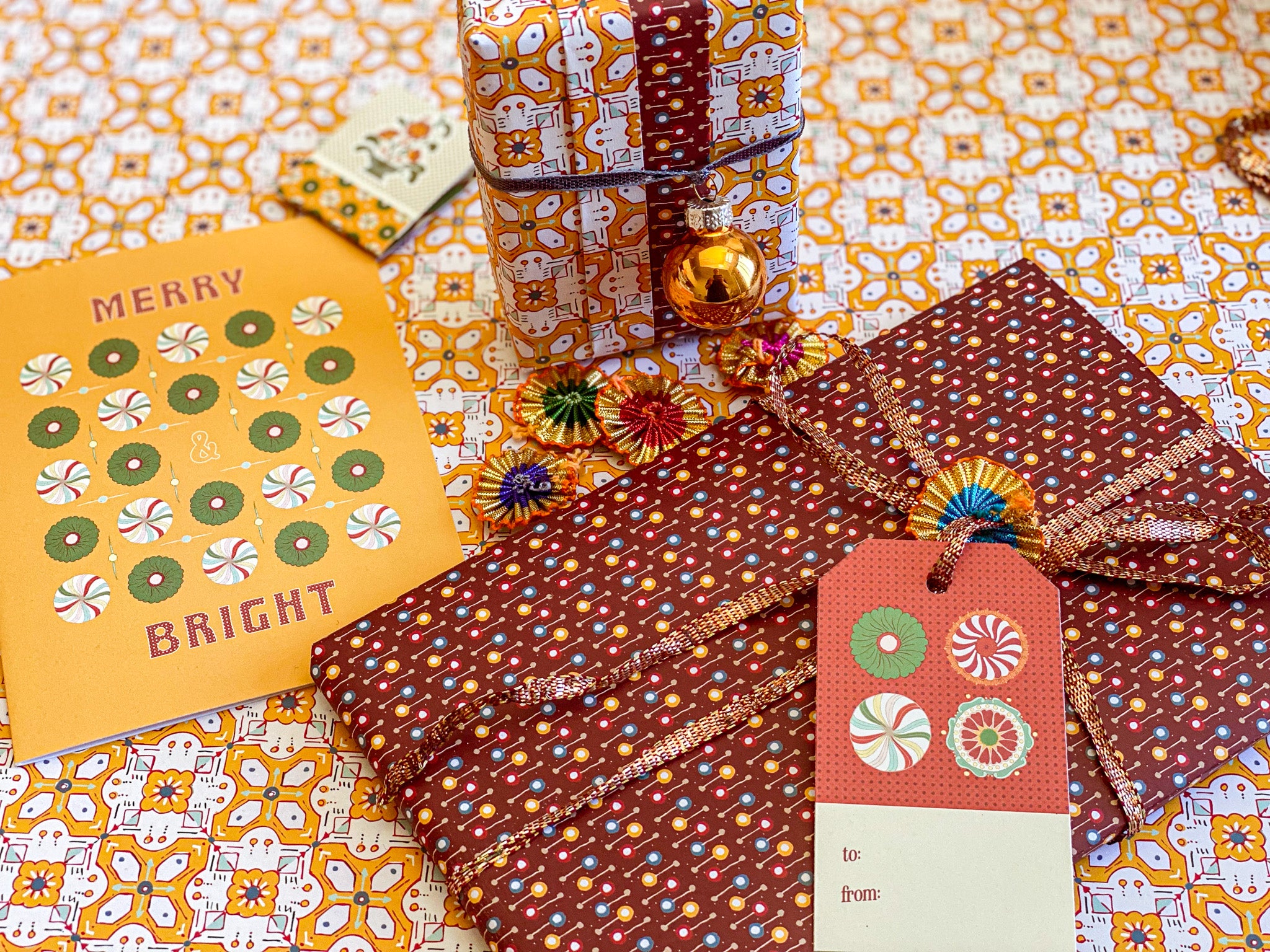 Bring a timeless festive fashion to your gifting with Festile, a double-sided holiday wrapping paper from our Carnivaliday capsule collection. One side features a cheerful Italian inspired tile pattern of warm yellows and creams with soft accents of blue, green and red. The reverse showcases a little bit of vintage whimsy with a vibrant dot pattern in rich holiday colors on a deep red backdrop. With its structured designs and nostalgic charm, Festile offers two coordinated looks in one versatile wrap — perfect for Christmas presents, party favors, holiday displays or decorations with a touch of festive flair that will stand out from anything cliché this season.