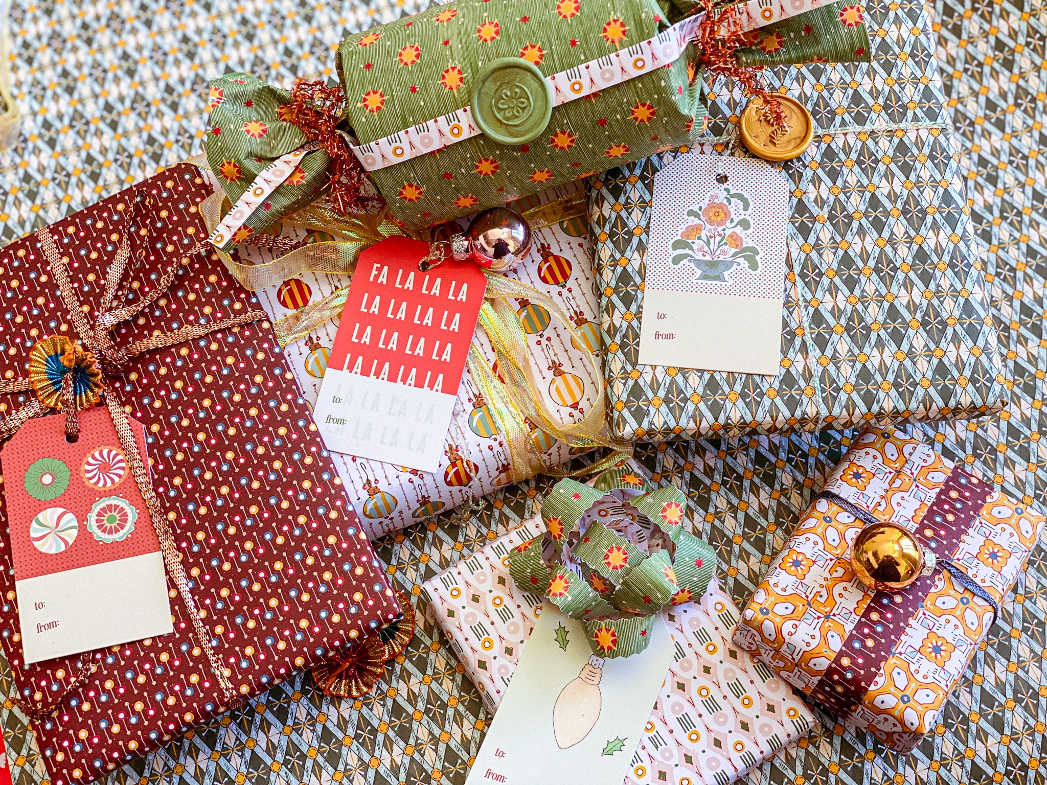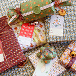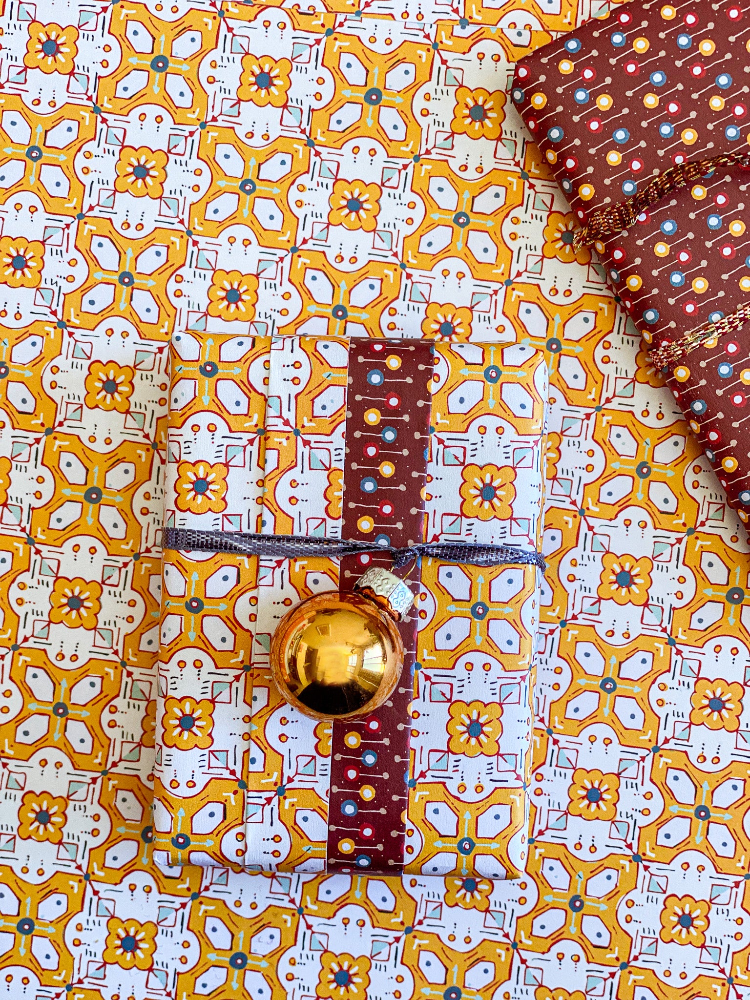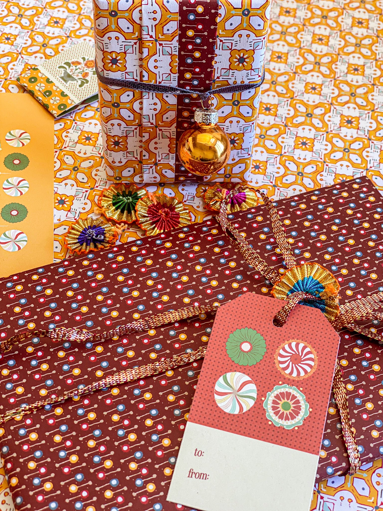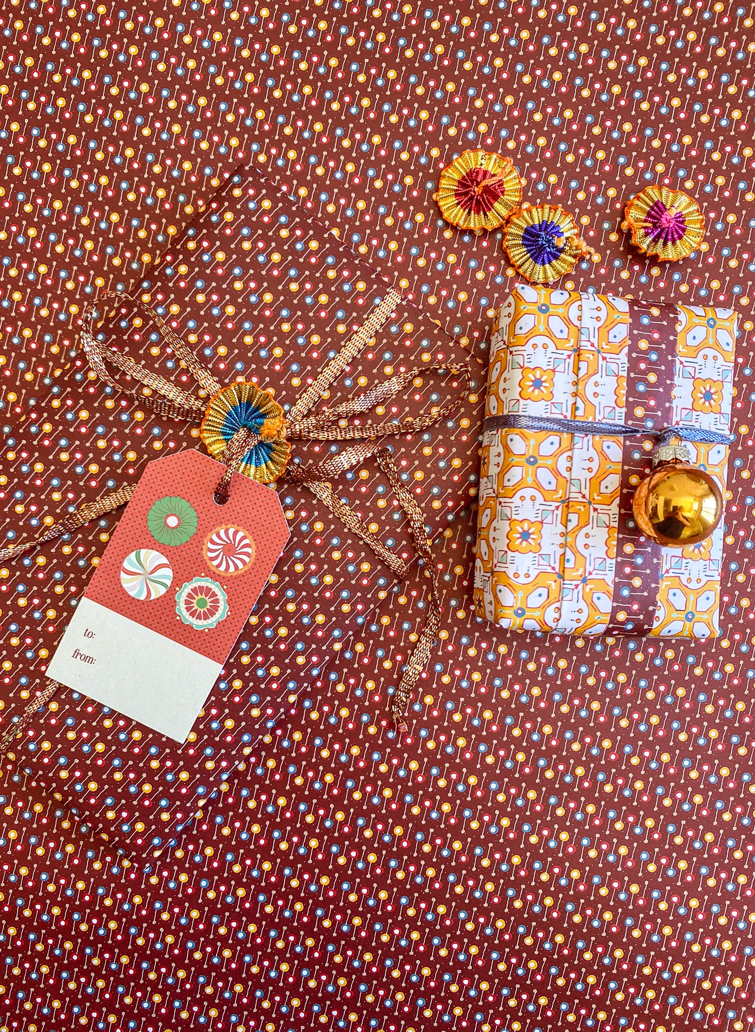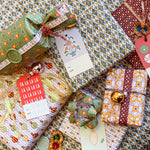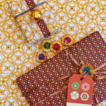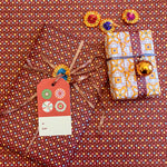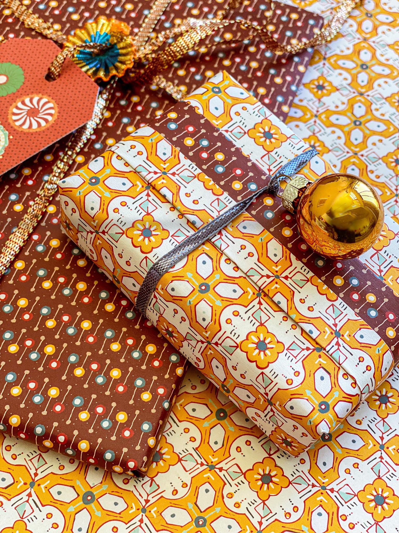 Bring a timeless festive fashion to your gifting with Festile, a double-sided holiday wrapping paper from our Carnivaliday capsule collection. One side features a cheerful Italian inspired tile pattern of warm yellows and creams with soft accents of blue, green and red. The reverse showcases a little bit of vintage whimsy with a vibrant dot pattern in rich holiday colors on a deep red backdrop. With its structured designs and nostalgic charm, Festile offers two coordinated looks in one versatile wrap — perfect for Christmas presents, party favors, holiday displays or decorations with a touch of festive flair that will stand out from anything cliché this season.