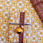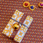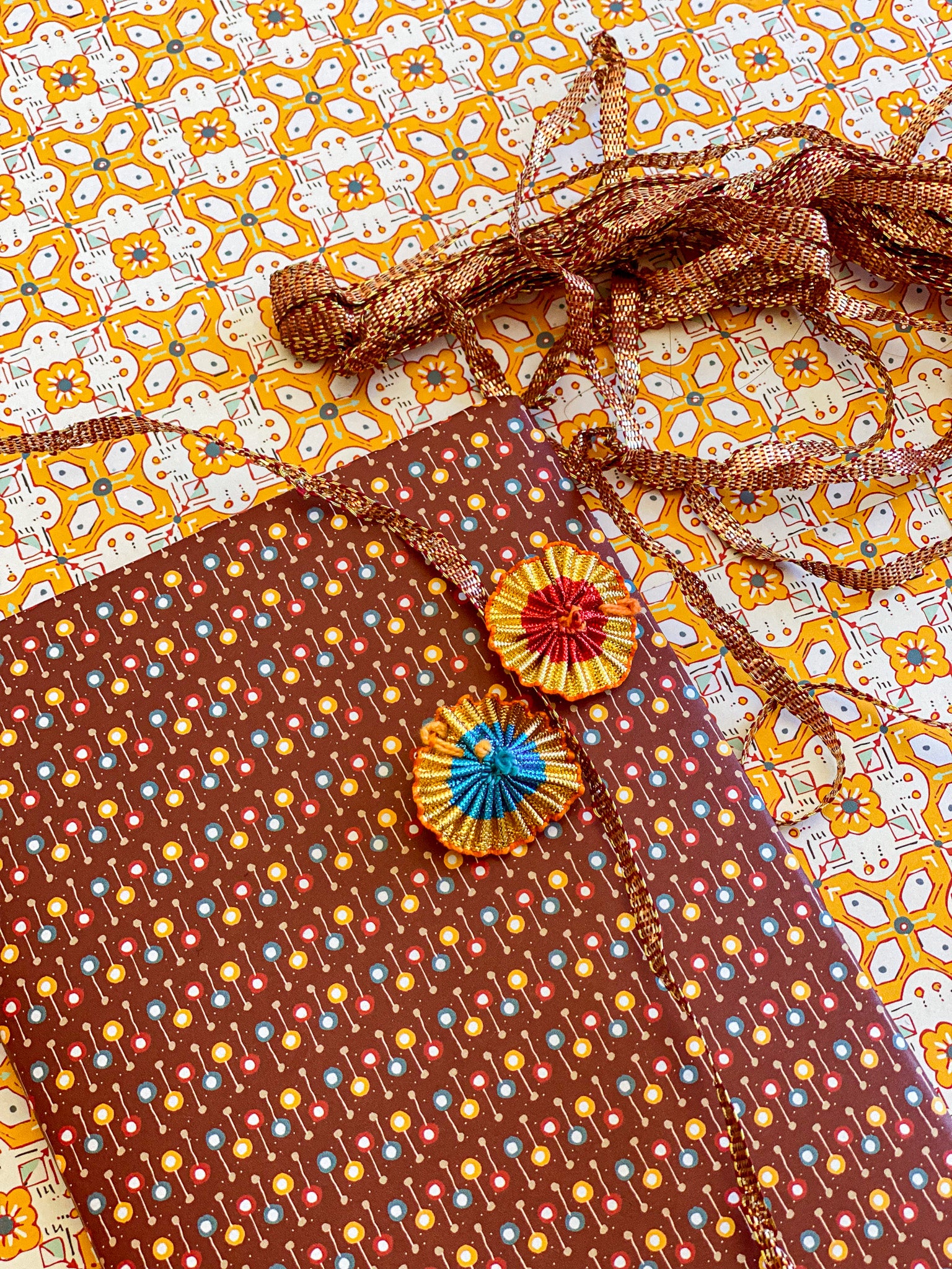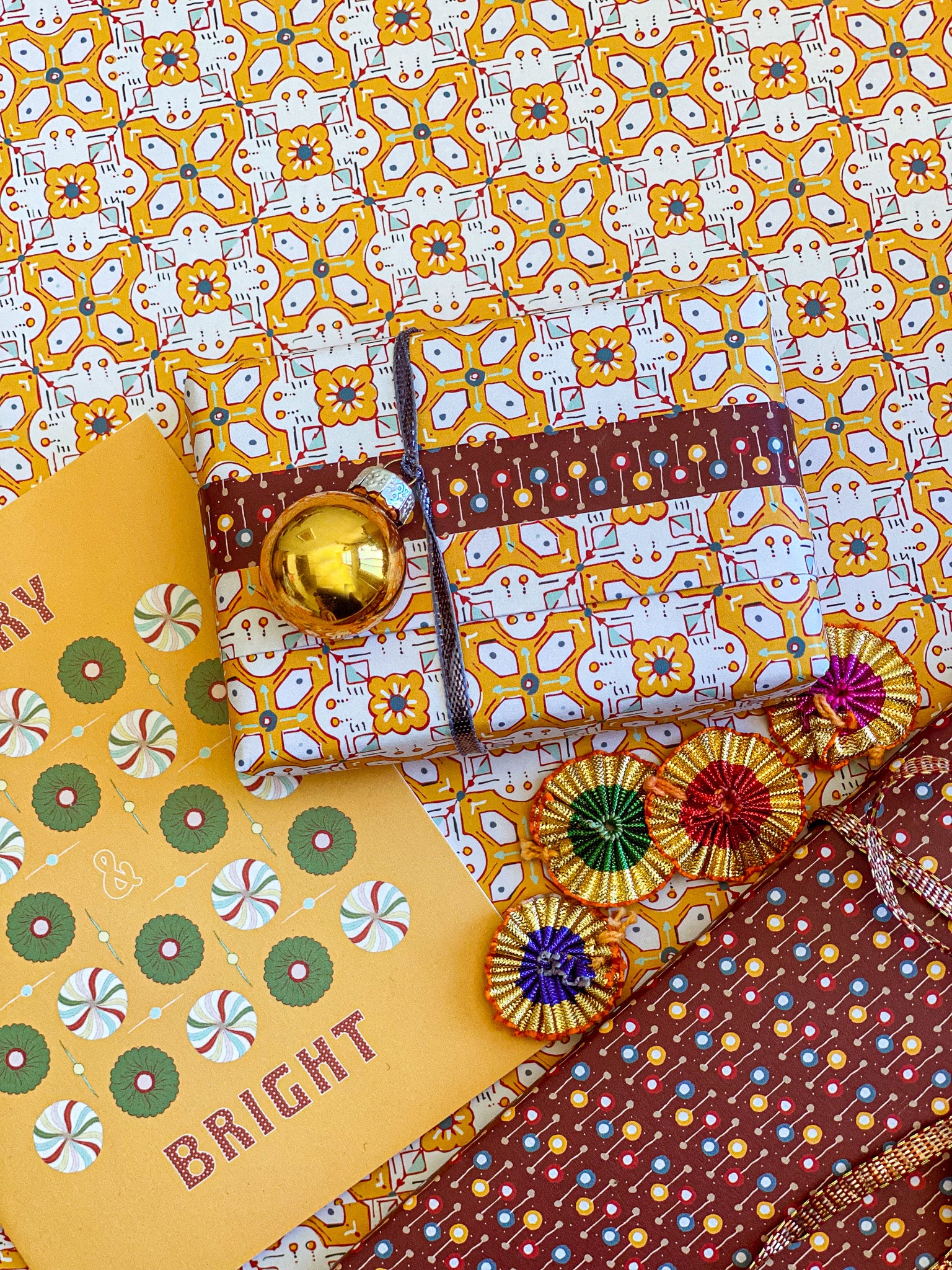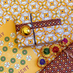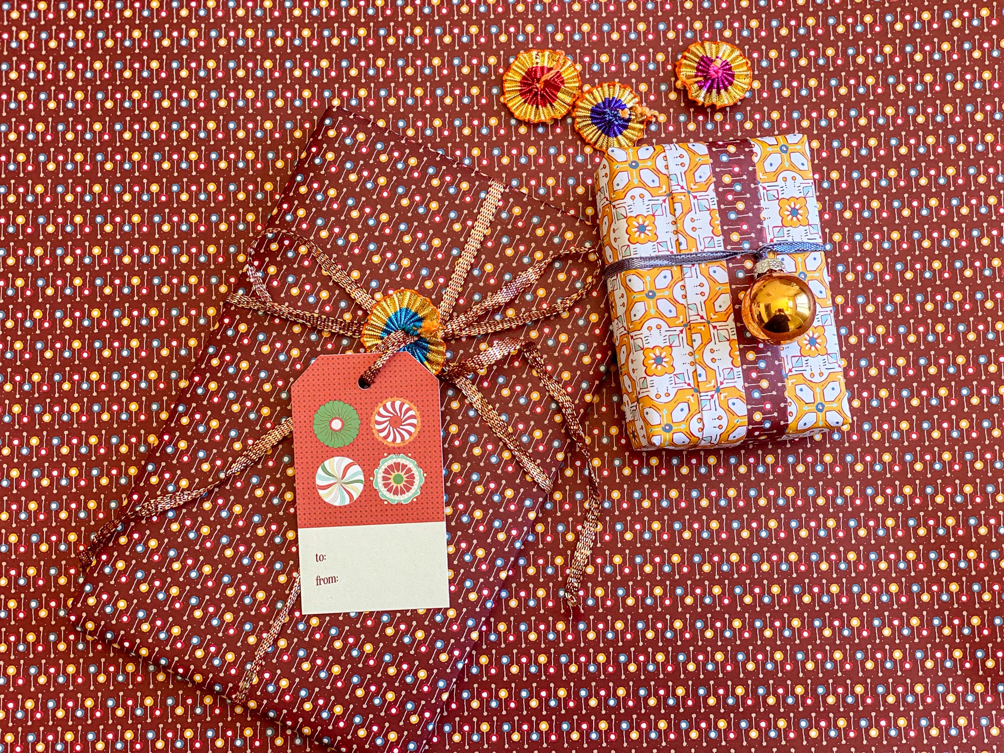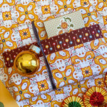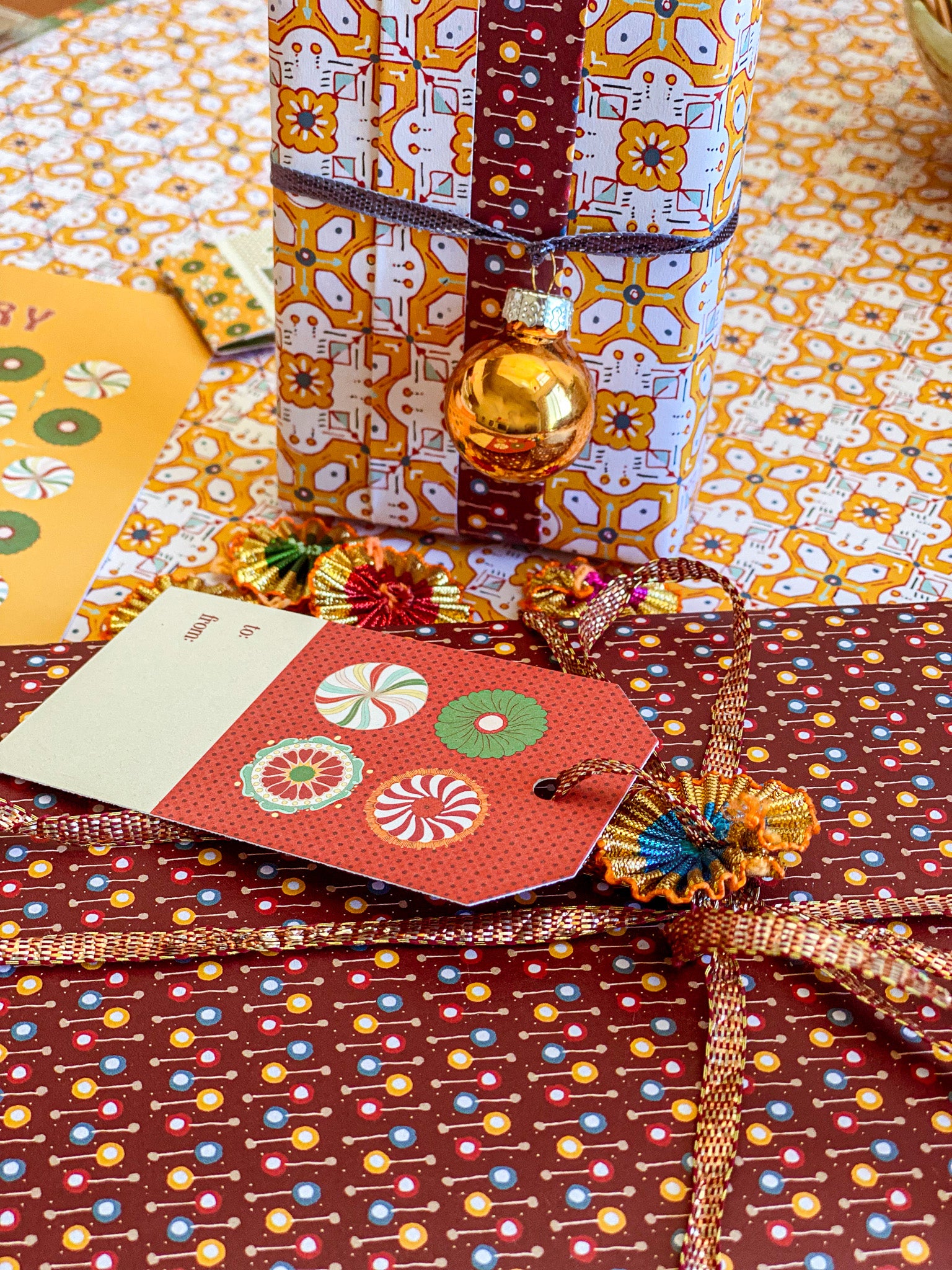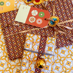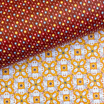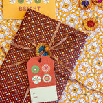 Bring a timeless festive fashion to your gifting with Festile, a double-sided holiday wrapping paper from our Carnivaliday capsule collection. One side features a cheerful Italian inspired tile pattern of warm yellows and creams with soft accents of blue, green and red. The reverse showcases a little bit of vintage whimsy with a vibrant dot pattern in rich holiday colors on a deep red backdrop. With its structured designs and nostalgic charm, Festile offers two coordinated looks in one versatile wrap — perfect for Christmas presents, party favors, holiday displays or decorations with a touch of festive flair that will stand out from anything cliché this season.