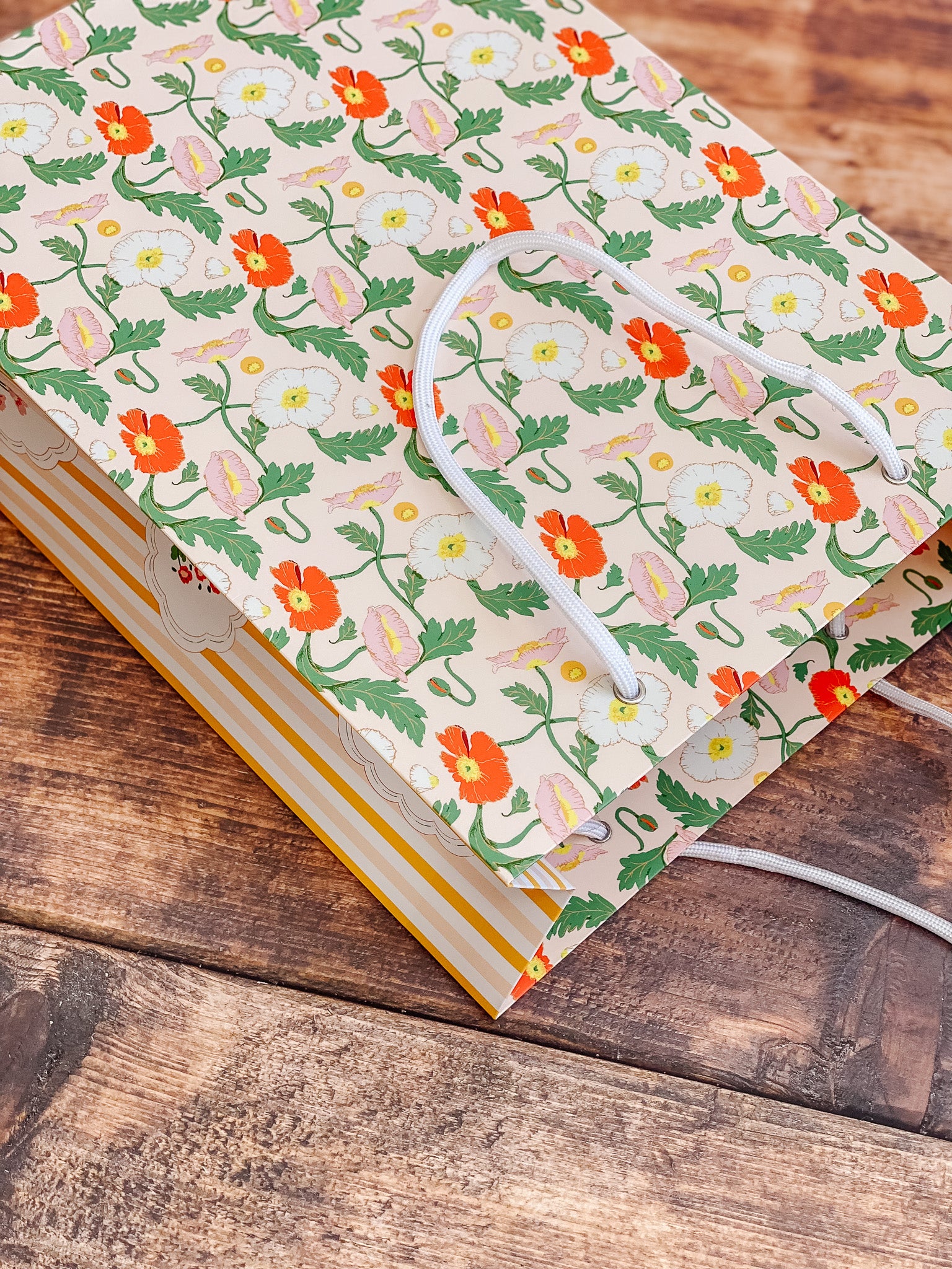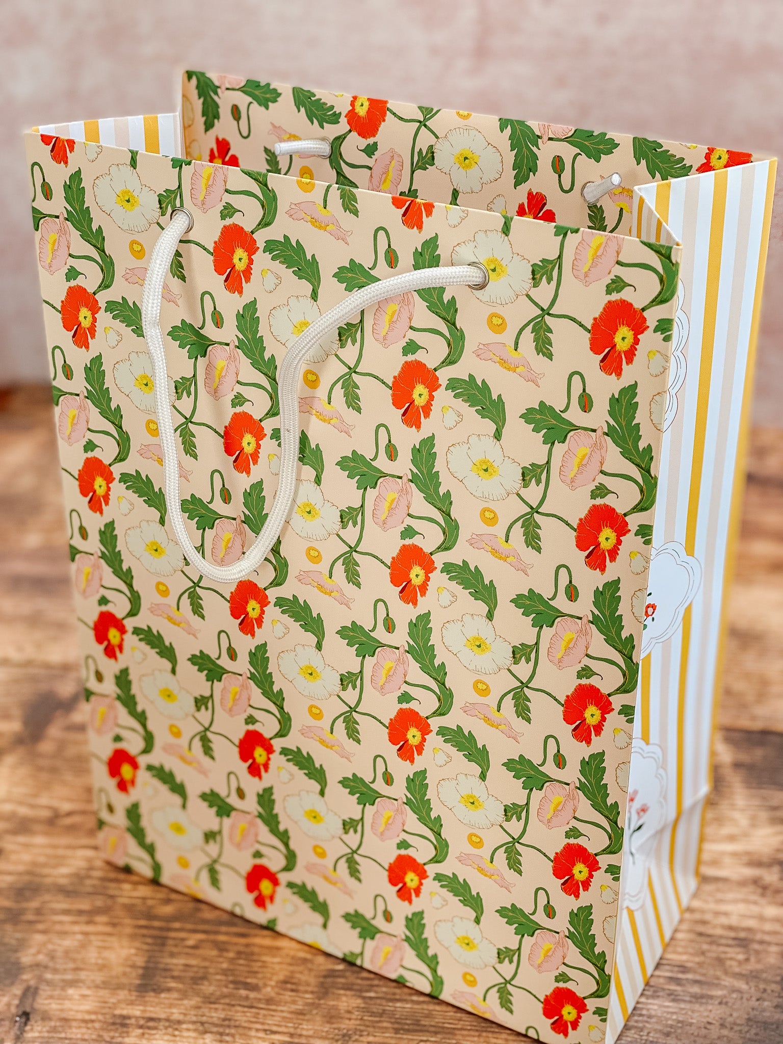 Floreale features a pair of vibrant Italian-inspired Spring floral patterns. On the front and back a flutter of soft pink, cream and vibrant red-orange "champagne bubbles" poppies dance across a pale peach background. The gussets are lined with a classic awning style yellow and pink stripe with scalloped floral motifs reminiscent of vintage packaging labels on the other. White rope handles complete the look with a clean, classic finish.