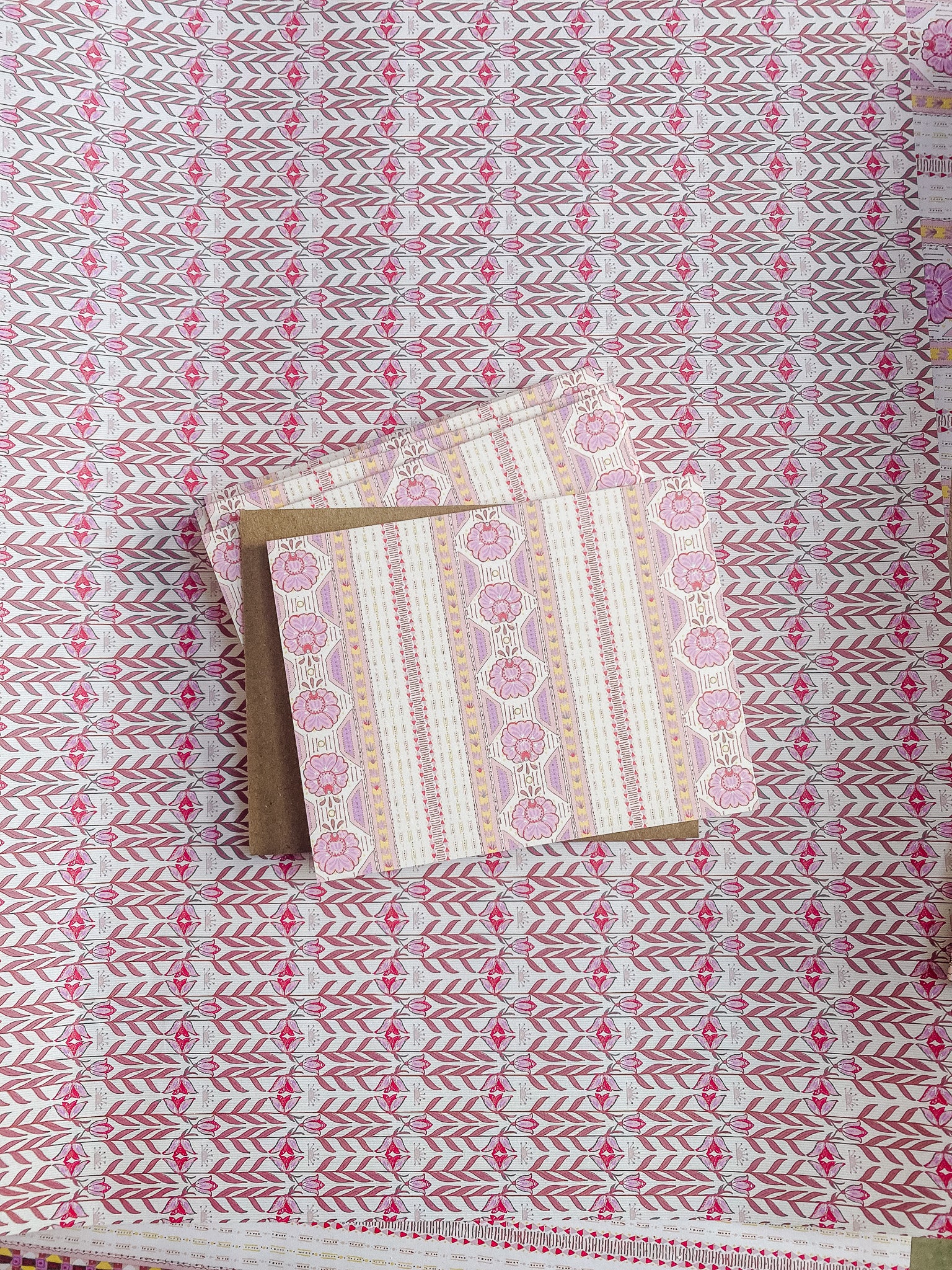 Le Folk draws inspiration from vintage folk textiles and the warm, lived-in beauty of Parisian cafés—where patterned wallpapers, tiled floors, and florals quietly tell their own stories. With its rhythmic stripes and delicate floral motifs, this card feels both nostalgic and fresh, perfect for springtime sentiments and thoughtful everyday notes.