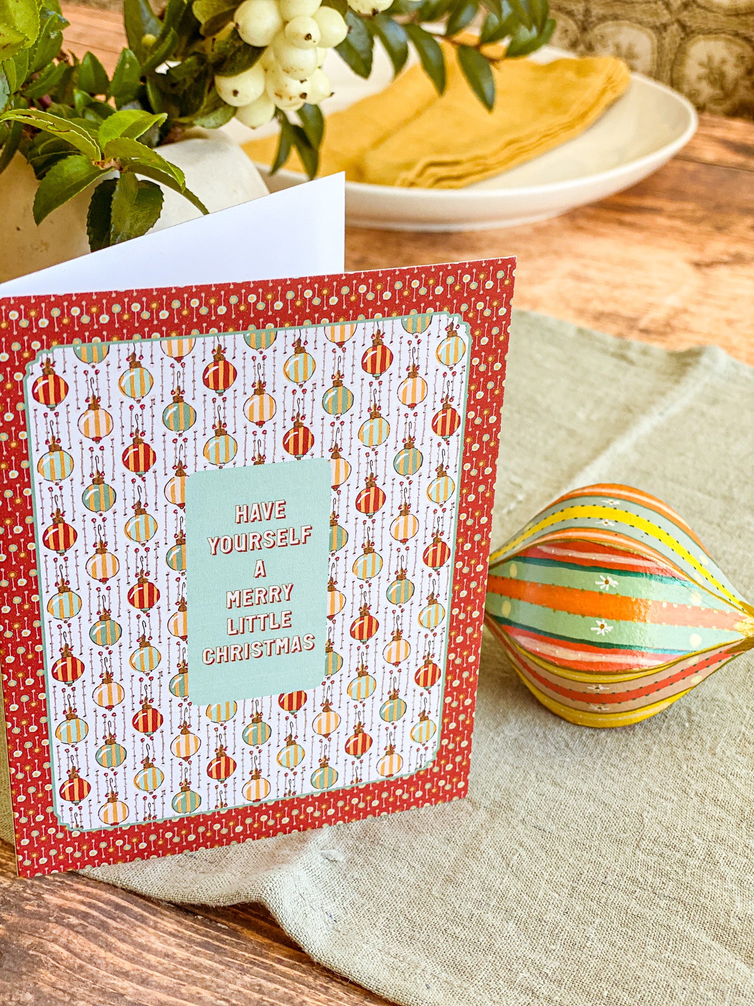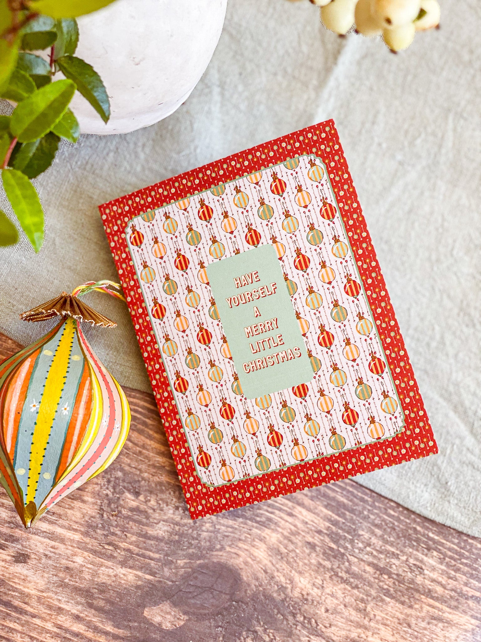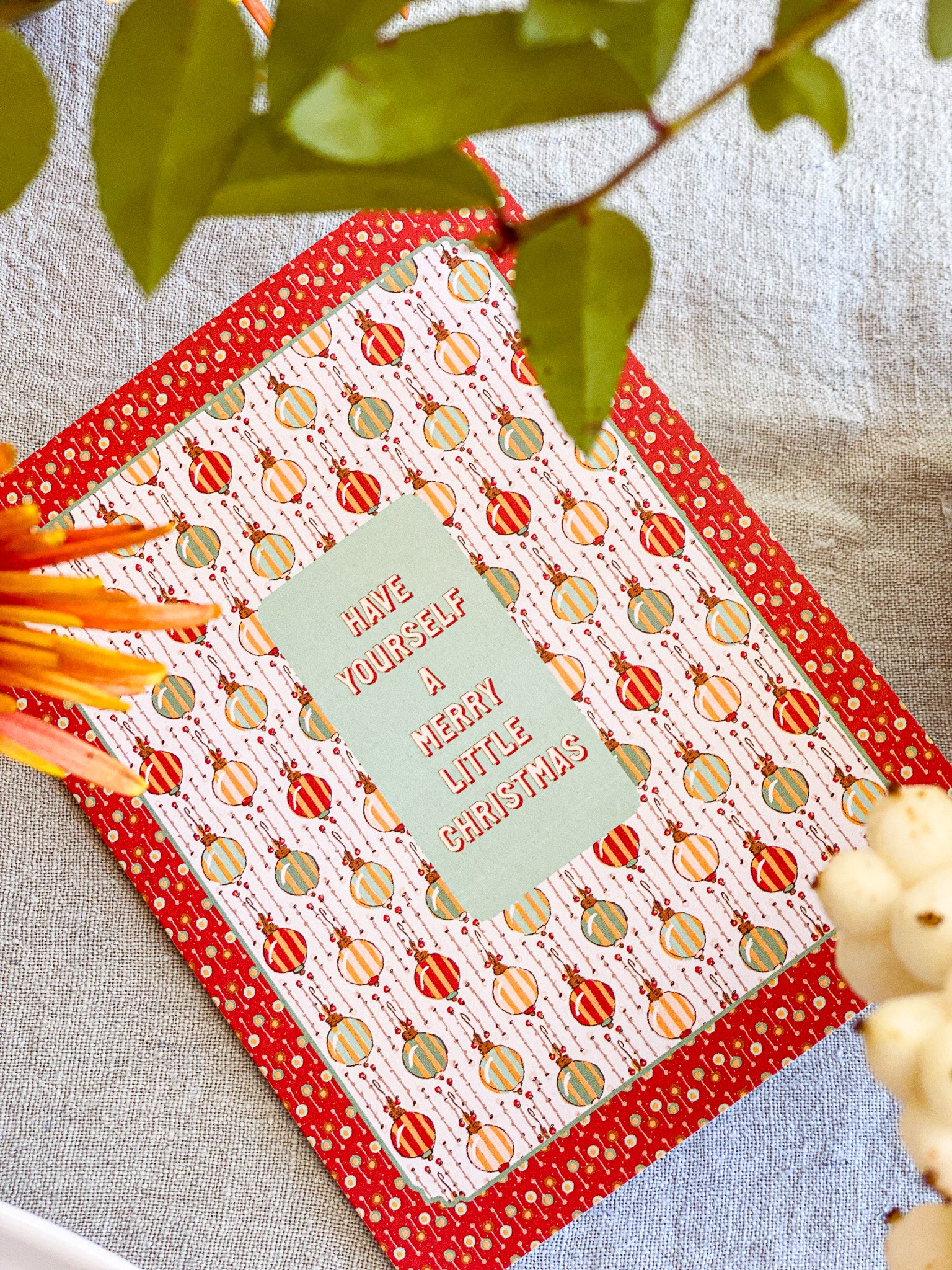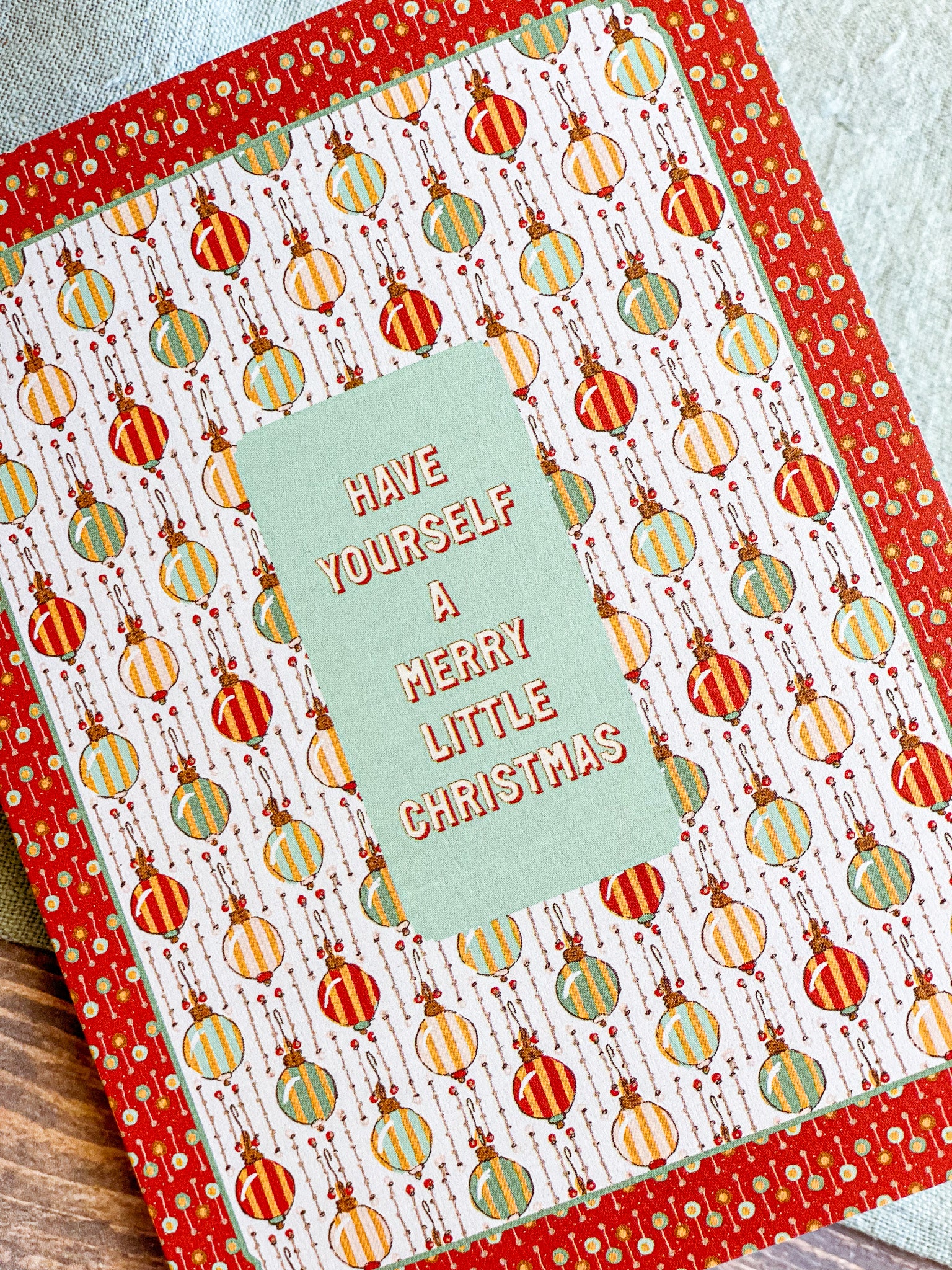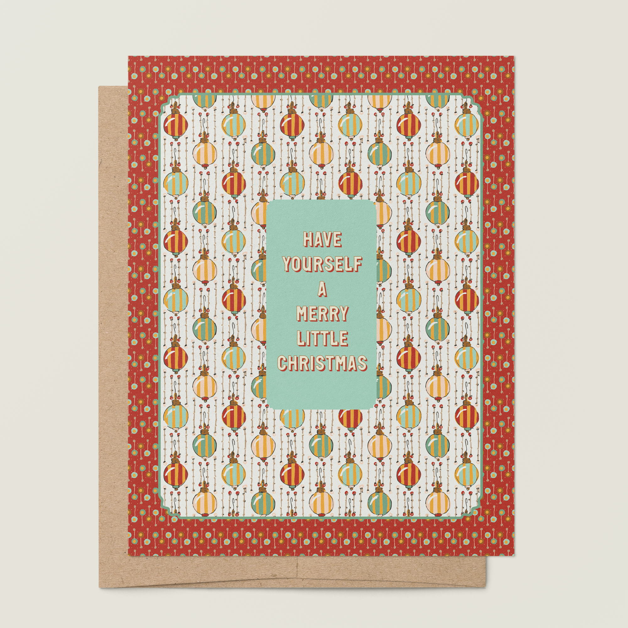 Make the holidays a bit more merry with this vintage inspired hand illustrated Christmas card from our Holiday collection. A festive geometric multicolor striped ornament pattern in a rich red dot frame comes together with a heartfelt "Have Yourself a Merry Little Christmas" message in the center. Pair this holiday greeting card with our coordinating gift wrap for a beautifully cohesive holiday gift that brings a touch of nostalgic wonder.