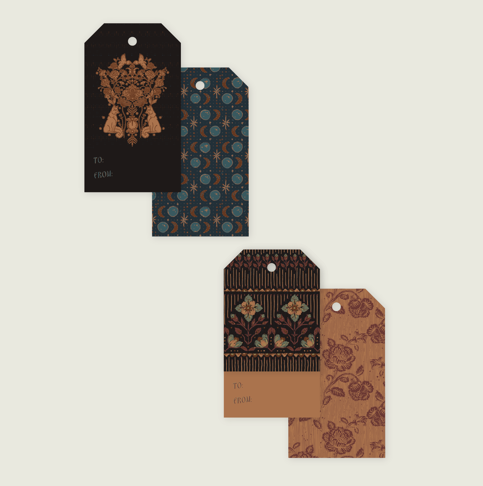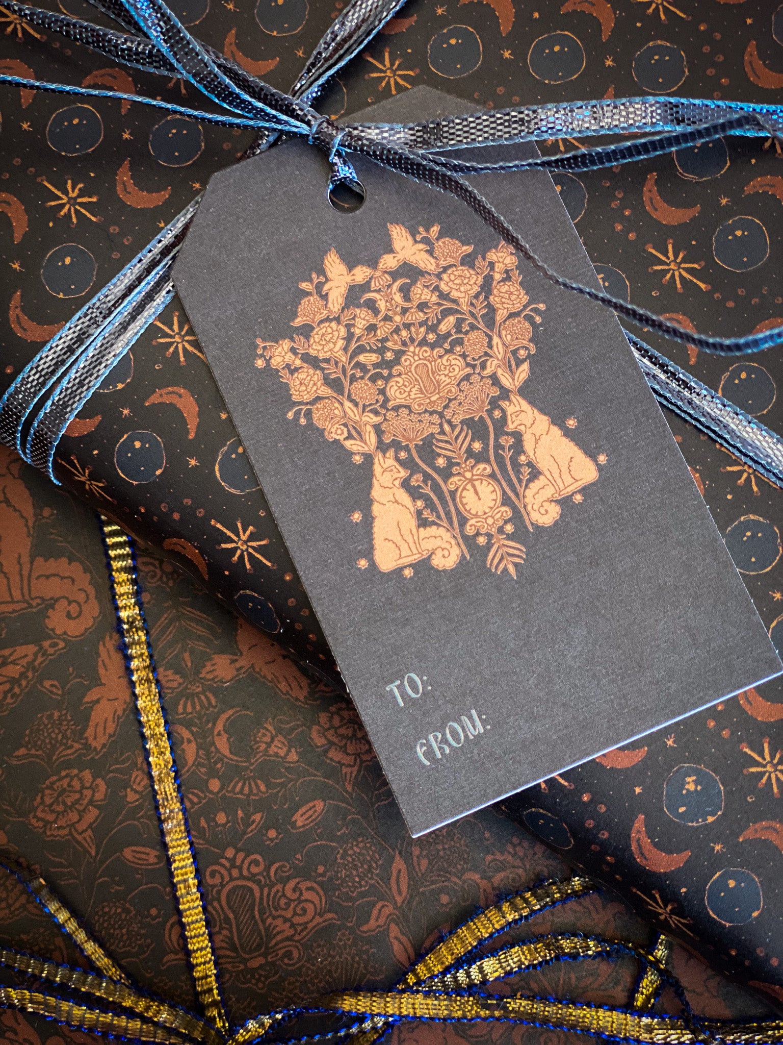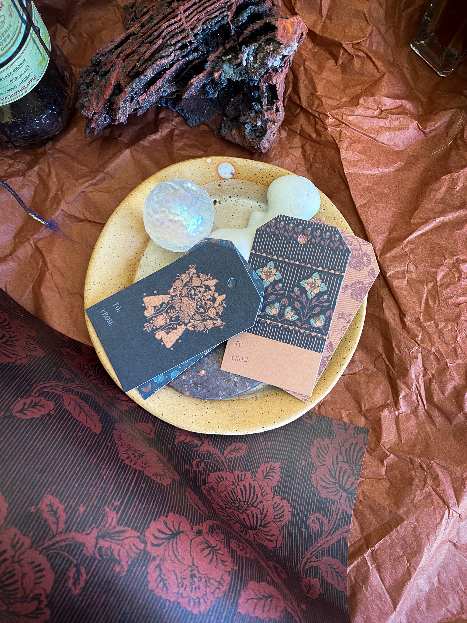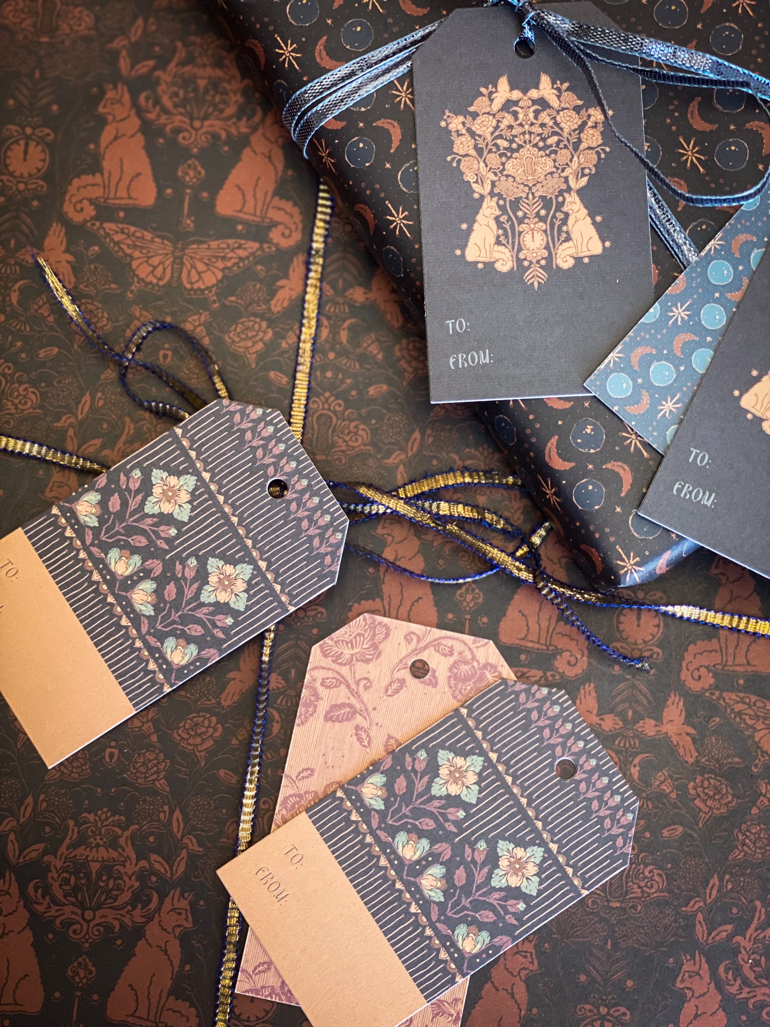 The Midnight Garden Gift Tag Set layers multiple worlds in one. A mystical mirrored garden where foxes roam, moths flutter, ravens soar, and vines curl around hidden clocks, antique keys, and secret locks adorns the front of one tag. Flip it over, and the night sky takes center stage with moons and stars. The other, a darkly romantic take on classic florals, fuses baroque elegance with a deep crimson, etching-inspired rose motif; and a folkloric stripe of hellebores, wild roses, and creeping vines. With its touch of moonlit glamour, it’s perfect for gifts wrapped with intrigue, romance, and a little bit of mischief.