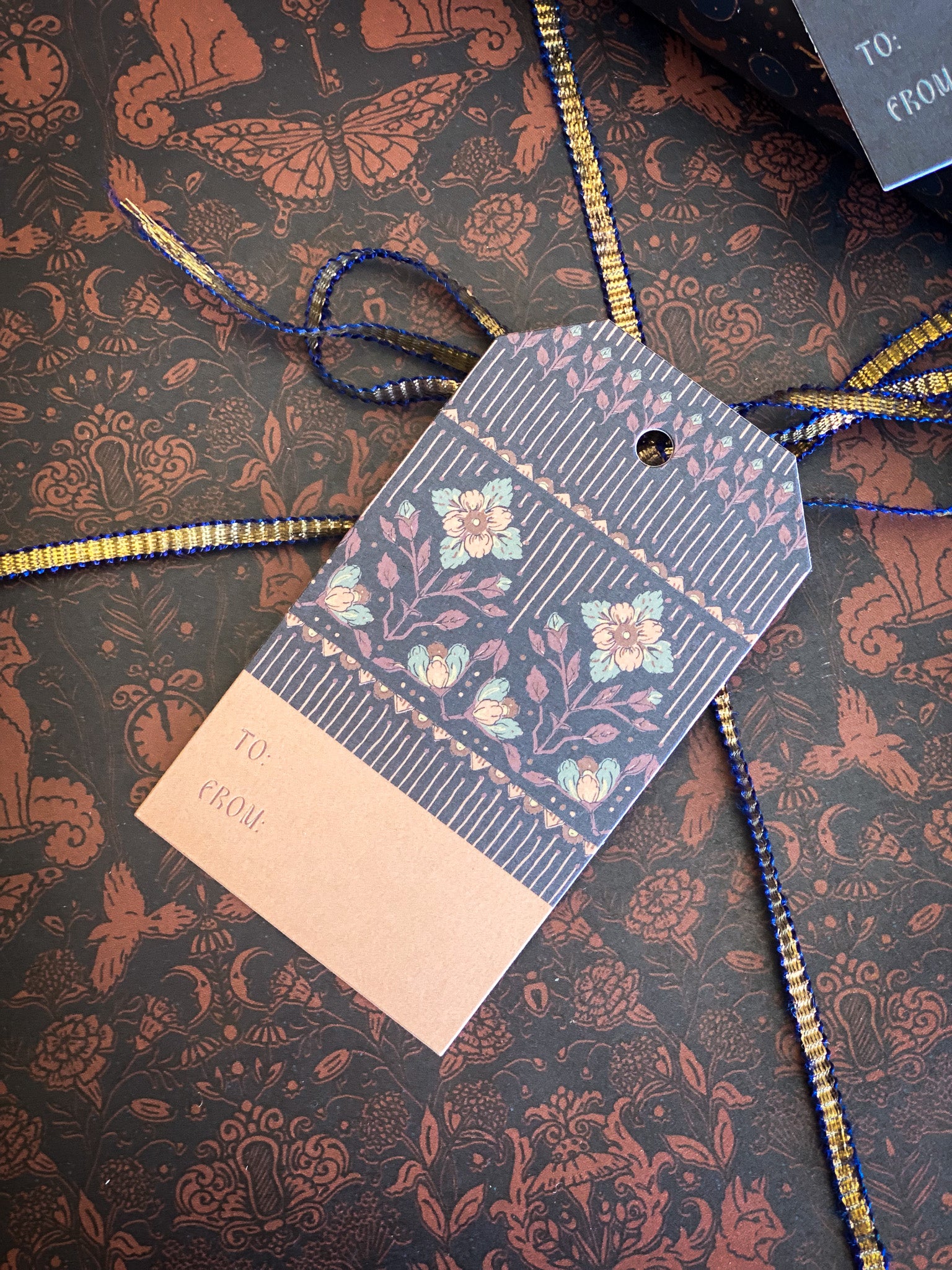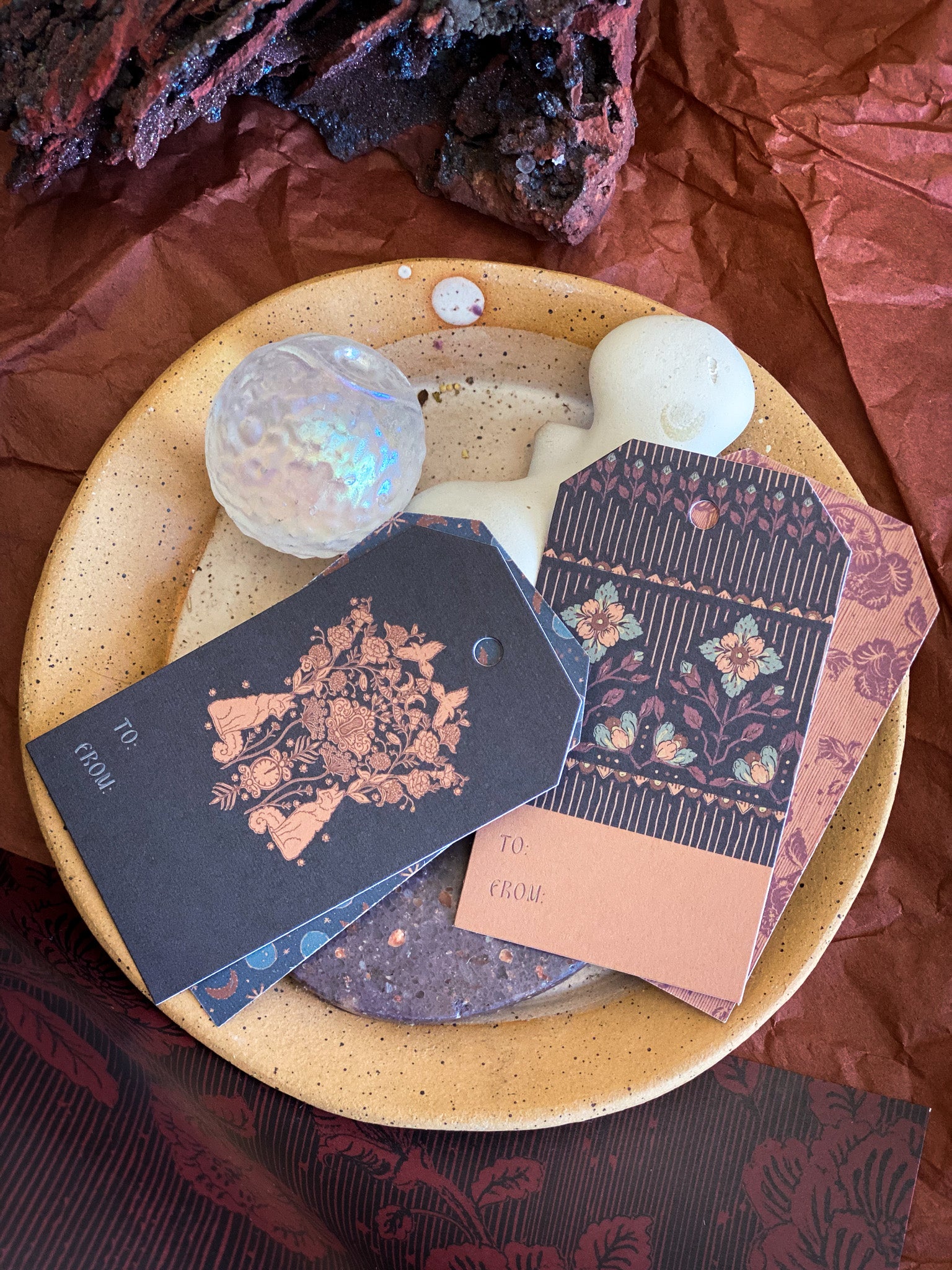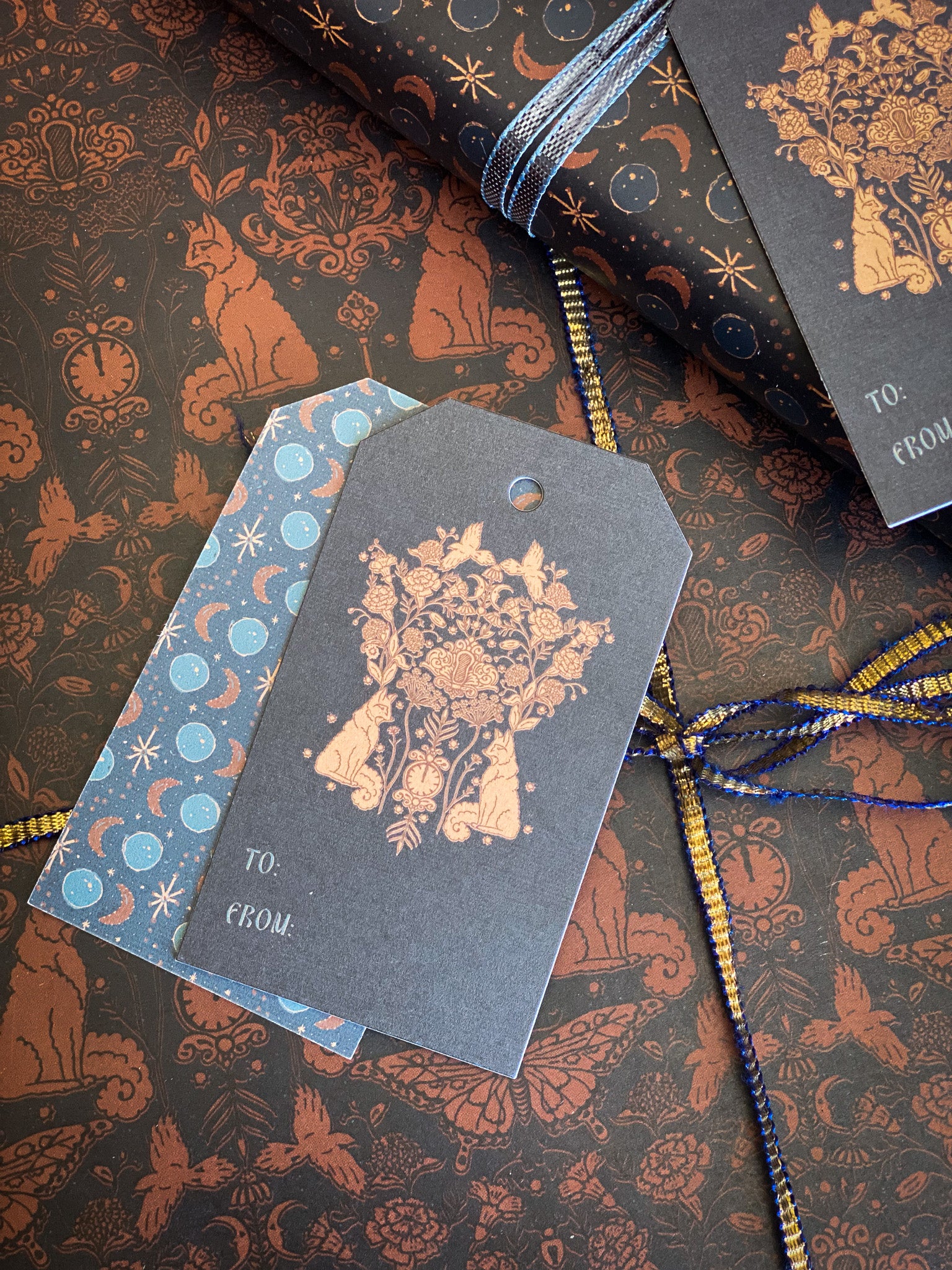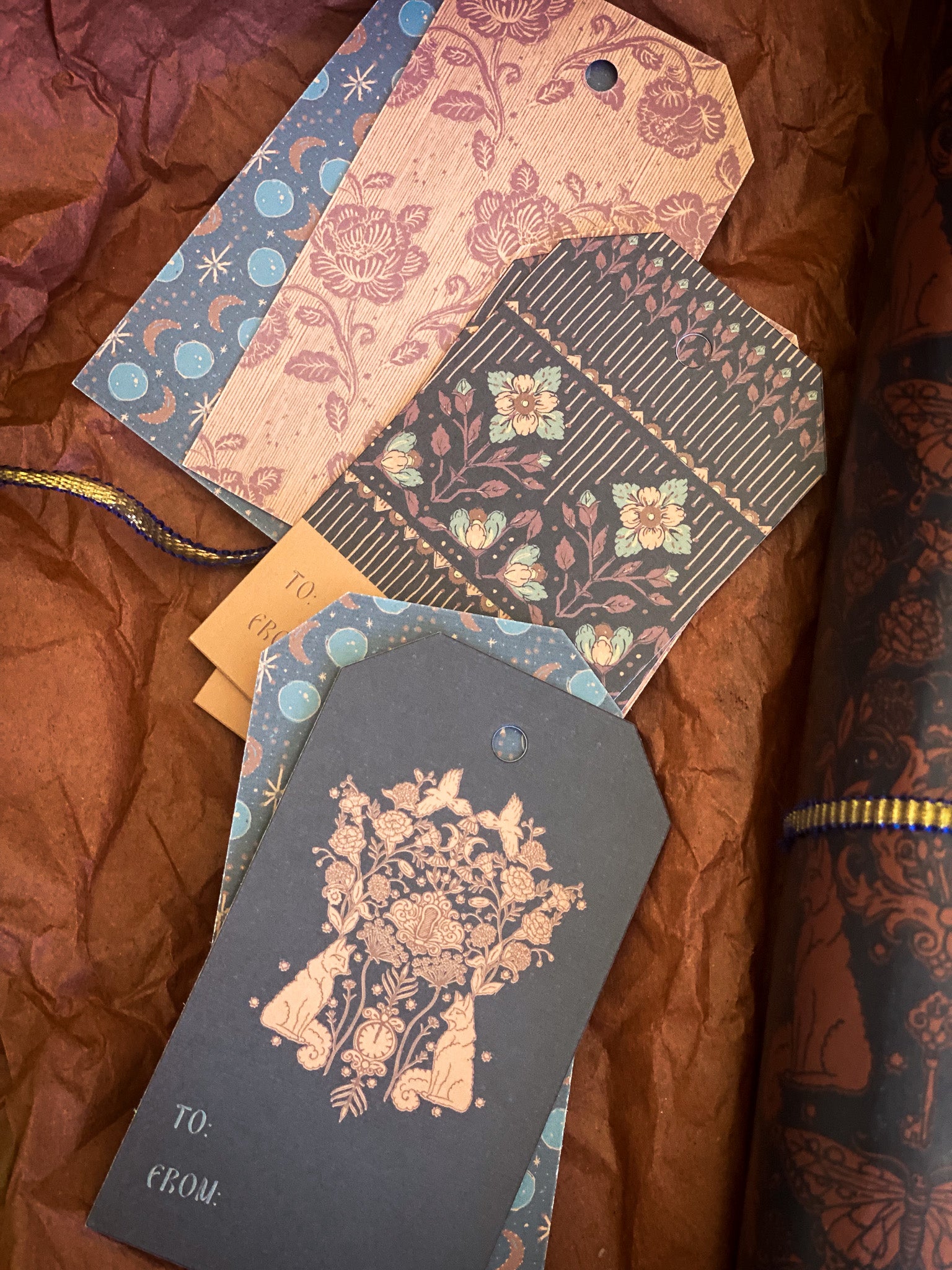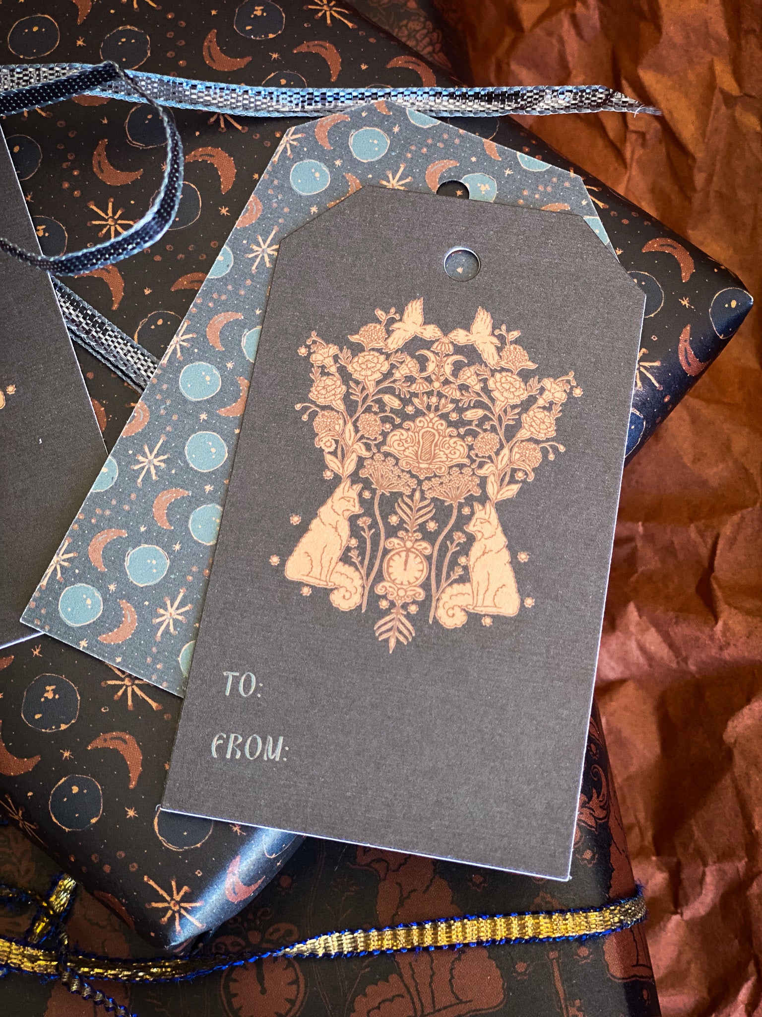 The Midnight Garden Gift Tag Set layers multiple worlds in one. A mystical mirrored garden where foxes roam, moths flutter, ravens soar, and vines curl around hidden clocks, antique keys, and secret locks adorns the front of one tag. Flip it over, and the night sky takes center stage with moons and stars. The other, a darkly romantic take on classic florals, fuses baroque elegance with a deep crimson, etching-inspired rose motif; and a folkloric stripe of hellebores, wild roses, and creeping vines. With its touch of moonlit glamour, it’s perfect for gifts wrapped with intrigue, romance, and a little bit of mischief.