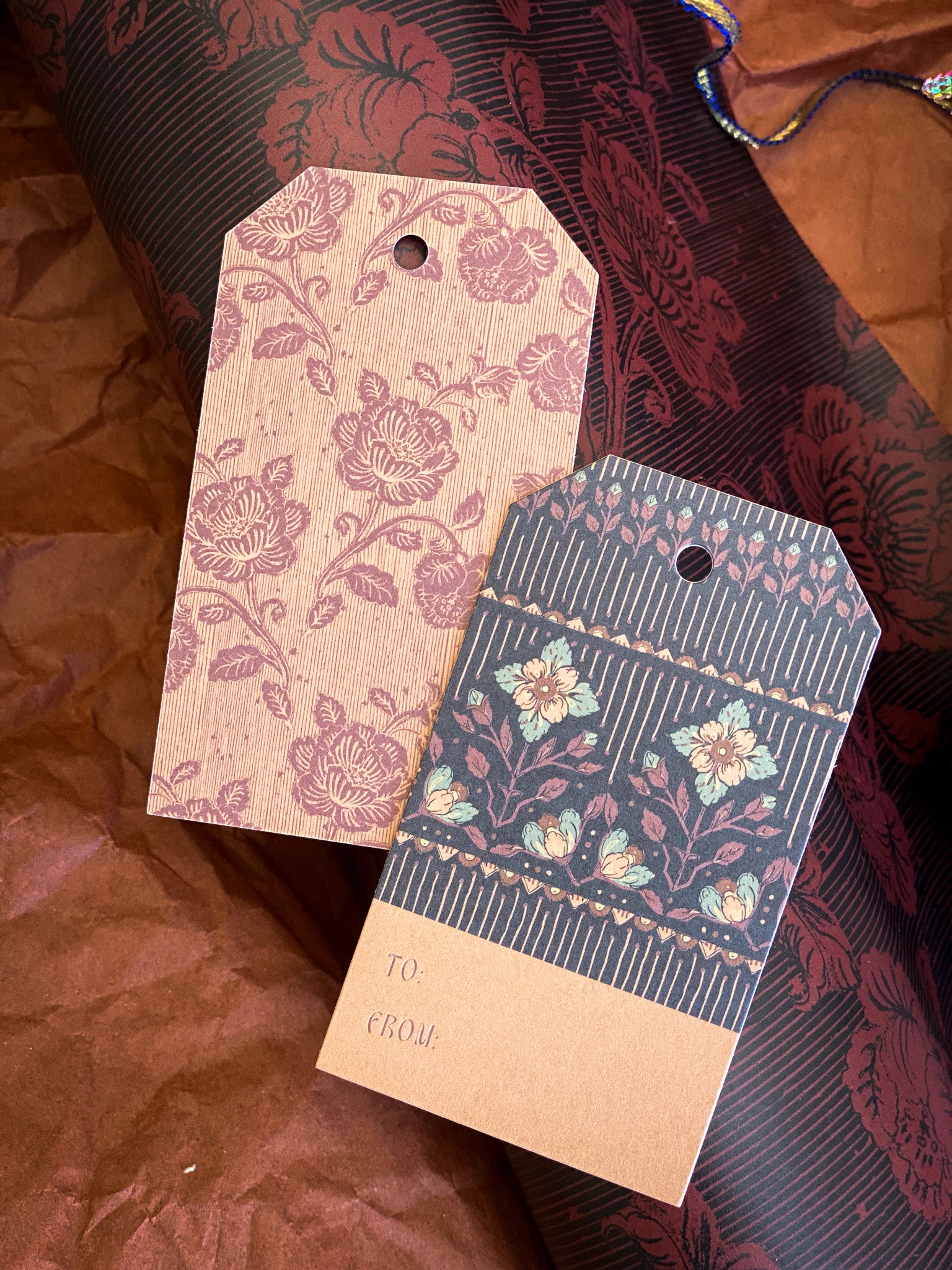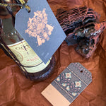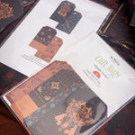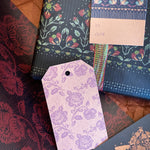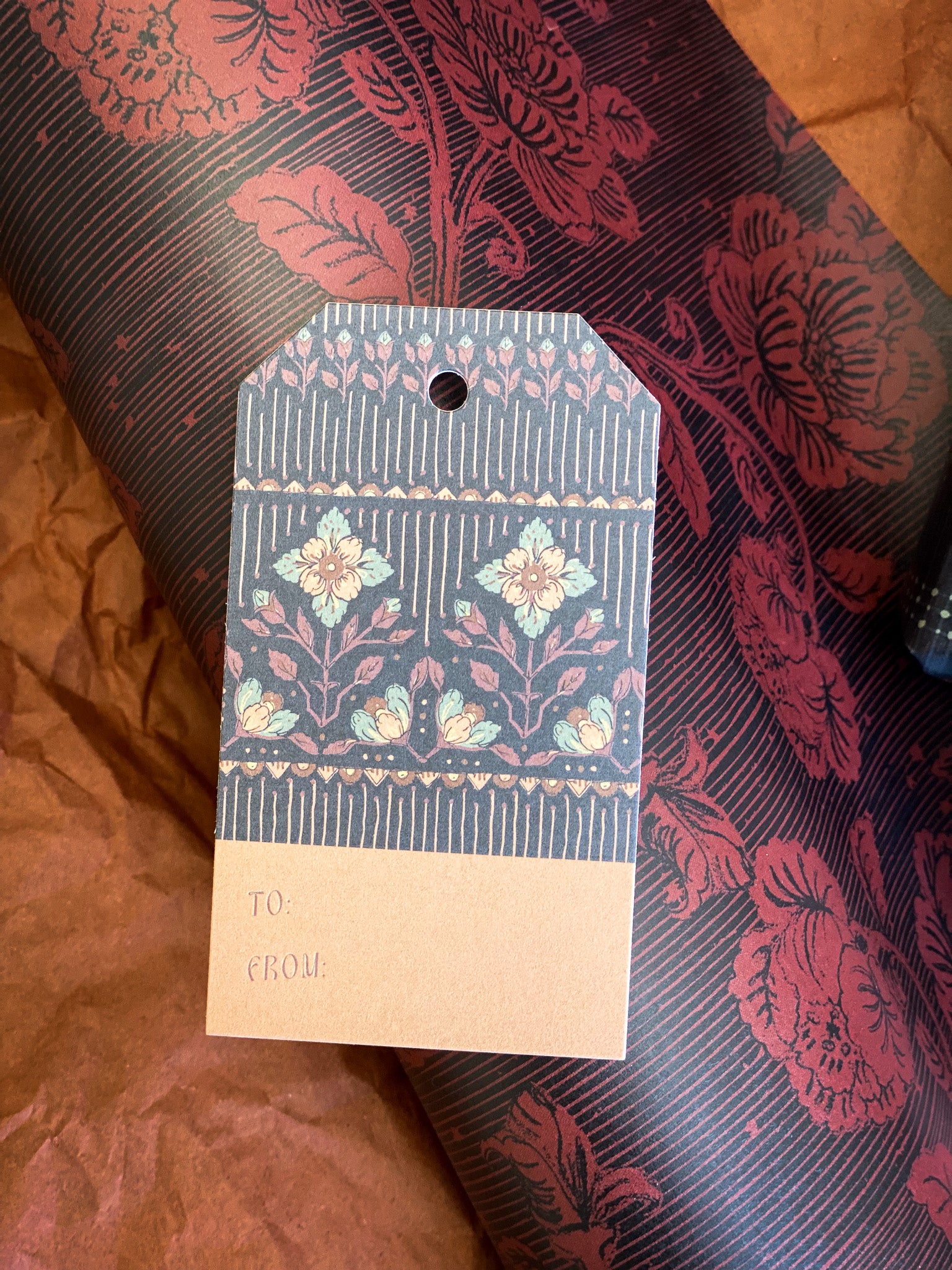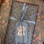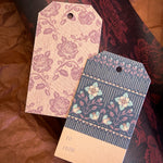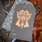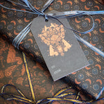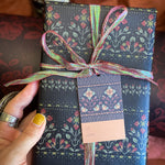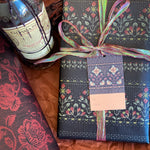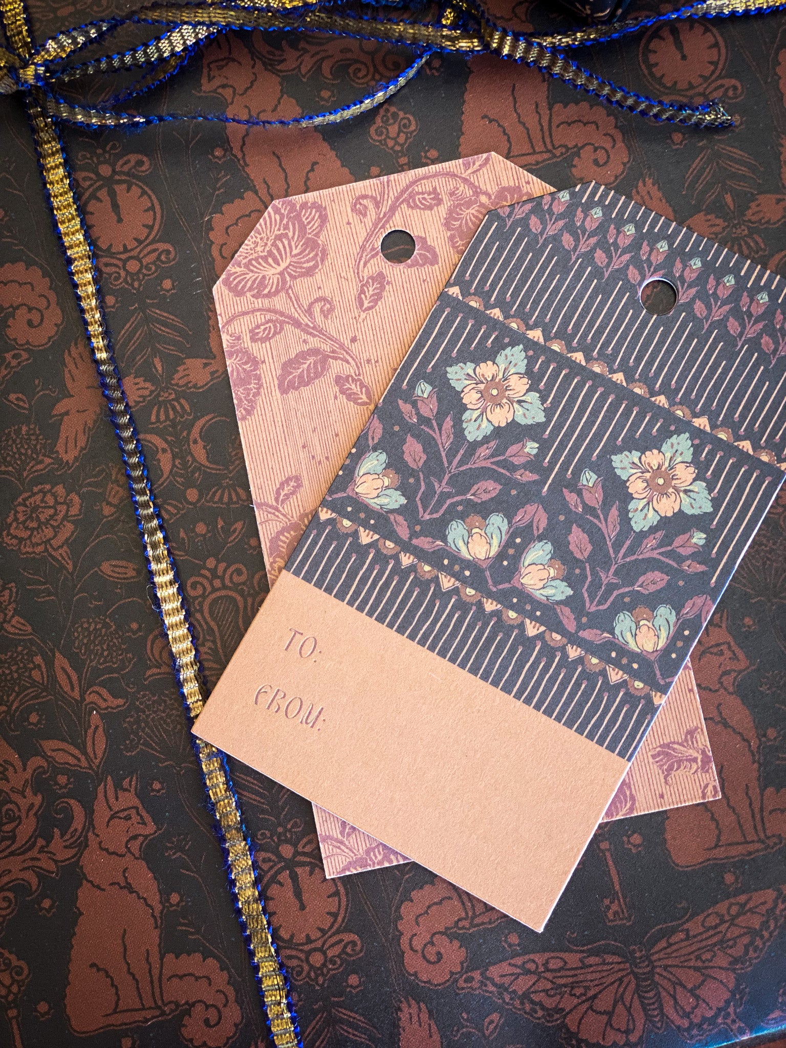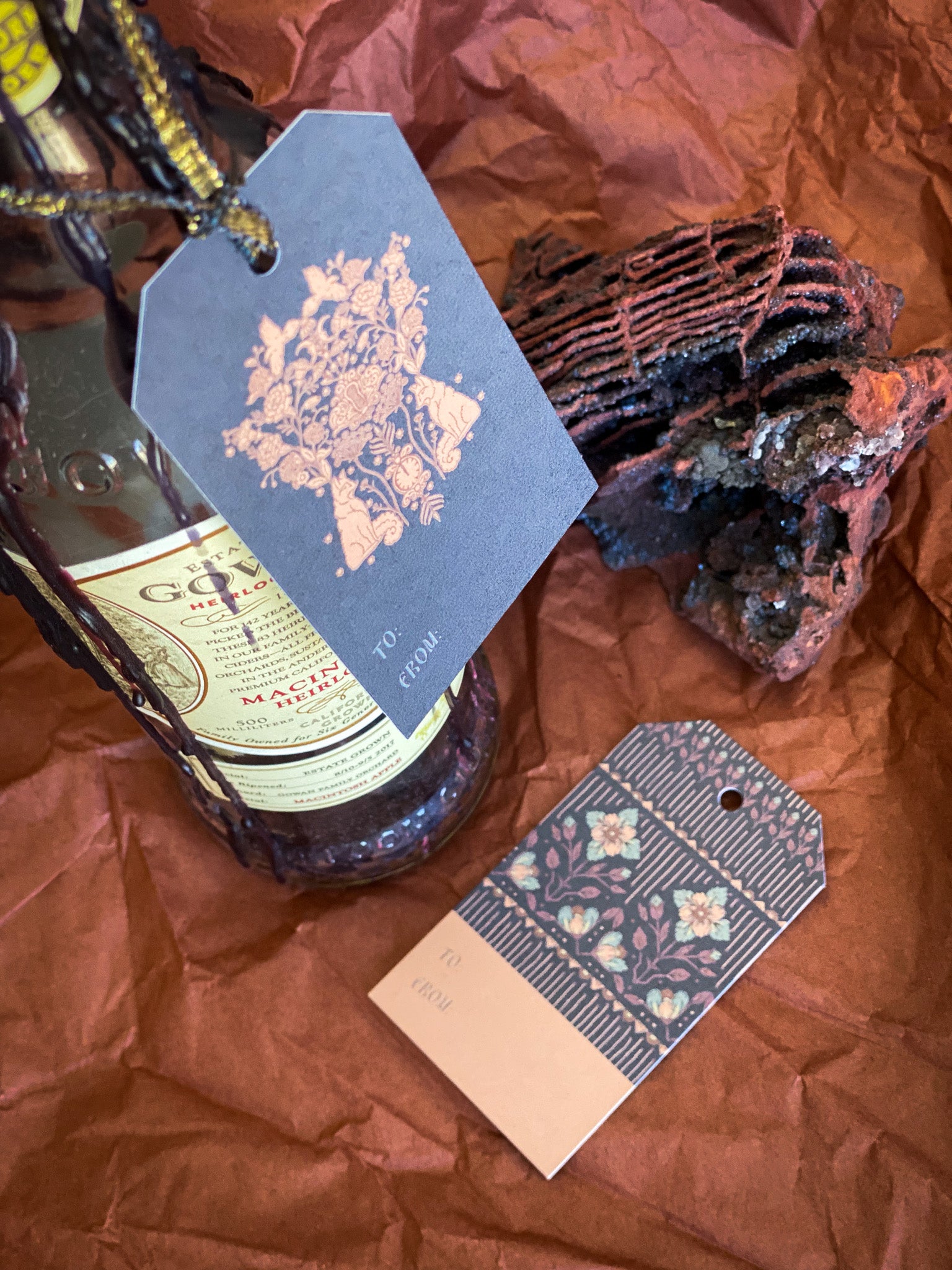 The Midnight Garden Gift Tag Set layers multiple worlds in one. A mystical mirrored garden where foxes roam, moths flutter, ravens soar, and vines curl around hidden clocks, antique keys, and secret locks adorns the front of one tag. Flip it over, and the night sky takes center stage with moons and stars. The other, a darkly romantic take on classic florals, fuses baroque elegance with a deep crimson, etching-inspired rose motif; and a folkloric stripe of hellebores, wild roses, and creeping vines. With its touch of moonlit glamour, it’s perfect for gifts wrapped with intrigue, romance, and a little bit of mischief.