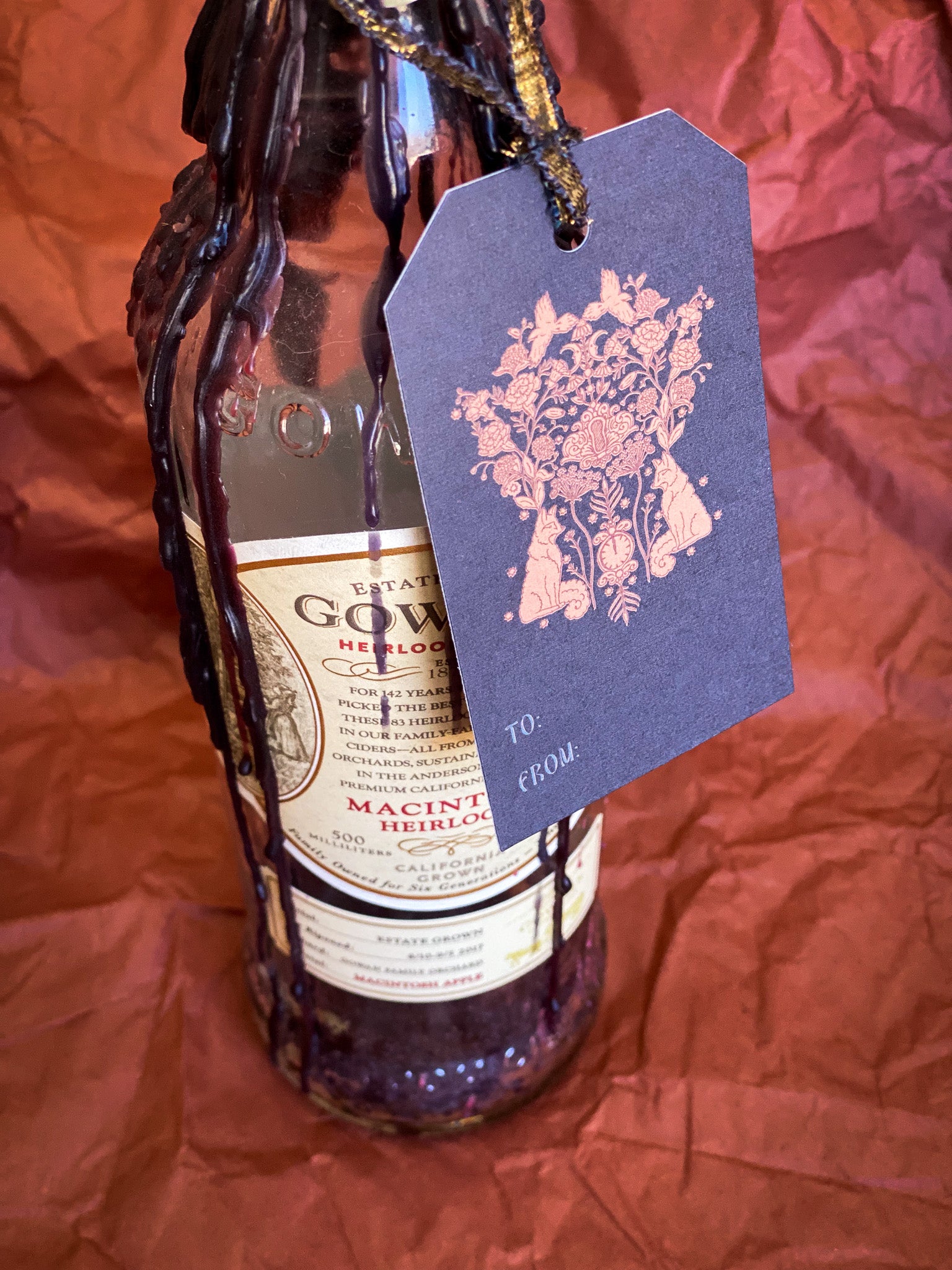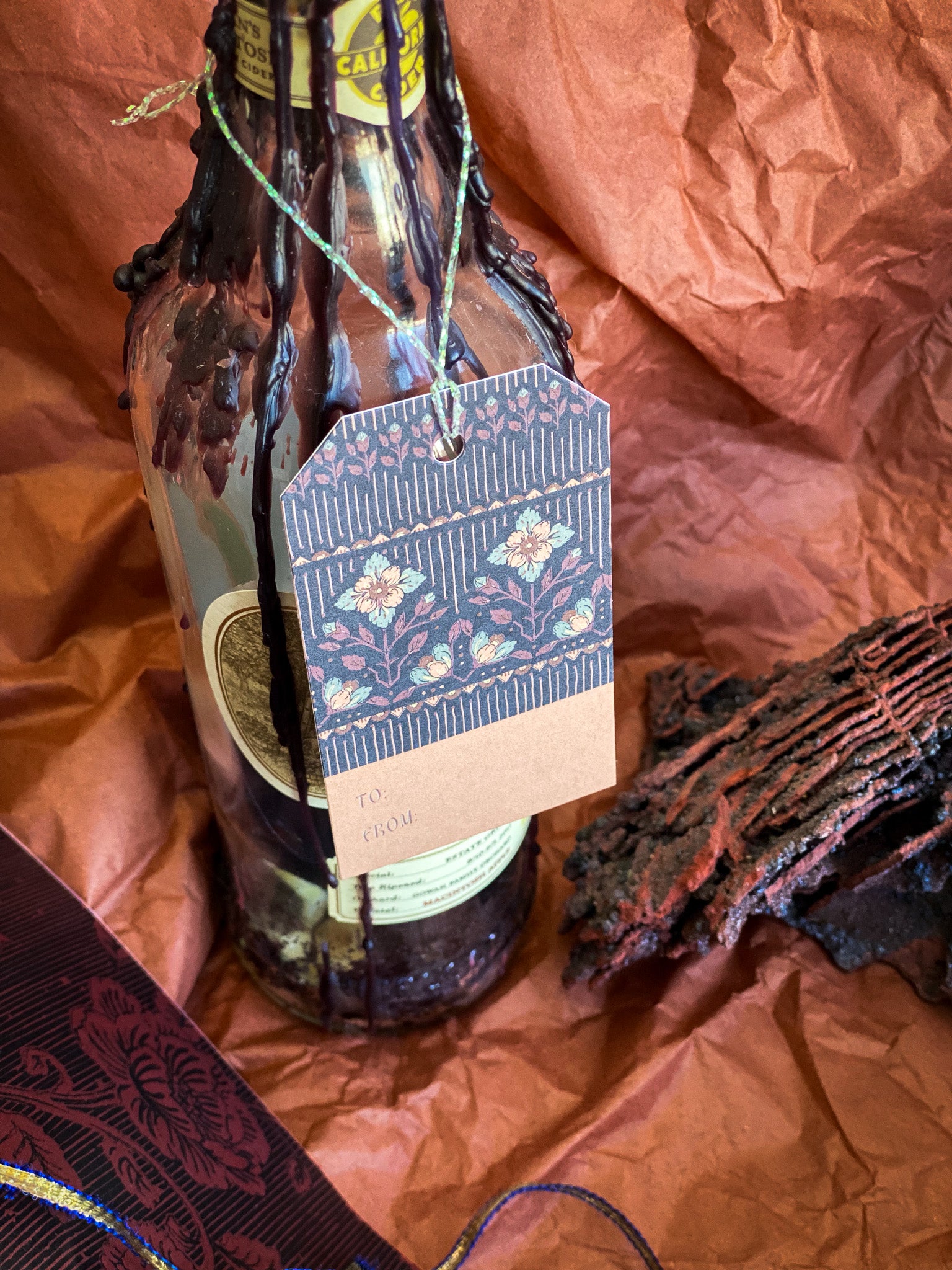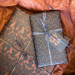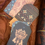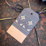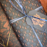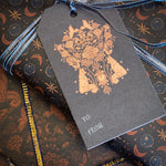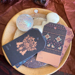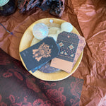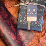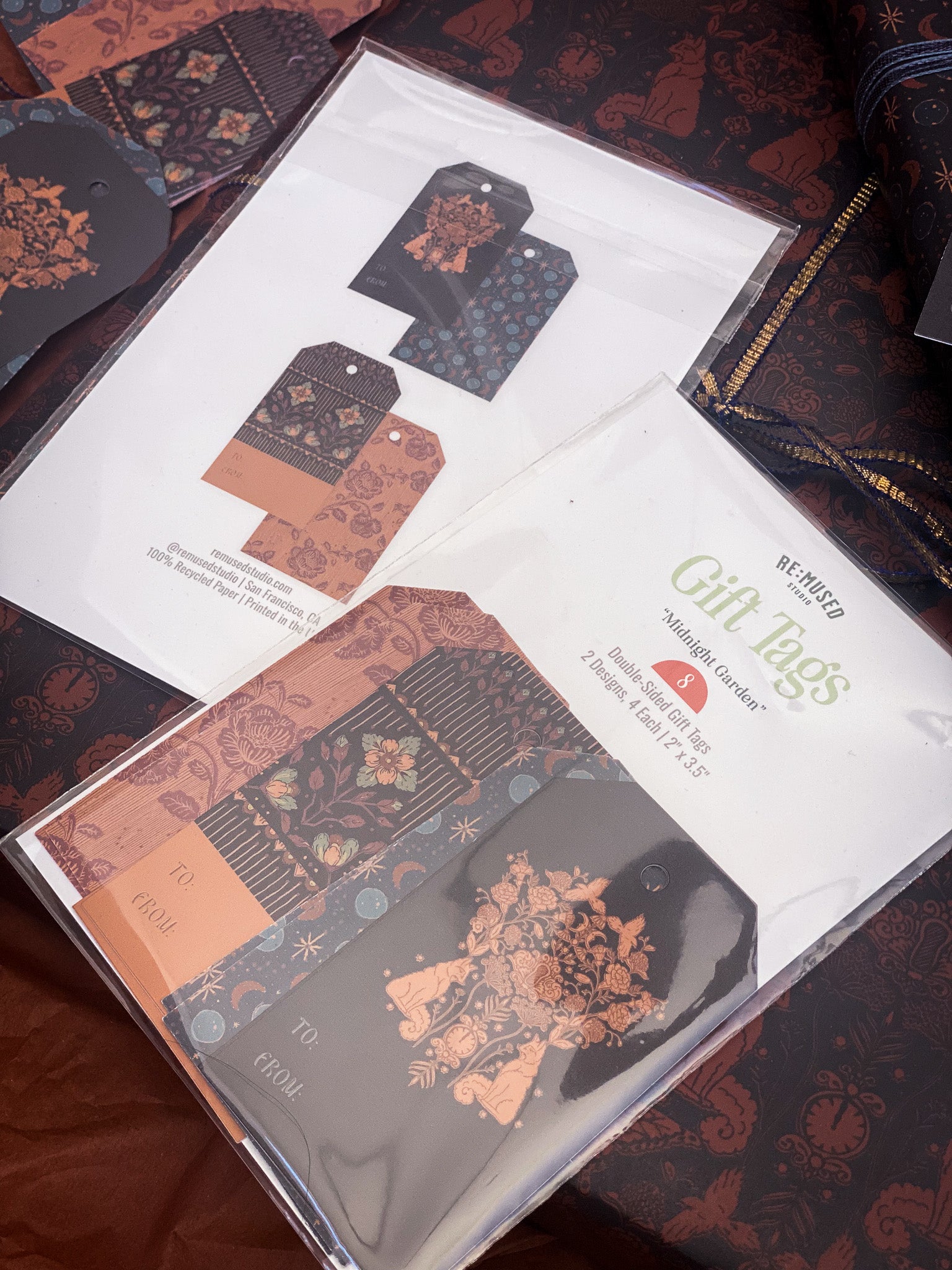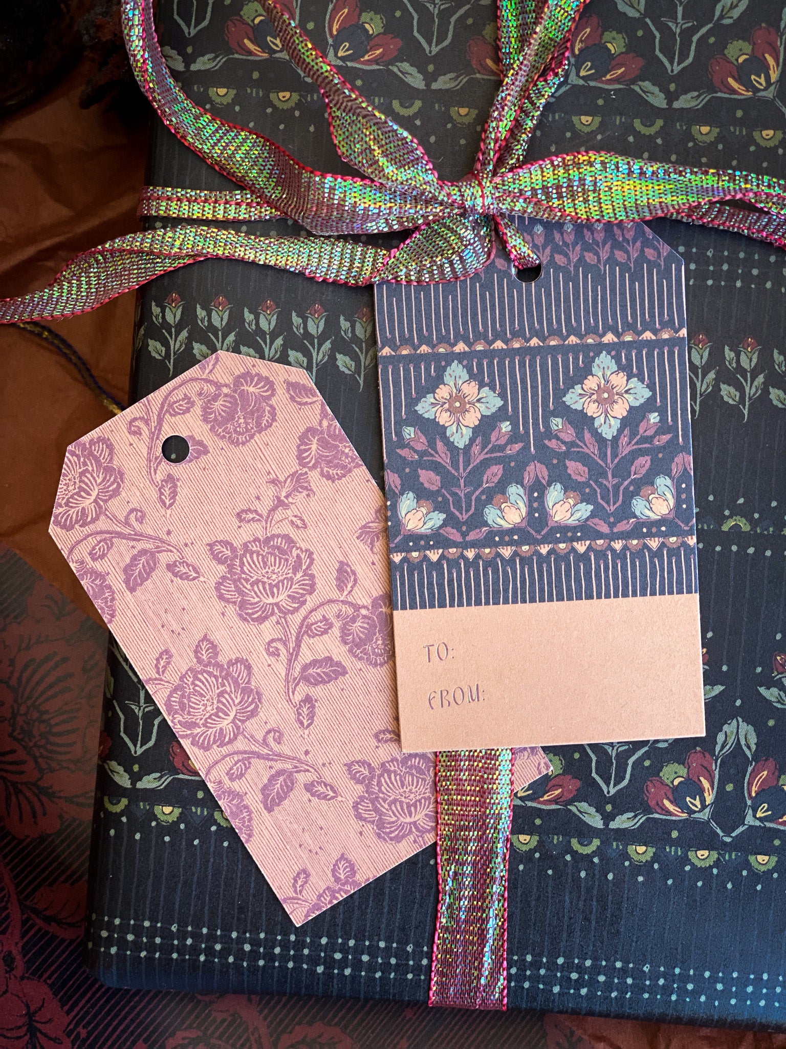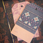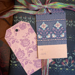 The Midnight Garden Gift Tag Set layers multiple worlds in one. A mystical mirrored garden where foxes roam, moths flutter, ravens soar, and vines curl around hidden clocks, antique keys, and secret locks adorns the front of one tag. Flip it over, and the night sky takes center stage with moons and stars. The other, a darkly romantic take on classic florals, fuses baroque elegance with a deep crimson, etching-inspired rose motif; and a folkloric stripe of hellebores, wild roses, and creeping vines. With its touch of moonlit glamour, it’s perfect for gifts wrapped with intrigue, romance, and a little bit of mischief.