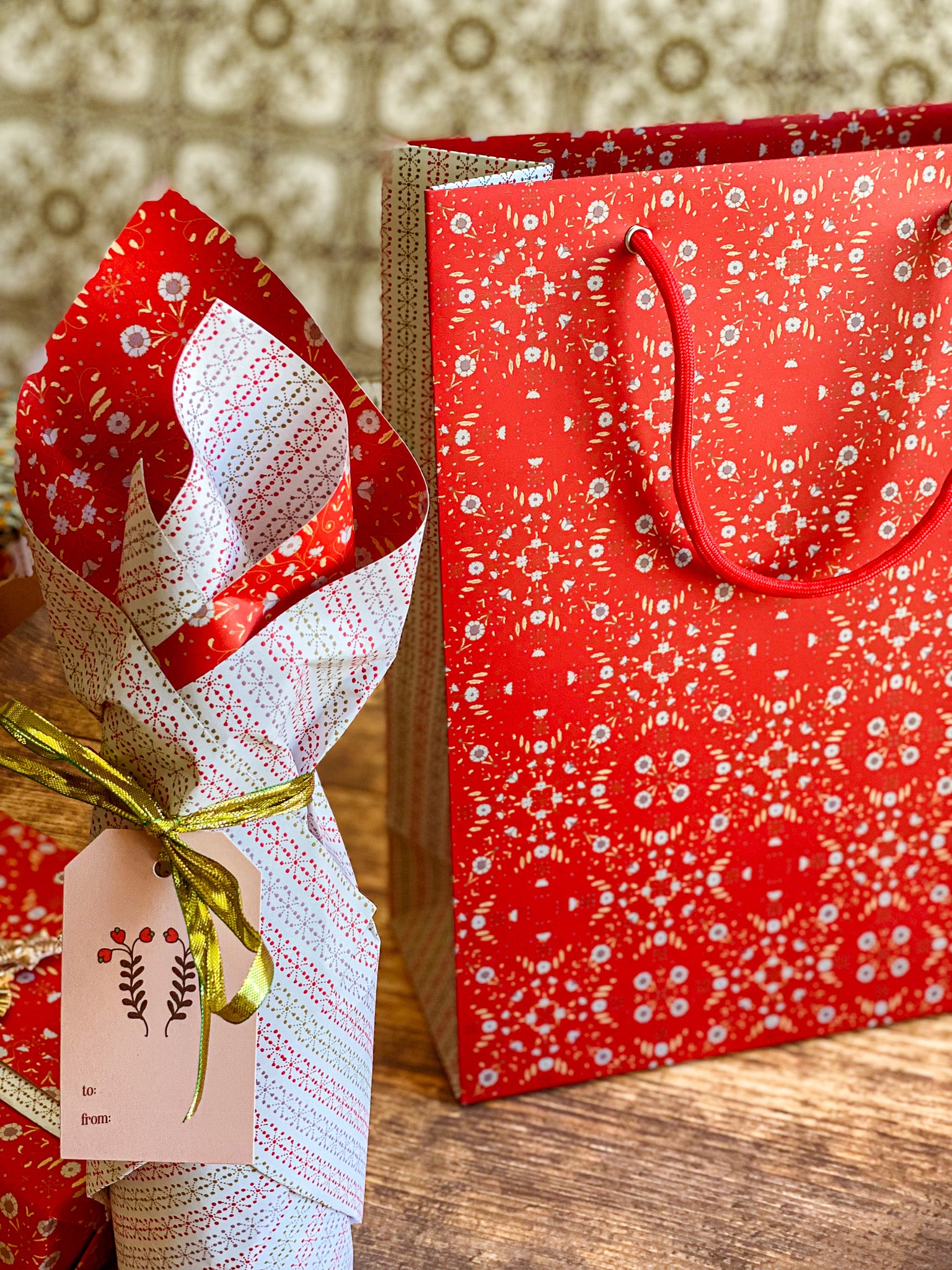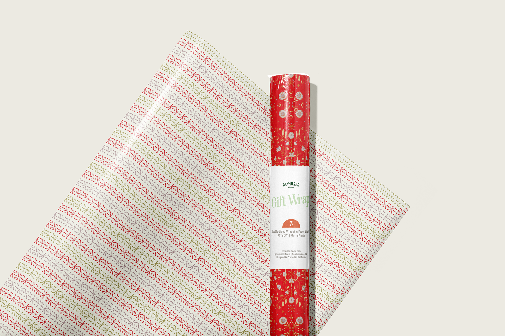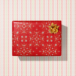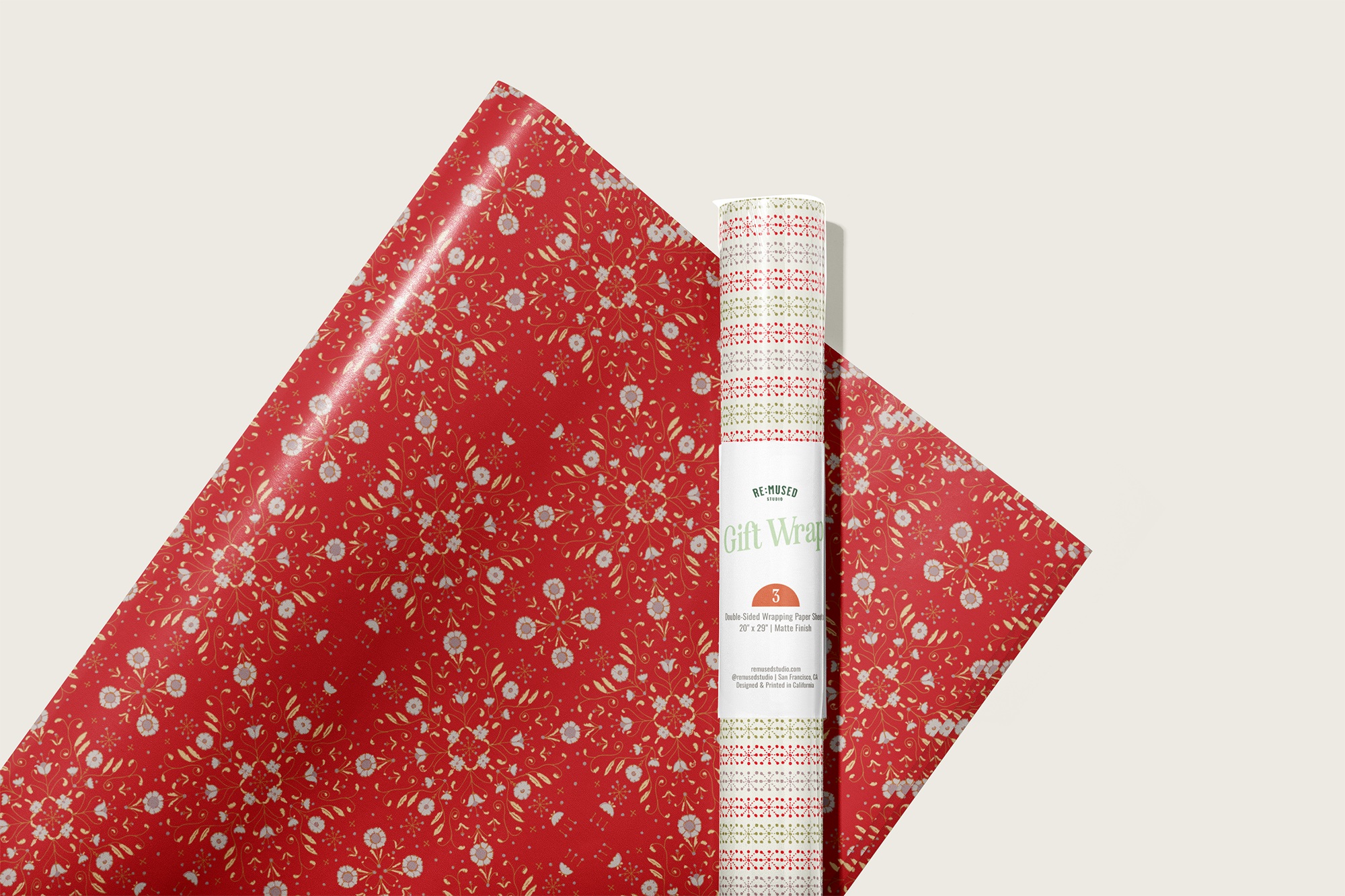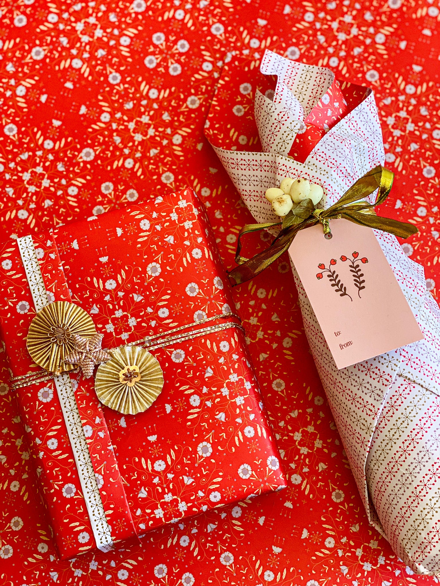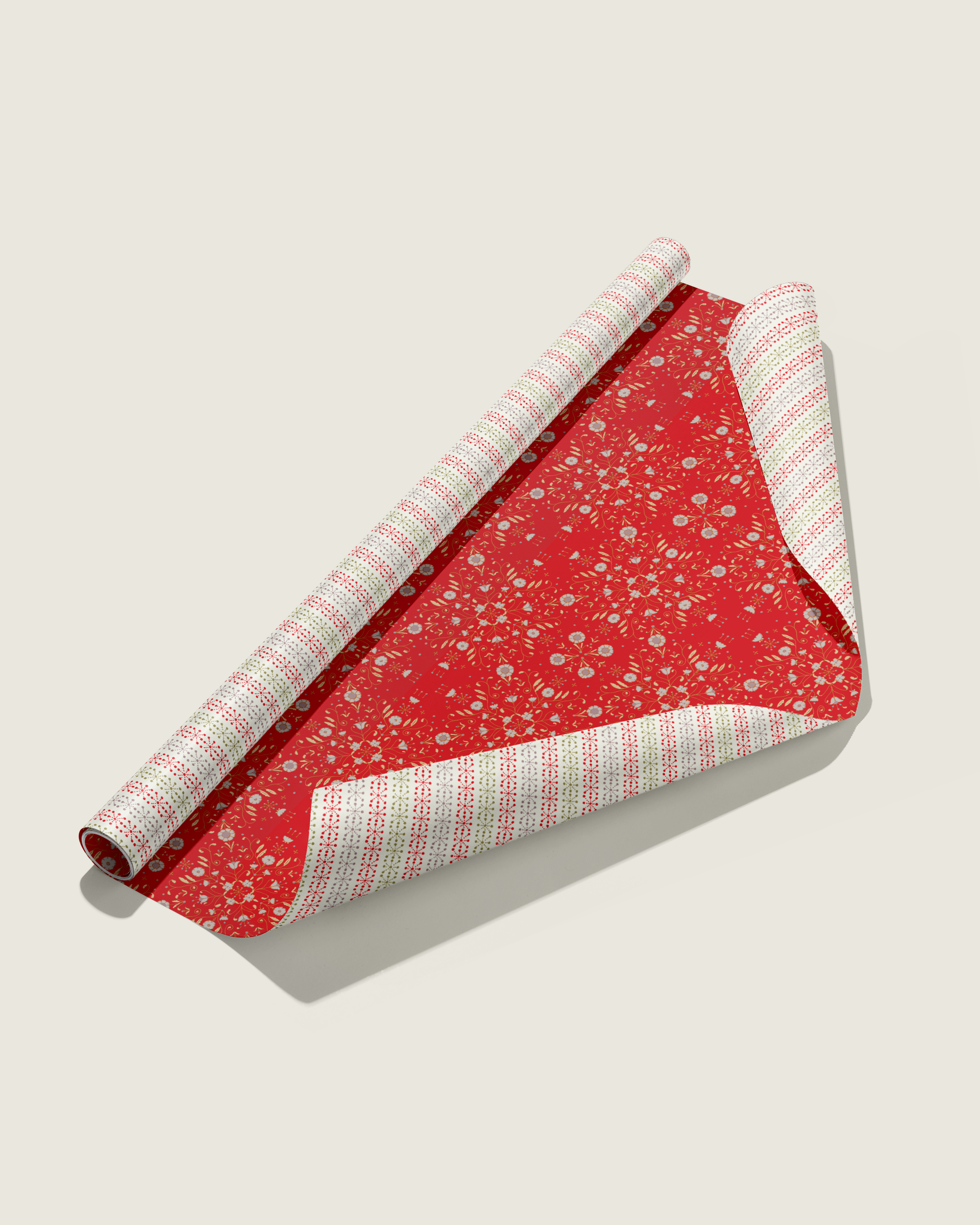 Bring an elevated style to your gifting with Peppermint Petals, a double-sided holiday wrapping paper featuring a delicate hand illustrated floral snowflake pattern on one side in vibrant red with pale purples and warm golds, while the reverse showcases a folk-inspired snowflake stripe in red, green and gold on a light backdrop. Combining vintage elegance with nostalgic charm, this pairing offers two coordinated looks in one versatile wrap — perfect for Christmas presents, party favors, holiday displays or decorations with a touch of cozy elegance.