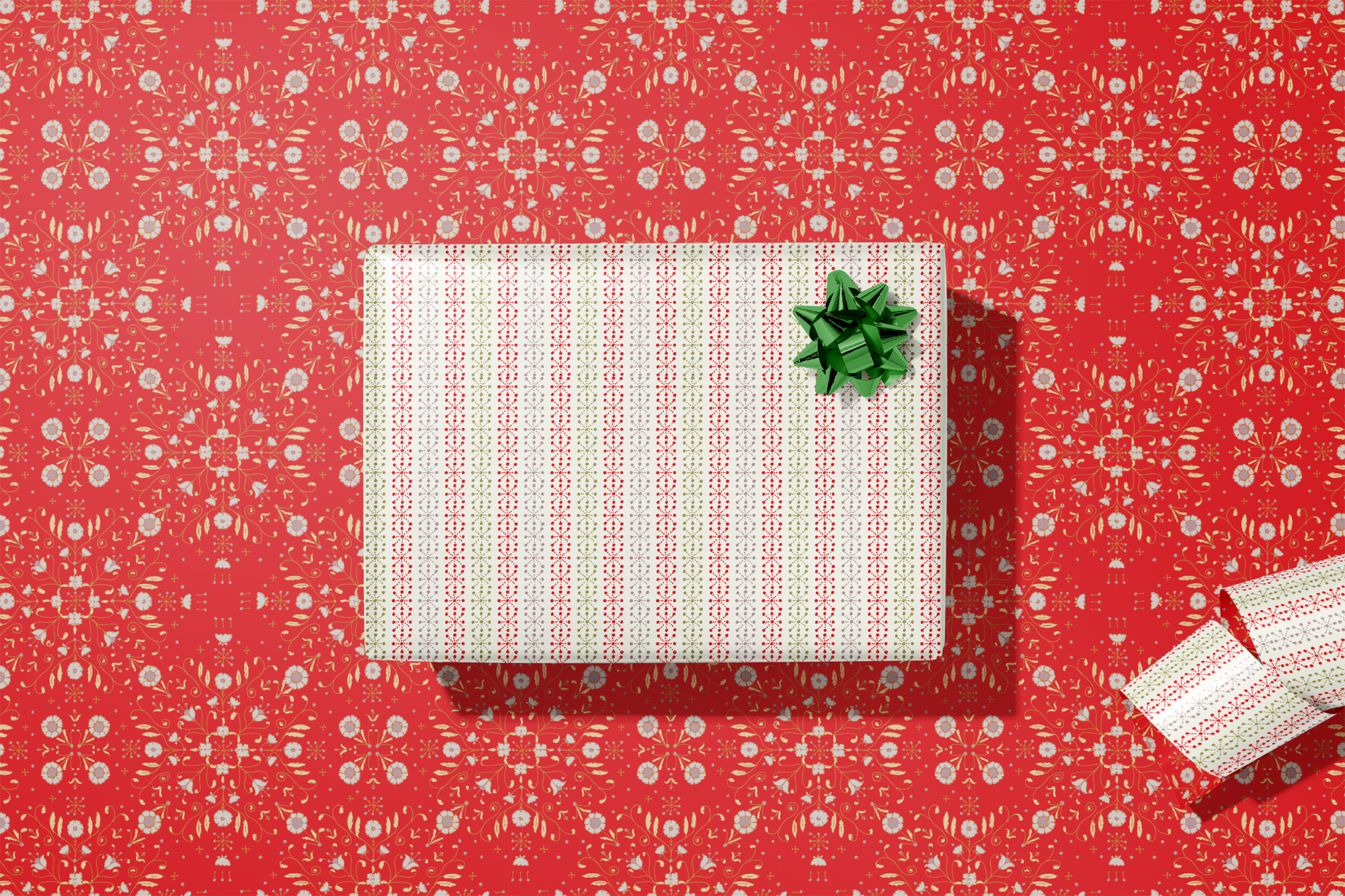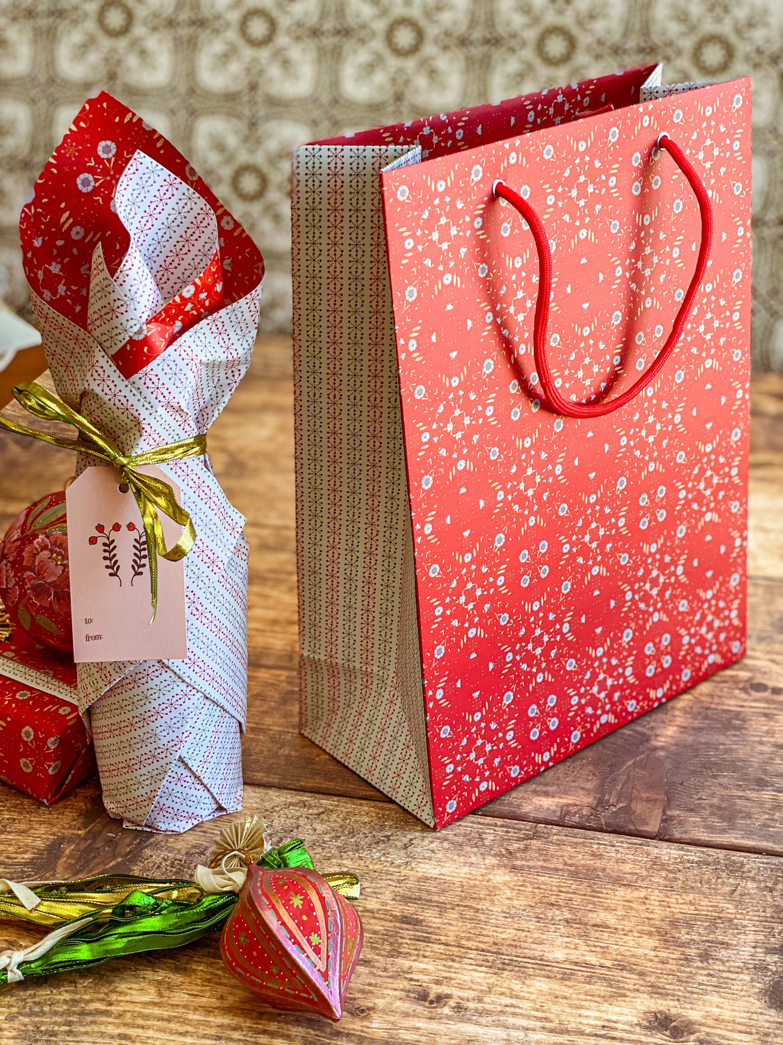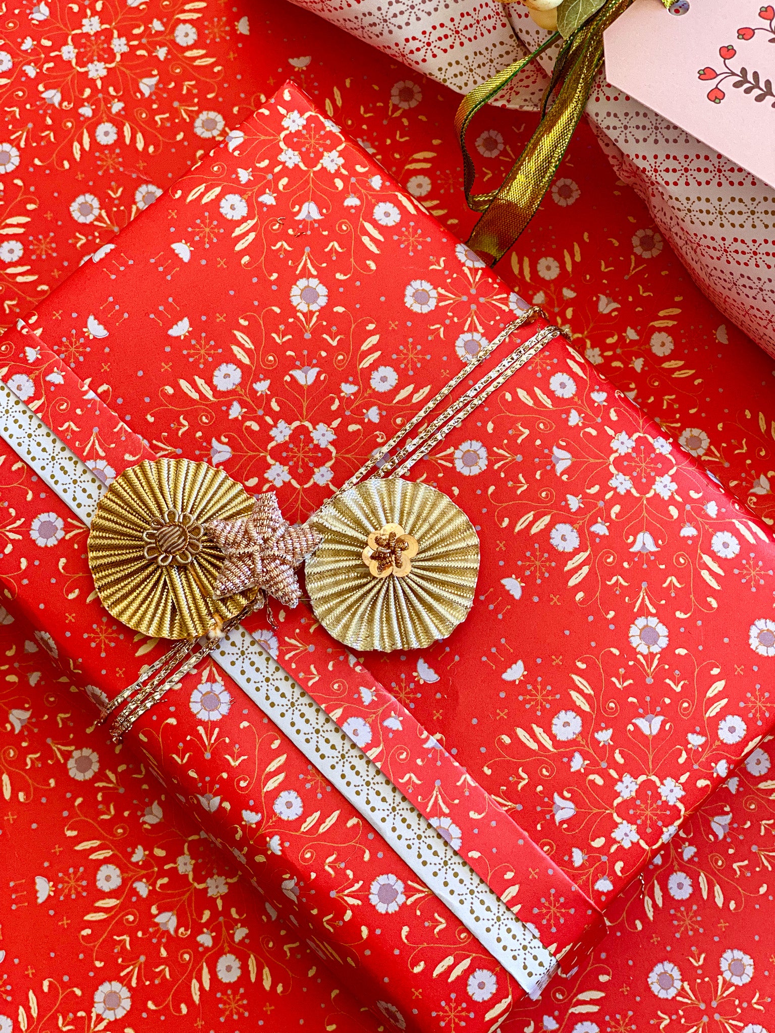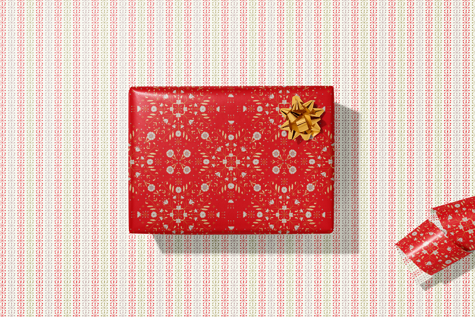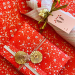 Bring an elevated style to your gifting with Peppermint Petals, a double-sided holiday wrapping paper featuring a delicate hand illustrated floral snowflake pattern on one side in vibrant red with pale purples and warm golds, while the reverse showcases a folk-inspired snowflake stripe in red, green and gold on a light backdrop. Combining vintage elegance with nostalgic charm, this pairing offers two coordinated looks in one versatile wrap — perfect for Christmas presents, party favors, holiday displays or decorations with a touch of cozy elegance.