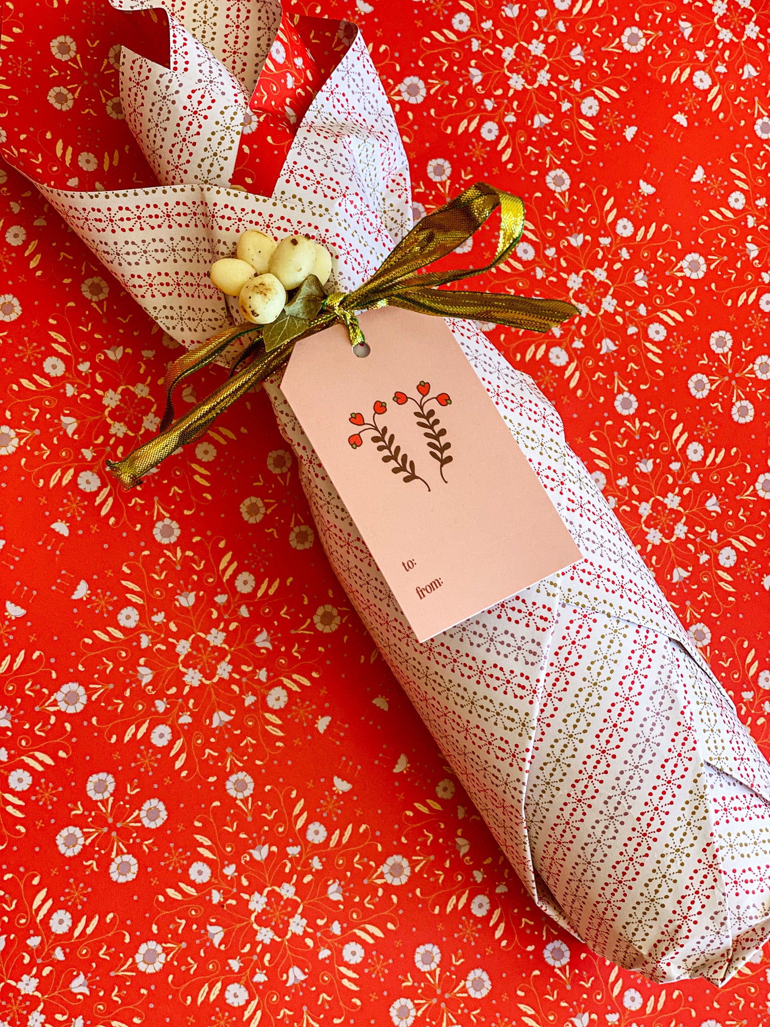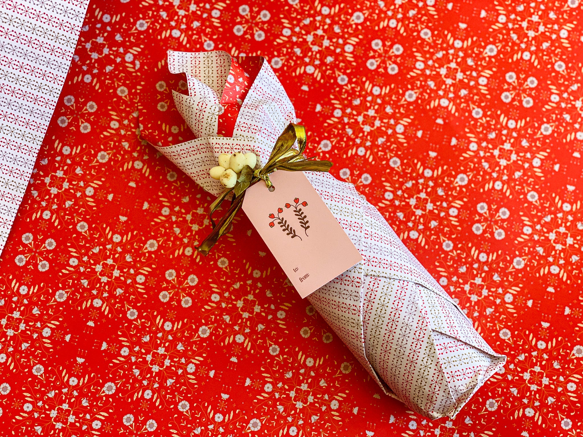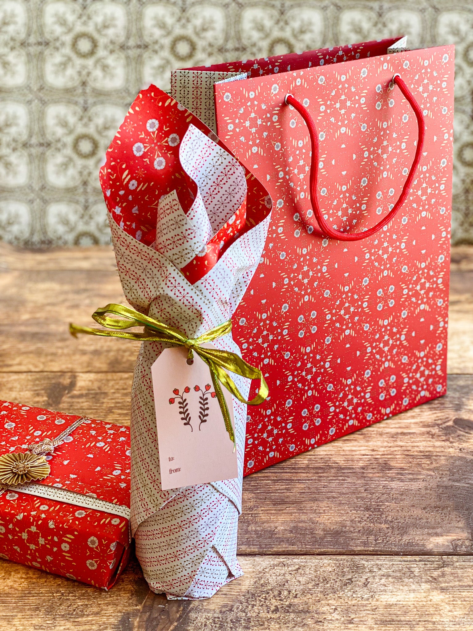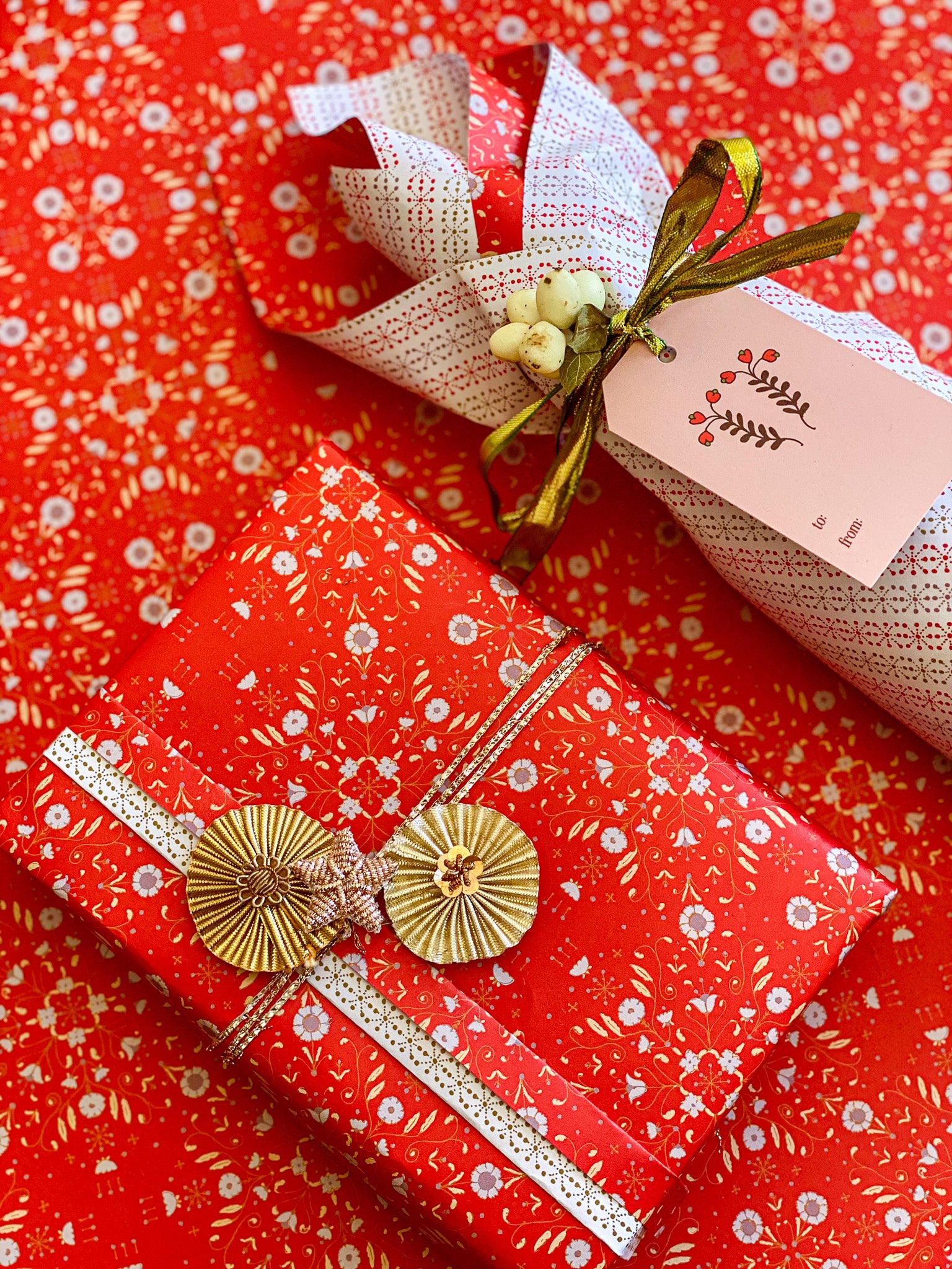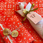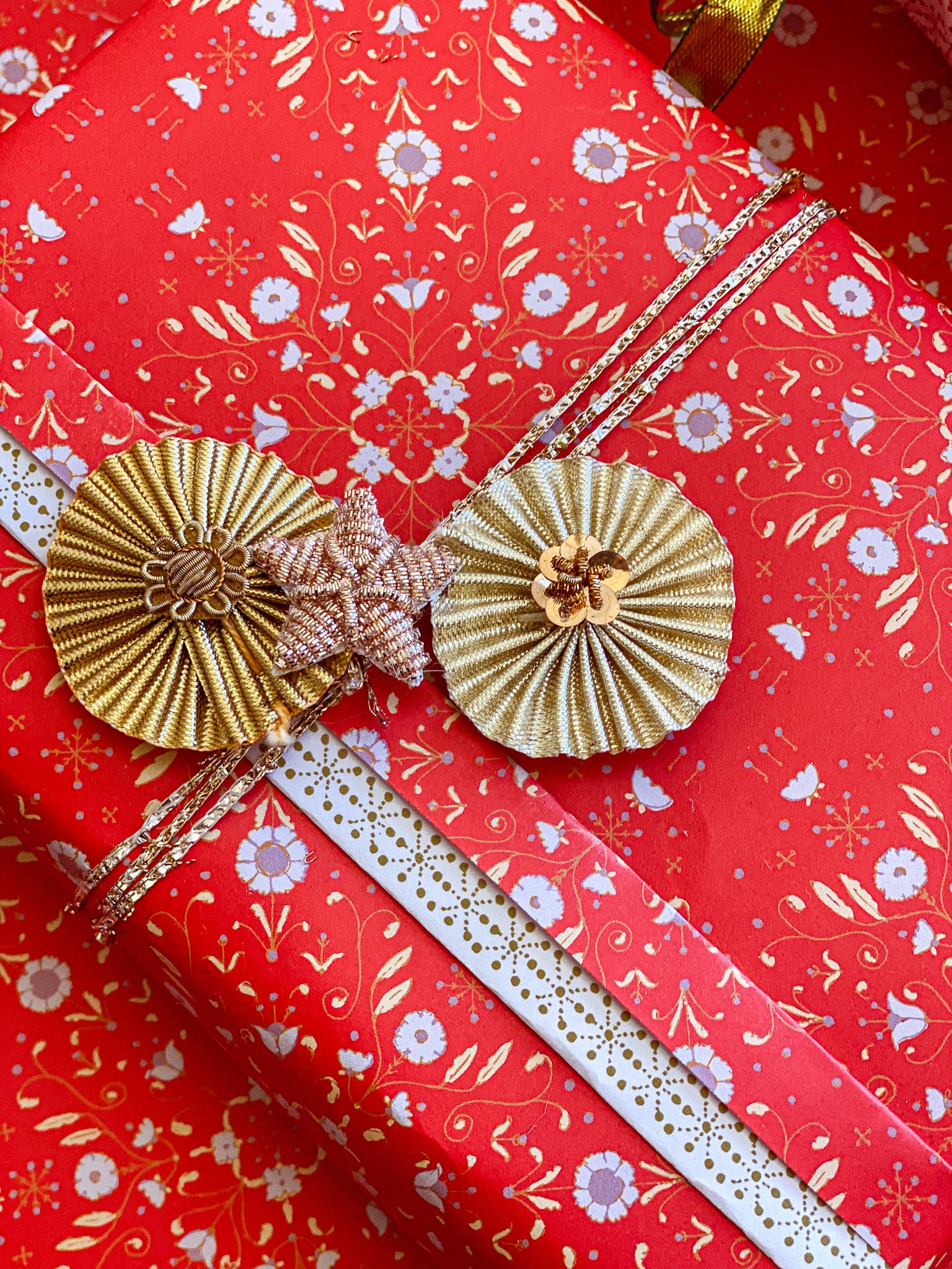 Bring an elevated style to your gifting with Peppermint Petals, a double-sided holiday wrapping paper featuring a delicate hand illustrated floral snowflake pattern on one side in vibrant red with pale purples and warm golds, while the reverse showcases a folk-inspired snowflake stripe in red, green and gold on a light backdrop. Combining vintage elegance with nostalgic charm, this pairing offers two coordinated looks in one versatile wrap — perfect for Christmas presents, party favors, holiday displays or decorations with a touch of cozy elegance.