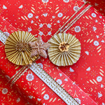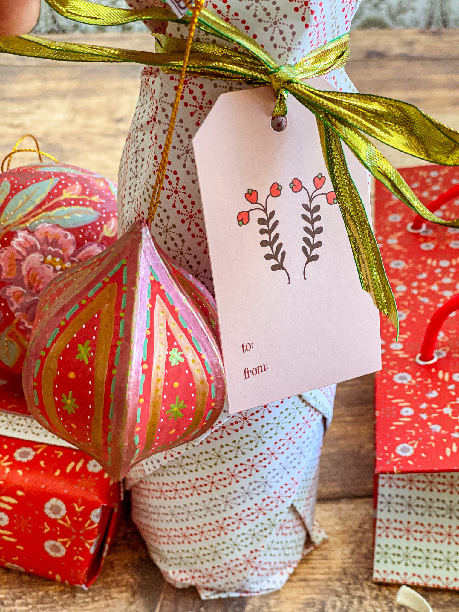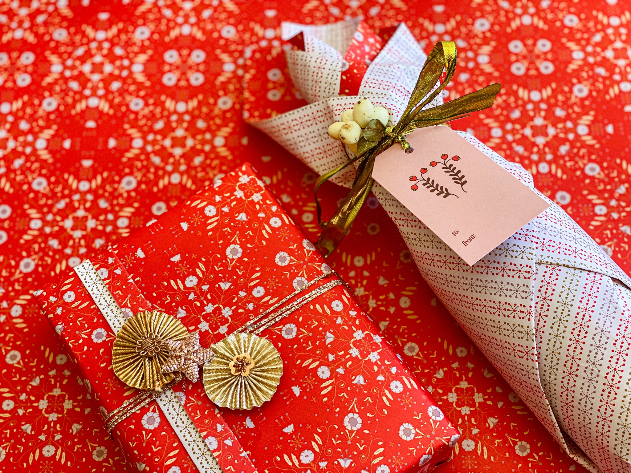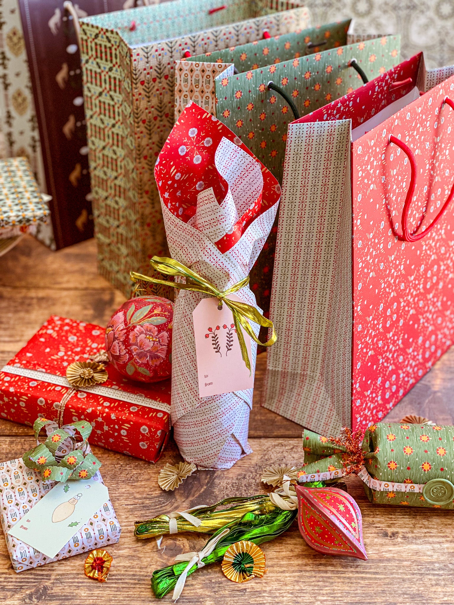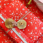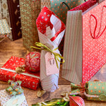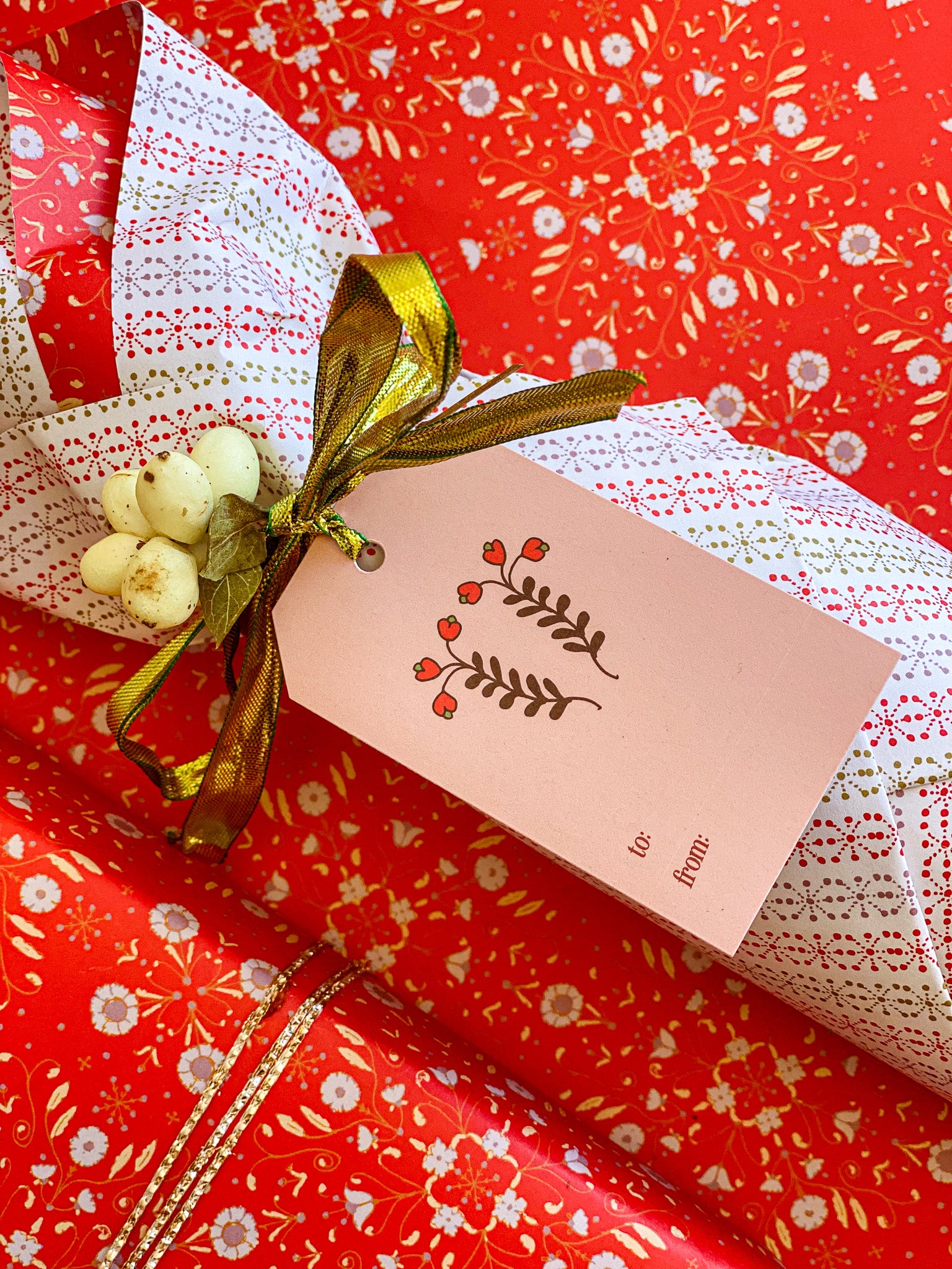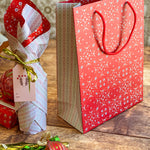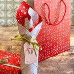 Bring an elevated style to your gifting with Peppermint Petals, a double-sided holiday wrapping paper featuring a delicate hand illustrated floral snowflake pattern on one side in vibrant red with pale purples and warm golds, while the reverse showcases a folk-inspired snowflake stripe in red, green and gold on a light backdrop. Combining vintage elegance with nostalgic charm, this pairing offers two coordinated looks in one versatile wrap — perfect for Christmas presents, party favors, holiday displays or decorations with a touch of cozy elegance.