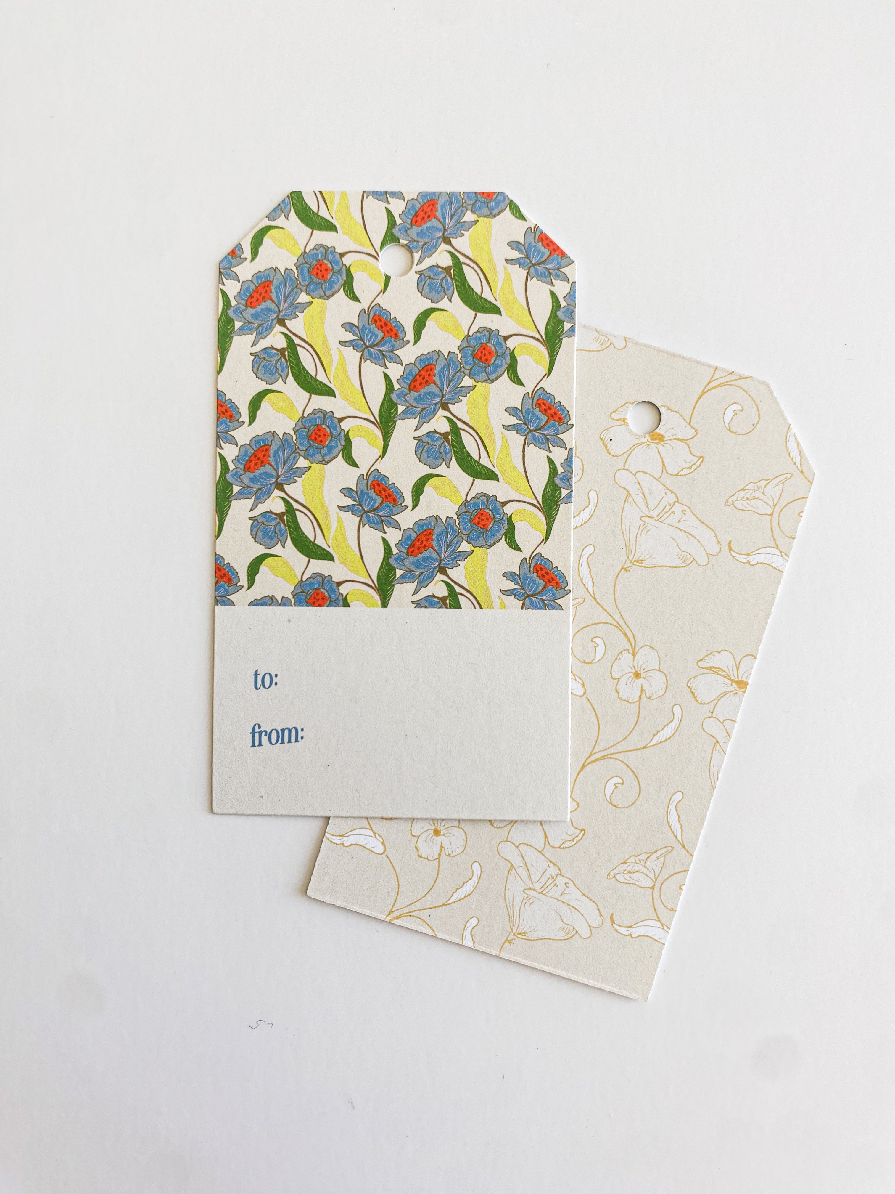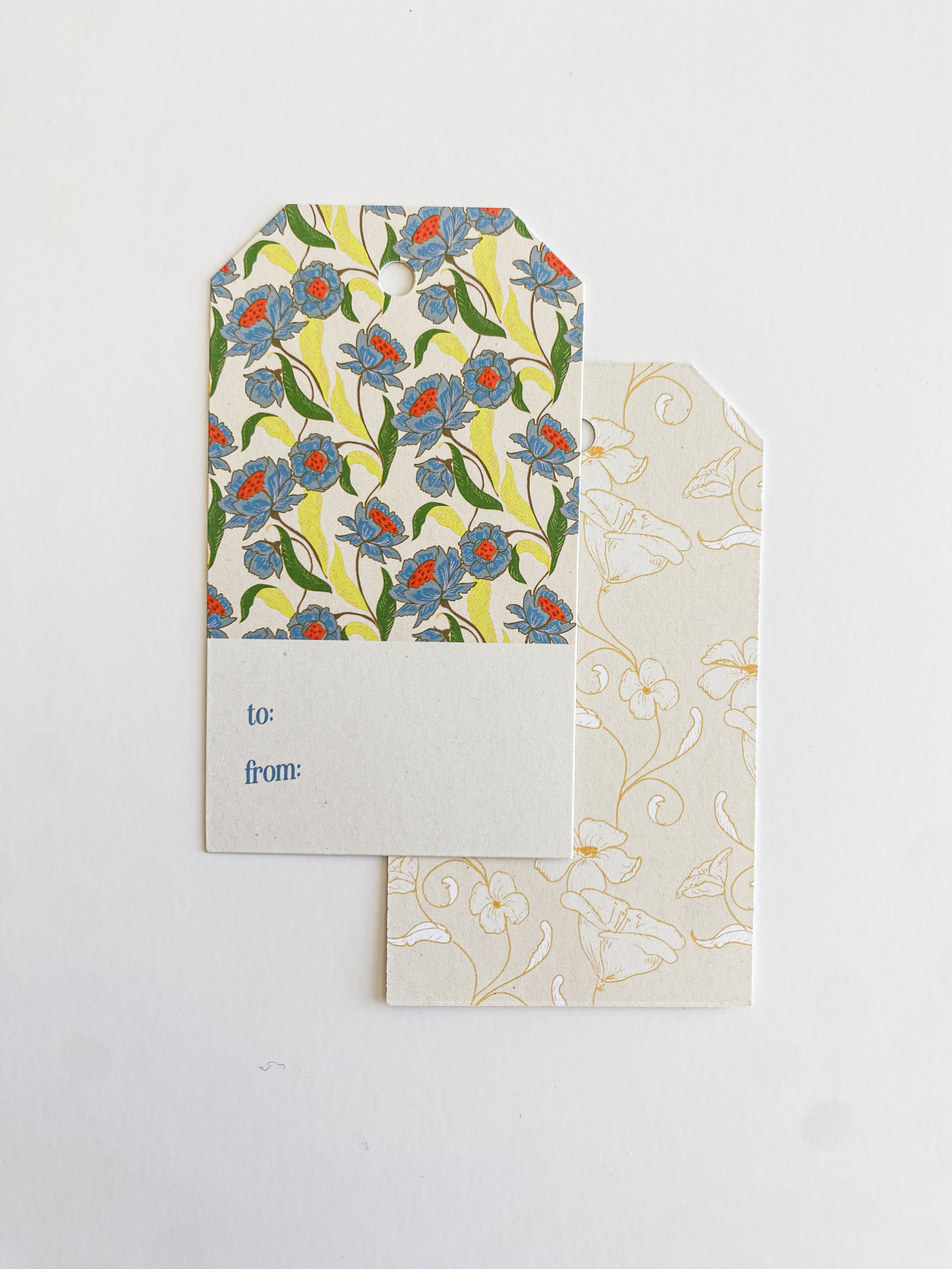 Our Primavera double-sided gift tags are designed to coordinate with our signature double-sided gift wrap to add a special finishing touch to any gift giving moment. They feature a pairing of trailing floral patterns, one in a vibrant blue and bright green, the other a soft neutral cream. Classic with a modern twist, these gift tags are great for Mother's Day, Easter, birthdays, bridal or baby showers, wedding gifts or any special occasion year round.