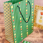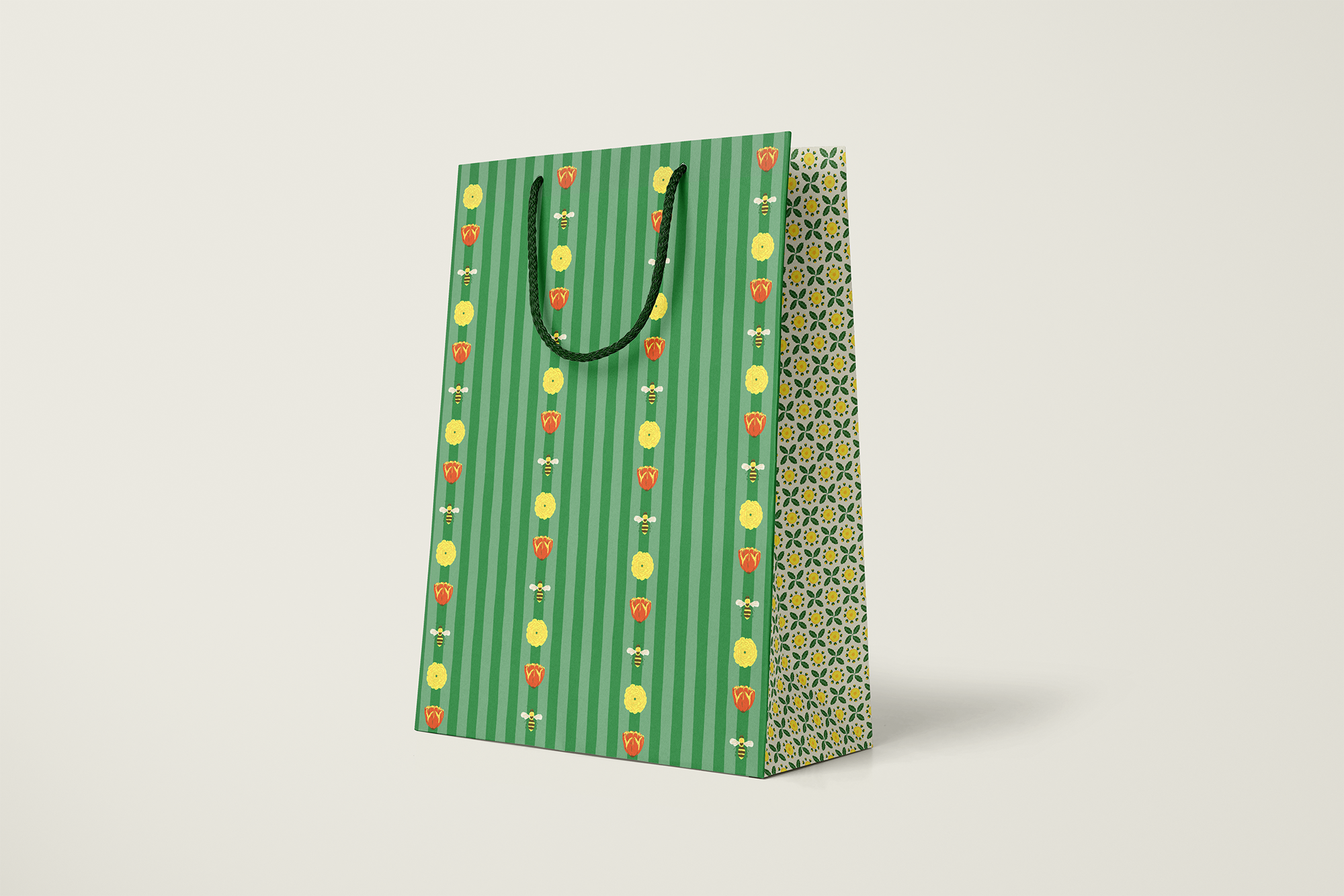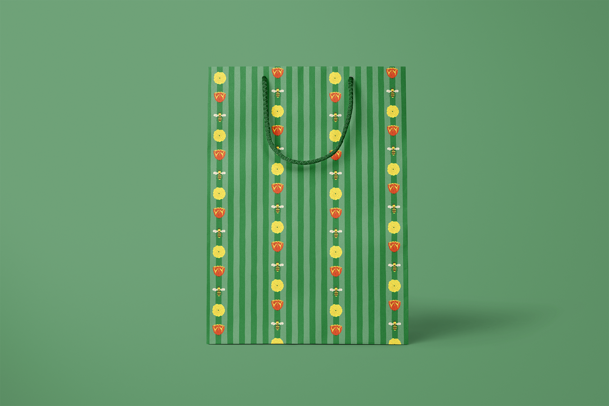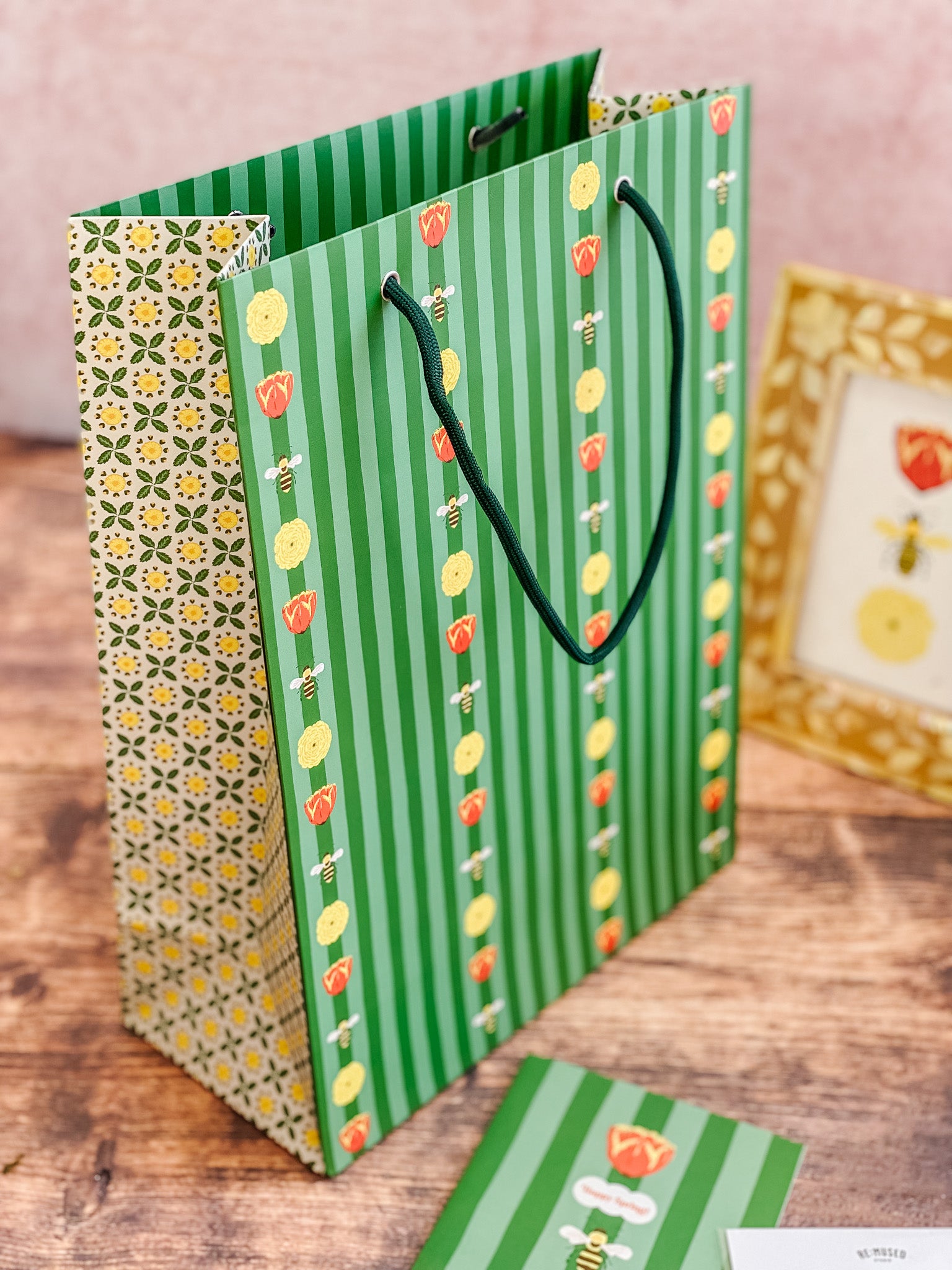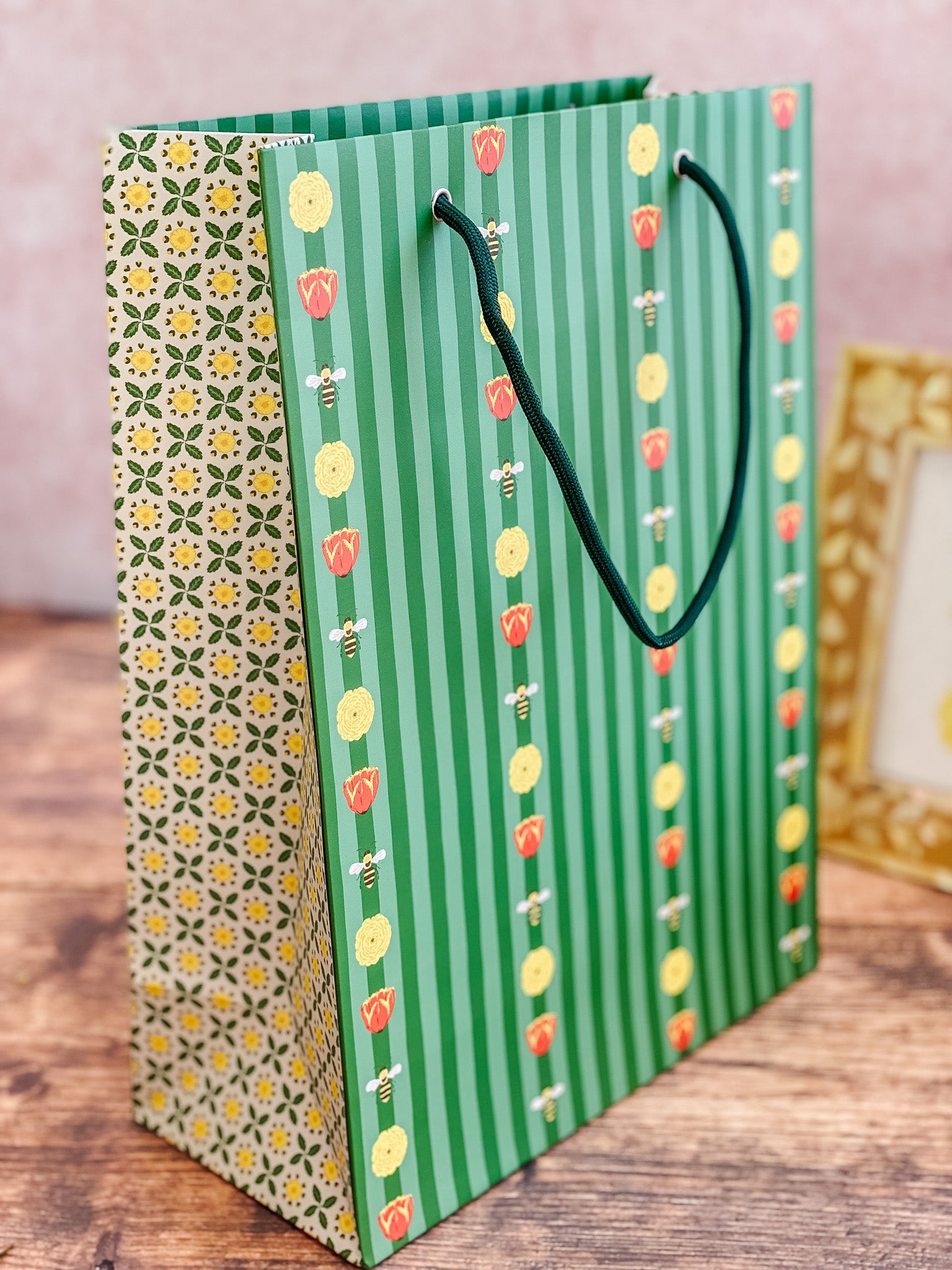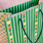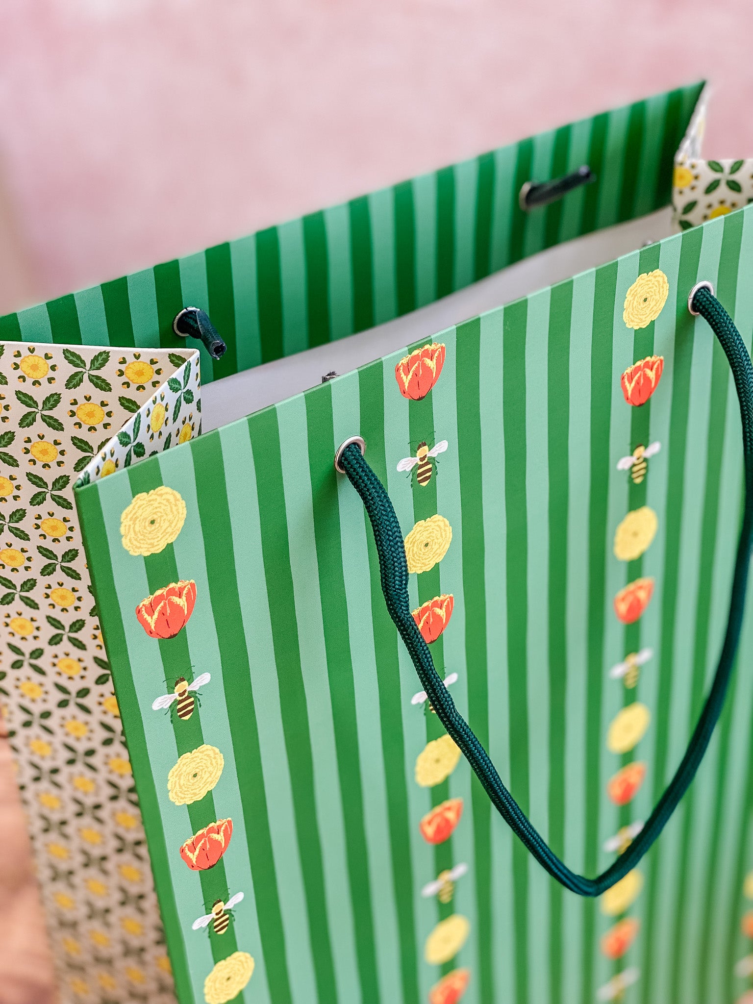 Spring Fling features a pair of vibrant Spring floral patterns from our Prima Vera Collection inspired by the colors and art of the Italian coast. The front and back highlight a bold green grass tonal stripe with rows of tulips, ranunculus, and bee illustrations.The gusseted sides are finished with a coordinating simple lemon yellow and green geometric tile grid floral and leaf pattern on a cream background. Green rope handles complete the look with a clean, classic finish.