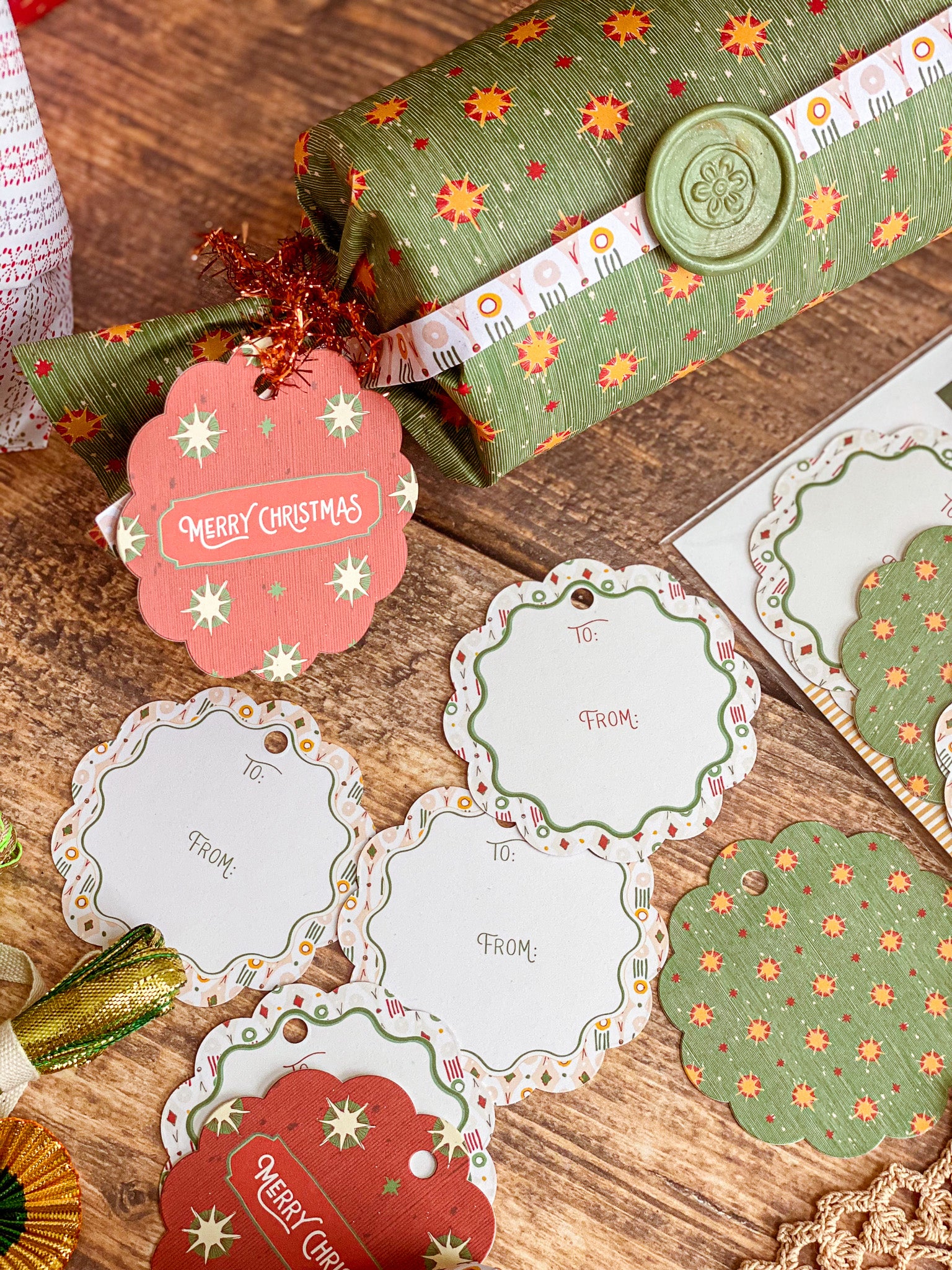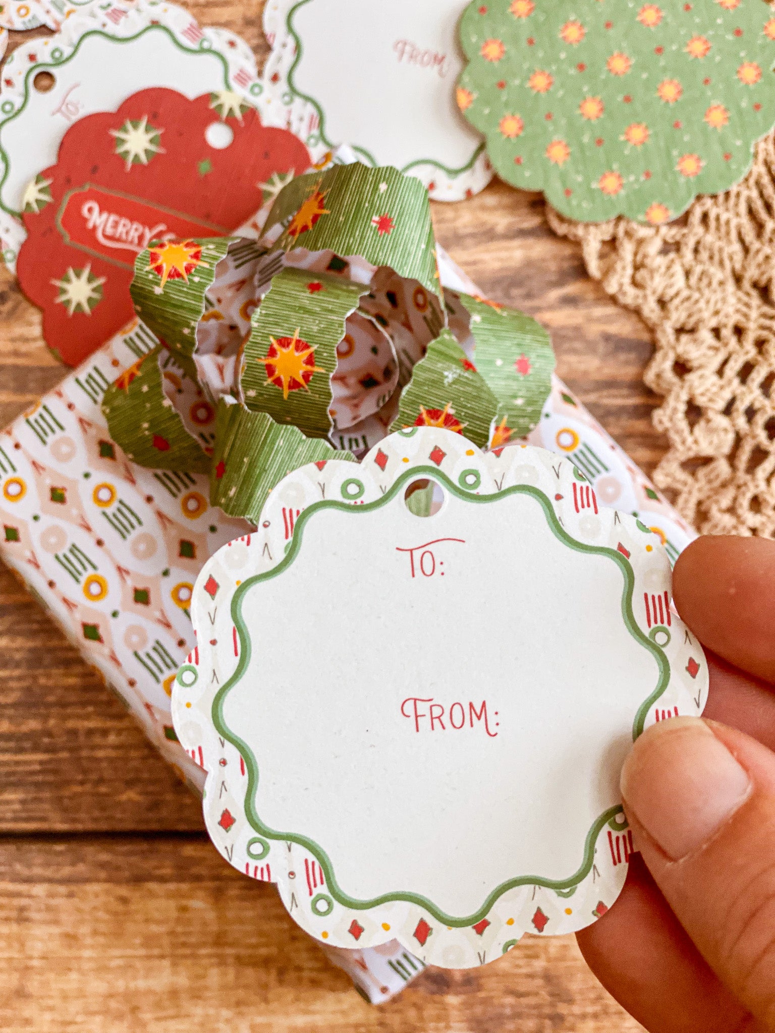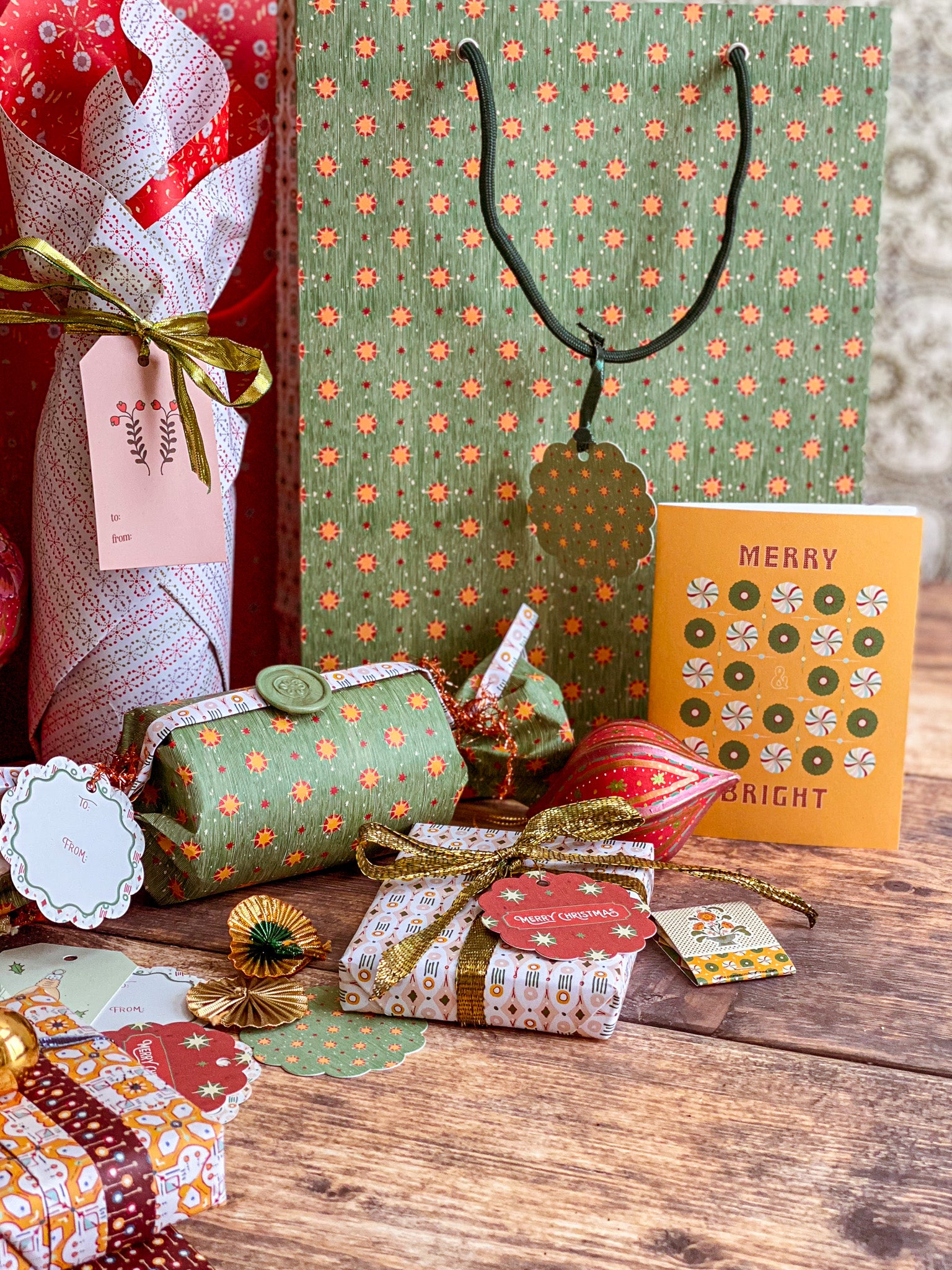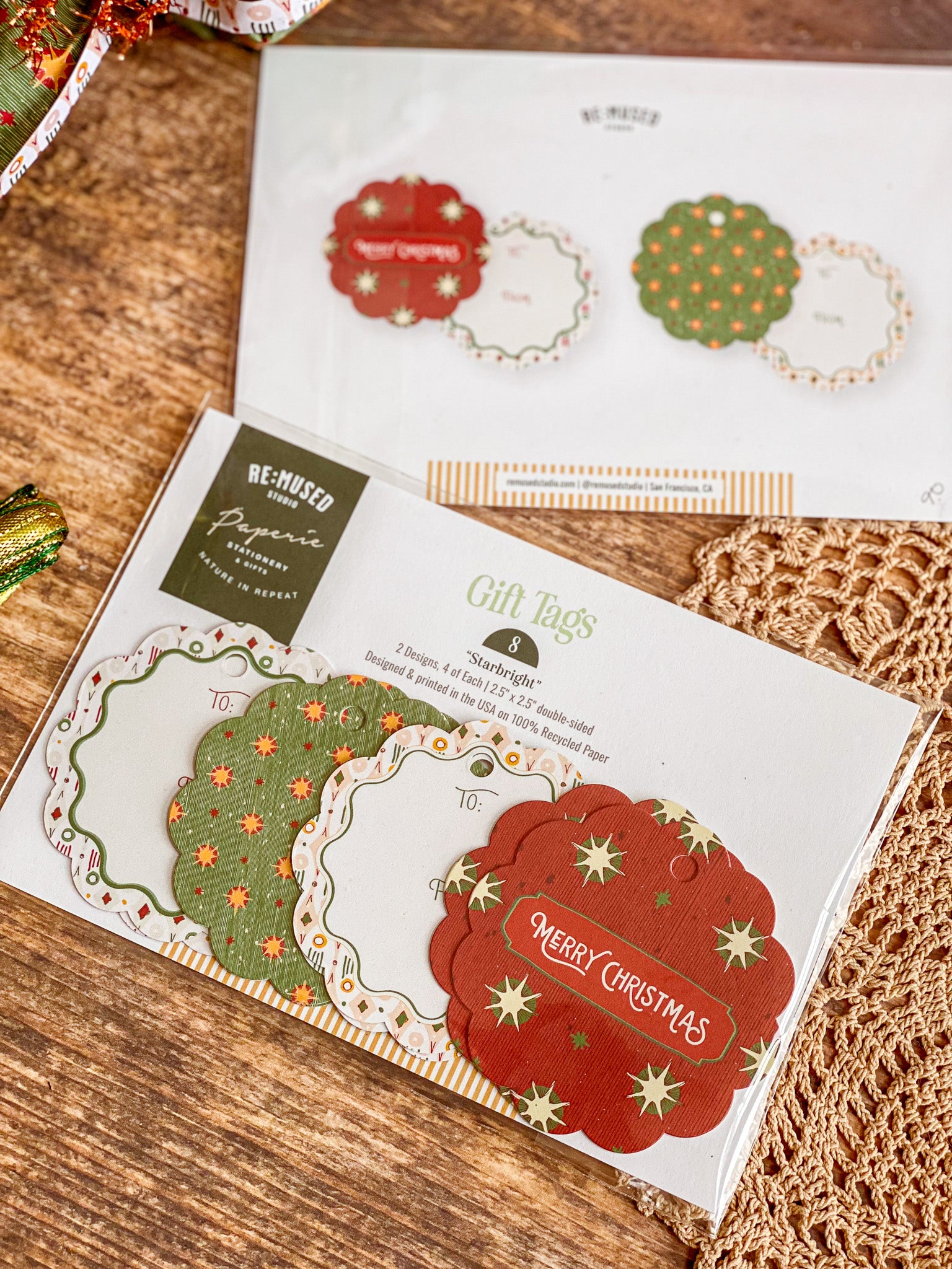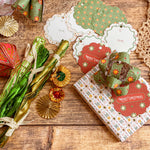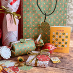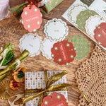 Bring a European vintage style to your gifting with Starbright gift tags, a paring of double-sided holiday tags featuring a textured hand illustrated starry sky pattern on one side in vibrant red with "Merry Christmas" and green with bursts of golden yellows and cream stars. The reverse showcases a diamond, dot and stripe pattern reminiscent of French and Italian block printed papers and "To/From" graphics for easy personalization. Combining nostalgic circus-inspired motifs and retro holiday décor, these gift tags pair perfectly with our coordinating double-sided gift wrap and our premium gift bags for an extra special holiday presentation