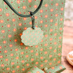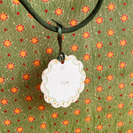 • 2.5" W x 2..5" H, scalloped die cut circle shape, drilled hole