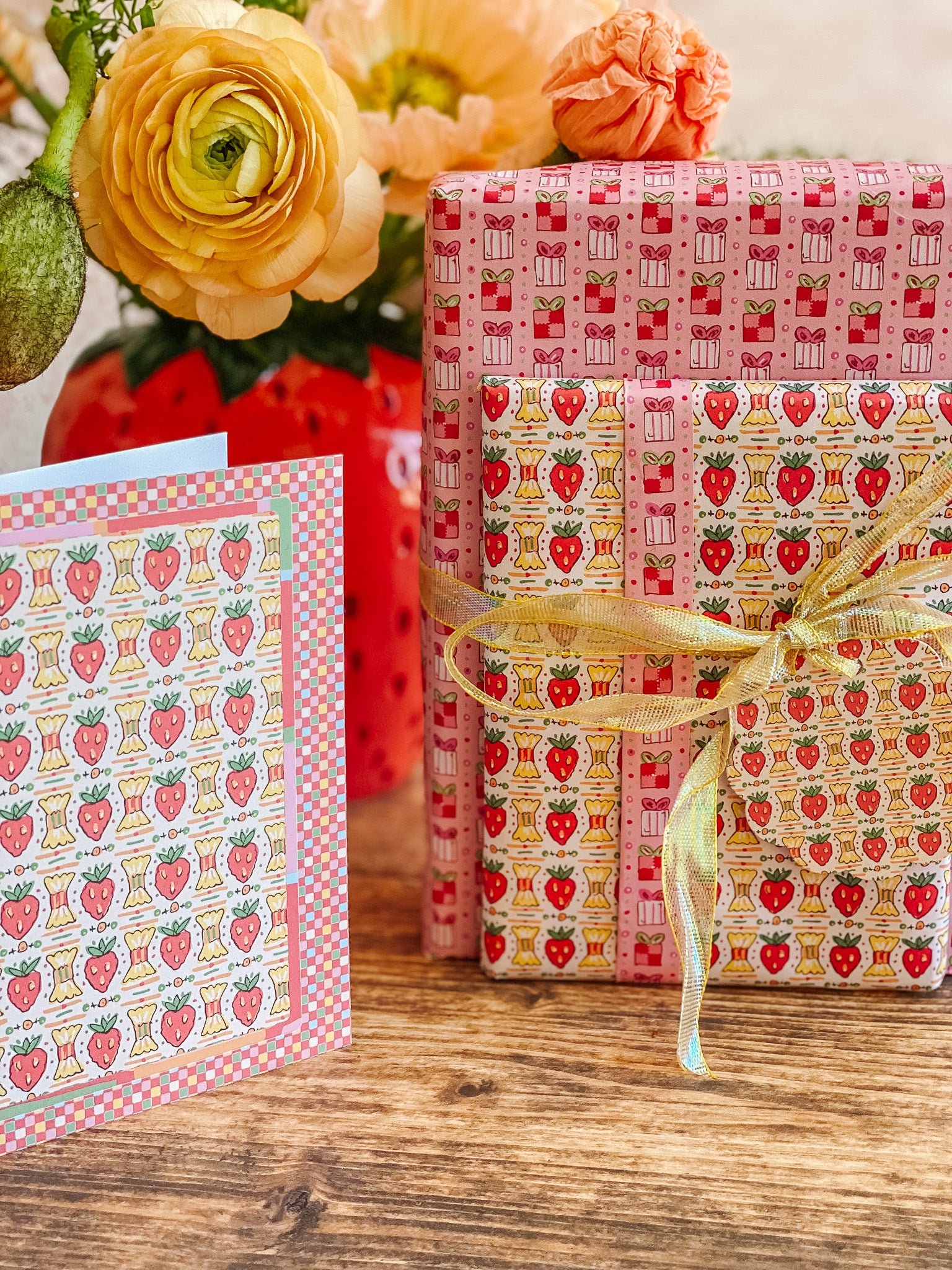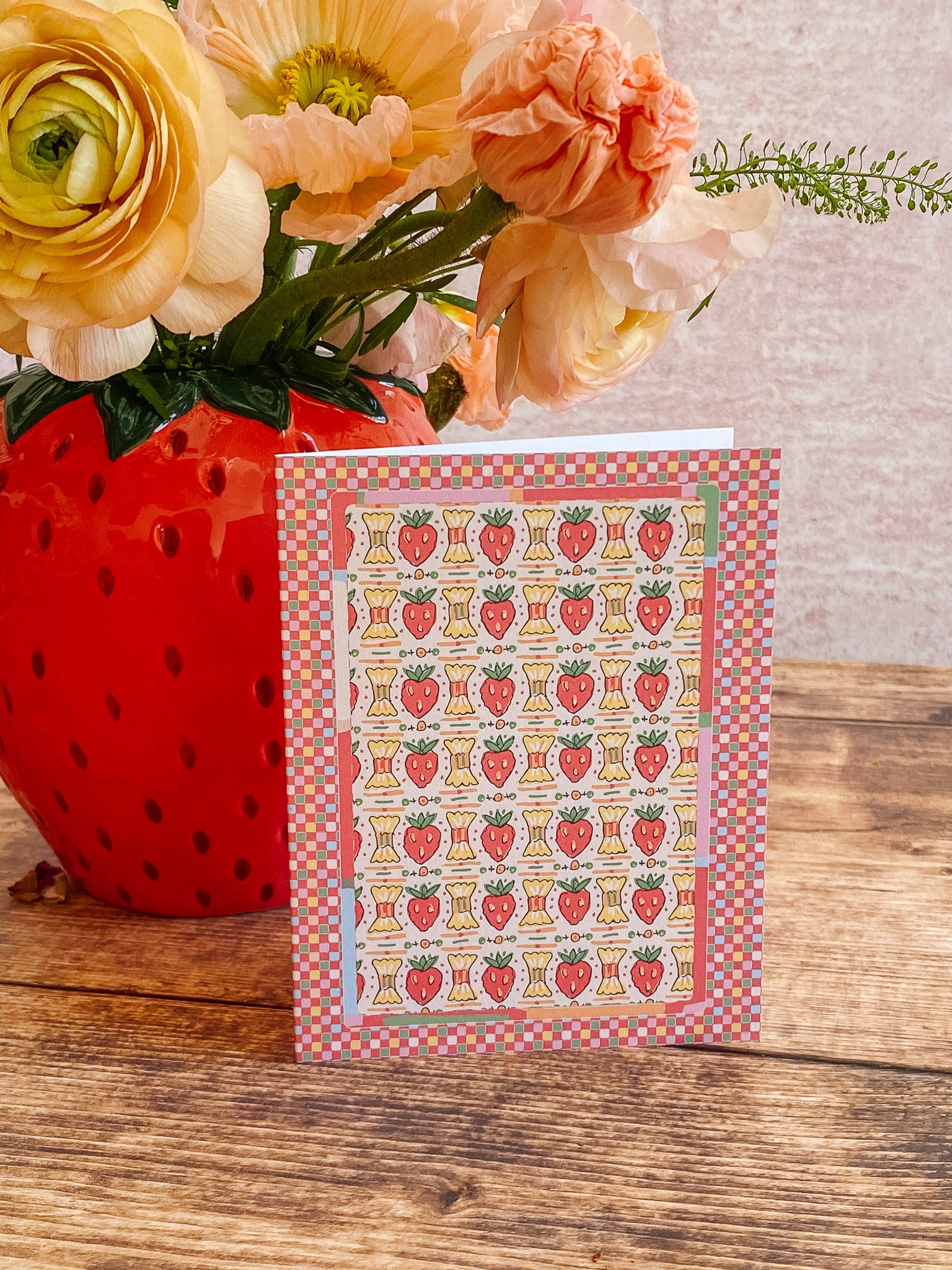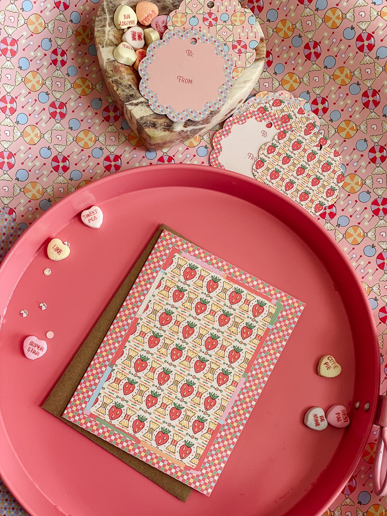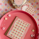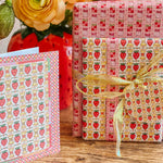 A sweet pattern with a nostalgic twist. Strawberry Candy features a playful repeat of candy-inspired strawberries and wrapped sweets, framed by cheerful checks and soft pastel accents. Drawing from vintage confectionery packaging and Valentine ephemera, this card feels bright, happy, and delightfully nostalgic.
