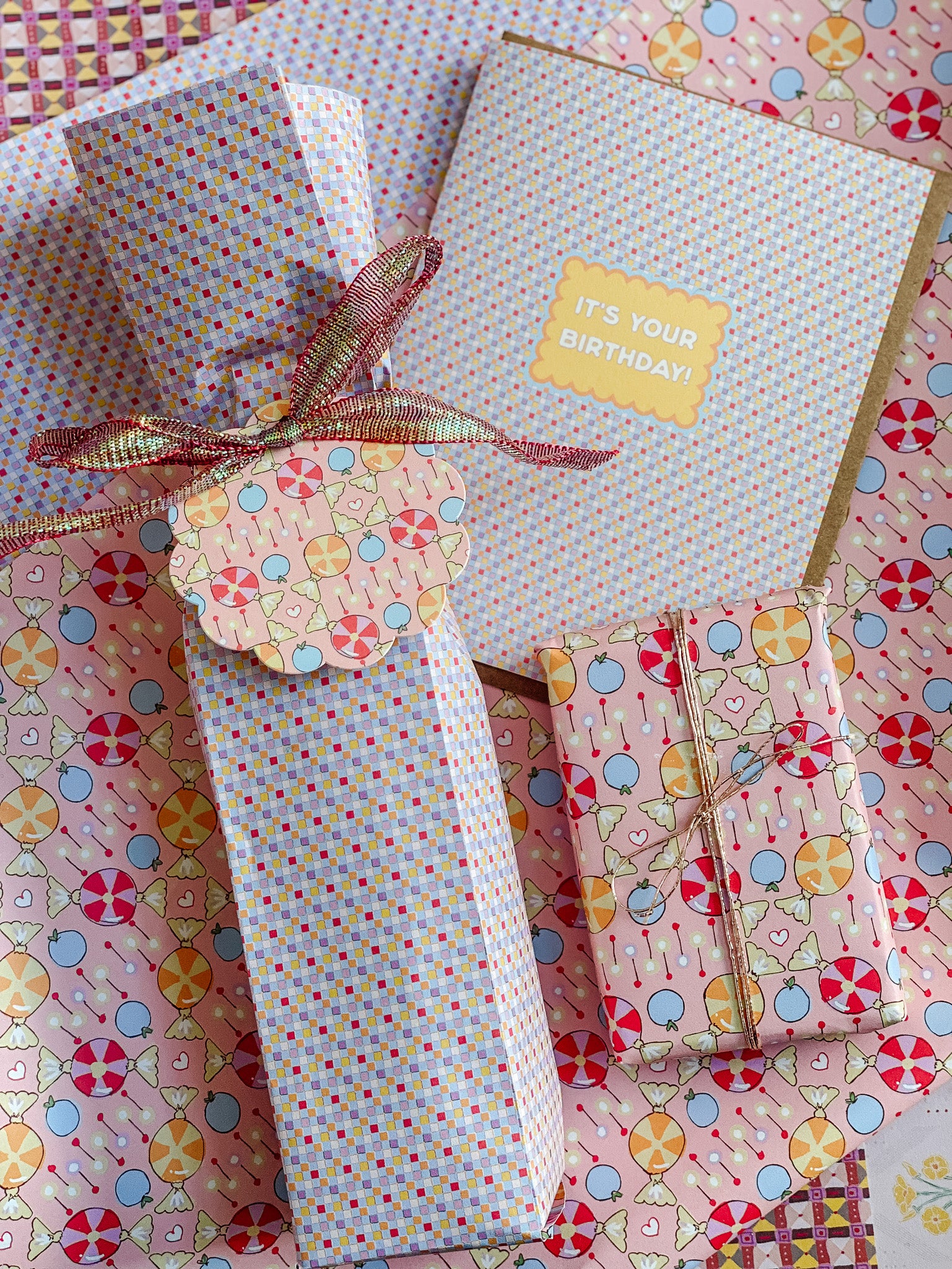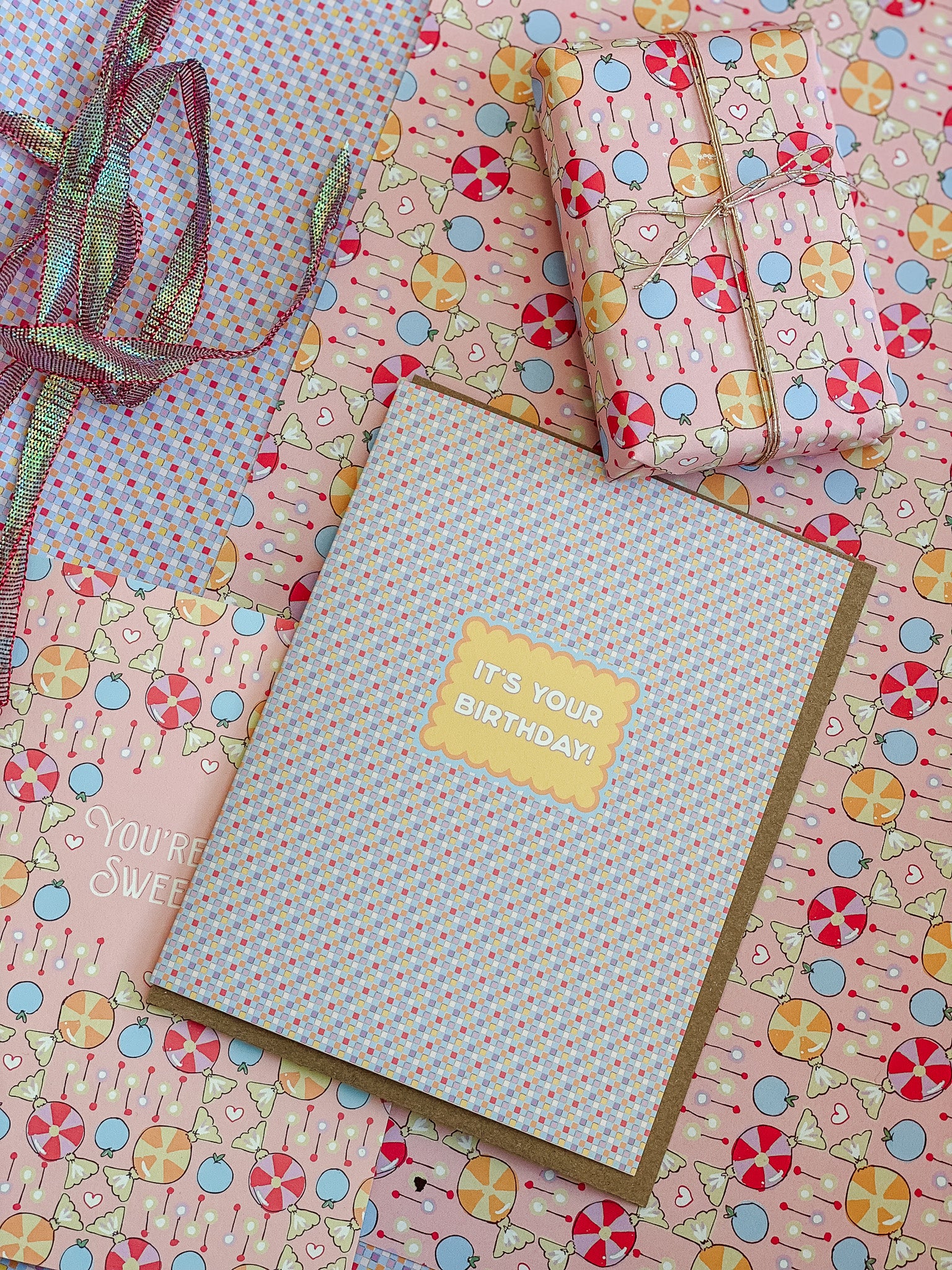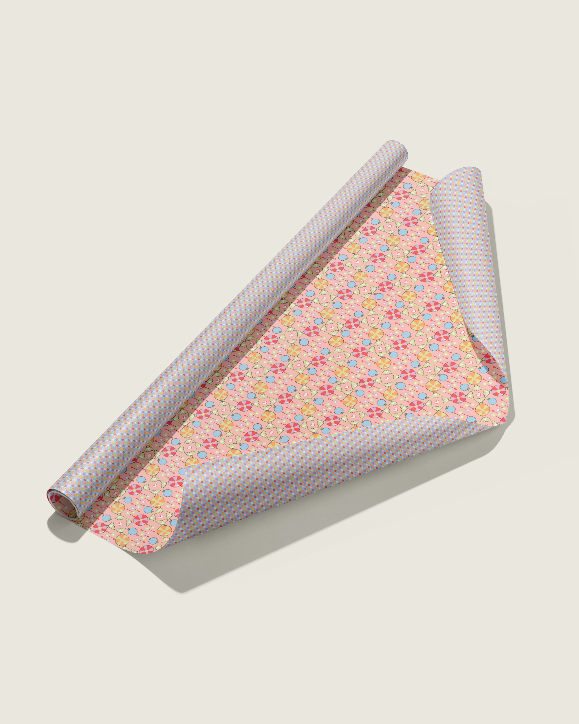 Featuring coordinating patterns on both sides, Sweet Check double-sided gift wrap brings a playful, romantic energy to the La Vie En Rose collection. Inspired by vintage candy shops, classic checks, and sweet Valentine ephemera, the pattern pairs pastel confections, hearts, and soft geometric repeats in cheerful pinks and warm, sugary tones.
