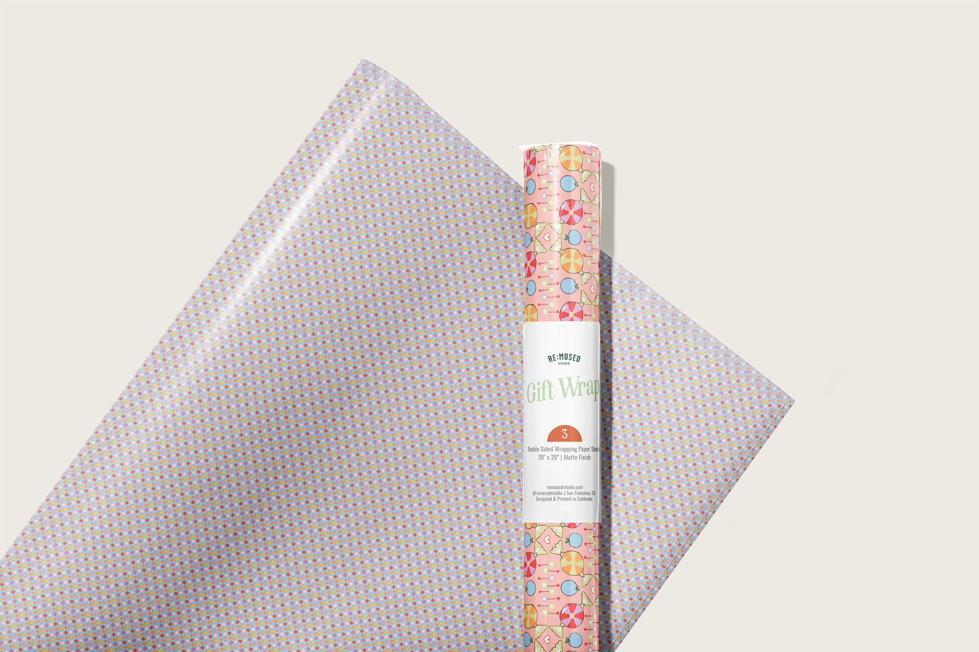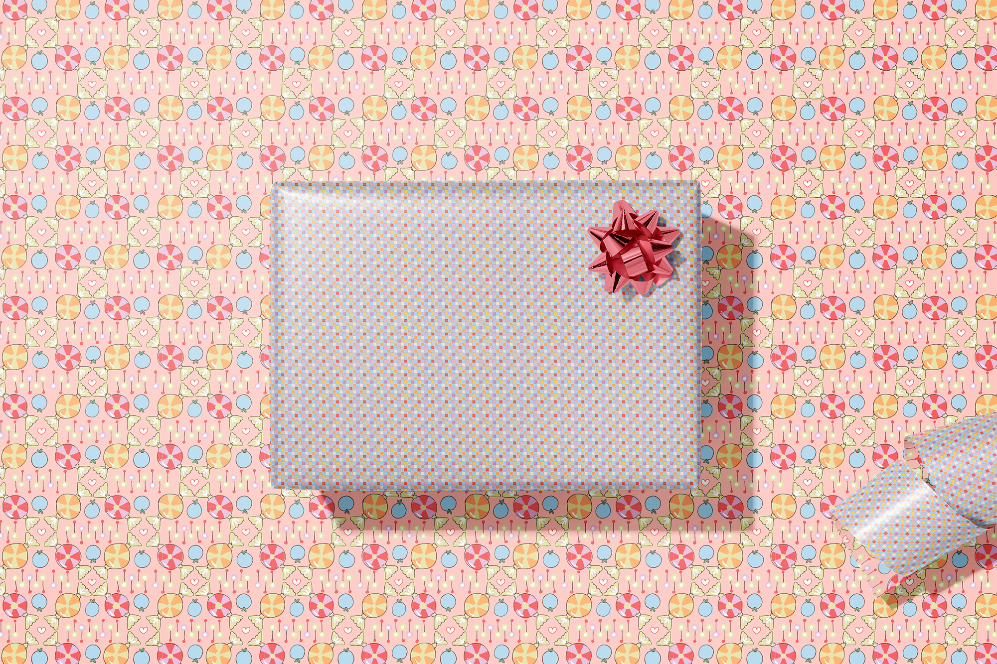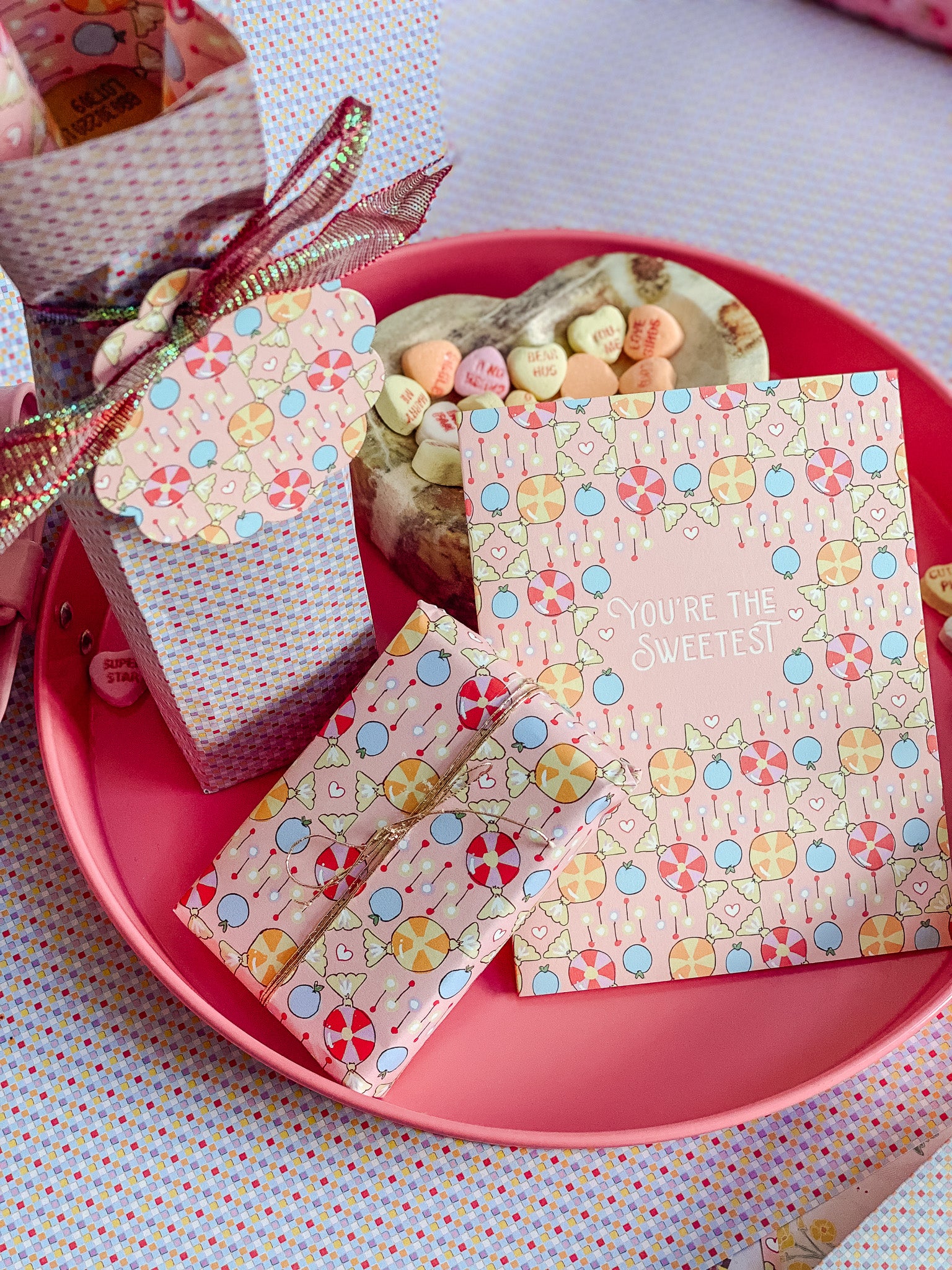 Featuring coordinating patterns on both sides, Sweet Check double-sided gift wrap brings a playful, romantic energy to the La Vie En Rose collection. Inspired by vintage candy shops, classic checks, and sweet Valentine ephemera, the pattern pairs pastel confections, hearts, and soft geometric repeats in cheerful pinks and warm, sugary tones.