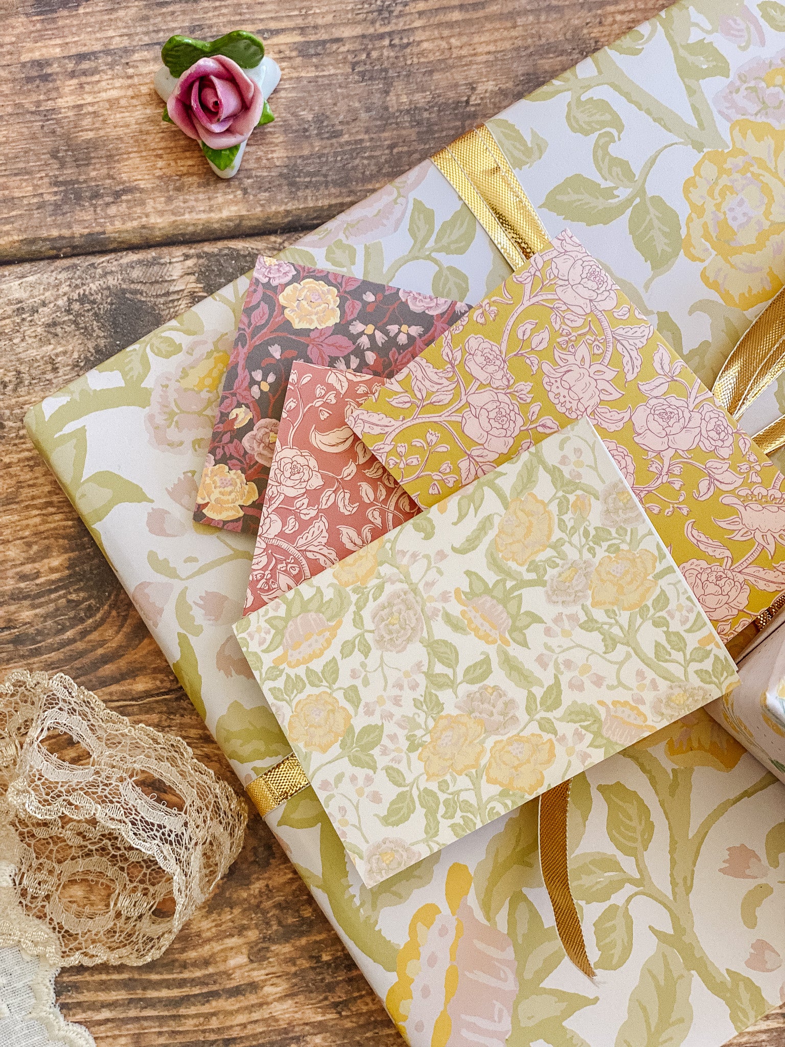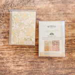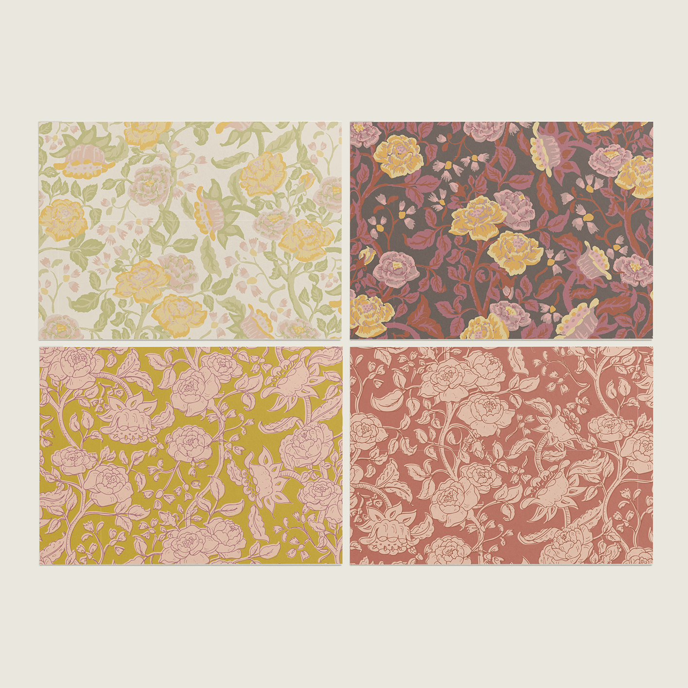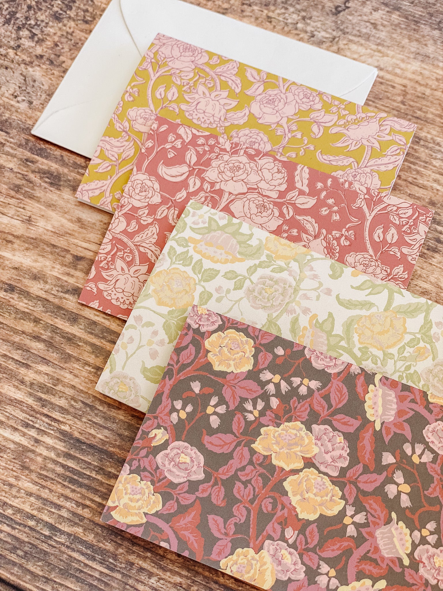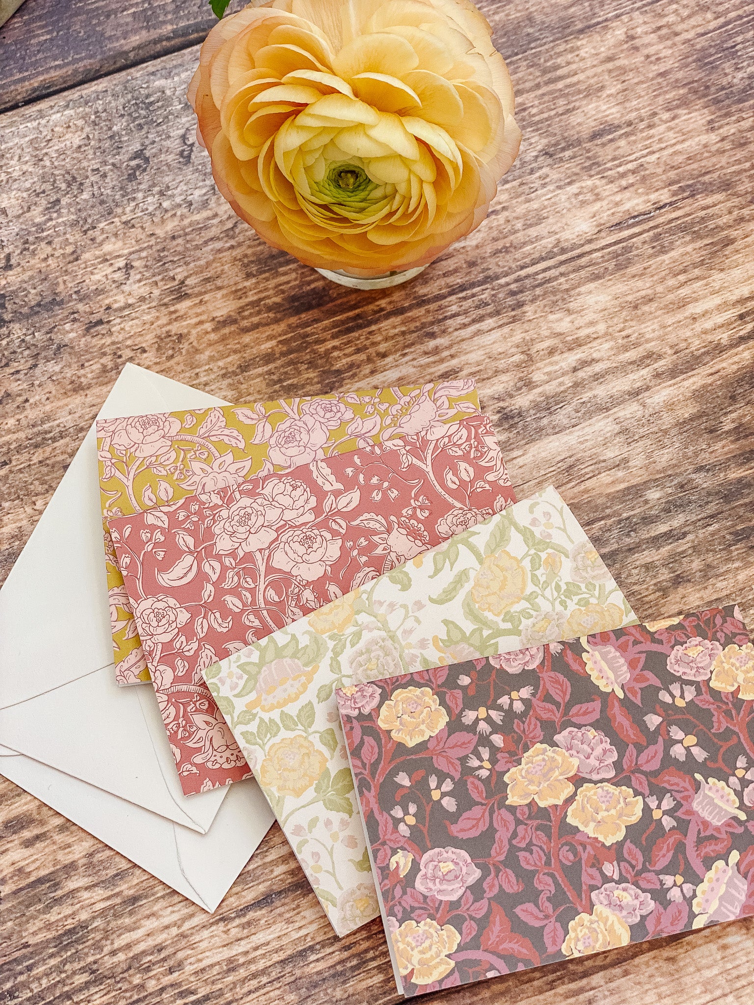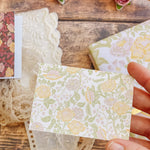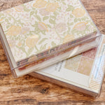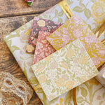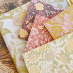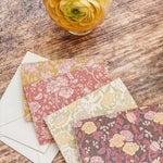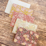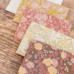 The English Rose folded mini card set showcases a classic floral elegance in 4 colorways of a lush rose garden pattern in soft pinks, butter yellow, gentle green tones and rich browns, inspired by historic English florals and heirloom wallpapers. Designed to coordinate with our signature double-sided gift wrap and gift bags or to stand out on it's own.