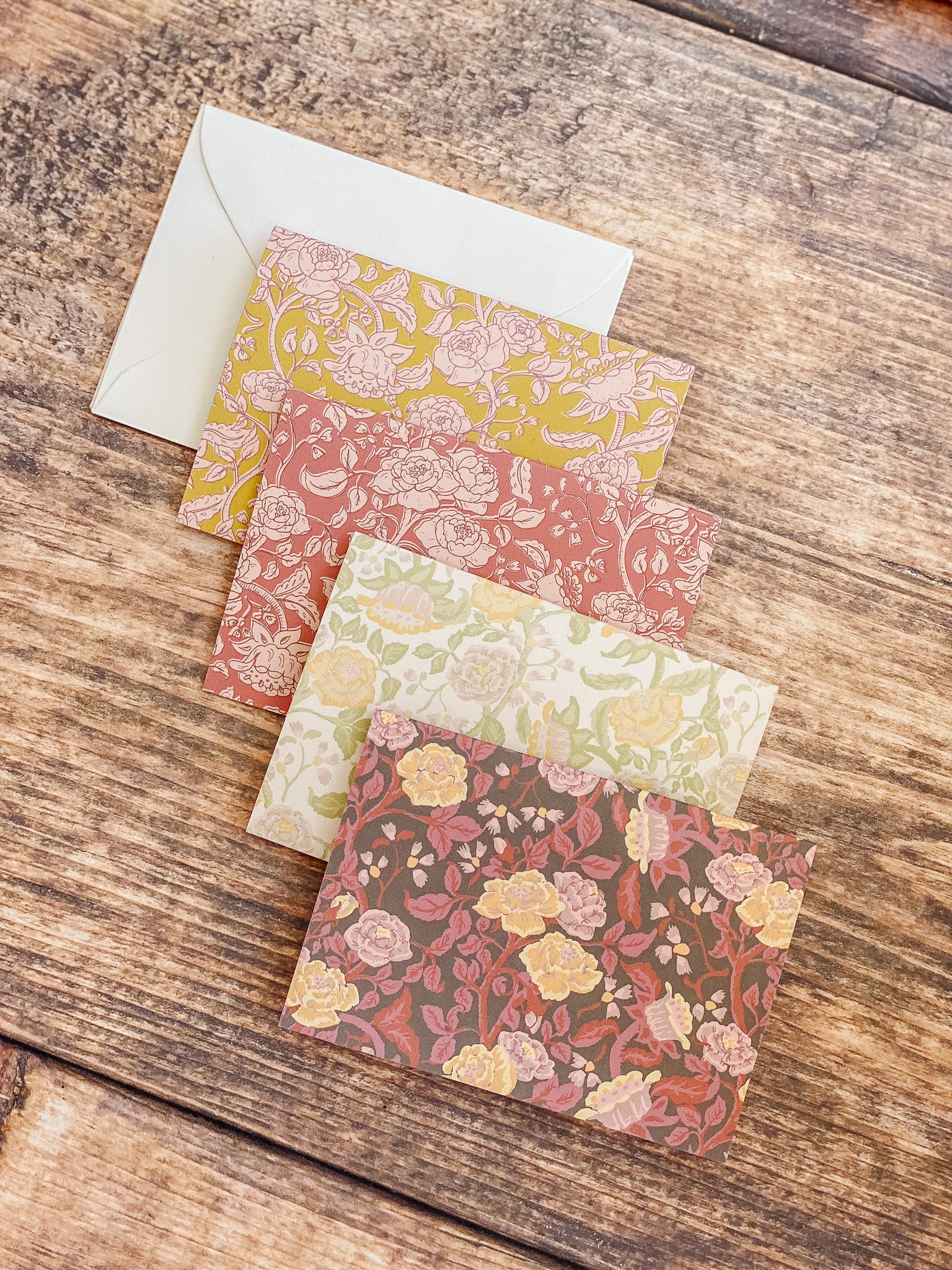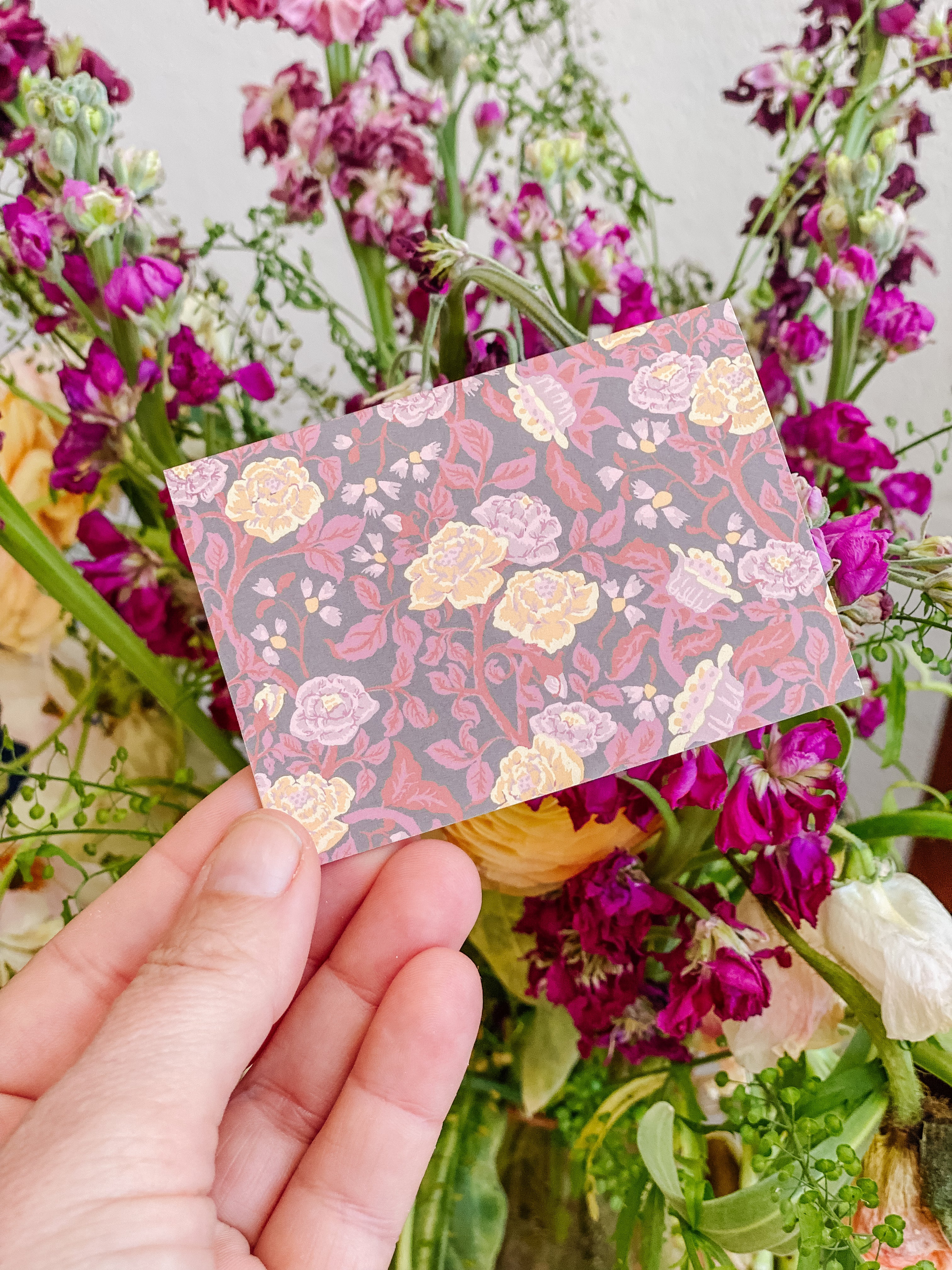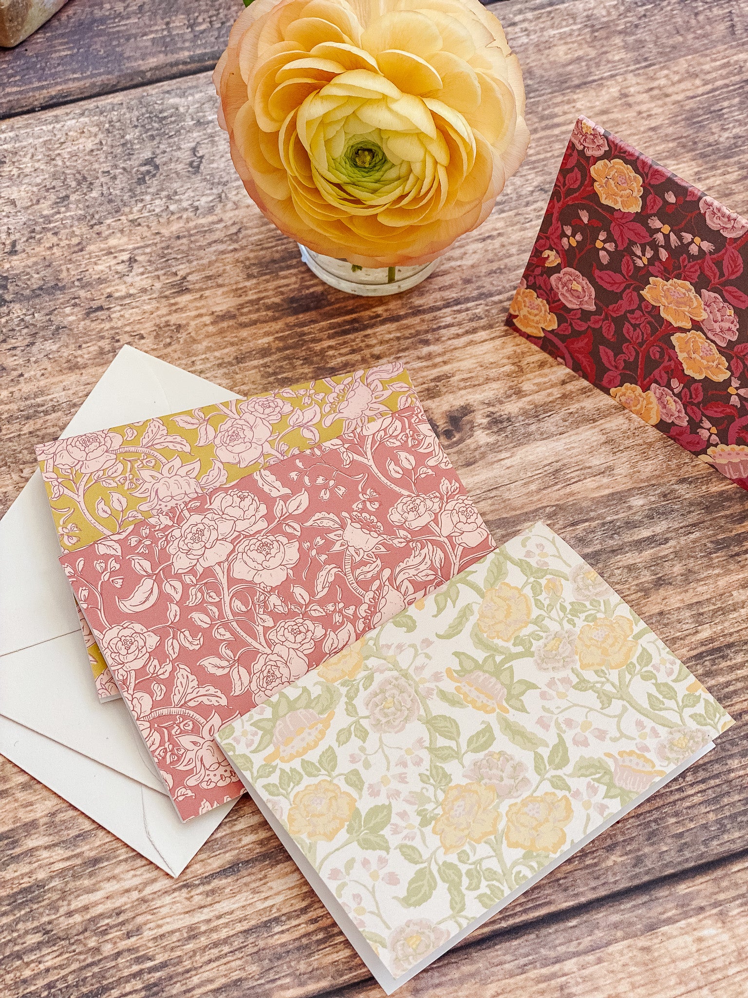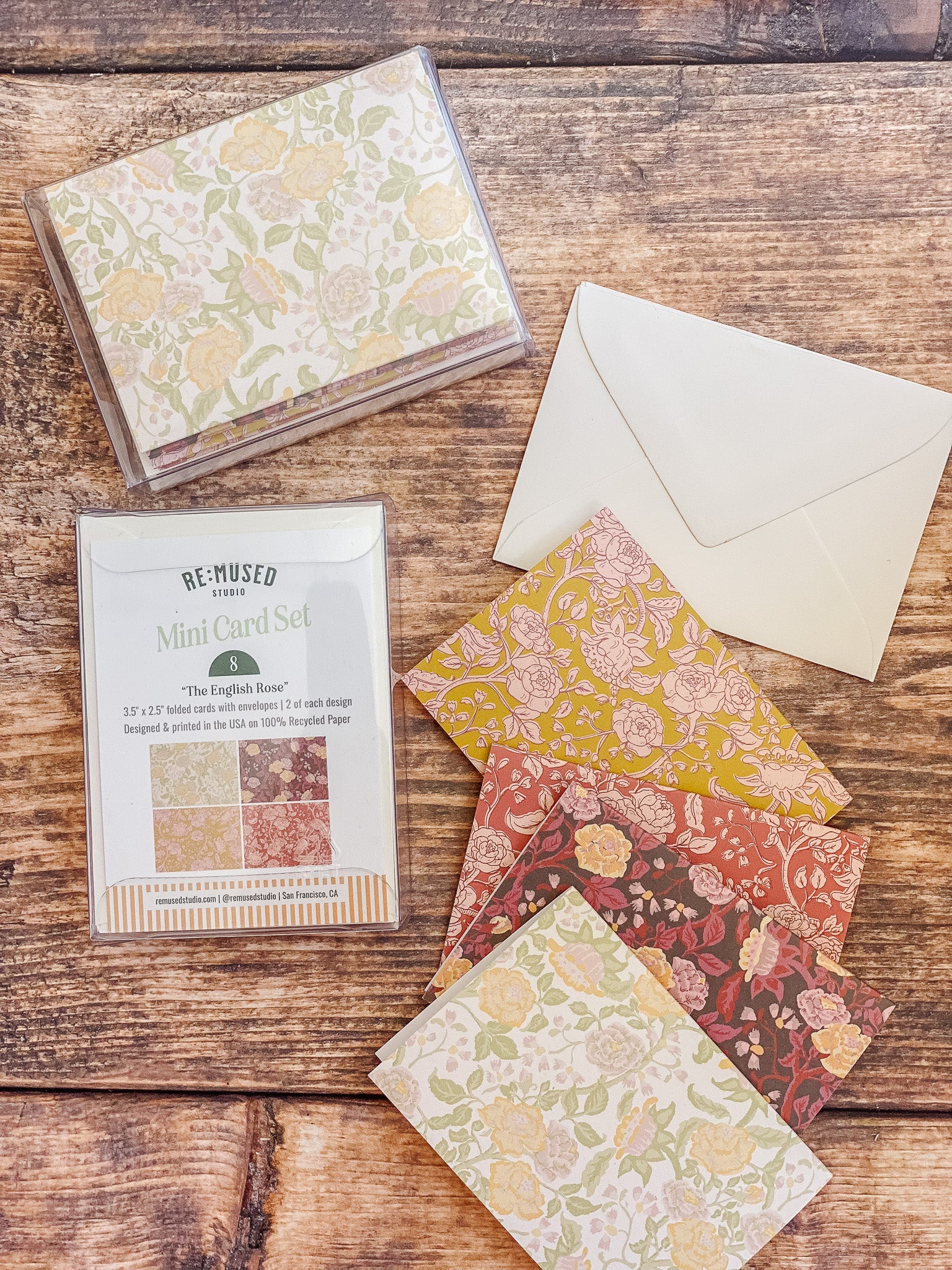 The English Rose folded mini card set showcases a classic floral elegance in 4 colorways of a lush rose garden pattern in soft pinks, butter yellow, gentle green tones and rich browns, inspired by historic English florals and heirloom wallpapers. Designed to coordinate with our signature double-sided gift wrap and gift bags or to stand out on it's own.