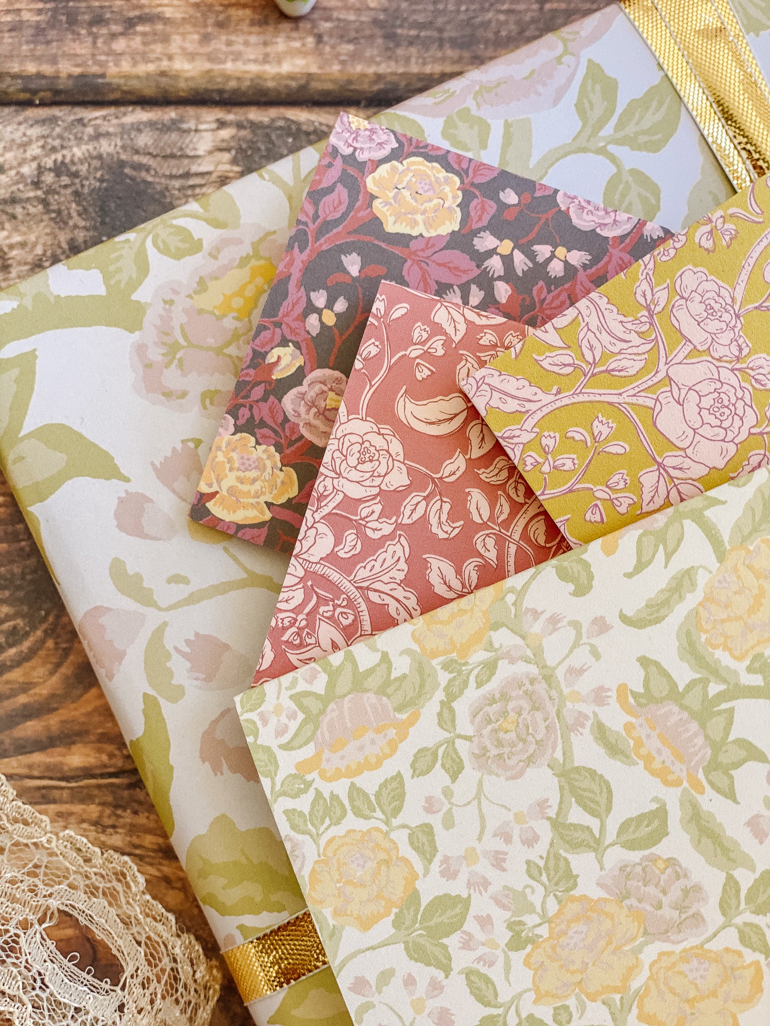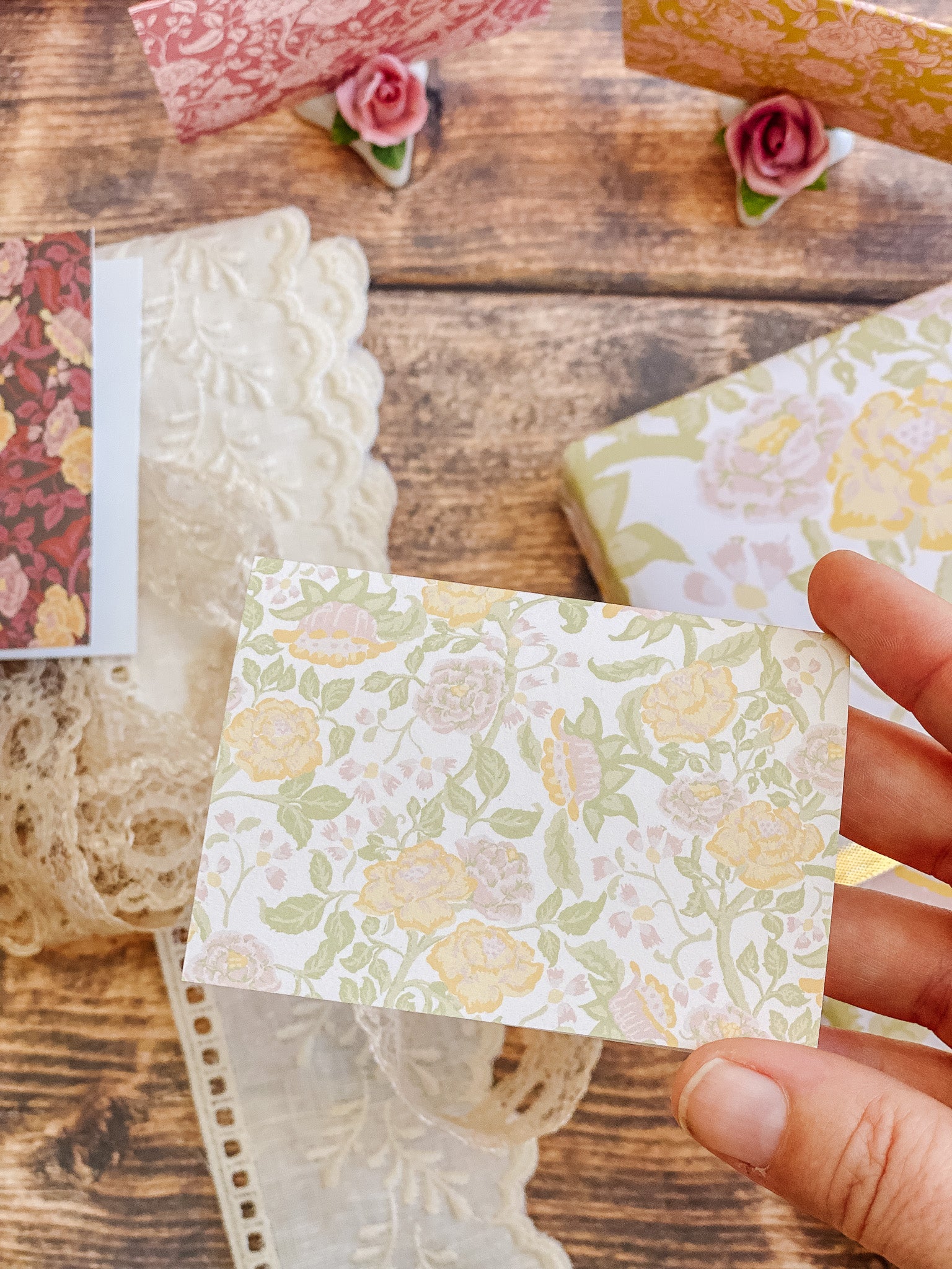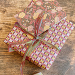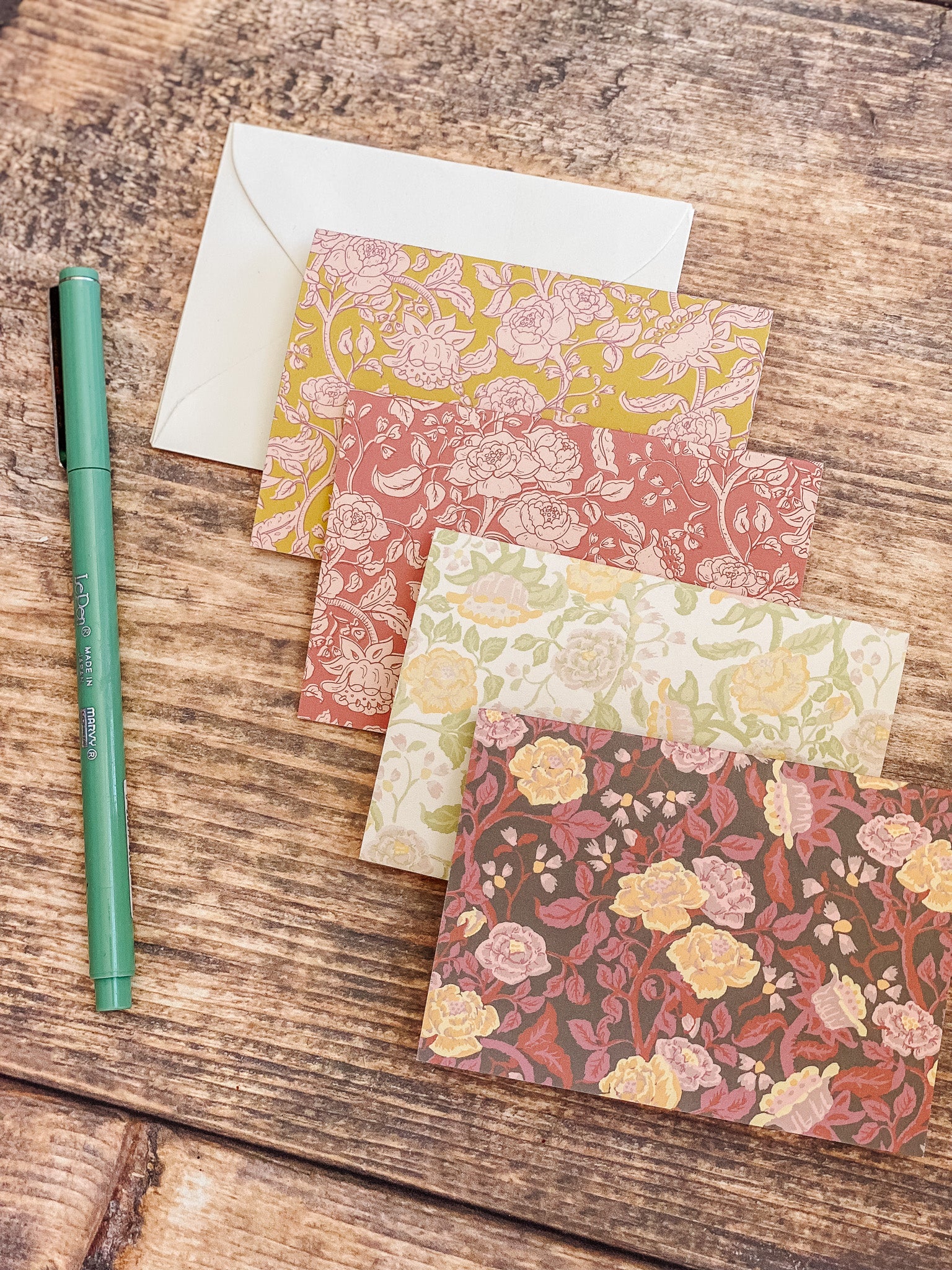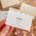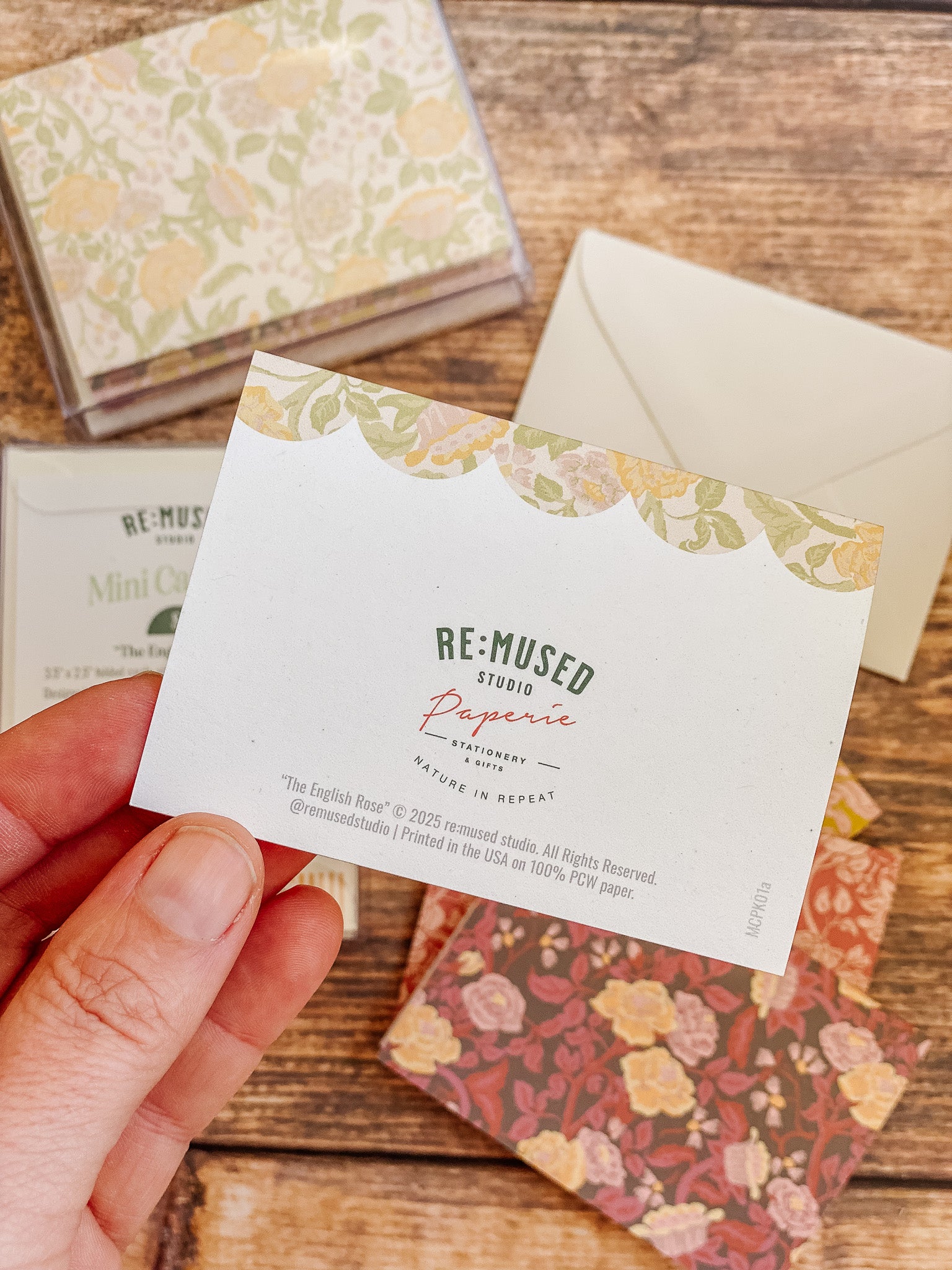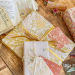 The English Rose folded mini card set showcases a classic floral elegance in 4 colorways of a lush rose garden pattern in soft pinks, butter yellow, gentle green tones and rich browns, inspired by historic English florals and heirloom wallpapers. Designed to coordinate with our signature double-sided gift wrap and gift bags or to stand out on it's own.