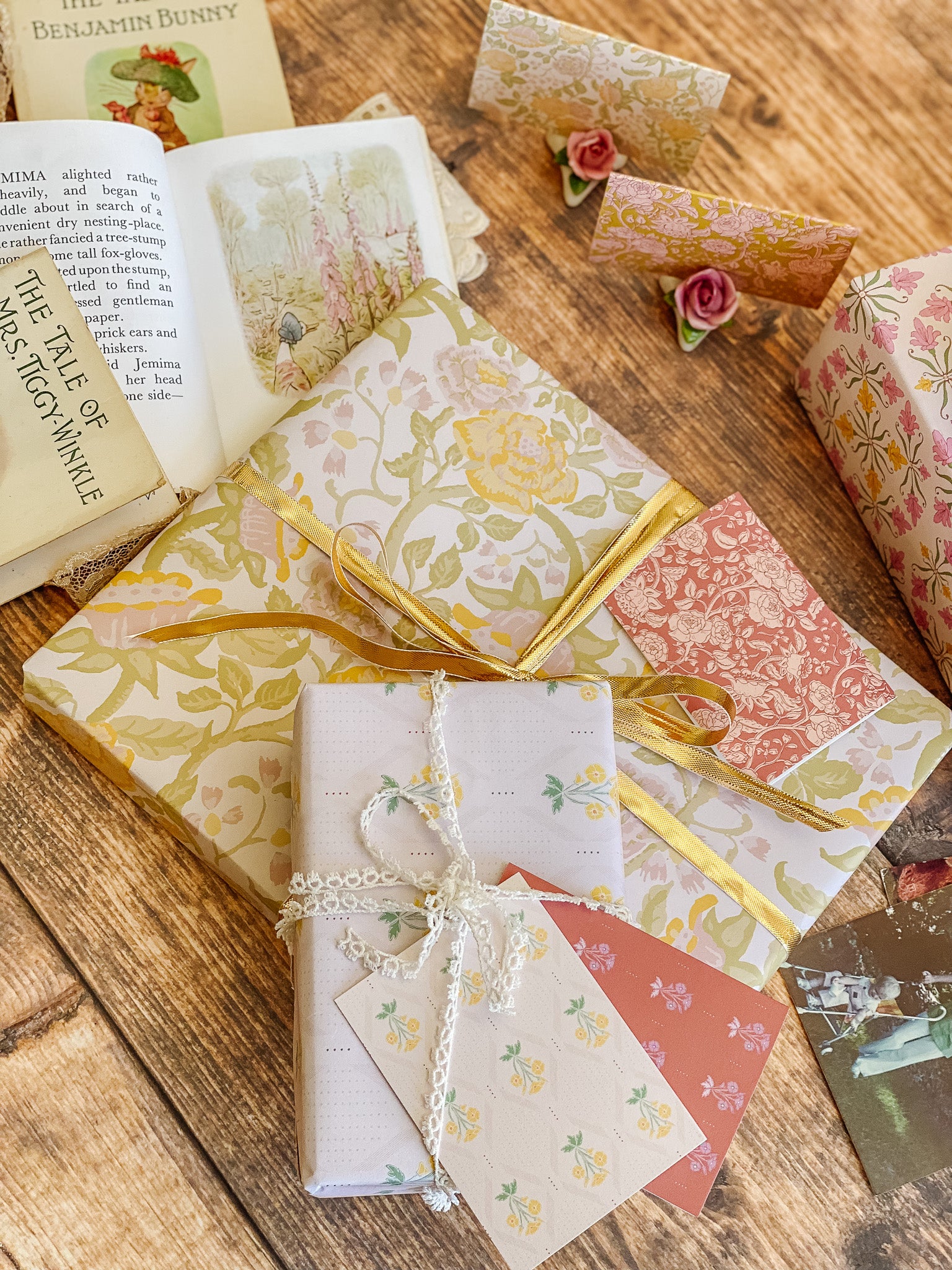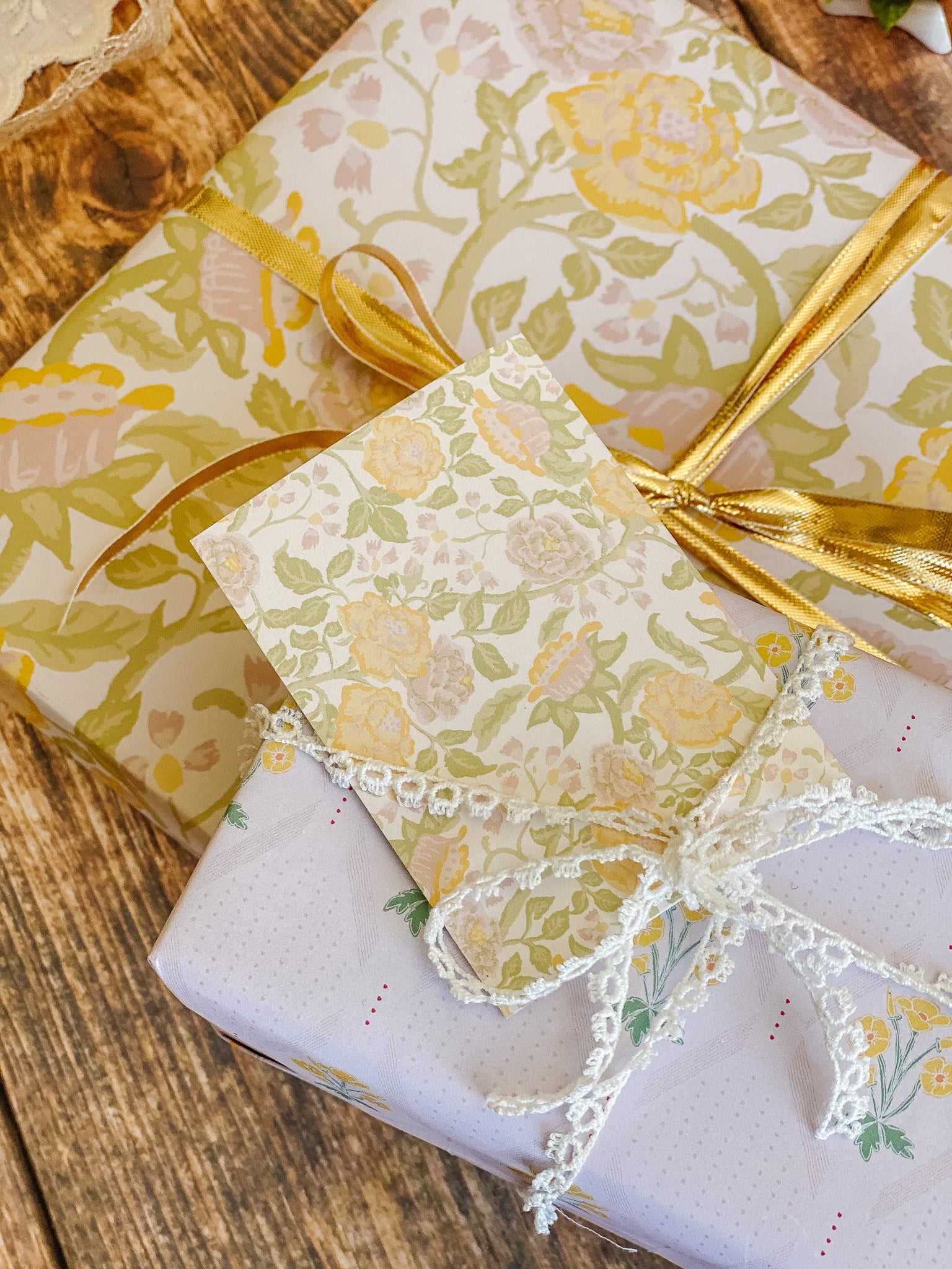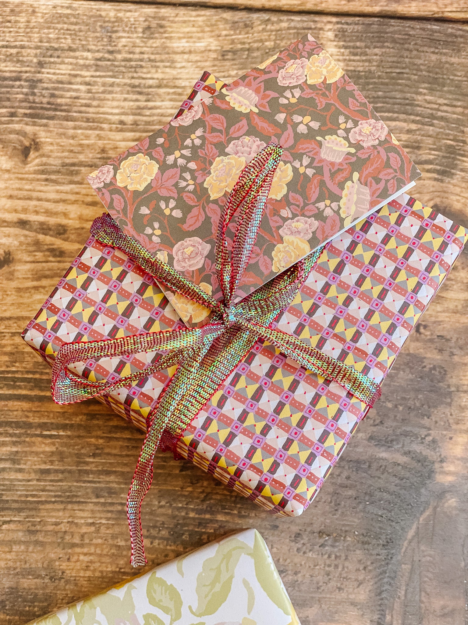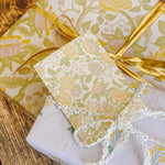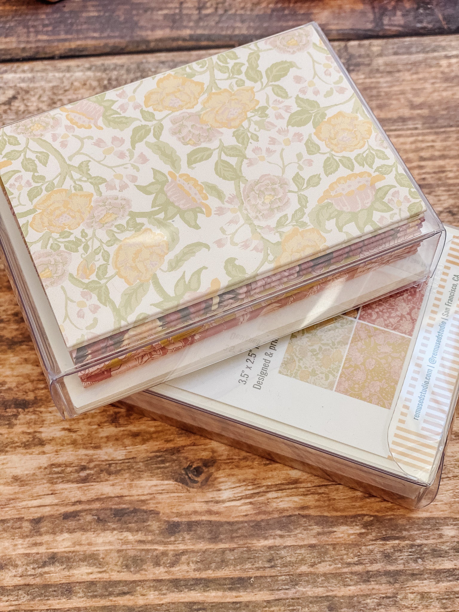 The English Rose folded mini card set showcases a classic floral elegance in 4 colorways of a lush rose garden pattern in soft pinks, butter yellow, gentle green tones and rich browns, inspired by historic English florals and heirloom wallpapers. Designed to coordinate with our signature double-sided gift wrap and gift bags or to stand out on it's own.