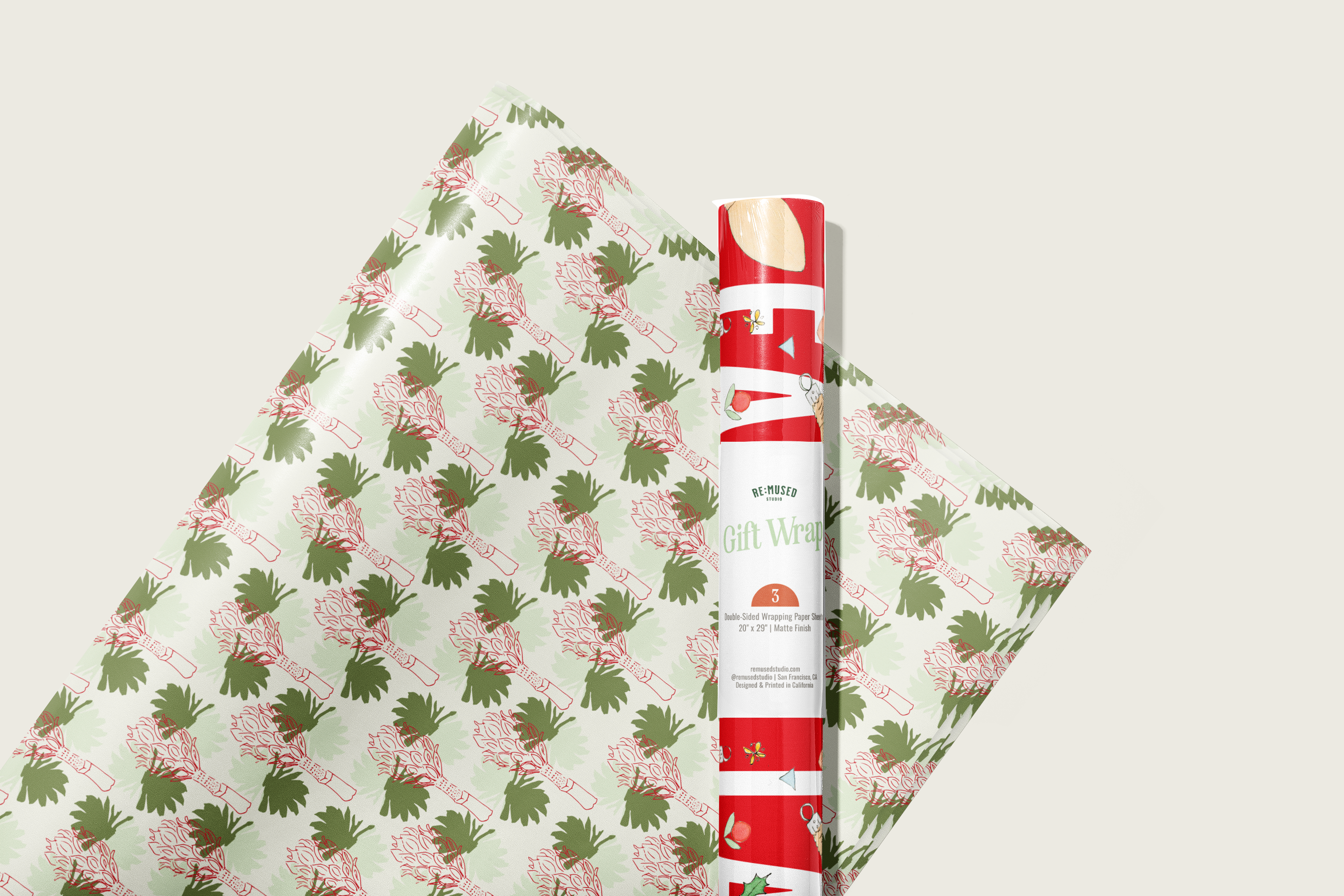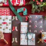 Double the merry with our double-sided wrapping paper featuring our best-selling “fa la la lights” pattern on one side and a new retro tropical inspired motif on the other.